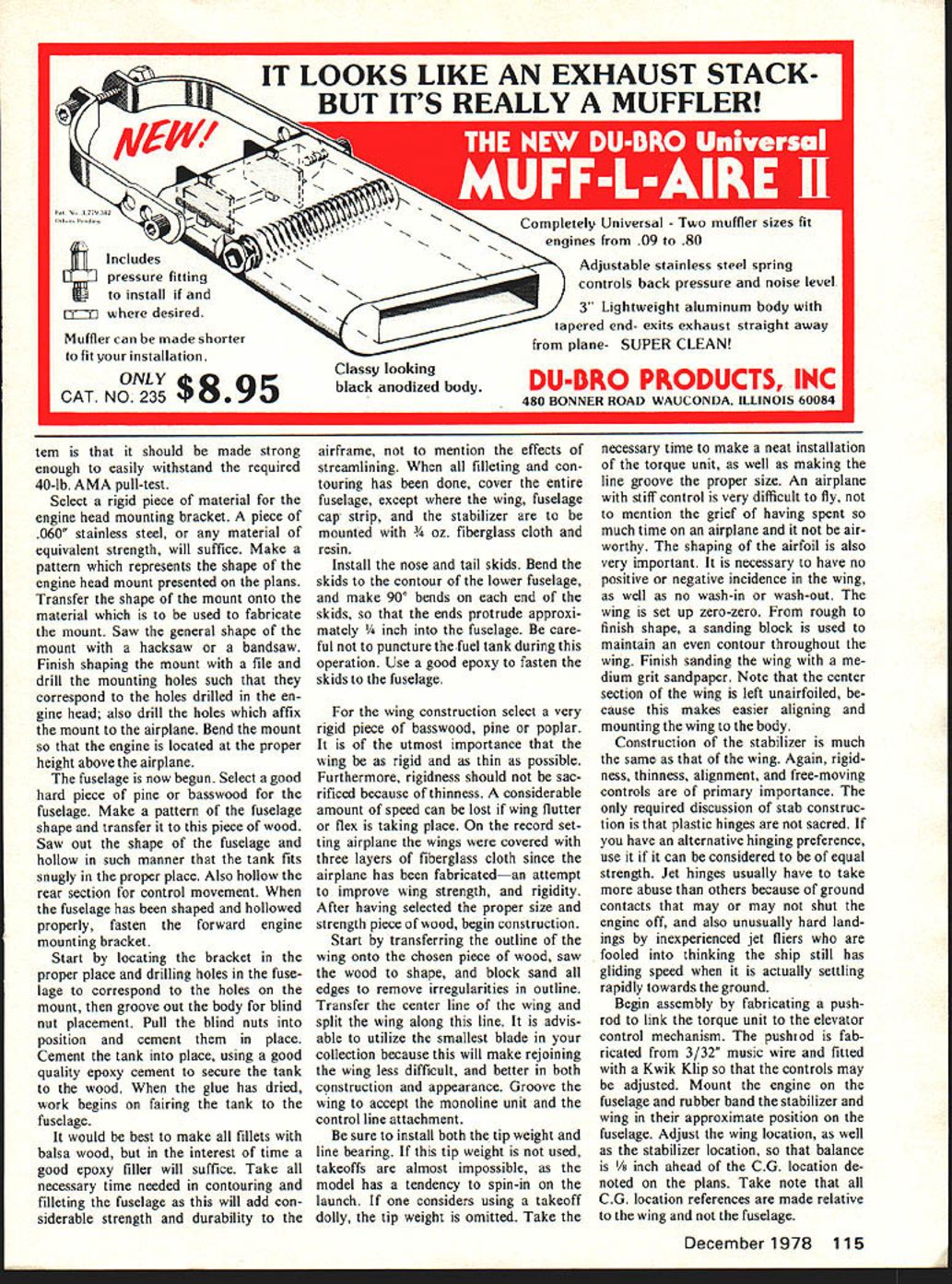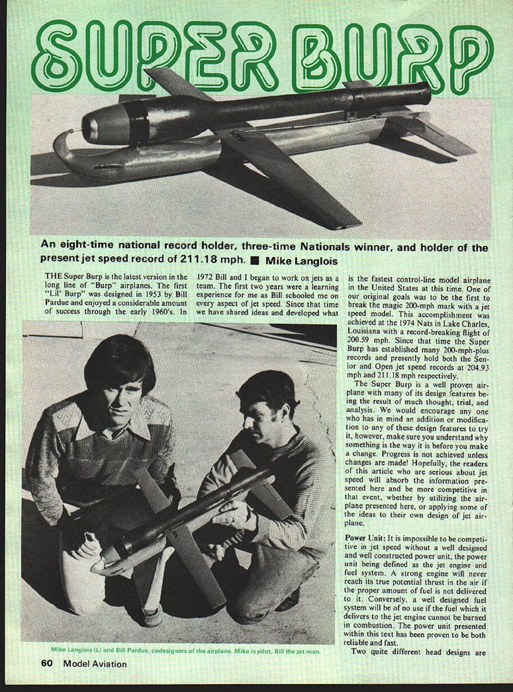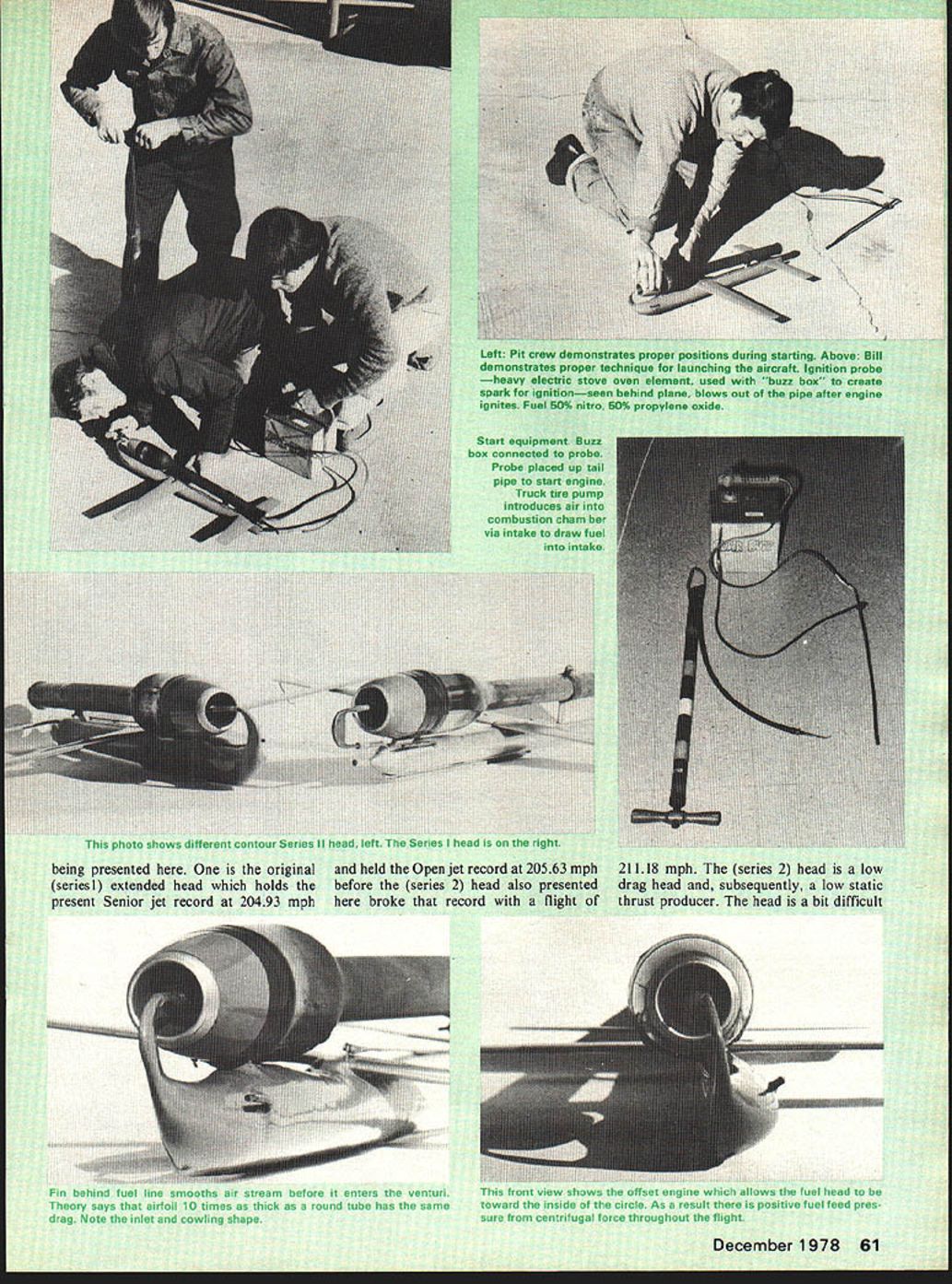 F Ider three1l8mphE Mike 1972 Bill began work team first two years experience Bill sci aspect jet speed Sii have shared ideas Mike Langlois IL Bill Pardue codesigners airplane Mike pilot Bill pit man r ho fastest coi e United StaLes goals magic 200-mph del accom 1974 Nats ii record-br mph Since p nas established ma rds presently ho Open jet speed 21118 mph respe Super Burp v vith its des result much thc would mind tion however make sure something way b change Progress changes made article speed will absorb sented event whether plane presented ideas own plane Power Unit impossible jet speed well constructed power unit being defined system strong engi reach its true potential thru proper amount fuel Conversely Wi system will no use delivers jet engine c combustion powet within text has proven reliable fast Two quite different head designs let S5X Df success 60 Model Aviation photo shows different contour Series II head left Series head right being presented original seriesi extended head holds present Senior jet record 20493 mph held Open jet record 20563 mph before series 2 head also presented broke record flight 21118 mph series 2 head low drag head subsequently low static thrust producer head bit difficult Fin behind fuel line smooths air stream before enters venturiTNs front view shows offset engine allows fuel head Theory says airfoil 10 times thick round tube has sametoward inside circle As result positive fuel feed pres drag Note inlet cowling shapesure centrifugal force throughout flight December1978 61 because k fuel drawir nead difficult und Therefore o build series have vi ieries 6 mpn rly fib order U d additional t uction Th I head v step after K 5 cut roper lengt n can ma s glued out rac u ut cowling securely ml cowling Tn bni dir contouring y has cured neces paratus electric rotate sanding smooth finish also rem spots may have contoured during radius leading edge epoxy i ilso necess 1 ne uipped nded 1/4 ing up PC-7 epo rhe next step L e intake en d 4-20 b tock thre nto back th ith nut x zautious sc head Mount jaws ie threaded roc shaft slowly r Arill enable tn wet Iy V nt IiCX y %ire mi Grumman Guardian XTB3F-28 / Class Carrier IBy IgCatalog25cRog Edwards DERNISTIC MODELS PO BOX 6974 ALBUG NM 87197 HLG designs have also come long way since concepts 30s uld say progress has made recent years Could also said Sweepette Zipper HLG Someone care tackle Im no expert subject Anyway proved interesting diversion gitem ready next year fellas Youve got winter thumb through auld mags books Whats Name Its interesting note names attached various contests Northwest various clubs have established traditional meets unusual names Strat 0 Bats Seattle RAG Meet rubber glider Boeing Hawks Power Bash allpower contest prizes clear last place based 6-flight total Misery Meet held February under un usual weather conditions varying fog sunshine everything between meet approximately 20 years old about Silents Please spon sored Willamette Model Club Albany Oregon silence golden loudest sound tolerated woosh Jetex flap unwind ing OT rubber ship would interesting hear some Clubs out also have unique names contests dark about free flight USFFC Taft has offered night flying several years Just last year Power Bash event flown first time Northwest Bob Petro Athol Idaho having appropriate AMA gas ship flew Madewell-powered Clip per competition somewhat handicapped flying against AMA ships essentially dead air exciting hear old Madewell grinding skyward black night air chemical lights sold sporting goods stores can conveniently banded landing gear favorite OT ship can rig up flashlight bulb dry cell navigation lite Dont hook ignition circuit shut off light timer opens circuit Pick dark moonless night best re sults Use plenty light pit area avoid accidents Its eerie operate engine night Dont forget light DT fuse since can lift around night ground heated up during day night cool Its fascinating see light glow DT fuse spiraling upwardand silence engine quits light bobs around night sky Try Its great change pace Clarence Haught Ri 5 Box 16 Coeur dAlene ID 83814 Super Burp/Langlois continued page 62 hard piece wood make copy cowls shape Split form half cement piece hard wood about larger overall sec tion cowl Finish form base fiberglass resin polish high luster fiberglass cloth now layed up mold sure use good re lease agent first Best results obtained three layers iberglass cloth used resin has dried half cowl can pulled mold impos sible mold cowl unit unless air water pressure used force away mold after has cured molding cowl half time release problem solved both halves have fabricated necessary join Use small strips fiber glass cloth inside cowl well bit resin make good union two halves has dried re move rough edges sand smooth remaining operations turn back stock valve retainer fabricate back-up valves retainer may turned match plans lathe electric drill sure make contours smooth back-up valves simply valves have cut off 75% original radius can done cutting scissors after scribing correct diameter around spare valve retainer trueing diam eter using sanding belt grinding wheel sure remove burrs raised during operation lapping valves using oil 400 sandpaper smooth flat surface Valves may last 10 20 flights depending rich lean engine run sure beats prop glo plug flight will find jet actually economical control-line speed events maintain fly fabrication techniques series 2 head exactly same series head difference two heads material stand point addition reducing sleeve nose series 2 head will no discussion construction series 2 head because its similarities series 1 head word advice study plans take whatever time necessary good job Tail Pipe Selection choosing tail pipe keep mind impossible determine whether will run fast until actually flown airplane However few words advice may help select pipe will feel confident begin experimentations first area examine length length approximately 19-7/32 inches what record pipe me