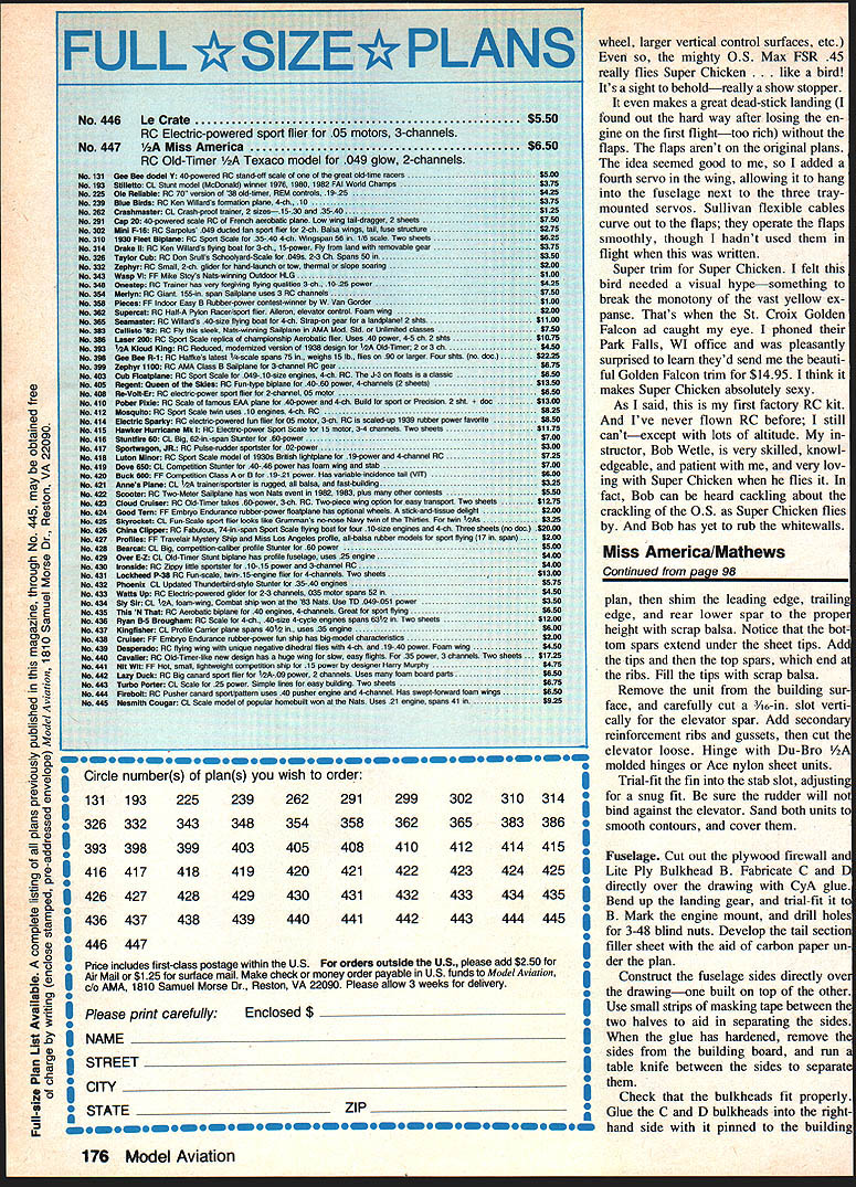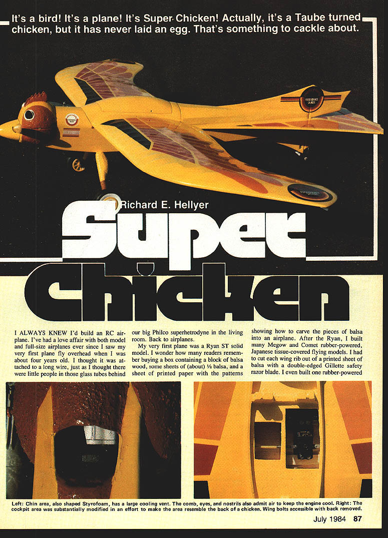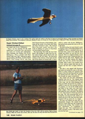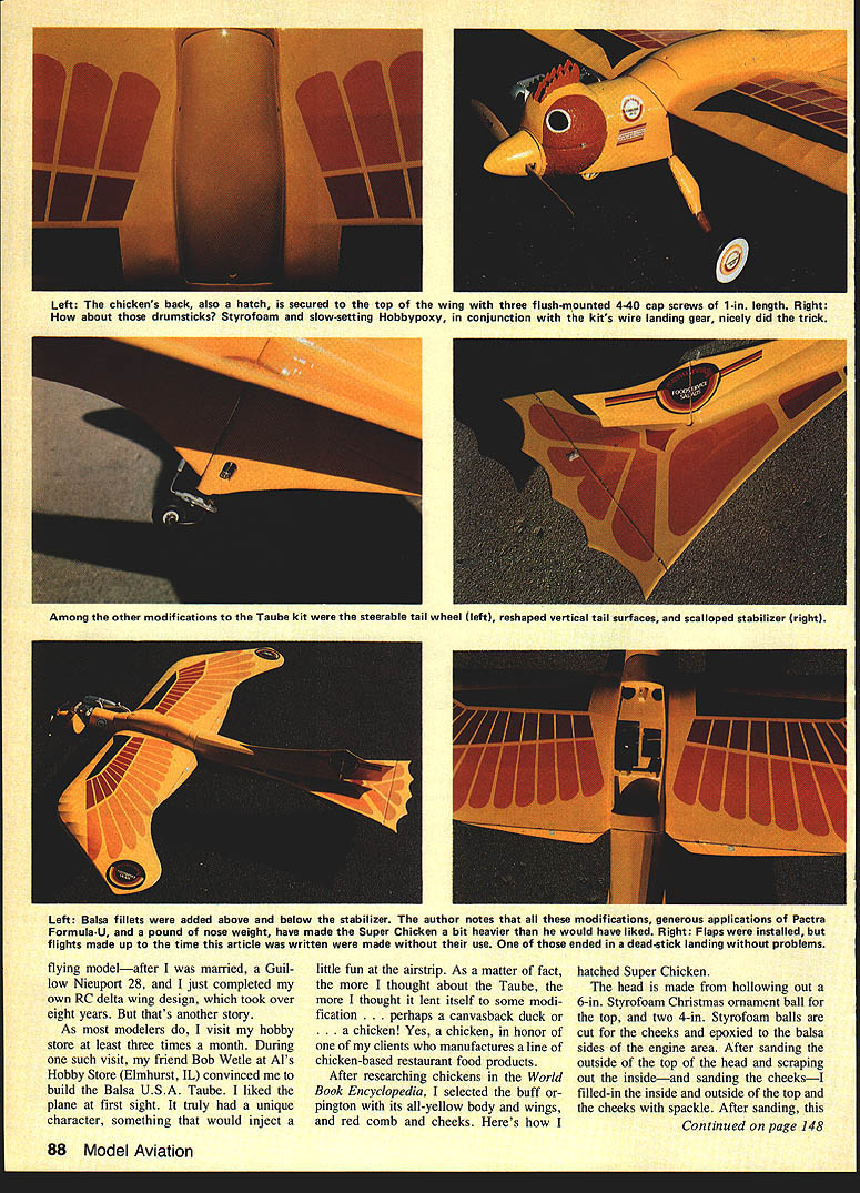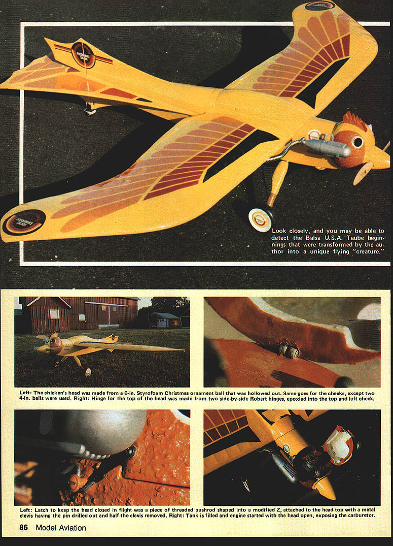 Len The Chickens head made 6-in Styrofoam Christmas ornament ball hollowed out Same goes cheeks except two 4-in balls used Right Hinge top head made two side-by-side Robart hinges epoxied top left cheek Len Latch keep head closed tligflt piece ot threaded pushrod shaped ached head top metal clevis having pin drilled out half clevis removed Right Tank filled engine started head open exposing carburetor 86 Model Aviation 7 ALWAYS KNEW Id build RC air plane Ive love affair both model full-size airplanes ever since saw very first plane fly overhead about four years old thought tached long wire just thought little people glass tubes behind P big Philco superhetrodyne living room Back airplanes very first plane Ryan ST solid model wonder readers remem ber buying box containing block balsa wood some sheets about /s balsa sheet printed paper patterns showing carve pieces balsa airplane After Ryan built Megow Comet rubber-powered Japanese tissue-covered flying models cut wing rib out printed sheet balsa double-edged Gillette safety razor blade built rubber-powered Left Chin area also shaped Styrofoam has large cooling vent comb eyes nostrils also admit air keep engine cool Right cockpit area substantially modified effort make area resemble back chicken Wing bolts accessible back removed July 1984 87 Left The chickens back also hatch secured top wing three flush-mounted 4-40 cap screws 1-in length Right about drumsticks Styrofoam slow-setting Hobbypoxy conjunction kits wire landing gear nicely did trick Among other modifications Taube kit steerable tail wheel left reshaped vertical tail surfaces scalloped stabilizer right Left Balsa fillets added above below stabilizer author notes modifications generous applications Pactra Formula-U pound nose weight have made Super Chicken bit heavier would have liked Right Flaps installed flights made up time article written made use ended deadstick landing problems flying modelafter married Guil low Nieuport 28 just completed own RC delta wing design took over eight years thats another story As modelers visit hobby store least three times month During such visit friend Bob Wetle Als Hobby Store Elmhurst IL convinced build Balsa USA Taube liked plane first sight truly unique character something would inject little fun airstrip As matter fact thought about Taube thought lent itself some modi fication rhaps canvasback duck chicken Yes chicken honor clients manufactures line chicken-based restaurant food products After researching chickens World Book Encyclopedia selected buff pington its all-yellow body wings red comb cheeks s hatched Super Chicken head made hollowing out 6-in Styrofoam Christmas ornament ball top two 4-in Styrofoam balls cut cheeks epoxied balsa sides engine area After sanding outside top head scraping out insideand sanding cheeksI filled-in inside outside top cheeks spackle After sanding Continued page 148 88 Model Aviation Its Super Chickenand its turkey author built model form honor nts major processor chickenbased food products companys chairman Charles R Sutor former Air Force fighter pilotF-86s F-102s photos author Super Chicken/Hellyer20127 Pactra Formula-U Polyurethane fin-which sealed 45-mm Hobbypoxy Continued page 88ished off inside head Whitethen primed painted same rest Clear Formula-U spray texturedof head sealed 45-mm Hobbypoxylook head cheeks chin latch holding head closed made Next cut openings combresult rubbing two pieces Styrofoamby shaping piece threaded pushrod made 2 plywood eyes nostrilsover freshly-sprayed areasmodified Z attached top air intake cooling carburetion head hinge holds top thethe head metal clevis metal again spackling sealing 45-mmhead fuselage made two Ro-retainer pin drilled out half clevis Hobbypoxy primed Rust-bart aileron hinges placed side-by-side andremoved Z snapped around screw Oleum Light Gray 2081 followed paint-epoxied left cheek horizontalwhich epoxied hardwood block im ing sealing Black Aviation Yellowsurfaces bottom head thebedded right cheek Flipping open 20113 Fiery Orange 20116 Cleartons cheeks formed 6 balsathe top head exposes engine needle valve fuel line clear plastic covering open can visually check 8-oz Sullivan square fuel tank vacuum fuel lines Super Chickens neck chin also shaped Styrofoam sealed painted same head large cooling vent opening bottom chin helps pull cooling air entering comb eyes nos trils through engine compartment cockpit area has substantially modified kit original plans called integral part top wing wing mounting bolts being accessible through two cockpits wanted make area resemble back chicken cut out middle former filled entire area Styro foamshaped filled spackle sanded sealed same head bottom /4-in balsa shaped fit top section wing wing mounting bolts can reached removing back se cured top wing three flushmounted 4-40 cap screws 1-in length neck area behind head also substantially changed original design calls steep slope cockpit area forward cowling wouldnt look very chickenish completely re shaped area modification also made possible place flat battery pack oo vvetie gets ready open throttle OS FSR 40 another flight Super over fuel tank Chicken article written Bob flown colorful bird Continued page 175 148 Model Aviation soap film dries rinse model off carefully clear water Let dry apply two coats clear over everything may have trouble getting clear stick shiny vinyl Try applying clear just up edge vinyl until clear just touches should make good seal Let finish dry couple days Getting air Use 3-48 screws bolt engine firewall engine doesnt point toward outside flight circle put two small washers under left-hand engine lugs before install screws finished Kanary should weigh about 6 oz Check balance holding Kanary upside down lower wing tips balance should about 1 behind leading edge first flights use 25-ft steel lines 008-012 diameter dont forget take off downwind After youve got feel flight try up 35-ft lines Have fun near power lines NASA & AMA Continued aae