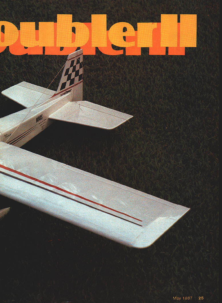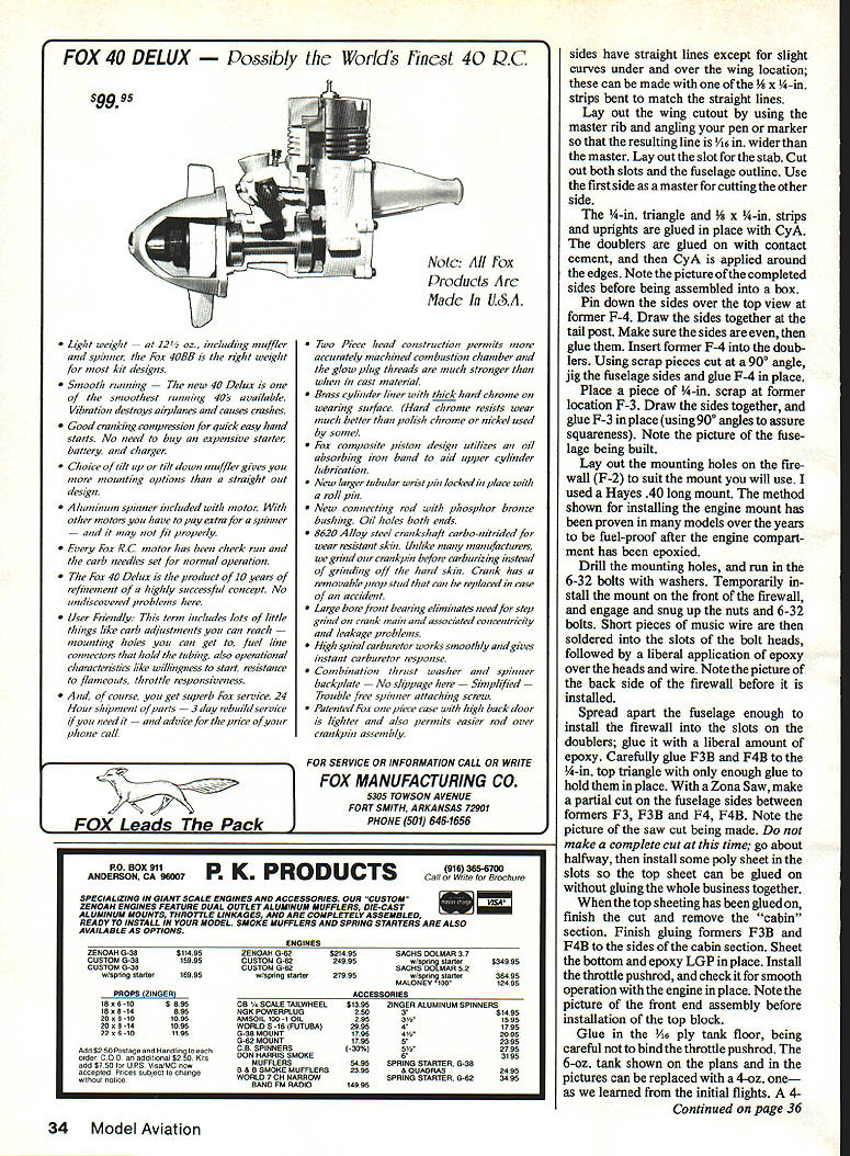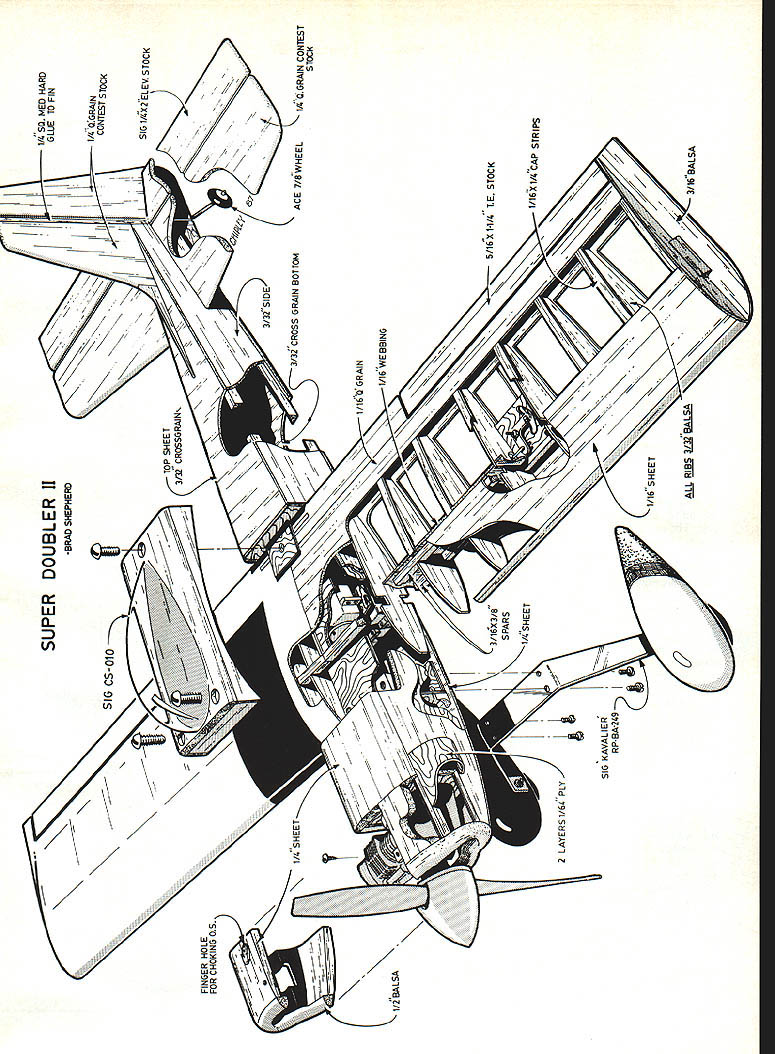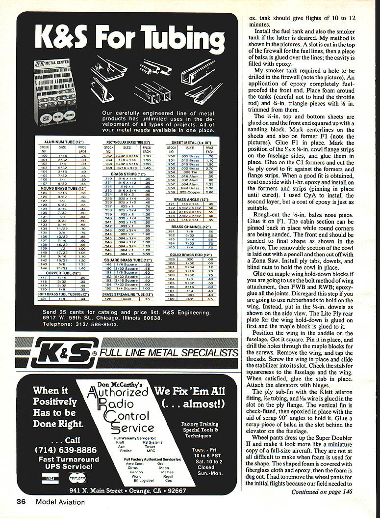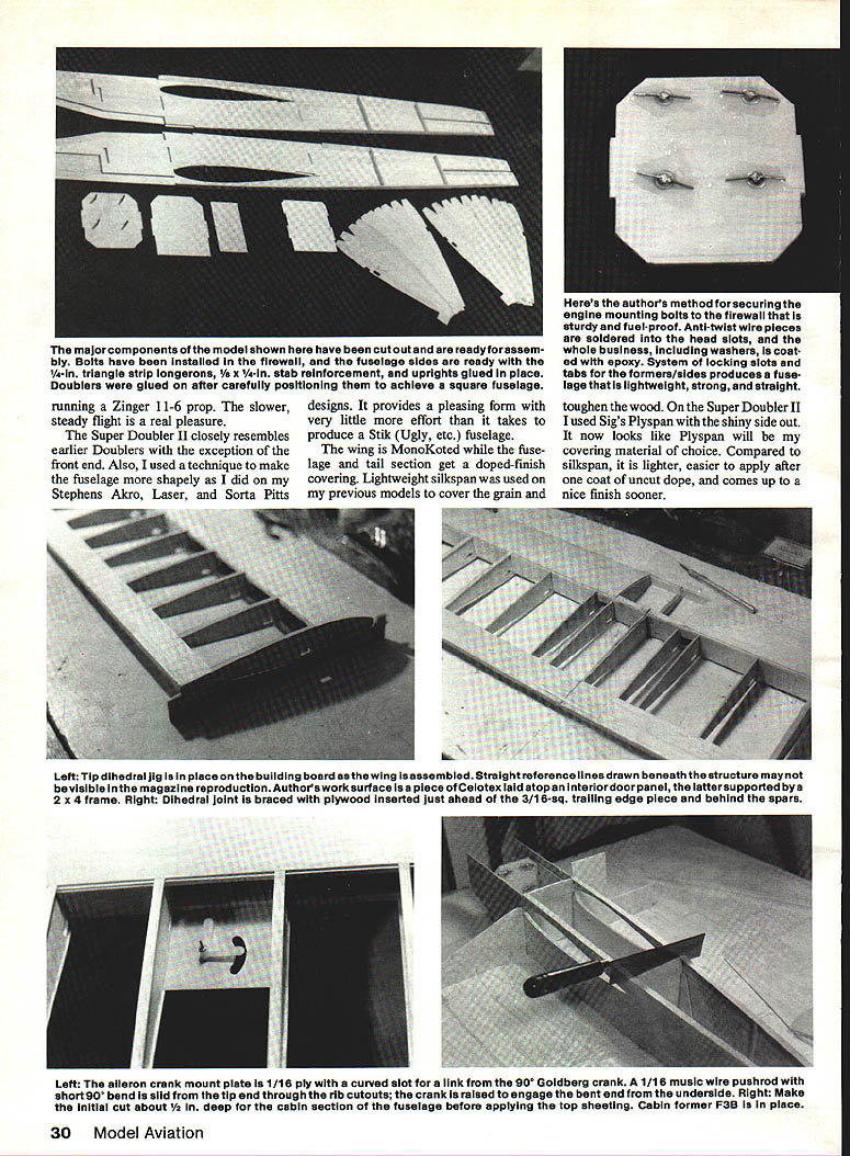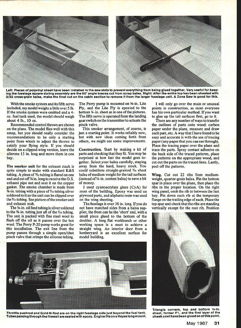 NO OCR TEXT NO OCR TEXT isa certain beauty uncovered framework guess lithe kind bug bit us years ago says author/designer Shepherd im sure glad no cure Things see vent/drain hole bottom sheet firewall second smoke cham ber screwed place four fiat-head screws holding landing gear fiush sheeting ciean cutouts wheei pants front end cowi ieftwe seethe enginesexhaust stub Perry pump place Notethethrottie pushrod witn bend arm slid over rod engine mount rotated position mount bolts allows easy removal installation engine maintenance right smoke chamber place Silicone feed tube exits pump goes through pinch valve before entering smoker Smoker slipped over short stub end i bolted engine via exhaust nut Left Plumbing forthe engine smoker system pinch valve epoxied tothe inside cheek cowl Perry pump mounted ply line pumptothevalvetothe smoker levisibie Short piecesof brasetubing make handyto fill thetanks frontend Right control center compact left servo smoker valve omit dont go forthe smoker Supports Gold-N-Rods epoxied firmly place also box receiver wires battery receiver neatly packed foam absorb vibration SOME SAY revolution suppose quite true considering long years have used high-rpm over-square piped two-cycle engines Rev olution may too strong word sure four-cycles stay can get little carried away raves modeling publications challenge getting smoker system work four-cycle enough jump head first try Checking financial status credit rating bank found could purchase OS 40 four-stroker get things started Doc Mathews todays pro lific model designers made interesting statement sequel highly-successful Some decorations make model look realistic dont take much time out add much character plane photos author FINGER HOLE FOR CHOKING OS SHEET 1/1 21 2 LAYERS 1/61 PLY SUPER DOUBLER II -BRAD SHEPHERD H I3/163/8 SPARS RPBA-219 62 YIP 5 GLUE TO FIN 1/150 MED HARD I/QGRAIN ICONTESTS TOCI SIG I/4X2ELEV STOCK 3/32 CROSSORAINs N CROSS GRAIN EDT TOM1/4 OGRAIN CONTEST STOCK 1/16 WE BEING 5 1/16 SHEET ACE 7/8 WHEEL 5/16X1-1/4 TE STOCK l/16X 1/CAP STRIPS LL RIBS LAL3/16BALSA previous effort can often become disaster wit Good Daddy 111111 Rumble 111 III etc Docs experience scaling up down Free Flight models shown him good qualities some times lost scaling process mind going about process putting some lines paper fit 0 S 40 FS mind went layout earlier Doubler designs Doubler has simple structure excellent flying quali ties decided retain good things make changes necessary different model size engine type Having no experience whatever four-cycle model engines relied data presented various publications rpm prop sizes weights wing loadings two-cycle four-cycle comparisons etc playing game calculated guessing instances extremely lucky and/or research paid off Everything turned out just right first flight made thing Ive found need getting adjusted low-decibel putt-putting en gines have correct thinking concerning falling out sky syndrome related sound fourcycle just keeps boring along steady pace doing maneuvers scalelike graceful usually possible two-cycle engine first flight morning rare cool days late summer wind quartering grass-strip flying field engine fired up rpm adjusted tachometer Flying buddy Leon Folse snap few pictures offer some advice running engine previous experience OS 40 FS smoker checked looked OK taxied out strip lined up opened up throttle waiting high-pitched sound model accelerating never came Easing back stick model came unstuck climbed out very smoothly Everything going fine still hadnt gained confidence engines sound smoker apparatus place smoker tank filled Ahnag oil balance point front center gravity CG envelope model handled very nicely smoker kicked some loops rolls performed order check models perform ance rearward CG removed smoker exhaust stub replaced standard exhaust stack smoker tank emptied tubing Perry pump removed resulted CG being center mark plans loops nice slow round figures rearward CG doing consecutive loops engine just keeps chugging away Four-point rolls stall turns spins snap rolls knife-edge flight square loops inverted flight outside loops done during initial flights JOINER oe DIHEDRAL RIlACE 7 BALSA SHEET-SEE SIDE VIEW DIHEDRAL BRACE RIGHT ~11d-/i II TOP SHEET ENDS TOERII CENTER OPRIB-CENTERIII SHEETED AFTER BOLTIIaII HOLES DRILLED1II 2I 421 SHEET TOP CENTER SECTION AFTER I A-III OMIT TINS BII ONLEFTWBIOI1I II I II IIII II __ ____________________________________ II 1 3/IAO3B5RlRS 1/IBTIA CAP STBIPS I/RI SHEET II II I/IN REBIG ALL ElM IR BALSA 1 II II II II II II II II II I/I IBJSC WIHE II II II II II II II II ___________________________ II II1 III A-a-la ---,-III wP PAHEL EPOIT WELL AFTER WHO ASSEGIRT 0/16011/ATE STOCK RIB lA t/8LITE PLY II -1 c3 RIGHT WING SHOWN MASTER RIB PATTERN SOLDER - 2 LAYERS I/IA PLY \ ci II iii FOR CHORBIG DO [I4I DOUBLER hALITE PLY 3/TRIANGLERR SAAB NOT SHOWN 17flNUTS XSAOI PNO P ABUT AWAT 0/Idol LERIINPWI LITEPLTITEP SERNS MOUNT IATOPOHEETPLACE F B AFTER COWL ELAN 121 1/NA PLY" R TRIANGLE II/A OHEET TRIM l/BSEF\ 21 III ENOHE MOUNT1 FWPBALSA JillRHODR TO OUT__ WLOUTLRWRI PTT SEW/N II ICOWLFAHEESiI. 41TTT /PT PERRYPOOPIiW 101-I/iIIRST SOMOICE~I..1/BLITEP DOWEL BALSA F SITRIAIJGLE U 28 Model Aviation Fc1 010 RARALIER APRIASAR3/INPIT ICo //I. ~ II Full-Size Plans Available. See Page 186 pipI pipI 111115 2I Tiip uJ~J IIIIIpP Ii 116-iIa II IIa iiII II p1II IPII ppPpP I3/16 ORBALSALOPTO _IIpp 4~P I DWRAl VERSION VAPITS LAST RN POR VP OLRISPRRT PYLON RACER OR HOTTERAEATICS DB p/LPYE PLY SCRAP TRIAPILE A/P6RALSA ROOT BR M16PEJN 0/tRALSA SPK16 JORIER STAB kh IZER FWP I/l UTE PLY AiZ] 51616 LOCATERS YIP JIG P06161616 ASSENALY SCRAP BALSA 16 PlY APLCRAIPK P406041 OfLOJN CONTEST STOCK S EAO tIP4FZ 1/PLY3 I/a UTE PLYP7 1/8LITE PLY o0 -FFtSELAGE__ __F -oio 004N0TOP Sf00 TUBE ITmI3/NCBRSGRIJNYLSA 16 N FIN --II 1pIL FUSELAGE SIDE VIEW- _____________ __________ _____ 601/B ______________ ________________ ___ OOWEL-OPTIORALWR4Gp p1 _- PATE I'I. --I---PpP pP/BA