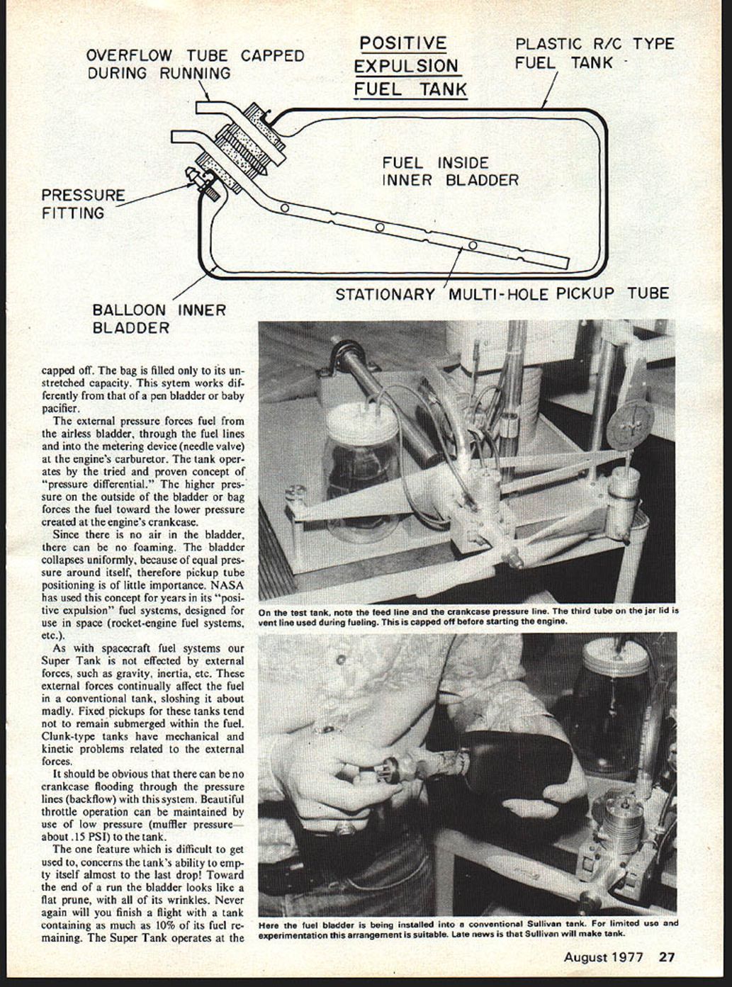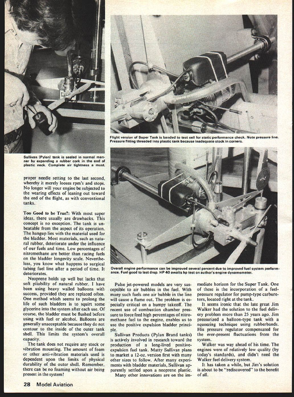 in1 -irii Fm F-wi Iii nfl nfl nfl I Offering major improvements performance both RC CL ingenious tank vanquishes limitations weve live David Gierke HOW OFTEN have competition people frustrated engines hope lessly flooded just wrong moment As well aware person careful backflow condition through pressure line conventional tank will flood engines crankcase What about RC pattern enthusiast points ship prolonged vertical dive have engine flame out toward bot tom maneuver improvements engine tech nology its related systems carbure tors glow-plugs fuels etc fuel tank looms problem child power development family solution hand promises end prob lems have tolerate new tank promises have following advantages 1 Fuel will foam system 2 Fuel pickup critical respect location tank 3 Tank non-critical vibration mounting 4 Tank will empty fuel hav ing tendency running lean toward end will note pliable rubber bladder has sealed conventional plastic other airtight container tank Pressure engine muffler timed untimed crankcase pressure admitted between outer shell bladder solid fuel pickup its multiple hole arrangement ensure fuel flow dur ing condition bladder collapse randomly positioned along length inner bag bladder system needs pickup tube plus air bleed vent bag through air bleed vent Filling accomplished through pickup feed line After filling air bleed vent 26 Model Aviation II n F IF Heres Works diagram author energy technology laboratory installing rubber bladder test cell interest old-timers ins TaCT mat uave iinas ins old pressure system used Jim Walkerfuel bladder squeezed between boards rubber bands regulatoris related OVERFLOW TUBE CAPPED DURING RUNNING PRESSURE FITTING 7 BALLOON INNER BLADDER capped off bag filled its un stretched capacity sytem works dif ferently pen bladder baby pacifier external pressure forces fuel airless bladder through fuel lines metering device needle valve engines carburetor tank oper ates tried proven concept pressure differential higher pres sure outside bladder bag forces fuel toward lower pressure created engines crankcase Since no air bladder can no foaming bladder collapses uniformly because equal pres sure around itself therefore pickup tube positioning little importance NASA has used concept years its posi tive expulsion fuel systems designed use space rocket-engine fuel systems etc As spacecraft fuel systems Super Tank effected external forces such gravity inertia etc external forces continually affect fuel conventional tank sloshing about madly Fixed pickups tanks tend remain submerged within fuel Clunk-type tanks have mechanical kinetic problems related external forces should obvious can no crankcase flooding through pressure lines backfiow system Beautiful throttle operation can maintained use low pressure muffler pressure about 15 PSI tank feature difficult get used concerns tanks ability emp ty itself almost last drop Toward end run bladder looks like flat prune its wrinkles Never again will finish flight tank containing much 10% its fuel re maining Super Tank operates POSITIVE STATIONARY PLASTIC R/G FUEL TANK TYPE / MULTI-HOLE PICKUP TUBE August1977 27 test tank note feed line crankcase pressure line third tube vent line used during fueling capped off before starting engine tuel bladder being Installea coruvemmona uu.van Iuni ru xperimentation arrangement suitable Late news Sullivan will make tank proper needle setting last second whereby merely looses rpms stops No longer will engine subjected wearing effects leaning out toward end flight conventional tanks Too Good True super ideas usually drawbacks concept no exception tank un beatable aspect its operation hangup lies material used bladder Most materials such natu ral rubber deteriorate under influence fuels time Low percentages nitromethane better racing fuels bladder longevity scale Neverthe less know what happens surgical tubing fuel line after period time deteriorates Neoprene holds up well lacks soft pliability natural rubber have using heavy walled balloons success provided replaced often method seems prolong life such bladders squirt some glycerine system after use course bladder must flushed before using fuel alcohol Balloons generally unacceptable because contour inside outer tank shell limits systems overall capacity tank does require stock vibration mounting amount foam other anti-vibration materials used dependent upon limits physical durability outer shell Remember can no foaming air being present system Pulse jet-powered models very sus ceptible air bubbles fuel such fuels air bubble line will cause flame out problem es pecially critical bumpy takeoff recent use combustion chamber pres sure force feed high percentages nitro methane fuel engine enables us use positive expulsion bladder princi ple Sullivan Products Pylan Brand tanks actively involved research toward production long-lived positiveexpulsion fuel tank Matty Sullivan plans market 12-oz version first other sizes follow After experi ments bladder materials Sullivan ap parently settled upon neoprene plastic other innovations im mediate horizon Super Tank incorporation fuelpressure regulator pump-type carbure tors located right tank seems ironic late great Jim Walker solution fuel deliv ery problem 25 years ago Jim pressurized balloon-type tank squeezing technique using rubberbands pressure regulator compensated ever-present fluctuations system Walker way ahead time engines relatively low quality todays standards didnt need Walker fuel delivery system has taken Jims solution about rediscovered benefit 28 Model Aviation Sullivan Pylon tank sealed normal mannor expanding rubber cork end plastic neck Complete air tightness must Flight version Super Tank banded test cell static performance check Note pressure line Pressure fitting threaded plastic tank because inadequate stock corners Overall engine performance can improved several percent due improved fuel system perform ance Fuel good last drop HP 40 awaits hp test authors engine d