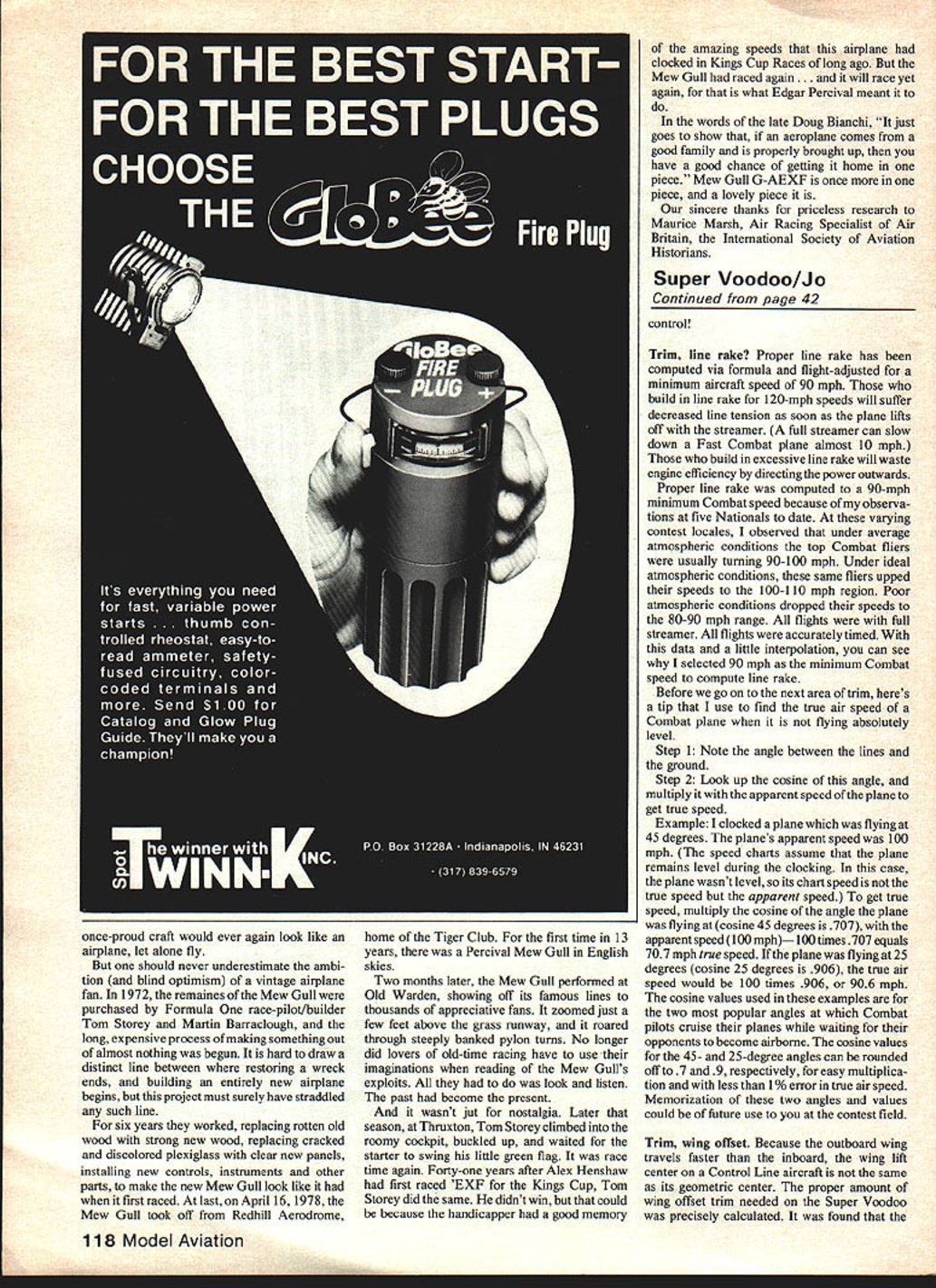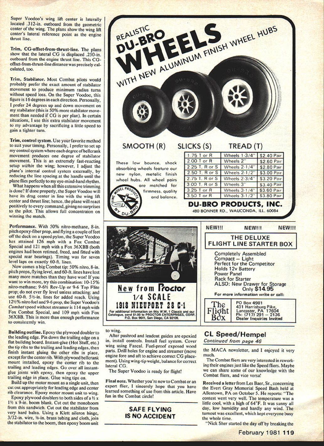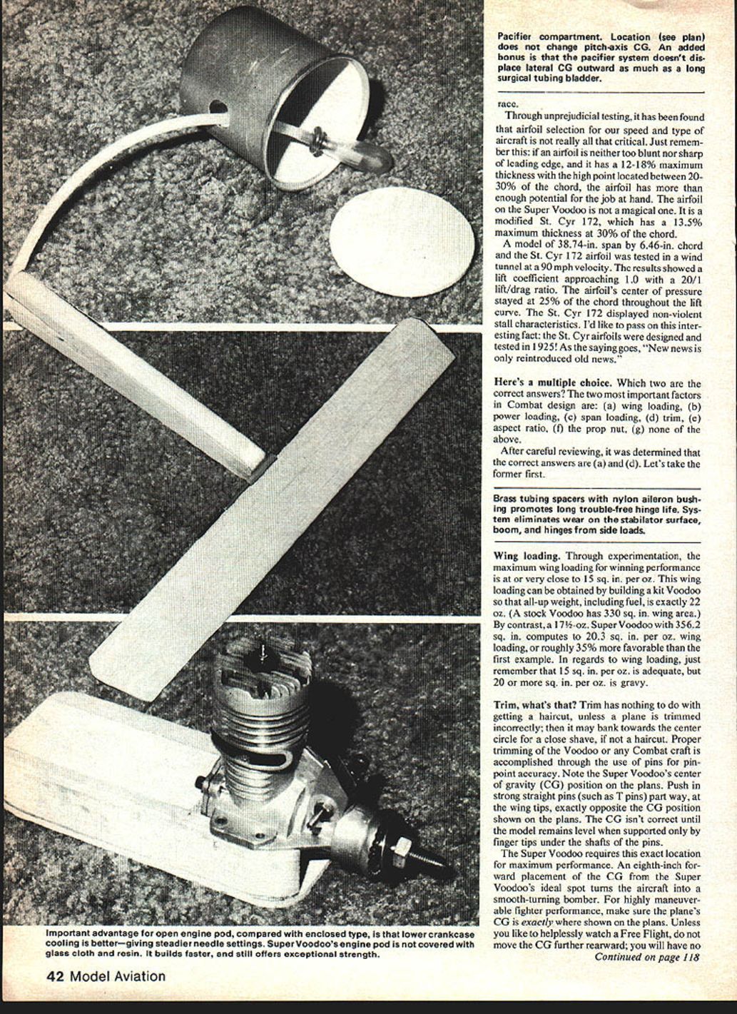 The author former Nationals CombatChampion hastaken home hardware three out five Natato date has won 80% local meets has entered Consistent equipment positive mental attitude keys success mention well-designed/trimmed airplane IN MY beginning days Combat Voodoo performance plane good stock form however sought higher level started experiment During first two years development ensuing modified Voodoos quite successful local regional national competition Now after seven cumulative years evolu tionary work Voodoos great-grandson no longer gives clues its family ancestry Super Voodoo completely different its forebearer way Super Voodoos design concept focuses competition practicality sacrificing thing Combat maneuvering ability easily said difficult achieve design parameter Super Voodoo satisfies de sired goal through careful research application proven aerodynamic theories plane scientifically designed thoroughly engineered Bill Netzeband premier geniuses Control Line aeronautics aided immensely pearls wisdom After reviewing published articles no easy task itselfl after eight-hours-a-day question answer sessions after explanations re-explanations data sheets cover just about everything Control Line aerodynamics Super Voodoo slowly started form drawing board Lets take peek Wing top view ultimate layout would leading trailing edges would taper towards other tip such way center-of-pressure would located quarter-chord point along span compared non-tapered rectangular wing tapered layout locates mean aerodynamic center wing half closer planes center line reduces stress concentrations bear directly planes center structure Sweeping trailing edge forward tip leaving leading edge straight progres sively moves center-of-pressure forward much CL Combat piloting ability much plane know would answer question top pilot flying top plane then. Super Voodoo carefully thought out proven contests_ 40 Model Aviation FULL-SIZE PLANS AVAILABLE . SEE PAGE 128 3/B 3/4 MAPLE MOTOR OERATS~\ VR PLY MOTOR MAlAY DOLBIEB ENONIE SHOWN III I/1B HARD BALSA TRAILING EDGE VR PLY L E OGOPLER 0 PLYWOGO REUIIRANK MT 3/B 3/4 MAPLE MOTOR MOIATS 3/R BALSA TRBI OUT TO FIT LE OF WING NESIC AWE HJSIIROO~ CLOYR REINFORCEMENT7 K NED UROR BALSA LEADRAG ODOR STOOl IIFIi 1-ffi 1116 PLY OOEIORS HO BALSA BOOM VB BRASH TUBING S32 MEDIC WIRE / VB lABOR BALSA STAWLATOR K Ii WING RWD-I/IB MED MO BALSA B REGO CENTER BA- MED ME BALSA TRIM FOR LE DSAWBB TRW F MOLCRRME MANY JFALOR RIB VOMED HO BALSA BOOR- 2 PLY DOWLORS REdO SLAEY VOODOO DESIGNED S DRAWN BY 30W4 JO TRACING BY JOE CEMBRCO wing center line tip can produce sudden unwanted glitches Super Voodoos rectangular wing also keeps its center-of-pressure along quarter chord however layout builds up stress wings center structure due panels outwardly displaced mean aerodynamic center Fortunately extra stress easily compensated construction technique Strong Sig leading edge stock two-ounce density per 36-in length integral five-ply doubler keep wing intact Trailing edge stock should very hard balsa complement leading edge components keeping wing together Inci dentally plastic coverings contribute virtually nothing structural integrity Wing side view has lot conjec ture concerning airfoil design relatively low speed 90-110 mph aircraft have seen everything Combat design sharp leading edge rapier airfoil blunt leading edge blimp airfoil former would suited hypersonic moon shots latter would quite happy leisurely balloon February 1981 41 V4 SOFT BALSA AlNO TIPS ___________________ VW NED ME BALSA BS PLY RELLCRAIAO MYALA PEWI HP WEBABIS ALOM MACWEB CANlABOR AS NEERED IW BRASS SIRING WILLCRAME-F A FALSE RIB VBSOFT BALSA FIEDIBAE LEADOIJTS IMED MO BALSA RIB VA PLY POARIUG GAADE LY6 PLY DEDALERSPUGARGORYLON ALEROR AWARE LEAORE EDREAND 5 BEaCRANOVB BALSA YE Unelncfl center rib integral belicrank mount allows easy checking maintenance complete control system Frayed flex ible leads worn bellcrank holes either indicate need replacementl can seen readily through clear iron-on covering Author uses Fascal latest miracle adhesives such Hot Stuff epoxy Super Voodoo builds fast faster other plane Once parts cut out plane can built couple hours race Through unprejudicial testing has found airfoil selection speed type aircraft really critical Just remem ber airfoil neither too blunt nor sharp leading edge has 12-18% maximum thickness high point located between 2030% chord airfoil has enough potential job hand airfoil Super Voodoo magical modified St Cyr 172 has 135% maximum thickness 30% chord model 3874-in span 646-in chord St Cyr 172 airfoil tested wind tunnel 90mph velocity results showed lift coefficient approaching 10 20/1 lift/drag ratio airfoils center pressure stayed 25% chord throughout lift curve St Cyr 172 displayed non-violent stall characteristics Id like pass inter esting fact St Cyr airfoils designed tested 1925 As saying goes New news reintroduced old news Heres multiple choice Which two correct answers two important factors Combat design wing loading b power loading c span loading d trim e aspect ratio 0 prop nut g above After careful reviewing determined correct answers d Lets take former first Brass tubing spacers nylon aileron bush ing promotes long trouble-free hinge life Sys tem eliminates wear stabilator surface boom hinges side loads Wing loading Through experimentation maximum wing loading winning performance very close 15 sq per oz wing loading can obtained building kit Voodoo all-up weight including fuel exactly 22 oz stock Voodoo has 330 sq wing area contrast 17-oz Super Voodoo 3562 sq computes 203 sq per oz wing loading roughly 35% favorable first example regards wing loading just remember 15 sq peroz adequate 20 sq per oz gravy Trim whats Trim has nothing getting haircut unless plane trimmed incorrectly may bank towards center circle close shave haircut Proper trimming Voodoo Combat craft accomplished through use pins pin point accuracy Note Super Voodoos center gravity CG position plans 