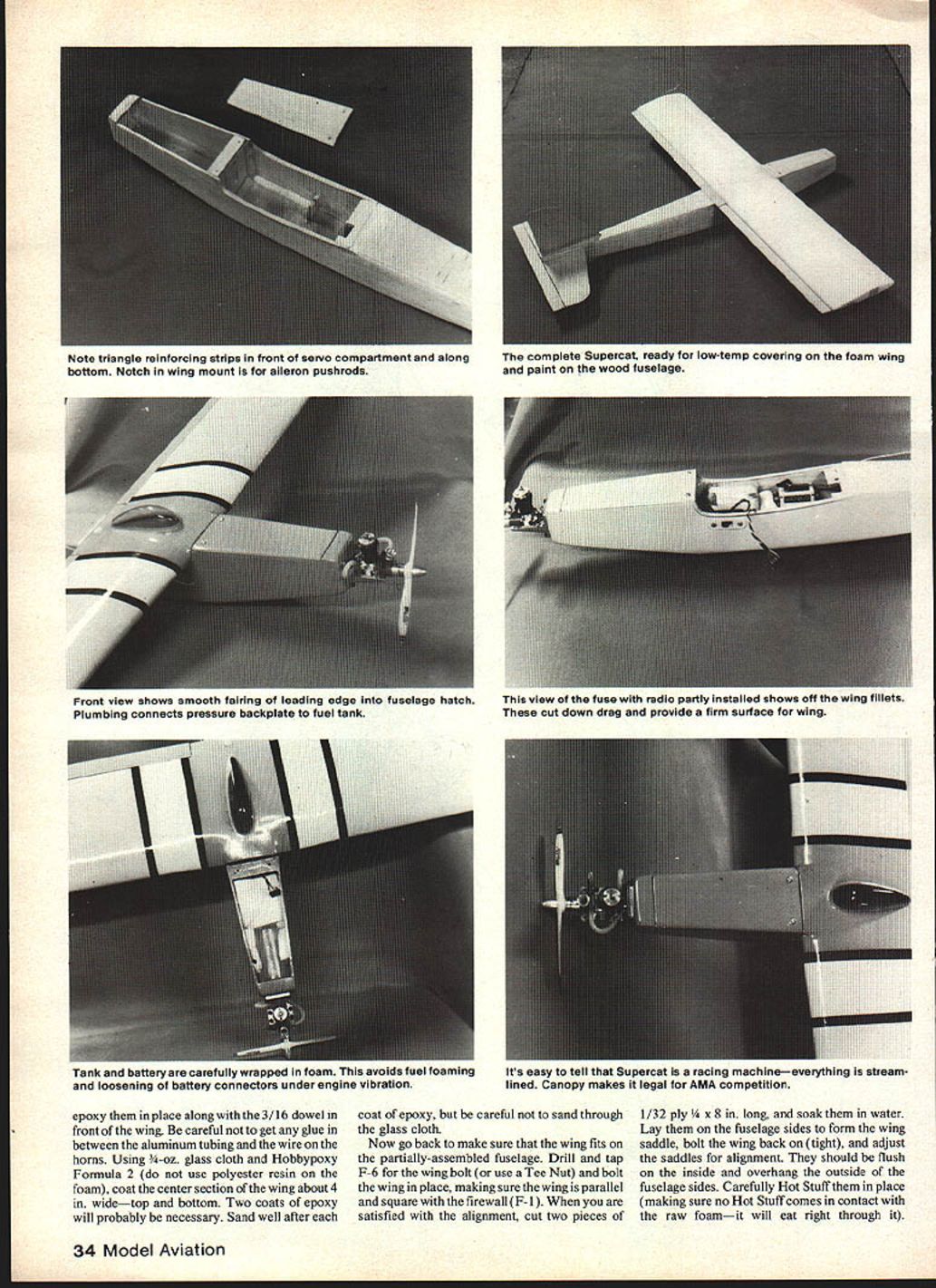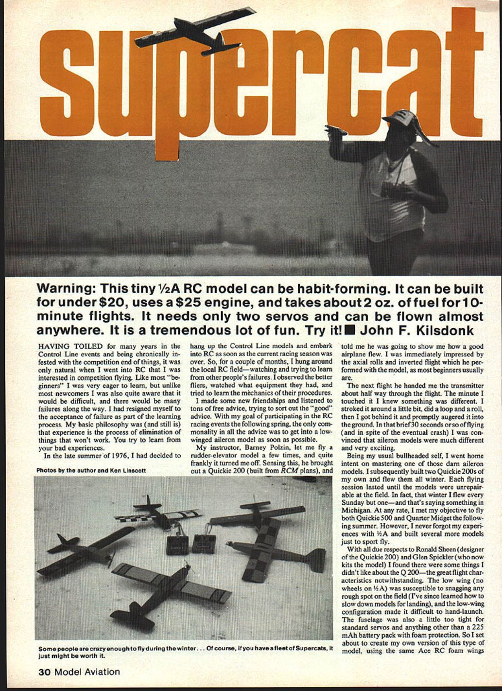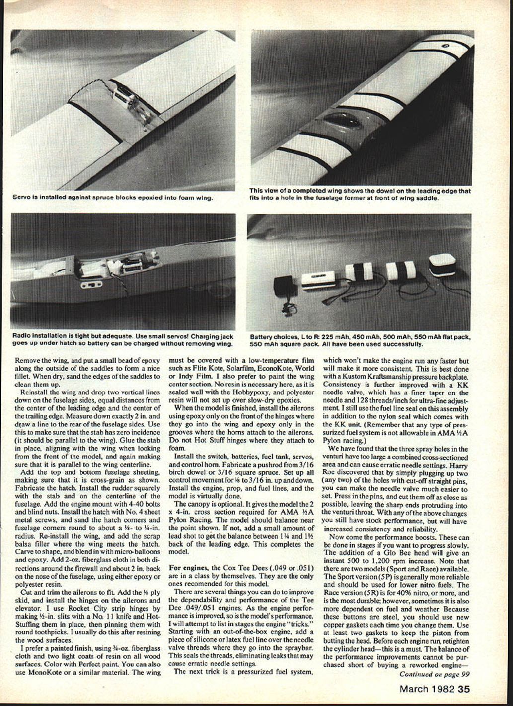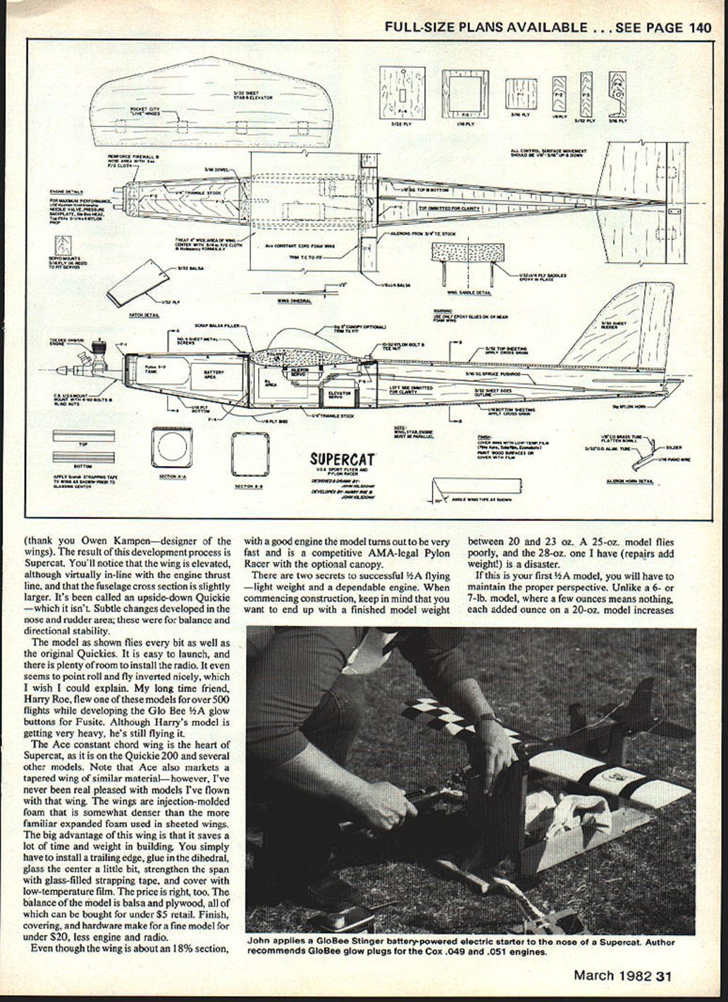Warning tiny1/2A RC model can habit-forming can built under $20 uses $25 engine takes about 2 oz fuel 10minute flights needs two servos can flown almost anywhere tremendous lot fun Try itE John F Kilsdonk HAVING TOILED years Control Line events being chronically fested competition end things natural went RC interested competition flying Like ginners very eager learn unlike newcomers also quite aware would difficult would failures along way resigned myself acceptance failure part learning process basic philosophy still experience process elimination things wont work try learn bad experiences late summer 1976 decided hang up Control Line models embark RC soon current racing season over So couple months hung around local RC fieldwatching trying learn other peoples failures observed better fliers watched what equipment tried learn mechanics procedures made some new friendships listened tons free advice trying sort out good advice goal participating RC racing events following spring com monality advice get lowwinged aileron model soon possible instructor Barney Polzin let fly rudder-elevator model few times quite frankly turned off Sensipo brought Quickie 200 built tf plans told going show good airplane flew inunediately impressed axial rolls inverted flight per formed model beginners usually next flight handed transmitter about half way through flight minute touched knew something different stroked around little bit did loop roll got behind prompfly augered ground brief 30 seconds flying spite eventual crash con vinced aileron models much different very exciting Being usual bullheaded self went home intent mastering darn aileron models subsequently built two Quickie 200s own flew winter flying session lasted until models unrepair able field fact winter flew Sunday oneand thats saying something Michigan rate met objective fly both Quickie 500 Quarter Midget follow ing summer However never forgot experi ences built several models just sport fly due respects Ronald Sheen designer Quickie 200 Glen Spickler now kits model found some things didnt like about Q 200the great flight char acteristics notwithstanding low wing no wheels susceptible snagging rough spot field Ive since learned slow down models landing low-wing configuration made difficult hand-launch fuselage also little too tight standard servos anything other 225 mAh battery pack foam protection So set about create own version type model using same Ace RC foam wings 30 Model Aviation Somepeoplearecrazyenoughtoflyduringthewinter. course have fleetof Supercats just might worth FULL-SIZE PLANS AVAILABLE . SEE PAGE 140 p7j QEE~LT 5155 PUTLIKeLY TI- ESOICE KKTMLS IVTMAOROIE STOCK COW EACOSOJCA PEWTOWOOARE F-R 050 OCSCSR OCOTKORAEAM CEEPUE AALOKCKEOSIARKIL OOCKFLCTC OASBEAO ___In OAARORW PROj K/%TKSTOOC TREAT # ORE OJRKOCFWWS S OMASWC P004422 00 K/OR MAEKTW KAMAP BALSA FLLERJCAAEWCCORICORSEAJWMORR TRE ORE 055/SWFKAAREET STAI KAWEWKS-WA WCUOR EOLrS EREMAKCC MACF TORMACETBIG ____________I AK K-I ITASCOrERSIS/IS SO SPRUCE POKAREOR1 05LIZARECOTBLISOTORFOR 5SIYK/SA SECT SOPS SBBSUOR Sc LI/K P00[WPLT 31151 S TO ORKS AS WSOWKTO JSO2O-MWLESCKSCKSASSCOWS SUPERCAT IRMAWMGKAKI K/StOaALa WORS1tL ROtORS thank Owen Kampendesigner wings result development process Supercat Youll notice wing elevatedC although virtually in-line engine thrust line fuselage cross section slightly larger Its called upside-down Quickie isnt Subtle changes developed nose rudder area balance directional stability model shown flies bit well original Quickies easy launch plenty room install radio seems point roll fly inverted nicely wish could explain long time friend Harry Roe flew models over 500 flights developing Gb Bee glow buttons Fusite Although Harrys model getting very heavy hes still flying Ace constant chord wing heart Supercat Quickie 200 several other models Note Ace also markets tapered wing similar materialhowever IRve never real pleased models Ive flown wing wings injection-molded foam somewhat denser familiar expanded foam used sheeted wings big advantage wing saves lot time weight building simply have install trailing edge glue dihedral glass center little bit strengthen span glass-filled strapping tape cover low-temperature film price right too balance model balsa plywood can bought under $5 retail Finish covering hardware make fine model under $20 less englne radio though wing about 18% section good engine model turns out very fast competitive AMA-legal Pylon Racer optional canopy two secrets successful flying light weight dependable engine commencing construction keep mind want end up finished model weight between 20 23 ox 25-az model flies poorly 28-az have repairs add weight disaster first model will have maintain proper perspective Unlike 6- 7-lb model few ounces means nothing added ounce 20-oz model increases March 198231 John applies GloBee Stinger battery-powered electric starter ti30 iose mmends GloBee glow plugs Cox 049 051 engines wing loading 5% stick plans use reasonable wood moderate amount epoxy should have no trouble coming out around 21 oz last three versions built -oz glass cloth resin covered two coats Perfect paint wood surfaces weighed 215 oz ready go 500 mAh battery pack Construction straightforward start cut out pieces per plans Locate glue F-4 F-S fuselage sides followed F-i F-3 F-6 glue F-2 Use epoxy F-i F-2 also triangle stock omit nose area Hot Stuff Tee Dee engine recommended accessories Ito GloBee head KK needle valve KK pressure backplate piston/rod reset tool Bottom view partially-completed fuse Cutout elevator servo Top partially-completed fuselage bottom shows covered sheeting floor added servo compartment square rear fuselage sides Lightly sand top bottom fuselage sides block put fuselage aside Glue rudder pieces together sand round edges rudder stab elevator wing next Cut sand flashing foam sections using 220 paper sand dihedral angle give total dihedral r tip Epoxy two halves together maintaining alignment close possible avoid twi