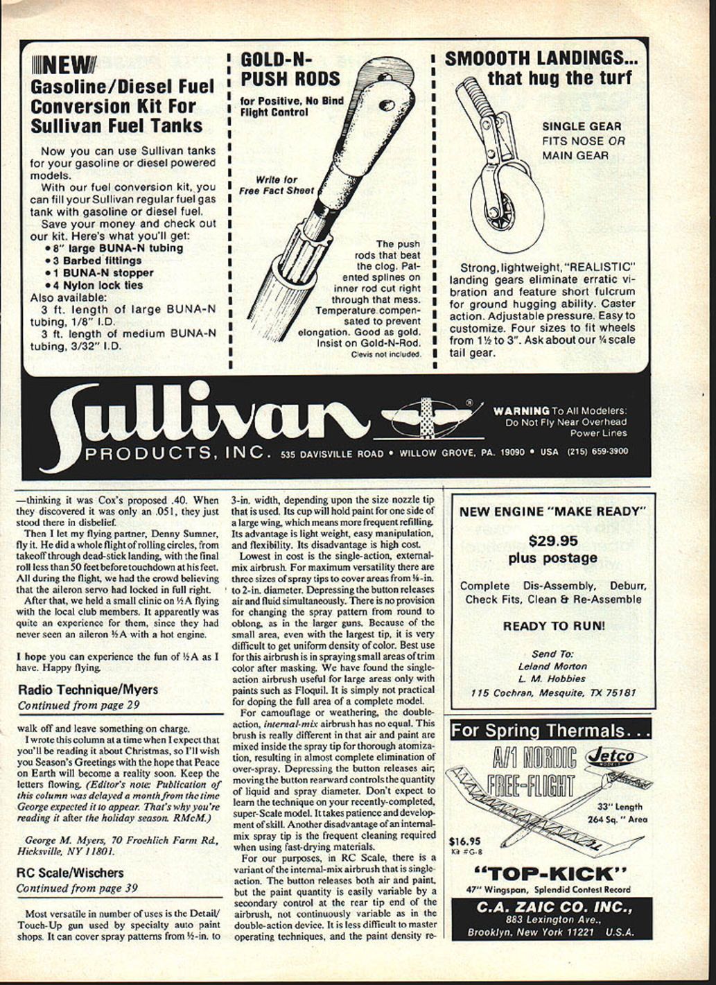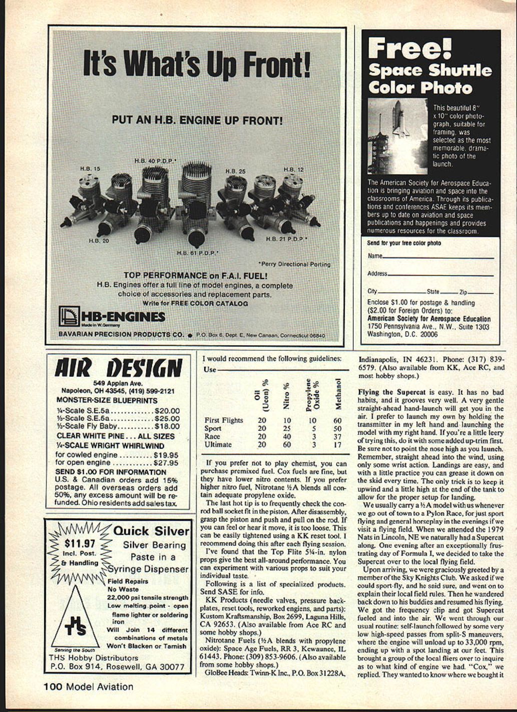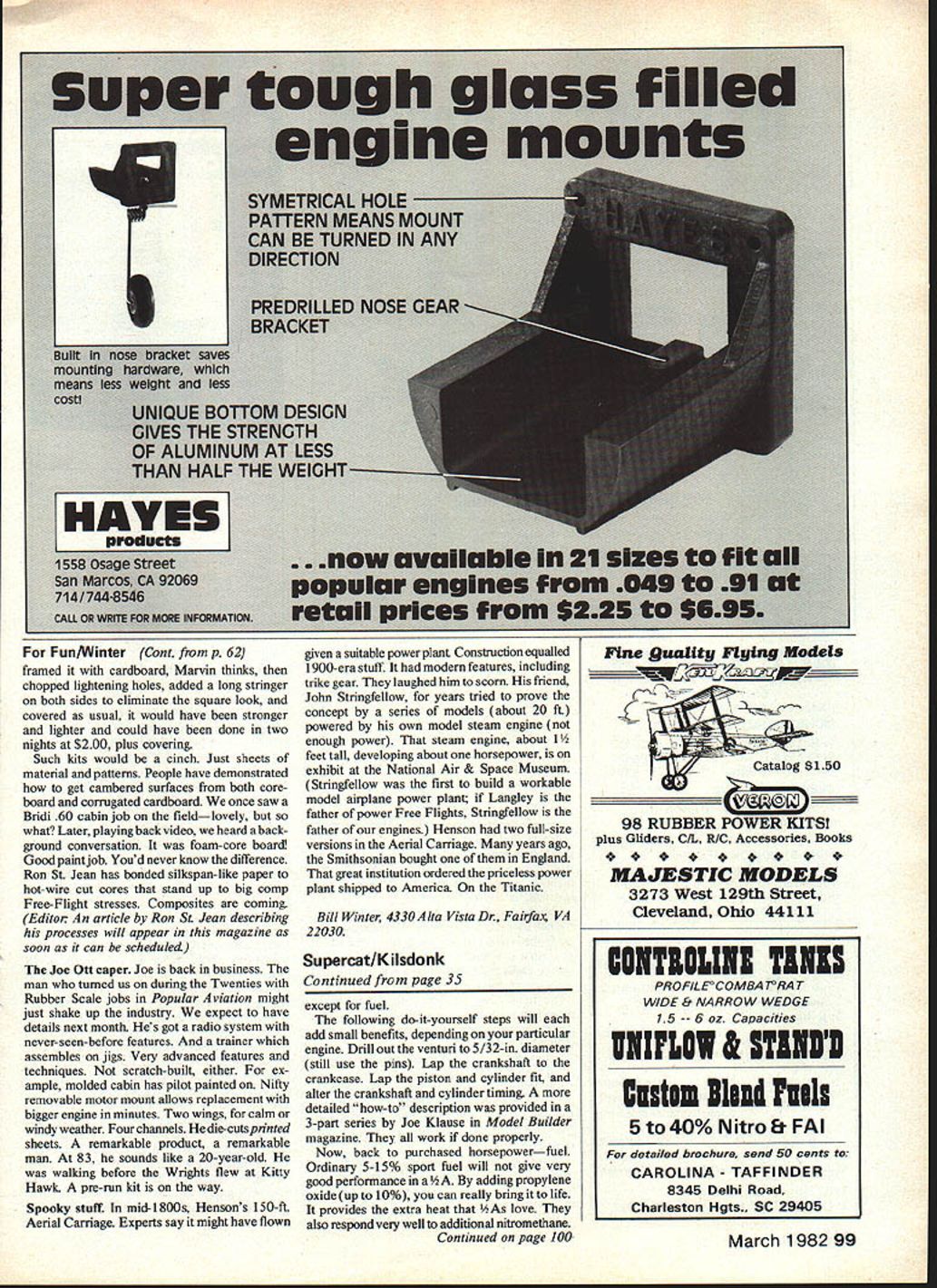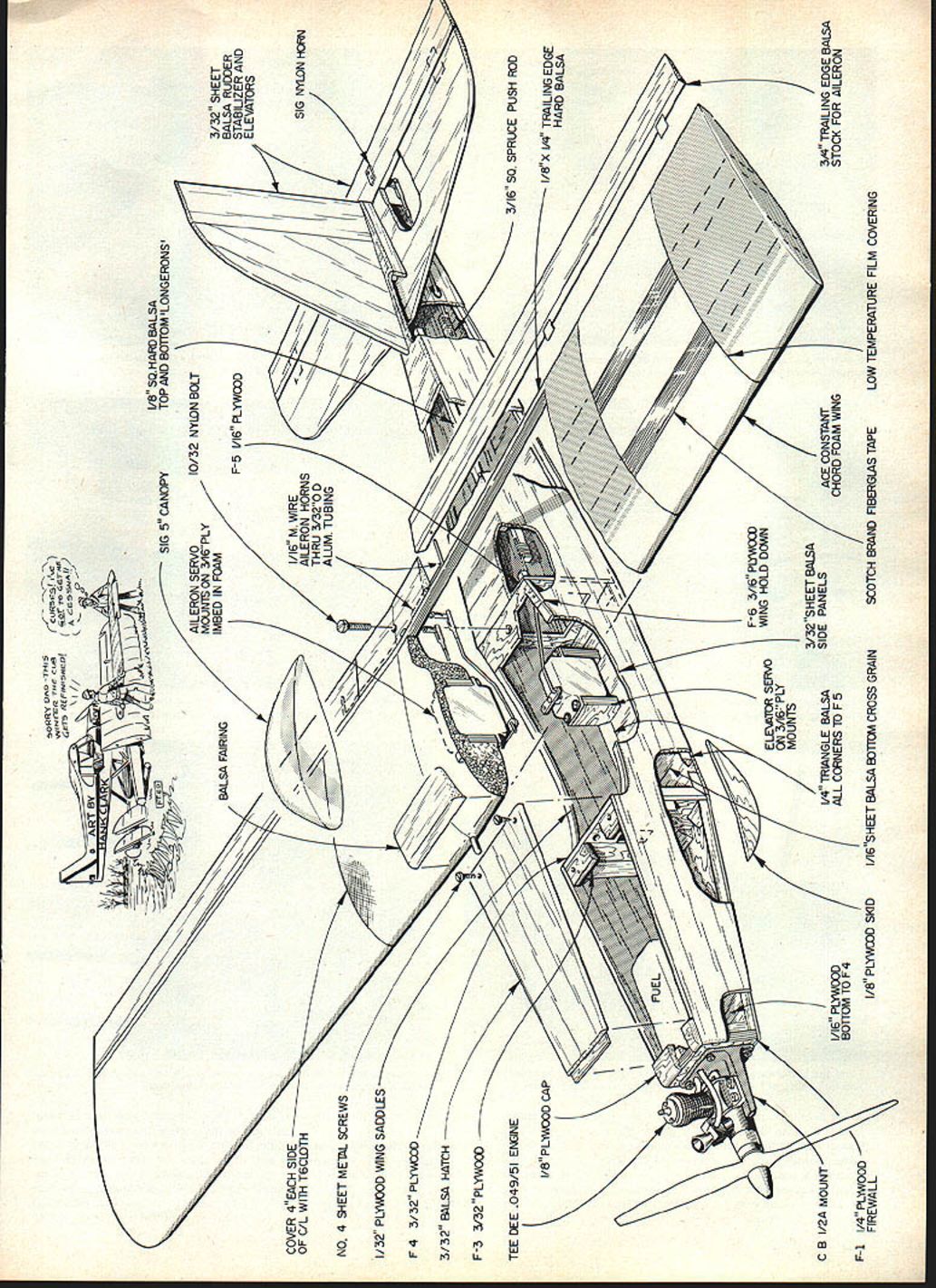 Warning tiny1/2A RC model can habit-forming can built under $20 uses $25 engine takes about 2 oz fuel 10minute flights needs two servos can flown almost anywhere tremendous lot fun Try itE John F Kilsdonk HAVING TOILED years Control Line events being chronically fested competition end things natural went RC interested competition flying Like ginners very eager learn unlike newcomers also quite aware would difficult would failures along way resigned myself acceptance failure part learning process basic philosophy still experience process elimination things wont work try learn bad experiences late summer 1976 decided hang up Control Line models embark RC soon current racing season over So couple months hung around local RC fieldwatching trying learn other peoples failures observed better fliers watched what equipment tried learn mechanics procedures made some new friendships listened tons free advice trying sort out good advice goal participating RC racing events following spring com monality advice get lowwinged aileron model soon possible instructor Barney Polzin let fly rudder-elevator model few times quite frankly turned off Sensipo brought Quickie 200 built tf plans told going show good airplane flew inunediately impressed axial rolls inverted flight per formed model beginners usually next flight handed transmitter about half way through flight minute touched knew something different stroked around little bit did loop roll got behind prompfly augered ground brief 30 seconds flying spite eventual crash con vinced aileron models much different very exciting Being usual bullheaded self went home intent mastering darn aileron models subsequently built two Quickie 200s own flew winter flying session lasted until models unrepair able field fact winter flew Sunday oneand thats saying something Michigan rate met objective fly both Quickie 500 Quarter Midget follow ing summer However never forgot experi ences built several models just sport fly due respects Ronald Sheen designer Quickie 200 Glen Spickler now kits model found some things didnt like about Q 200the great flight char acteristics notwithstanding low wing no wheels susceptible snagging rough spot field Ive since learned slow down models landing low-wing configuration made difficult hand-launch fuselage also little too tight standard servos anything other 225 mAh battery pack foam protection So set about create own version type model using same Ace RC foam wings 30 Model Aviation Somepeoplearecrazyenoughtoflyduringthewinter. course have fleetof Supercats just might worth FULL-SIZE PLANS AVAILABLE . SEE PAGE 140 p7j QEE~LT 5155 PUTLIKeLY TI- ESOICE KKTMLS IVTMAOROIE STOCK COW EACOSOJCA PEWTOWOOARE F-R 050 OCSCSR OCOTKORAEAM CEEPUE AALOKCKEOSIARKIL OOCKFLCTC OASBEAO ___In OAARORW PROj K/%TKSTOOC TREAT # ORE OJRKOCFWWS S OMASWC P004422 00 K/OR MAEKTW KAMAP BALSA FLLERJCAAEWCCORICORSEAJWMORR TRE ORE 055/SWFKAAREET STAI KAWEWKS-WA WCUOR EOLrS EREMAKCC MACF TORMACETBIG ____________I AK K-I ITASCOrERSIS/IS SO SPRUCE POKAREOR1 05LIZARECOTBLISOTORFOR 5SIYK/SA SECT SOPS SBBSUOR Sc LI/K P00[WPLT 31151 S TO ORKS AS WSOWKTO JSO2O-MWLESCKSCKSASSCOWS SUPERCAT IRMAWMGKAKI K/StOaALa WORS1tL ROtORS thank Owen Kampendesigner wings result development process Supercat Youll notice wing elevatedC although virtually in-line engine thrust line fuselage cross section slightly larger Its called upside-down Quickie isnt Subtle changes developed nose rudder area balance directional stability model shown flies bit well original Quickies easy launch plenty room install radio seems point roll fly inverted nicely wish could explain long time friend Harry Roe flew models over 500 flights developing Gb Bee glow buttons Fusite Although Harrys model getting very heavy hes still flying Ace constant chord wing heart Supercat Quickie 200 several other models Note Ace also markets tapered wing similar materialhowever IRve never real pleased models Ive flown wing wings injection-molded foam somewhat denser familiar expanded foam used sheeted wings big advantage wing saves lot time weight building simply have install trailing edge glue dihedral glass center little bit strengthen span glass-filled strapping tape cover low-temperature film price right too balance model balsa plywood can bought under $5 retail Finish covering hardware make fine model under $20 less englne radio though wing about 18% section good engine model turns out very fast competitive AMA-legal Pylon Racer optional canopy two secrets successful flying light weight dependable engine commencing construction keep mind want end up finished model weight between 20 23 ox 25-az model flies poorly 28-az have repairs add weight disaster first model will have maintain proper perspective Unlike 6- 7-lb model few ounces means nothing added ounce 20-oz model increases March 198231 John applies GloBee Stinger battery-powered electric starter ti30 iose mmends GloBee glow plugs Cox 049 051 engines wing loading 5% stick plans use reasonable wood moderate amount epoxy should have no trouble coming out around 21 oz last three versions built -oz glass cloth resin covered two coats Perfect paint wood surfaces weighed 215 oz ready go 500 mAh battery pack Construction straightforward start cut out pieces per plans Locate glue F-4 F-S fuselage sides followed F-i F-3 F-6 glue F-2 Use epoxy F-i F-2 also triangle stock omit nose area Hot Stuff Tee Dee engine recommended accessories Ito GloBee head KK needle valve KK pressure backplate piston/rod reset tool Bottom view partially-completed fuse Cutout elevator servo Top partially-completed fuselage bottom shows covered sheeting floor added servo compartment square rear fuselage sides Lightly sand top bottom fuselage sides block put fuselage aside Glue rudder pieces together sand round edges rudder stab elevator wing next Cut sand flashing foam sections using 220 paper sand dihedral angle give total dihedral r tip Epoxy two halves together maintaining alignment close possible avoid twi