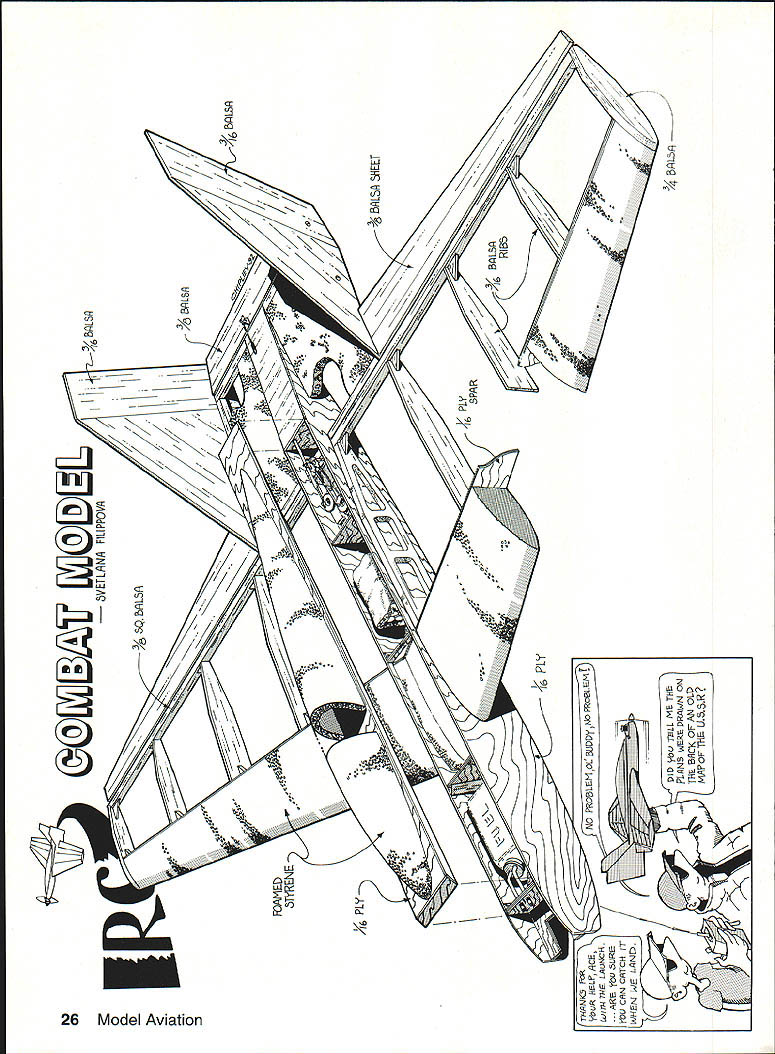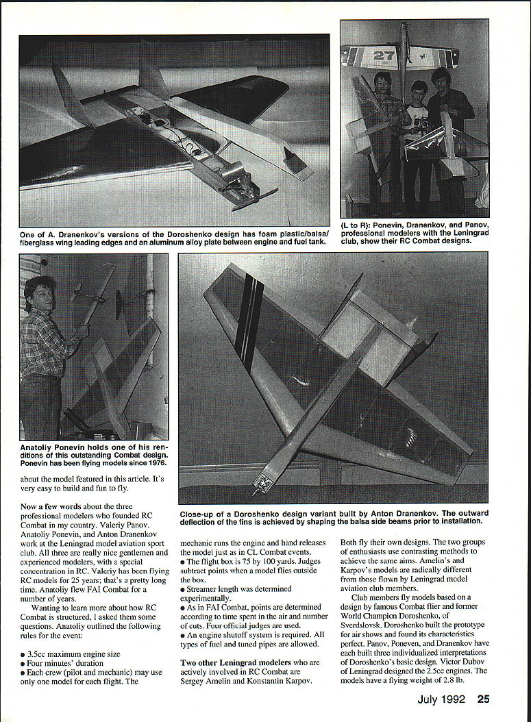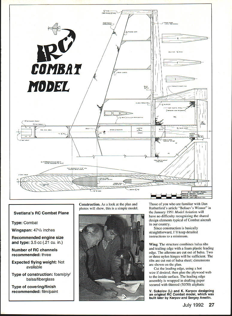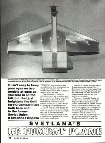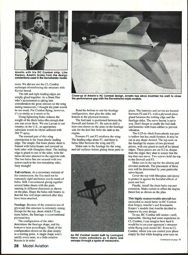 An RC Combat model built Leningrad model aviation club members uerivea worn aesign famous Combat tiler former FAI World Champion Doroshenko plane easily flown beginners experienced fliers need limited Combat isnt easy keep eyes two models once zero kill just heightens thrill RC Combat fliers both former Soviet Union U Svetlana Filippova THE PLANES streak straight up descend spin silver wings glimmering zoom through series breathtaking maneuvers Theyre stable aerobatic same time models course full-scale airplanes some credit capably fly goes skill RC pilots guiding uninitiated can see planes represent military aircraft except streamers floating behind Yes RC Combat being flown country too former Soviet Union US people always searching new forms self-expression new sensations process inventing new types sport variations existing sport never-ending first RC Combat meet took place Leningrad during summer 1991 People invited other cities out-of-towners probably looked upon event mainly show modelers Leningrad saw first test exciting new adventure knows whether RC Combat will take hold country eventually forgotten development RC event former Soviet Union hindered problems indigenous radio systems now guys US alone Maybe knowing little bit about experiences building techniques will help motivate continue youre just starting out RC flying definitely ready Combat may find useful read SVETLANAS 24 Model Aviation about model featured article Its very easy build fun fly Now few words about three professional modelers founded RC Combat country Valeriy Panov Anatoliy Ponevin Anton Dranenkov work Leningrad model aviation sport club three really nice gentlemen experienced modelers special concentration RC Valeriy has flying RC models 25 years thats pretty long time Anatoliy flew FAI Combat number years Wanting learn about RC Combat structured asked some questions Anatoliy outlined following rules event 35cc maximum engine size Four minutes duration crew pilot mechanic may use model flight mechanic runs engine hand releases model just CL Combat events flight box 75 100 yards Judges subtract points model flies outside box Streamer length determined experimentally As FAI Combat points determined according time spent air number cuts Four official judges used An engine shutoff system required types fuel tuned pipes allowed Two other Leningrad modelers actively involved RC Combat Sergey Amelin Konstantin Karpov Both fly own designs two groups enthusiasts use contrasting methods achieve same aims Amelin s Karpovs models radically different flown Leningrad model aviation club members Club members fly models based design famous Combat flier former World Champion Doroshenko Sverdslovsk Doroshenko built prototype air shows found its characteristics perfect Panov Poneven Dranenkov have built three individualized interpretations Doroshenkos basic design Victor Dubov Leningrad designed 25cc engines models have flying weight 28 lb July1992 25 L TO II roflevin Dranenkov Panov Dranenkovs versions Doroshenko design has foam plasticlbalsal professional modelers Leningrad fiberglass wing leading edges aluminum alloy plate between engine fuel tank club show RC Combat designs Anatolly Ponevin holds ren ditions outstanding Combat design Ponevin has flying models since 1976 Close-up Doroshenko design variant built Anton Dranenkov outward deflection fins achieved shaping balsa side beams prior installation 5VETLN FLiPPQV/-I / / 73 BALS1 0 BALS EET N LS RIBS- N N 4 L5 / N 0 0 0 CD 0 i -3 HAAJK5 FOR YouR HELACENo YOLJ5URE VOU CN CArCN F WHEN WE LANE D ThLL AlE THE PlANS WERE PRAWN ON TIAE a/CK Ol OLD AAPoF THE USSR AAAAAA VAS Vs fl VASSALS LI6 CuBA 7 PIODEL LACALAL jiU IFL2ALSAALAAAAAA A523456 MN BA SATAAAAA VIUAPOA familiar Dan Rutherfords article Beliaevs Winner January 1991 Model Aviation will have no difficulty recognizing shared design elements typical Combat aircraft country Since construction basically straightforward Ill keep detailed instructions minimum Wing structure combines balsa ribs trailing edge foam plastic leading edge ailerons cut out balsa Two three nylon hinges will sufficient ribs cut out balsa sheet dimensions shown plan Cut leading edge using hot wire desired glue plywood web inside surface leading edge assembly wrapped drafting paper secured thinned 50/50 aliphatic V Sokolov L K Karpov designing original RC Combat model built later Karpoy Sergey Amelin July1992 27 1IV t VA CA 7f 1 ASSI -77-A ALA&ASALCLA 4Construction As look plan photos will show simple model Svetlanas RC Combat Plane Type Combat Wingspan 471/2 inches Recommended engine size type 35 cc 21 Cu Number RC channels recommended three Expected flying weight available Type construction foam/ply balsafiberglass Type covering/finish recommended film/paint resin did use CL Combat technique reinforcing structure Keviar thread left right leading edges simply glued together As Stunt flier whos accustomed taking consideration great stresses wing during maneuvers thought joint would too weak Combat flying however its sturdy needs Using lightening holes reduces weight thick balsa ribs enough can cover use Lavsan country US appropriate substitute would Mylar adhered 3M 77 spray unusual part wing construction foam plastic leading edge simple flat foam plastic sheet framed balsa beams covered both sides fiberglass sheet trailing edge glued sides balsa elevator attached opposite side two balsa fins secured two screws two remaining sides Easy enough Tail surfaces As secondary element construction fins need extremely rigid hence can made balsa Still recommend gluing together several balsa sheets grain running different directions shown plan Shape balsa side beams fins will slope outward after have attached Fuselage Because extensive use plywood structure extremely strong Except top about Ill say below fuselage conventional plywood box configuration sides determines fuselage shape bottom bent accordingly Think configuration shown plan simply starting point singl