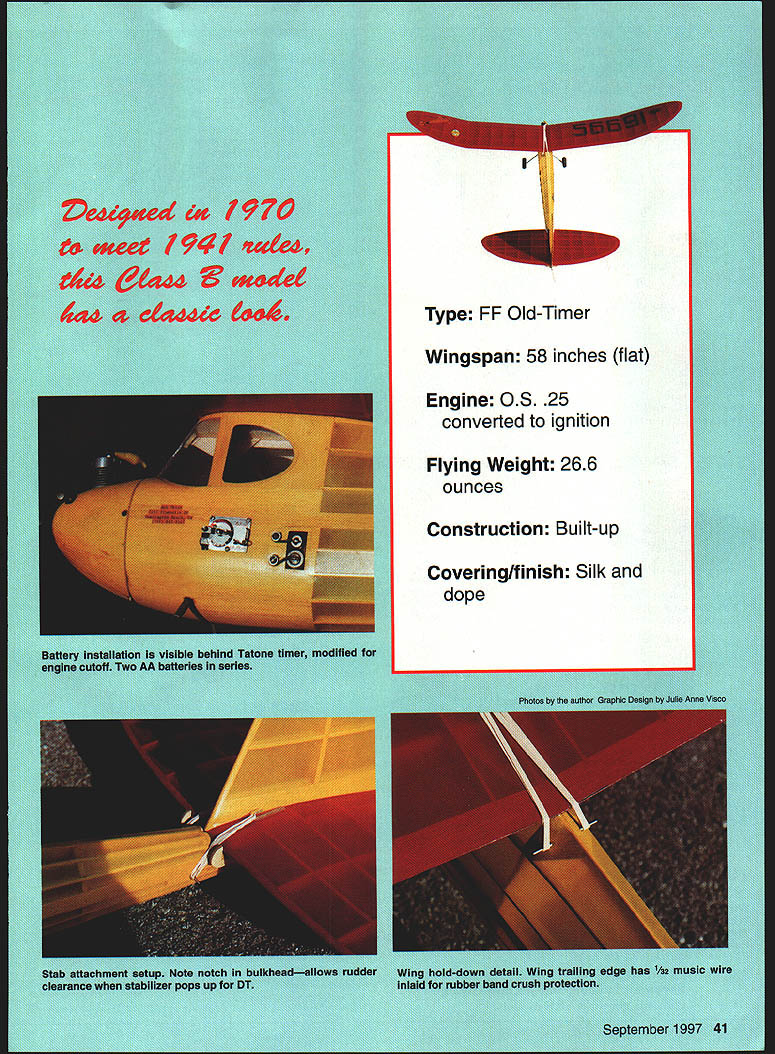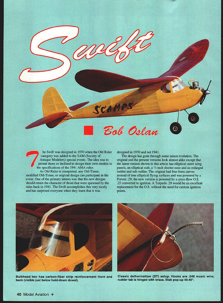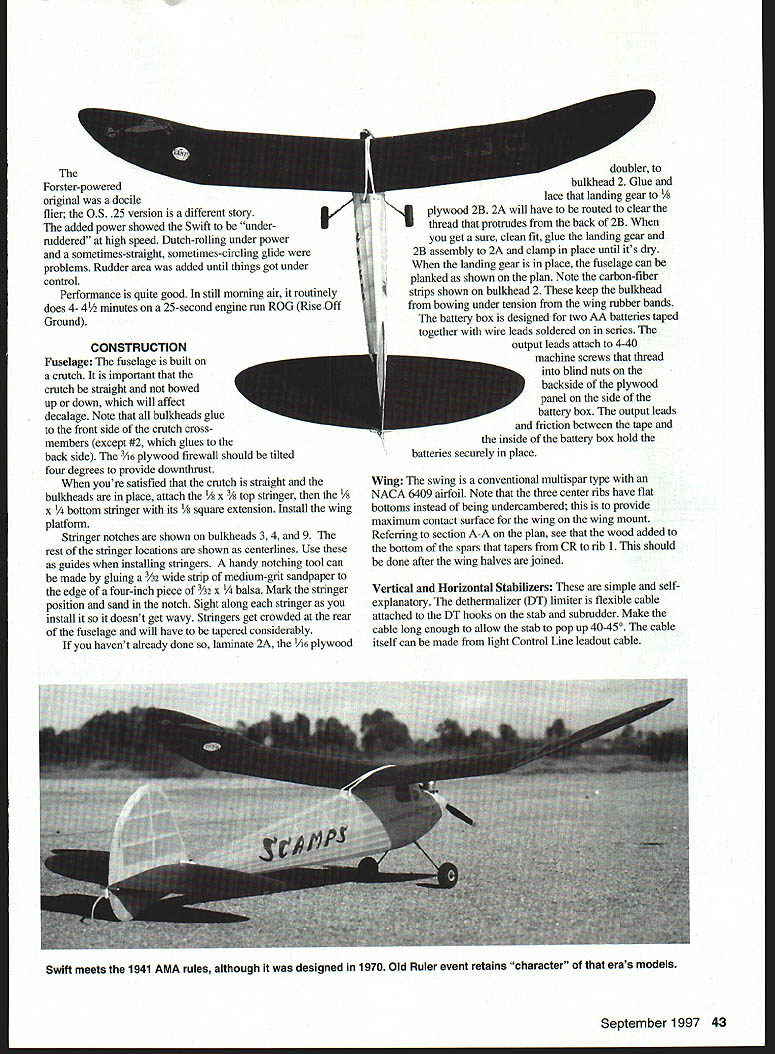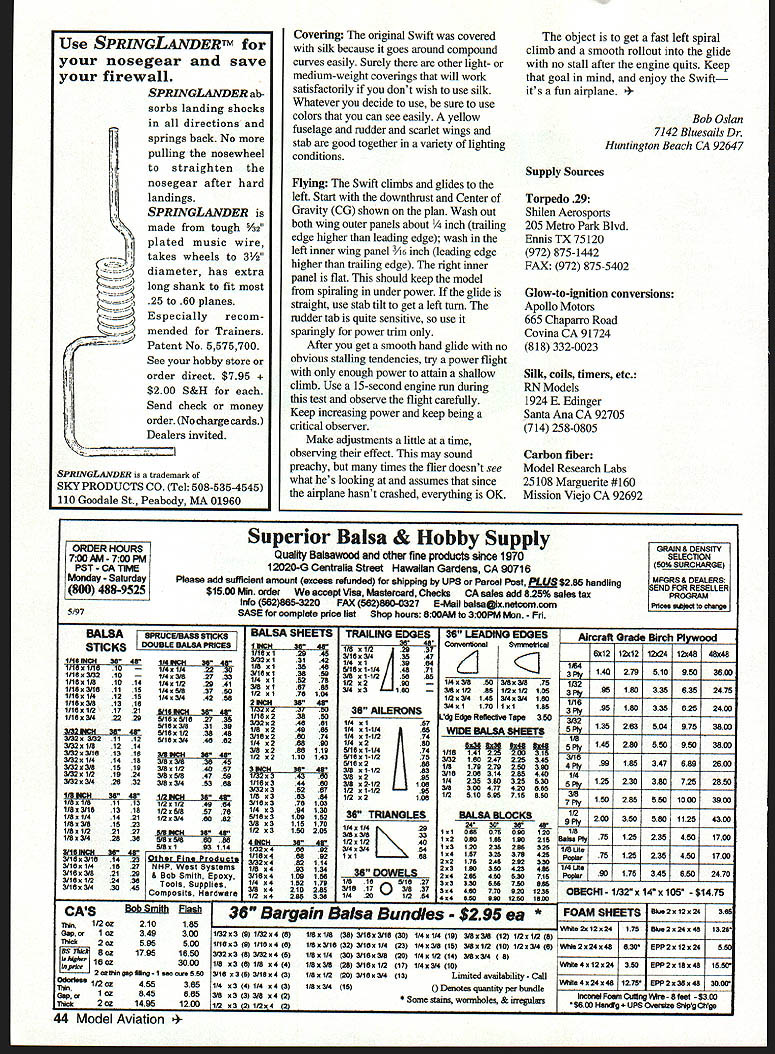 lieS categi Antiqrv t th specificE As Old jified Old-Timt t p uld setain ci s back 1941 surprised evc de too istothe pan 11 theinst 25 re p minor evoluti almost alike e excellent neeo ror custom ignition I Type FE Old-Timer Wingspan 58 inches flat Engine OS 25 converted ignition Flying Weight 266 ounces Construction Built-up Covering/finish Silk dope Forster-powered original docile flier OS 25 version different story r added power showed Swift under ruddered high speed Dutch-rolling under power sometimes-straight sometimes-circling glide problems Rudder area added until things got under control Performance quite good still morning air routinely does 4- 4/2 minutes 25-second engine run ROG Rise Off Ground CONSTRUCTION Fuselage fuselage built crutch important crutch straight bowed up down will affect decalage Note bulkheads glue front side crutch crossmembers except #2 glues back side 3A6 plywood firewall should tilted four degrees provide downthrust youre satisfied crutch straight bulkheads place attach /8 x 3/ top stringer /s x om stringer its /s square extension Install wing platform Stringer notches shown bulkheads 34 9 rest stringer locations shown centerlines Use guides installing stringers handy notching tool can made gluing A2 wide strip medium-grit sandpaper edge four-inch piece /32 x a Mark stringer position sand notch Sight along stringer install doesnt get wavy Stringers get crowded rear fuselage will have tapered considerably havent already done laminate 2A 1A6 plywood doubler bulkhead 2 Glue lace landing gear /s plywood 2B 2A will have routed clear 1 thread protrudes back 2B get sure clean fit glue landing gear 2B assembly 2A clamp place until its dry landing gear place fuselage can planked shown plan Note carbon-fiber strips shown bulkhead 2 keep bulkhead bowing under tension wing rubber bands battery box designed two AA batteries taped together wire leads soldered series output leads attach 4-40 machine screws thread blind nuts backside plywood panel side battery box output leads friction between tape inside battery box hold batteries securely place Wing swing conventional multispar type NACA 6409 airfoil Note three center ribs have flat bottoms instead being undercambered provide maximum contact surface wing wing mount Referring section A-A plan see wood added bottom spars tapers CR rib 1 should done after wing halves joined Vertical Horizontal Stabilizers simple selfexplanatory dethermalizer DT limiter flexible cable attached DT hooks stab subrudder Make cable long enough allow stab pop up 4045o cable itself can made light Control Line leadout cable September 1997 43 Swift meets 1941 AMA rules although designed 1970 Old Ruler event retains character eras models Use SPRINGLANDERTM nosegear save firewall SPRINGLANDER ab sorbs landing shocks directions springs back No pulling nosewheel straighten nosegear after hard landings SPRINGLANDER K ealers invited made tough /ii plated music wire takes wheels 3 diameter has extra long shank fit 25 60 planes Especially recom mended Trainers Patent No 5575700 See hobby store order direct $795 S&H Send check money order No chargecards SPRINGLANDER trademark SKYPRODUCTS CO Tel 508-535-4545 110 Goodale St Peabody MA 01960 Covering original Swift covered silk because goes around compound curves easily Surely other light- medium-weight coverings will work satisfactorily dont wish use silk Whatever decide use sure use colors can see easily yellow fuselage rudder scarlet wings stab good together variety lighting conditions Flying Swift climbs glides left Start downthrust Center Gravity CG shown plan Wash out both wing outer panels about trailing edge higher leading edge wash left inner wing panel 3A6 inch leading edge higher trailing edge right inner panel flat should keep model spiraling under power glide straight use stab tilt get left turn rudder tab quite sensitive use sparingly power trim After get smooth hand glide no obvious stalling tendencies try power flight enough power attain shallow climb Use 15-second engine run during test observe flight carefully Keep increasing power keep being critical observer Make adjustments liffle time observing effect may sound preachy times flier doesnt see what hes looking assumes since airplane hasnt crashed everything OK object get fast left spiral climb smooth rollout glide no stall after engine quits Keep goal mind enjoy Swift its fun airplane Oslan 7142 Bluesails Dr Huntington Beach CA 92647 Supply Sources Torpedo 29 Shilen Aerosports 205 Metro Park Blvd Ennis TX 75120 972 875-1442 FAX 972 875-5402 Glow-to-ignition conversions Apollo Motors 665 Chaparro Road Covina CA 91724 818 332-0023 Silk coils timers etc RN Models 1924 E Edinger Santa Ana CA 92705 714 258-0805 Carbon fiber Model Research Labs 25108 Marguerite #160 Mission Viejo CA 92692 HOURSSuperior Balsa & Hobby SupplyGRAIN & 700W 700 ity Balsawood other fine products since 1970 CTION PST -CA TIME 20-G Centralla Street Hawaiian Gardens CA 9071650% SURCHARGE Monday SaturdayPlease add sufilcieni amount excess refunded sliippeng UPS Parcel Post handlingMFGRS & DEALERS END FOR RESELLER 800 488-9525 500 Mm order accept Vise Mastercard Checks CA sales add 825% sales tax GRAM Info 562868-3220 FAX 5628800327 E-Mail baIsa@ixnatcomcomPits. malect clung 5197 SE complete price list Shop hours 800AM 300PM Mon Fri BALSAepwcwss BALSA SHEETS TRAILING EDGES 36 LEADING EDGESAIrcraft Grade Uirch Plyvogd STICKS 0OmLE SALSA pmcs enlotul8412 12x12 12x24 12x48 48x48 3/183/4 35 47A Wi3/321113142114x1It ~i CiJ 1/183/32 10 1/43/827 338136 3/8 xI-1/28885 l/4a3182796109603600 1/1681/810141/41/229 41 162781/22 LJ 601132 xl6788314 3160 3/81/2 85 1/21/2105 95180 336636 2476 11188311811151/451837 50112 XI761041/23/4 146 3/43/4160 1/lOx 11412151/4 3/442 561116 I/lOx 31813182180643848 1/181/21721imrax. 36AILERONS3141 170 lxi185 95180 335626 2400 1/183/42229Wi182361118a2~136283 504975 3800 5/18 3/831 393/32248811/4 1dg Edge Rellecive Tape350 3/52304384881181/238 483/182607411