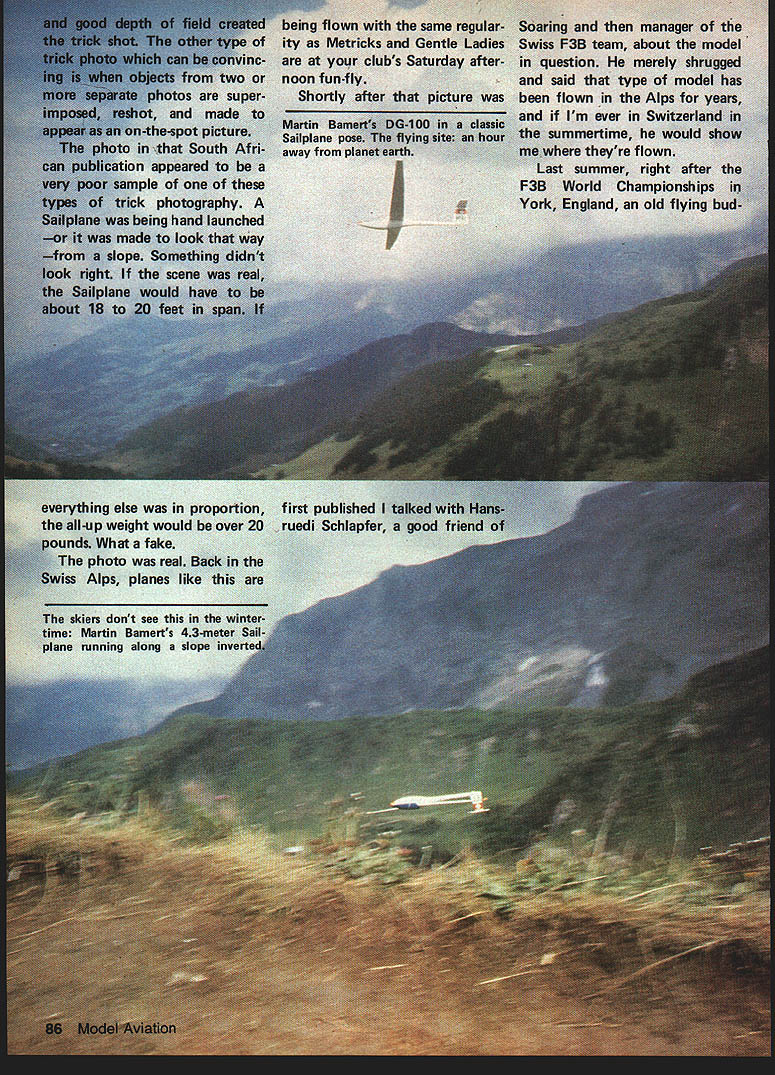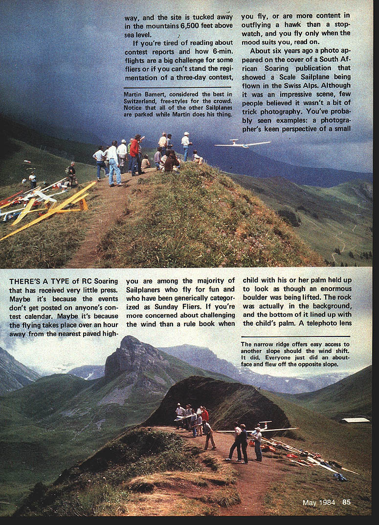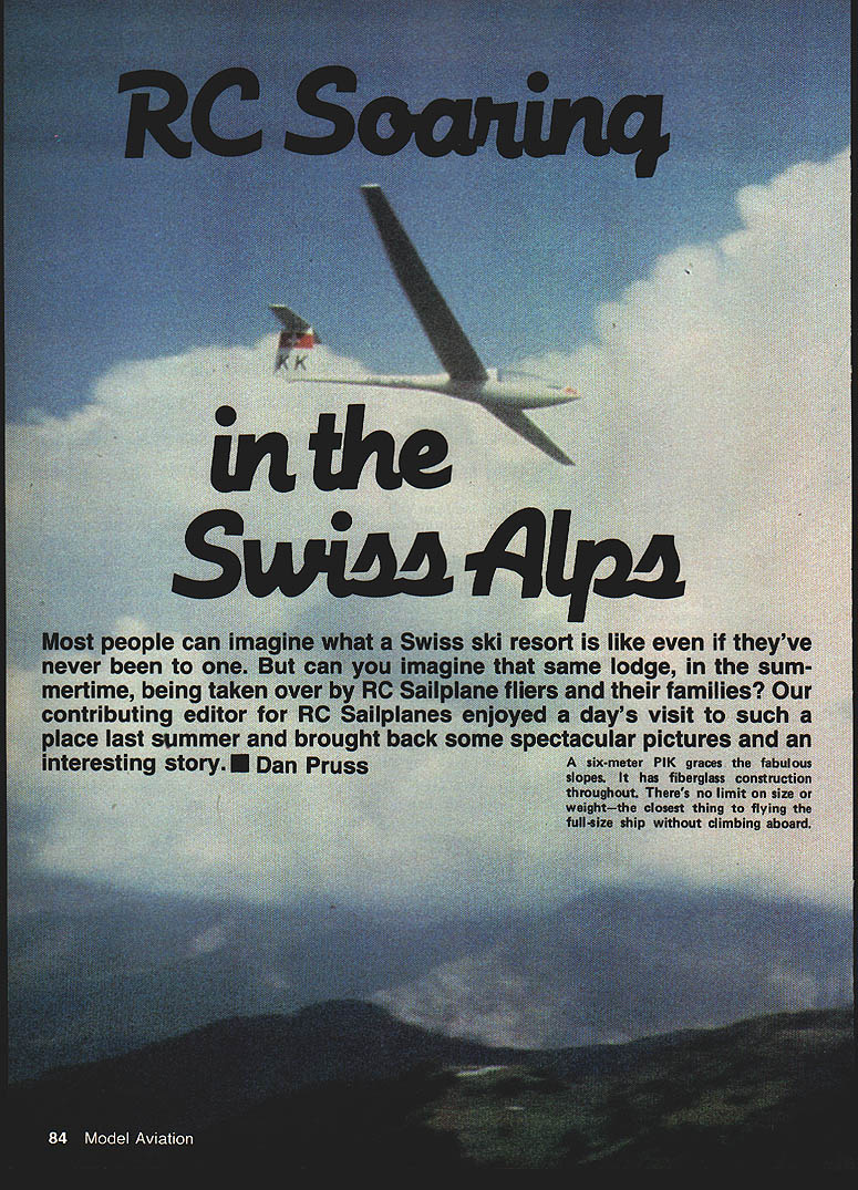 NO OCR TEXT THERES TYPE RC Soaring has received very little press Maybe its because events dont get posted anyones con cahits because over hour paved highaway Feet above about 6-mm some regi among majority Sailpianers fly fun have generically categor ized Sunday Fliers youre concerned about challenging wind rule book fly outflying hawks stop watch fly mood suits read Aboutyears ago aphoto ap Couth Af child palm look though enc boulder being lifted actually the bottom childs palm telepnoto lens narrow ridge offers easy access anothar tIne should wind shiftItyone just did al flew off oppo itos i-the-spc in\that app mple ick g hay made lope s flown same regular- -as Metricks Gentle Ladies clubs Saturday afteror noon fun-fly Shortly after picture se ched Martin Bamerts 16-100 dassic Sailplane pose flying site hour away planet earth 4 Soaring Swiss F3B team aboL question said type ot flown AIDS Im ever S summertime mewhere theyre flown Last summer right F3B World Ch York England rig else proportion up weight would over 20 unds What fake photo real Alps planes like first published Schlapfer dont see martin Bamerts 43-meter ing along slope invert dy Neil Liptak invited visit Hansruedi Included itinerary Hans set up course visit grossseglers flown day left flying site Wednesday After meeting Bern Helmut Wehren organizer annual Swiss modeling forum drove small village about 30 miles south-southeast Left Martin Bamert DG-100 youve seen color pictures model scratch-built skilled builder/flier no rules govern size can lift can fly Right Christian Schweizer Swiss full-scale aerobatics champion 1981 taking holiday daughter Its hard imagine better playground kidsand dadl Left No isnt photo 14-in clone Neil LiptakSailplane designer artist international playboystanding front bunch Two-Meter birds Its real kid examining grossseglers Martin Keller checks around Right Nobody right mind calls planes toysl represent craftsmanship its bestfull-scale construction techniques one-third size Gorgeous stuffl Bern called Adelboden Going short distance still took us over hournot just because winding roads also single-lane road about last 15 minutes trip posed some problems coming traffic Somewhere along drive men tioned too bad wasnt week end because thats flying takes place However Martin Keller young modeler Hans Stoll both trip former brought along small three-meter bird just case winds right ride continued out Adelboden about 15 minutes until came lower station cable cars ran up mountains point out sightliterally Very few cars parked station no tourists seen surprise see cable cars oper ation cable ran up ski lodge place called Hahnenmoospass winter skiing re sort some finest slopes Swit zerland Since cars running Hel mut figured lodge might open lunch group spread out three cable carsand up Hahnenmoospass went What place flying Sailplanes thought ran through head spent another 15 minutes way top cable run other thoughts too bad Wednesday Im sure watchmakers chocolate salesmen Swiss bankers dont take afternoon off way back home least couple probably own Sailplanes Well maybe young Martin will get fly birdif winds right As got off cable cars propped against wall three assembled grossseglers immediately identifiable PIK-21 about six meters span Around corner saw gent carrying five-meter Minamoa Next main en trance six Scale birds small est over four meters span Inside lodge five birds leaning against wall four othersall Scale models againwere against another wall Yet another wall another scale Mm amoa still others Scale models ranging over four meters nearly seven meters spanand taking up room weekend skiers whole scene looked like purposeful setup just drop jaws us flatlanders wasnt did wasnt poorly built bad looking model room Outside no fewer seven grossseglers air Imagine Continued page 176 Left Ridge runningSwiss style Martin Bamert tracks inverted DG-100 along ridge toward Neil Liptak latter can get photo Right isl Too bad pictures cant produce sound inverted Sailplane made whoosh like youve never heard Left The bathroom over Its also ski lodge during winter summer has facilities needed Soaring holiday lifetime including workshop What packagel Right arent flying work next project Thats what Martin Bamert doing Helmut Wehren Hanaruedi SchIapfer Hans Stoll take notes Workshop dining room during ski season 88 Model Aviation Its impound area static judging contestjust average large Sailplanes grosaseglermseen Hahnenmoospass 21 others assembled same time color photos Neil Liptak black-and-white photos Dan Pruss NOW THERES QUICK AND EASY WAY OF CLEANING YOUR MODEL CRAFTS Super-K Model Cleaner Removes fuel Residue dirt contact CUTS CLEANING TIME IN HALF Just spray model solvent wipe th soft cloth paper towel SIMPLE AS THAT Leaves craft showcase clean eWont harm Paints Coverings Dries Cleor fast Ulminales Woric cleanIng model SiTong Professional Quality formula Great any Model Craft Boats Rones Helicopters Cleans Gently Protects delicate model DEALERS WANTED DOMESTIC & OVERSEAS WE EXPORT Hurry Have product shelves time Christmas guaranteed top seller Sugg retail $550 per gallon Contact us price structures ordering intormallon Also ask about other Super-K products Model Industly Are Manufacturers & Major Brands DIstrIbutors Model Engines Kits Radios & Accessories Super-K o brand Kings Radio Control Hobbies International 3960 West 16th Ave Hialeah Florida 33012 Phone 305 557-2024 Electrics/Kopski Continued page 174 about 2 oz lls 12 oz average motor application will weigh about 7 oz Add ounce wiring etc power system will weigh 19-20 oz half total planned weight thus conforming Rule Thumb No 3 given last month three-channel radio small servos 250 mAh pack will about 7 oz leaves about 4027 13 oz everything else possible Yep Look photo fo Ken Stinsons ver sion Spectra choice Astro 2107 now discontinued suitable alter native no problem 8 x 4 Top Rite nylon prop six-cell pack three chan nels all-up weight about 38 oz5% belo