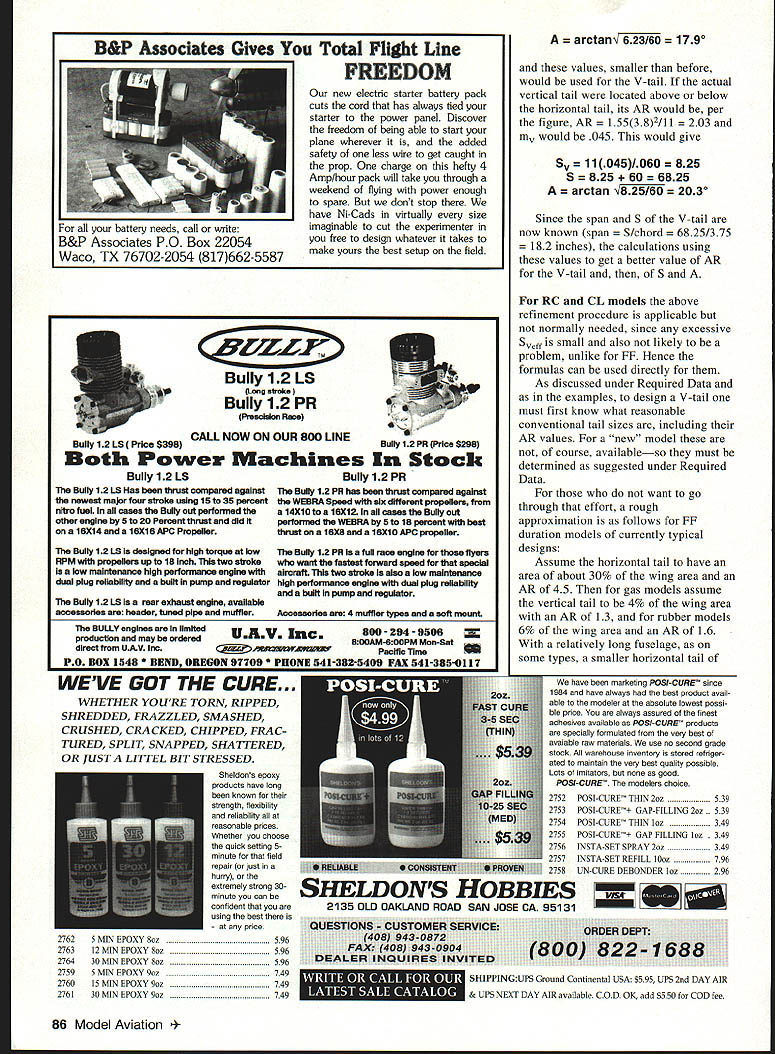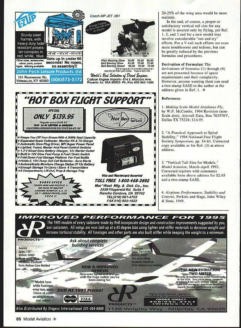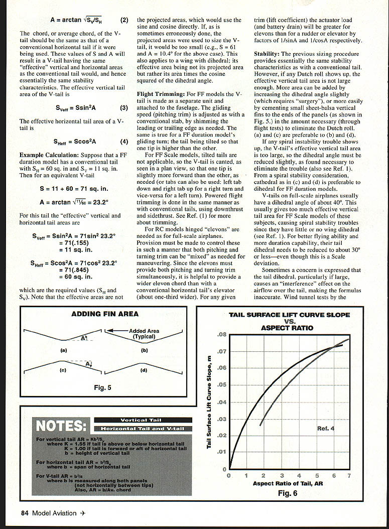 o-called V-tails have full-scale airplanes such Beechcraft Bonanza %have Davis DA-2A modelers used occasionally FF duration models RC models authors knowledge however have no design procedures published modelers purpose purpose article provide reader procedure sizing V-tails FF RC V-tail shown Fig 1 consists two panels having dihedral angle total panel area S S area both halves V-tail laid flaL narrow center section can provided easy mounting fuselage problem determine proper values total V-tail area S b dihedral angle F Required Ijata One must first determine what would proper vertical tail area S horizontal tail area S conventional tail surfaces Fig 2 used V-tail should have same effective vertical horizontal tail areas also course applies converting conventional tail V-tail configuration proper area horizontal tail widely discussed model literature gives reasonable tail volume coefficient depends upon type model interested Ref 1 Scale non-Scale models proper area vertical tail models just large enough prevent hint Dutch roll Fig 3 wandering flight also small enough avoid spiral instability trouble Fig 4 RC models relatively larger vertical tail about 50% larger needed better flight control maneuvering Obtaining proper vertical tail size formula tests discussed Ref 1 also Refs 2 3 Sizing V-Tail Knowing proper conventional tail areas Sv S H can proceed design V-tail follows derivation formulas discussed end article total area V-tail 5 should S H 1 dihedral cathedral angle V tail should Thmmed FlightRoll-off PathOccurs W Incapable flight level KFF Scale Model a Severe Spiral Instability SPIRAL INSTABILITY Trimmed ht Path steep Shallow Spiral l-off Occurs N Incapable of steep steady climb 1FF Duration Model b Mild Spiral Instability Fig4 July1996 83 p. V-TAIL CONFIGURATION Fig 1 CONVENTIONAL TAIL SURFACES Sv SN Fig 2 DUTCH ROLL Mild Dutch Roll aj Violent Dutch Roll going Cstailspin spiral dive illustrated - g 3 Graphic Design Heather Erdahi an d average chord V tail should same conventional horizontal tail being used values S will result V-tail having same effective vertical horizontal areas conventional tail would hence essentially same stability characteristics effective vertical tail area V-tail SVeff 2A effective horizontal tail area tail SHSff 2A Example Calculation Suppose FF duration model has conventional tail 5H q S q equivalent V-tail S 60 q an Wo tail effective vertical horizontal tail areas 5Veff 2A in2 2320 55 q 5Heff 2A s2 2320 5 q required values SE Sv Note effective areas 2 projected areas would use sine cosine directly sometimes erroneously done projected areas used size V tail would too small eg S 1040 above case also applies wing dihedral its effective area being its projected area rather its area times cosine squared dihedral angle Flight Trimming FF models V tail made separate unit 3attached fuselage gliding speed pitching trim adjusted conventional stab shimming leading trailing edge needed same true FF duration models 4gliding turn tail being tilted tip higher other FF Scale models tilted tails applicable V-tail canted seen plan view tip slightly forward other needed tabs can also used left tab down right tah up right turn vice-versa left turn Powered flight trimming done same manner conventional tails using downthrust sidethrust See Ref 1 about trimming RC models hinged elevons needed full-scale airplanes Provision must made control such manner both pitching turning trim can mixed needed maneuvering Since elevons must provide both pitching turning trim simultaneously helpful provide wider elevon chord conventional horizontal tails elevator about one-third wider given trim lift coefficient actuator load battery drain will greater elevons rudder elevator factors 1/sinA 1/cosA respectively Stability previous sizing procedure provides essentially same stability characteristics conventional tail However Dutch roll shows up effective vertical tail area large enough area can added increasing dihedral angle slightly requires surgery easily cementing small sheet-balsa vertical fins ends panels shown Fig 5 amount necessary through flight tests eliminate Dutch roll c preferable b d spiral instability trouble shows up V-tails effective vertical tail area too large dihedral angle must reduced slightly found necessary eliminate trouble also see Ref 1 spiral stability consideration cathedral c d preferable dihedral FF duration models V-tails full-scale airplanes usually have dihedral angle about 400 usually gives too much effective vertical tail area FF Scale models subjects causing spiral stability troubles since have little no wing dihedral see Ref 1 better flying ability duration capability tail dihedral needs reduced about 300 lesseven though Scale deviation Sometimes concern expressed tail dihedral particularly large causes interference effect airflow over tail making formulas inaccurate Wind tunnel tests TAIL SURFACE LIFT CURVE SLOPE VS ASPECT RATIO - Ref 4 K' 1 23456 Aspect Ratio Tail AR Fig 6 84 Model Aviation NG FIN AREA * Added Area Typical fabI old Fig 5 08 E 4 2 U 0 U E -I 0 U U I06 o1 NACA years ago showed insignificant dihedral angles up least 400 larger model full-scale airplane really needs Actually formulas accurate vertical tail V-tail equally effective generating lateral lift cases true since aspect ratio AR V-tail much larger vertical tail replacing larger AR means liftgenerating ability effective area V-tail Sveff per formulas will too largemore 100% too large extreme cases too-large effective area FF models particularly V-tail sized per formulas might cause spiral instability related troubles avoid value Sv should reduced before using formulas will result smaller values 5veff An approximate procedure doing multiply value Sv factor mv/mv4ail m slope lift curve lift generating ability using Sv formulas values m can obtained Fig 6 entering values AR figure showing calculate AR tails V-tail calculated span2/S since its span S yet determined fair approximation us