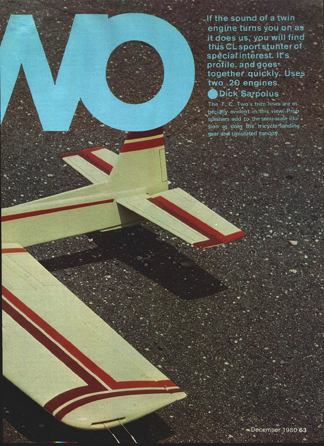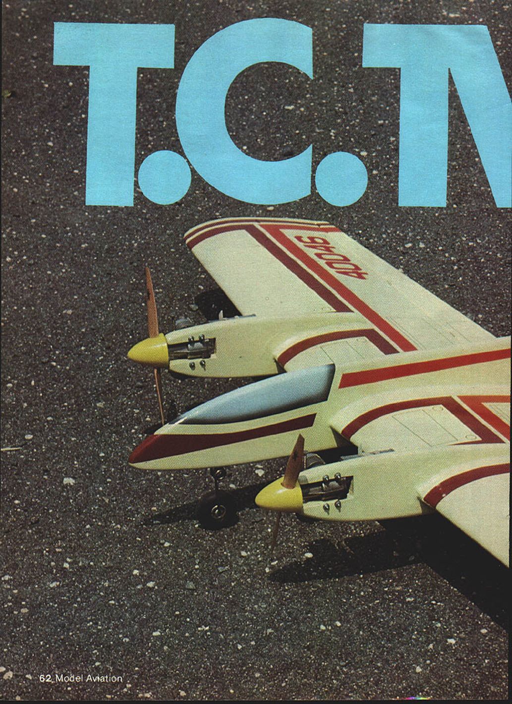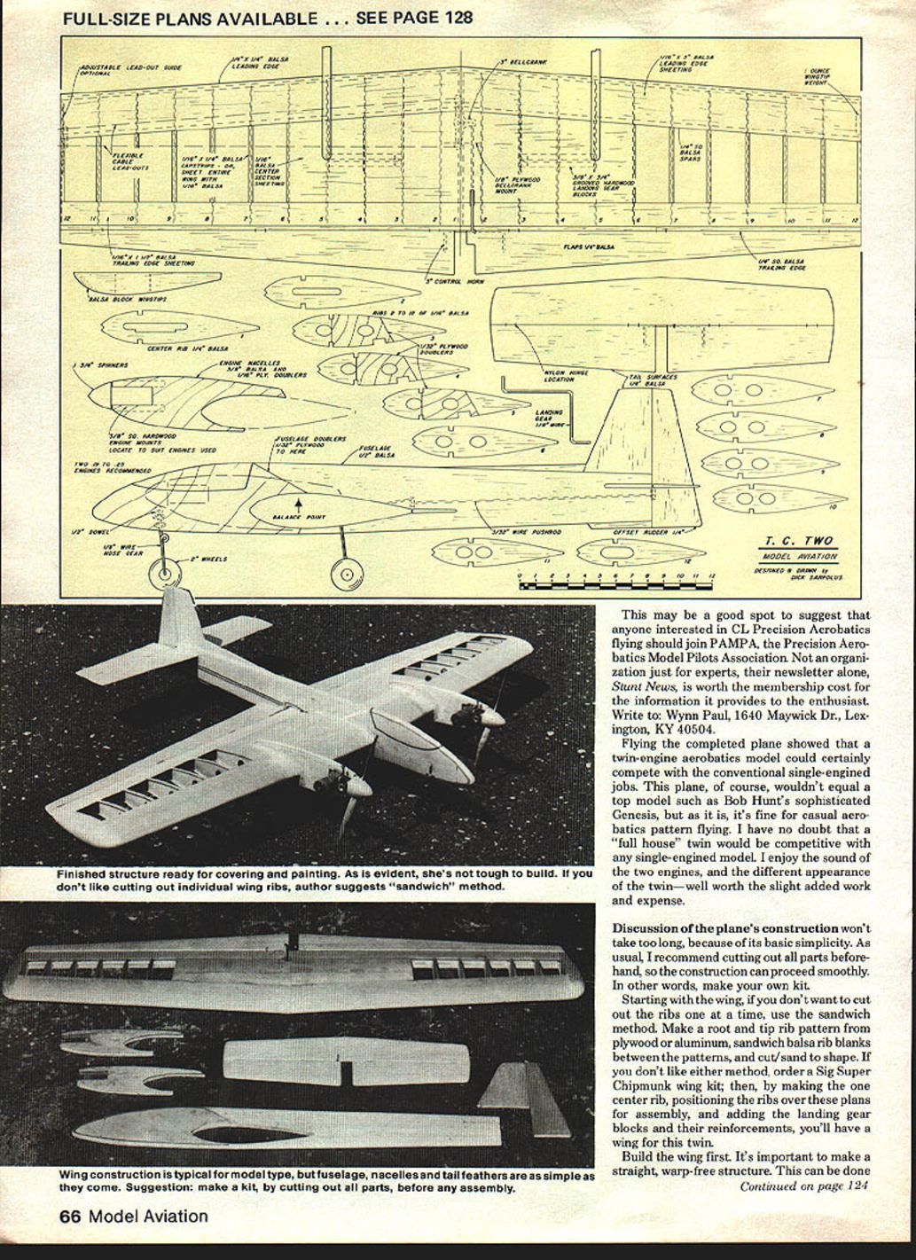 NO OCR TEXT NO OCR TEXT PROFILE MODELS probably popular type Control Line sport models flying today good reason Theyre easy quick build theyre rugged can look good can perform welL continued commercial success over years demonstrates popularity modelers probably longest running CL kit history well known profile Sterlings famous Ring master remember Ringmaster sold $298 few years ago costs now buy piece -in balsa fuselage profiles still provide relatively low cost airplane sheet balsa tail surfaces solid profile fuselage leaves framework construction wing concerned Cutting down building time can provide modeler time experiment design variations profile flies well can get serious build same design real fuselage knock profiles fliers prefer build fly nothing else profile approach interested wanted get another Control Line project just another stunter something dif ferent twin- engined aircraft Profile construc tion would let get plane air quickly enjoy some twin-engine flying out work involved complex con struction Twins arent new course Modelers have always liked special twin sound two engines roaring together adds something special fun flying 1950s build twin CL aerobatic model two Fox 35s two profile fuselages took Nationals its short career ended practice flight inboard engine quit inappropriate time About six years ago twin urge hit again resulting time profile F-82 Twin Mustang again two Fox 35s good 63-in wingspan model tough transport current twin subject article favorite 53in wingspan two 20s its easy move around above its fun fly Designing T C Two began wing heart CL stunter Theres nothing new however just well proved approach ample area thick airfoil plenty flap area wingspan 53 airfoil thickness disregarding flaps 21% wing area 575 sq including 90 sq flap area Construction employs usual sheeted leading trailing edges two spars cap-strips block tips etc horizontal tail area 20% wing Distance between flap hinge line elevator hinge line 15 fuselage engine nacelle design worked out placing engine thrust line horizontal tail slightly above wing Tricycle gear considered must Although stunters tail- draggers thought twin just wouldnt look right trike gear Engine selection easy good 19 20 engines market today suitable Control Line use such Fox OS Supertigre Enya K&B believe available carburetors mufflers OS 20s used purchased several years ago came equipped carburetors plain venturi intakes either type Operation Bottom view shows placement tricycle landing gear Grooved 3/8 x 3/4-in hardwood blocks conjunction 1/32 plywood rib doublers take load rearward land ing gear struts 64 Model Aviation wing flaps two smooth-running engines TC Two capable Precision Fitted erobatics maneuver book 53-in span its easy transport fun fly authorwith finished profiletwin sportstunteratthe flying field smileon hisface know I~I th results efforts Sarpolus powered two OS 20s lhe mufflers little larger heavier custom types used top Precision Aerobatics fliers work fine sport flying Fuel tanks used Fox 2 ounce 2-in wide square wedge models December 1980 65 .a Setup outside spraying clear top uuats avoid dopes bIurii uue high humidity working bright sun did trick Does TC Two fly bet Loops w, overs eightsjust about maneuvercan done neat looking/sounding plane Mufflers maintain peace flying field neighbors must Stock OS mufflers used author Fuel tanks rubberbanded place 2%-oz 2-in wide Fox FULL-SIZE PLANS AVAILABLE . SEE PAGE 128 2L/S BALSAI/ACES BALSA 5 BELLCDA*IILEADING EDGE ADLOSrASLE LEAD-DOT GLOBELEADWOD EDGE SLAtE TINS 0100CC OPTIONALWINGTIP IOSGGT -71-I- -- _ I BALSA CAYSTRIPS -ONbfALSAIt--I~zvISPABSI LEADDOTSJI SHEET ENTINEI CENTER I I/O PLYWOOL GODOVODSAki pi WINO WITSI SECrIGHSELOCRANELIIS IIILI~ I111 ______________ ____________________________________________________________[v32][b6105294200]]______________________________________________ ______________[v32][b11155295200]]____________________________________________________________[v32][b15965295200]]II__ ____________ 111 ______________ _______ ______________________________________________ ___________________________________________ ____________________________________________ _______ _______ Ill _______ ______IiIji A/IL BALSAI SHEETINGILANLONG LEA11 r ~ tALT,oioIi1~II1112ISbeKI19I1LAL I/ABEL L/2 BALSA rEONTREL HORN BALSA BLOCK WINGELOS C DABS P TO GE LILK BALSA-CENTER NAB AM BALSA SILO SPINNERSENGINE MACELITE 5/B BALSA AND I/AS PLY DOUBLERS 3/Se WINE P055000OTTOET DODGED A/A T C Two cID MODEL AVIATION LAAG_______________________ DESLANEG S DRAWN 02 AP SB 0 6 10 0 AG AL AtGLEE SARPOLOS may good spot suggest anyone interested CL Precision Aerobatics flying should join PAMPA Precision Aero batics Model Pilots Association organi zation just experts newsletter alone Stunt News worth membership cost information provides enthusiast Write Wynn Paul 1640 Maywick Dr Lex ington KY 40504 Flying completed plane showed twin-engine aerobatics model could certainly compete conventional single-engined jobs plane course wouldnt equal top model such Bob Hunts sophisticated Genesis its fine casual aero batics pattern flying have no doubt full house twin would competitive single-engined modeL enjoy sound two engines different appearance twinwell worth slight added work expense Discussion planes construction wont take too long because its basic simplicity As usual recommend cutting out parts before hand construction can proceed smoothly other words make own kit Starting wing dont want cut out ribs time use sandwich method Make root tip rib pattern plywood aluminum sandwich balsa rib blanks between patterns cut/sand shape dont like either method order Sig Super Chipmunk wing kit making center rib positioning ribs over plans assembly adding landing gear blocks reinforcements youll have wing twin Build wing first Its important make straight warp-free structure can done Continued page 124 66 Model Aviation riniunso structure ruauy flJr UUvUOII aIu paIruLIrI MS IS CVflAIL CCJL