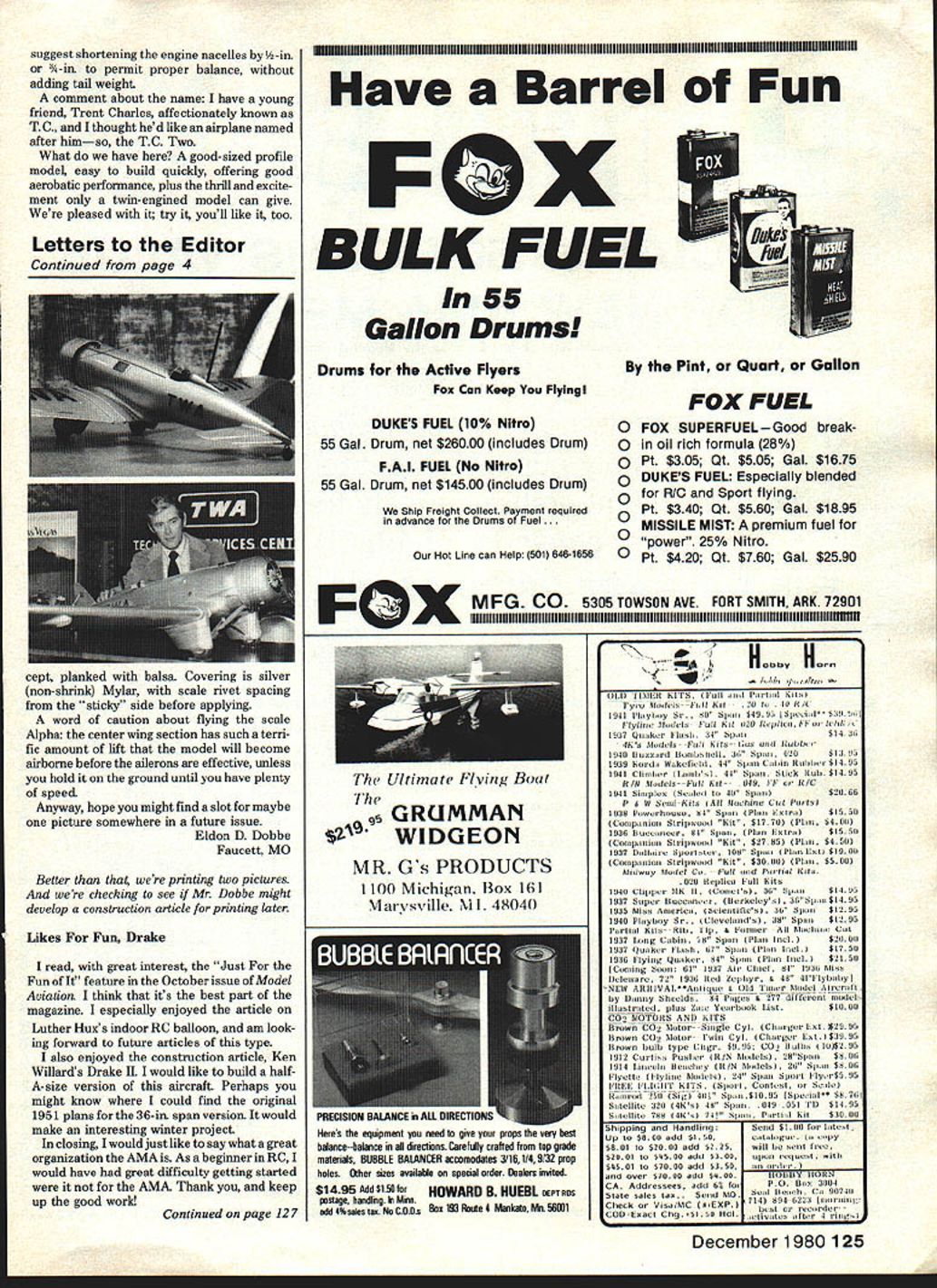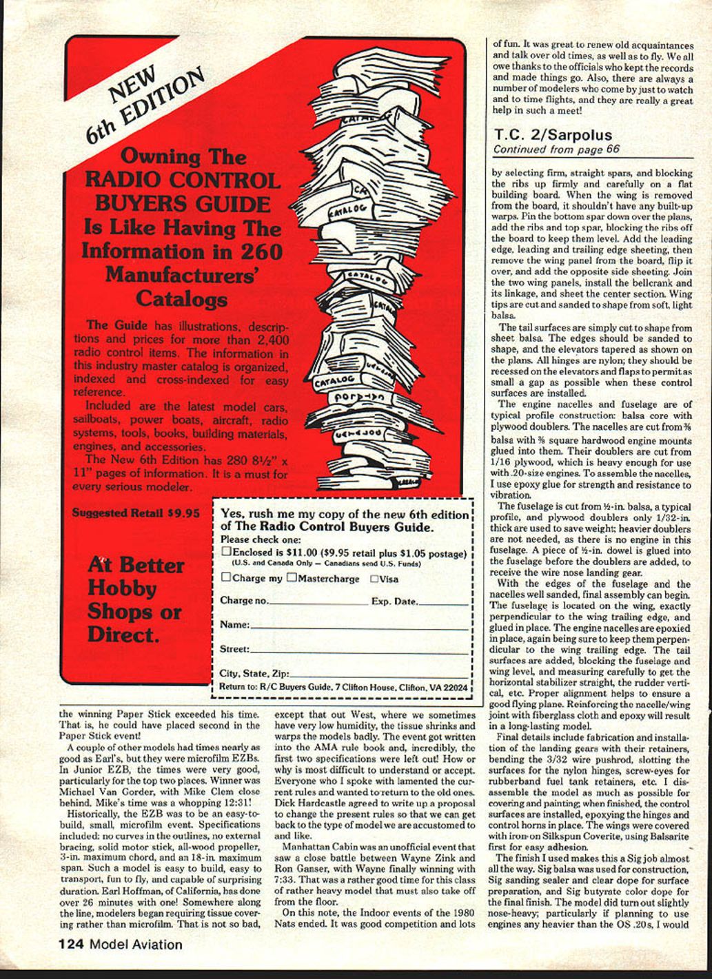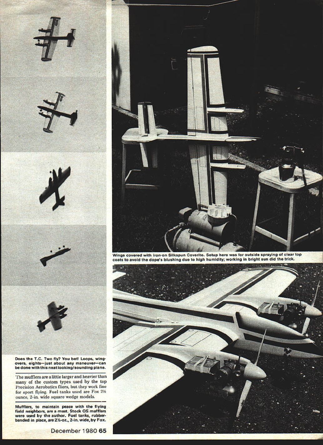 NO OCR TEXT NO OCR TEXT PROFILE MODELS probably popular type Control Line sport models flying today good reason Theyre easy quick build theyre rugged can look good can perform welL continued commercial success over years demonstrates popularity modelers probably longest running CL kit history well known profile Sterlings famous Ring master remember Ringmaster sold $298 few years ago costs now buy piece -in balsa fuselage profiles still provide relatively low cost airplane sheet balsa tail surfaces solid profile fuselage leaves framework construction wing concerned Cutting down building time can provide modeler time experiment design variations profile flies well can get serious build same design real fuselage knock profiles fliers prefer build fly nothing else profile approach interested wanted get another Control Line project just another stunter something dif ferent twin- engined aircraft Profile construc tion would let get plane air quickly enjoy some twin-engine flying out work involved complex con struction Twins arent new course Modelers have always liked special twin sound two engines roaring together adds something special fun flying 1950s build twin CL aerobatic model two Fox 35s two profile fuselages took Nationals its short career ended practice flight inboard engine quit inappropriate time About six years ago twin urge hit again resulting time profile F-82 Twin Mustang again two Fox 35s good 63-in wingspan model tough transport current twin subject article favorite 53in wingspan two 20s its easy move around above its fun fly Designing T C Two began wing heart CL stunter Theres nothing new however just well proved approach ample area thick airfoil plenty flap area wingspan 53 airfoil thickness disregarding flaps 21% wing area 575 sq including 90 sq flap area Construction employs usual sheeted leading trailing edges two spars cap-strips block tips etc horizontal tail area 20% wing Distance between flap hinge line elevator hinge line 15 fuselage engine nacelle design worked out placing engine thrust line horizontal tail slightly above wing Tricycle gear considered must Although stunters tail- draggers thought twin just wouldnt look right trike gear Engine selection easy good 19 20 engines market today suitable Control Line use such Fox OS Supertigre Enya K&B believe available carburetors mufflers OS 20s used purchased several years ago came equipped carburetors plain venturi intakes either type Operation Bottom view shows placement tricycle landing gear Grooved 3/8 x 3/4-in hardwood blocks conjunction 1/32 plywood rib doublers take load rearward land ing gear struts 64 Model Aviation wing flaps two smooth-running engines TC Two capable Precision Fitted erobatics maneuver book 53-in span its easy transport fun fly authorwith finished profiletwin sportstunteratthe flying field smileon hisface know I~I th results efforts Sarpolus powered two OS 20s lhe mufflers little larger heavier custom types used top Precision Aerobatics fliers work fine sport flying Fuel tanks used Fox 2 ounce 2-in wide square wedge models December 1980 65 .a Setup outside spraying clear top uuats avoid dopes bIurii uue high humidity working bright sun did trick Does TC Two fly bet Loops w, overs eightsjust about maneuvercan done neat looking/sounding plane Mufflers maintain peace flying field neighbors must Stock OS mufflers used author Fuel tanks rubberbanded place 2%-oz 2-in wide Fox FULL-SIZE PLANS AVAILABLE . SEE PAGE 128 2L/S BALSAI/ACES BALSA 5 BELLCDA*IILEADING EDGE ADLOSrASLE LEAD-DOT GLOBELEADWOD EDGE SLAtE TINS 0100CC OPTIONALWINGTIP IOSGGT -71-I- -- _ I BALSA CAYSTRIPS -ONbfALSAIt--I~zvISPABSI LEADDOTSJI SHEET ENTINEI CENTER I I/O PLYWOOL GODOVODSAki pi WINO WITSI SECrIGHSELOCRANELIIS IIILI~ I111 ______________ ____________________________________________________________[v32][b6105294200]]______________________________________________ ______________[v32][b11155295200]]____________________________________________________________[v32][b15965295200]]II__ ____________ 111 ______________ _______ ______________________________________________ ___________________________________________ ____________________________________________ _______ _______ Ill _______ ______IiIji A/IL BALSAI SHEETINGILANLONG LEA11 r ~ tALT,oioIi1~II1112ISbeKI19I1LAL I/ABEL L/2 BALSA rEONTREL HORN BALSA BLOCK WINGELOS C DABS P TO GE LILK BALSA-CENTER NAB AM BALSA SILO SPINNERSENGINE MACELITE 5/B BALSA AND I/AS PLY DOUBLERS 3/Se WINE P055000OTTOET DODGED A/A T C Two cID MODEL AVIATION LAAG_______________________ DESLANEG S DRAWN 02 AP SB 0 6 10 0 AG AL AtGLEE SARPOLOS may good spot suggest anyone interested CL Precision Aerobatics flying should join PAMPA Precision Aero batics Model Pilots Association organi zation just experts newsletter alone Stunt News worth membership cost information provides enthusiast Write Wynn Paul 1640 Maywick Dr Lex ington KY 40504 Flying completed plane showed twin-engine aerobatics model could certainly compete conventional single-engined jobs plane course wouldnt equal top model such Bob Hunts sophisticated Genesis its fine casual aero batics pattern flying have no doubt full house twin would competitive single-engined modeL enjoy sound two engines different appearance twinwell worth slight added work expense Discussion planes construction wont take too long because its basic simplicity As usual recommend cutting out parts before hand construction can proceed smoothly other words make own kit Starting wing dont want cut out ribs time use sandwich method Make root tip rib pattern plywood aluminum sandwich balsa rib blanks between patterns cut/sand shape dont like either method order Sig Super Chipmunk wing kit making center rib positioning ribs over plans assembly adding landing gear blocks reinforcements youll have wing twin Build wing first Its important make straight warp-free structure can done Continued page 124 66 Model Aviation riniunso structure ruauy flJr UUvUOII aIu paIruLIrI MS IS CVflAIL CCJL