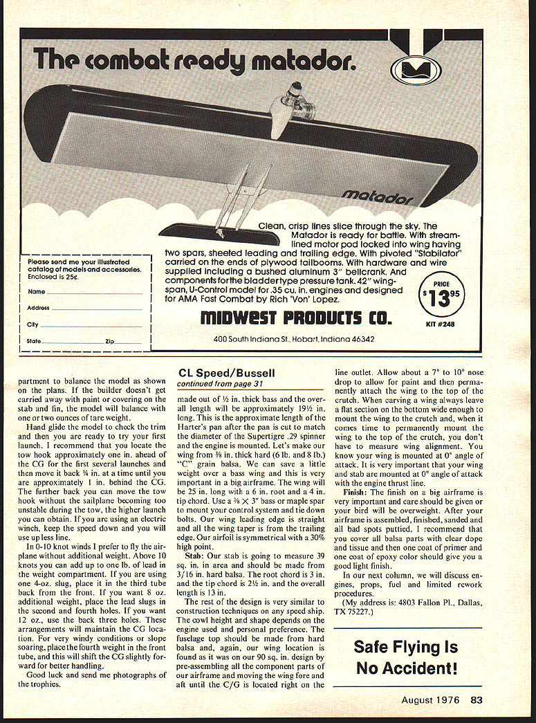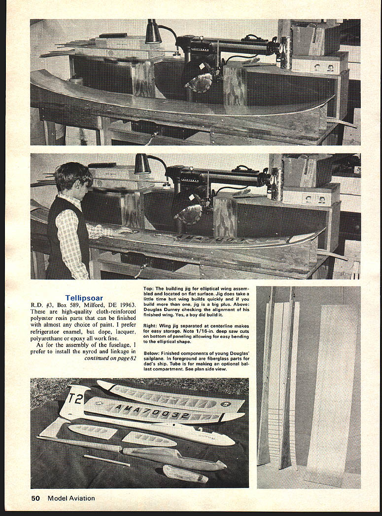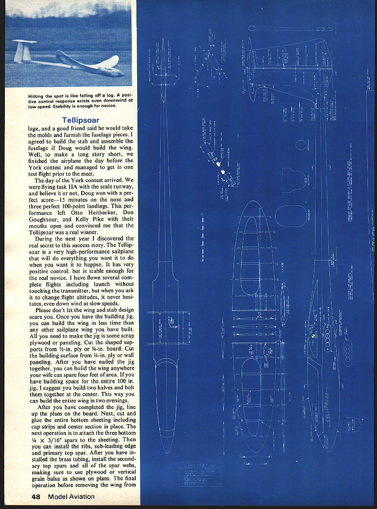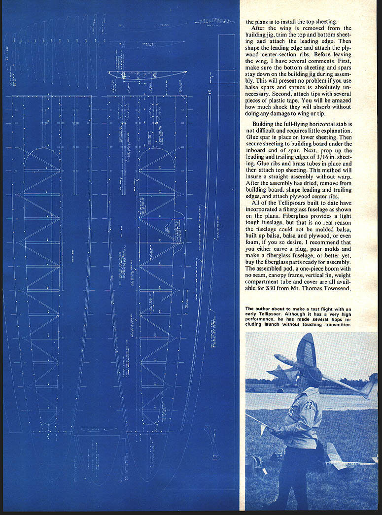 tI7i iQsQcjr Earlier Ellipsoar right published Sail plane 1970 T-tailed Tellipsoar left resulted seven years Constant development THE TELLIPSOAR high-perform ance Standard Class RC sailplane rugged gentle enough beginner overnight dream developed over period seven years original design called Ellip soar published Sailplane 1970 name came wing stab design wing stab ellip tical planform wing ellipti cal dihedral 1969 elliptical dihedral very rare several years later Hobie Alter realized performance advan tages incorporated elliptical dihedral Hobie Hawk During first four years changed airfoil span year original design 7-ft wing span Eppler E-387 airfoil won several contests design finished year fifth place ECSS During next three years tried 9-ft wing Eppler E-385 9-ft wing Eppler E-387 11-ft wing flat-bottom Standard class sailplane has frequently demonstrated its superiority over first-class competition George Durney Eppler 385 eleven-year-old son Doug built fuselage always second choice four wings During period time won 28 trophies managed finish year top ten ECSS spring 1974 started draw ings new design called Tellipsoar because T-tail configuration no intention completing aircraft until fall Several weeks prior York PA contest year holding Right Canopy removed show installation Kraft brick Although fuselage construction up builder glass pod boom fin canopy outline commercially available local contest practice FAI Glider Contest asked CD Aerolympics son Doug flying Ellipsoar original wing end first two events far ahead field embarrassing speed event same story came through final gate two feet off ground four seconds ahead field However jubila tion turned right instead left took goal post about 40 mph Need less say goal post won evening begged help him build Tellipsoar before York contest already carved plug fuseAugust 1976 47 Tellipsoar spreads its graceful wings ellip tical dihedral elliptical planform efficient wing configuration possible Tellipsoar lage good friend said would take molds furnish fuselage pieces agreed build stab assemble fuselage Doug would build wing Well make long story short finished airplane day before York contest managed get test flight prior meet day York contest arrived flying task hA scale runway believe Doug won per fect score15 minutes nose three perfect 100-point landings per formance left Otto Heithecker Don Goughnour Kelly Pike mouths open convinced Tellipsoar real winner During next year discovered real secret success story Tellip soar very high-performance sailplane will everything want want happen has very positive control stable enough real novice have flown several com plete flights including launch touching transmitter ask change flight altitudes never hesi tates down wind slow speeds Please dont let wing stab design scare Once have building jig can build wing less time other sailplane wing have built need make jig some scrap plywood paneling Cut shaped sup ports -in ply -in board Cut building surface -in ply wall paneling After have nailed jig together can build wing anywhere wife can spare four feet area have building space entire 100 jig suggest build two halves bolt together center way can build entire wing two evenings After have completed jig line up plans board Next cut glue entire bottom sheeting including cap strips center section place next operation attach three bottom X 3/16 spars sheeting can install ribs sub-leading edge primary top spar After have stalled brass tubing install second ary top spars spar webs making sure use plywood vertical grain balsa shown plans final operation before removing wing 48 Model Aviation Hitting spot like falling off log posi tive control response exists downwind low speed Stability enough novice plans install top sheeting After wing removed building jig trim top bottom sheet ing attach leading edge shape leading edge attach ply wood center-section ribs Before leaving wing have several comments First make sure bottom sheeting spars stay down building jig during assem bly will present no problem use balsa spars spruce absolutely un necessary Second attach tips several pieces plastic tape will amazed much shock will absorb doing damage wing tip Building full-flying horizontal stab difficult requires little explanation Glue spar place lower sheeting secure sheeting building board under inboard end spar Next prop up leading trailing edges 3/16 sheet ing Glue ribs brass tubes place attach top sheeting method will insure straight assembly warp After assembly has dried remove building board shape leading trailing edges attach plywood center ribs Tellipsoars built date have incorporated fiberglass fuselage shown plans Fiberglass provides light tough fuselage no reai reason fuselage could molded balsa built up balsa balsa plywood foam desire recommend either carve plug pour molds make fiberglass fuselage better yet buy fiberglass parts ready assembly assembled pod one-piece boom no seam canopy frame vertical fin weight compartment tube cover avail able $30 Mr Thomas Townsend U author about make test flight early Tellipsoar Although has very high performance has made several hops cluding launch touching transmitter 50 Model Aviation Tellipsoar RD #3 Box 589 Milford DE 19963 high-quality cloth-reinforced polyester resin parts can finished almost choice paint prefer refrigerator enamel dope lacquer polyurethane epoxy work fine As assembly fuselage prefer install nyrod linkage continued page 82 Top The building jig elliptical wing assem bled located flat surface Jig does take little time wing builds quickly build jig big plus Above Douglas Durney checking alignment finished wing Yes boy did build Right Wing jig separated centerline makes easy storage Note 1/16-in deep saw cuts bottom paneling allowing easy bending elliptical shape Below Finished components young Douglas sailplane foreground fiberglass parts dads ship Tube making optional bal last compartment See plan side view HIGH PERFORMANCE * COMPETITION PROVEN * T