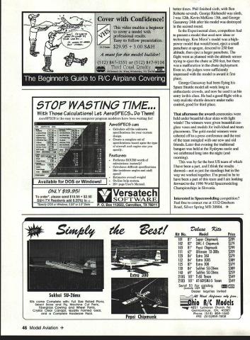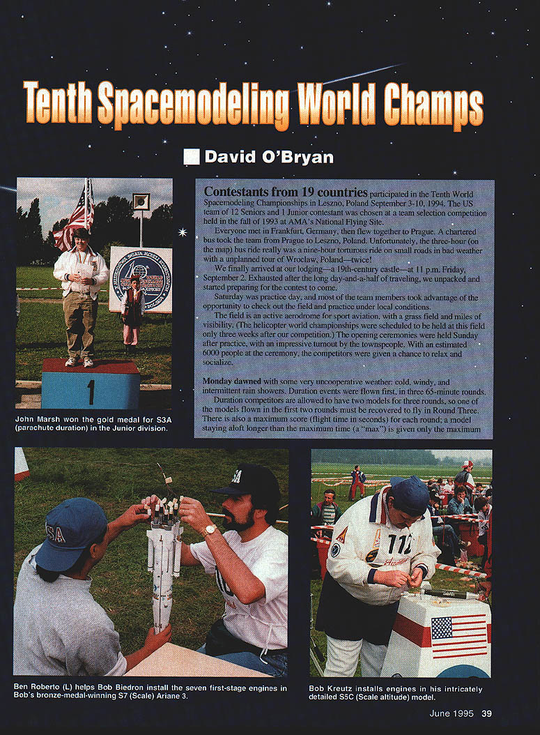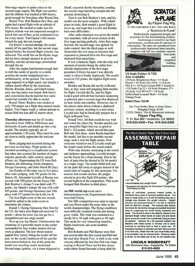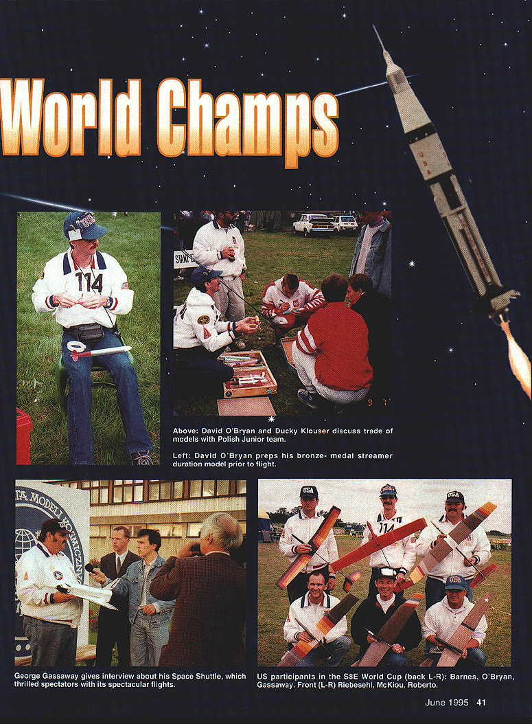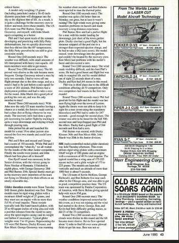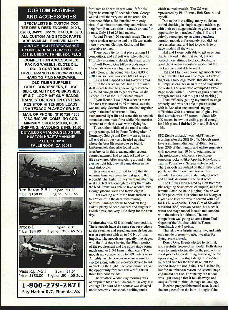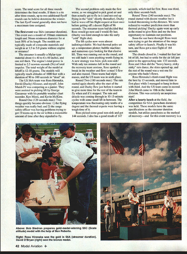 NO OCR TEXT NO OCR TEXT NO OCR TEXT score total score three rounds determines final results tie after three rounds up two additional flyoff rounds can held determine winner last flyoff round generally does have maximum time assigned first event 56A streamer duration event uses model 350mm minimum length 30mm minimum diameter least 50% its length models typically made composite materials weigh 35 50 grams engine streamer streamer usually Mylar-type material about 4 x 40 6 x 60 inches mil thick engines total power limited 25 newton-seconds Ns total impulse total weight model liftoff 12-18 grams models will typically reach altitudes 1000 feet duration 90 100 seconds dead air US S6A team Ross Hironaka David Ducky Klouser myself John Marsh IV competing junior assisted picking lift George Gassaway portable weather chart recorder Ken Mizoi Kevin McKiou Round 120 seconds max Two things quickly became obvious 1 flying weather really bad 2 range safety officer having problems trying get 19 teams up air within reasonable amount time after signaled fly second problem made first worse struggled pick good air actually get fly end up flying sink shortly thereafter Ducky wave off flight request least once before getting off decent flight 96 seconds streamer team decided Ross would go next would fly last Ducky kind enough take early cold flight slot lift cycles now almost indistinguishable thermal poles set up temperature plotter bubble machine numerous eyes looking elusive lift Time running out round still hadnt seen anything worth flying new strategy born pick non-sink ten minutes left round recovery team anxious Ross spotted break weather flew max flew also maxed Three teams triple maxes US team sixth place Round Two 180 seconds max rain started again shortly after start round Ducky flew just before started give time rest team fly stopped rain drizzle coming through 10-15-minute cycles some small lift between temperature fluctuating tenths degree thermal experts having tough time Ross picked some good non-sink got 144 seconds also has good result 147 seconds tied first Ross third three seconds back Round Three 240 seconds max round started decent weather looked threatening distance reduced weather prediction thermal picking Ducky again went up early round give Ross best opportunity maintain positions Soon sun burst through Ross went nuts trying get attention range safety officer launch Finally turn Ross got nice flight 164 seconds clouds closed waited last bit lift settle air left just prior approaching rain 133 seconds Ross did heavy heavy sinky sinky rain dance skies opened up rest round wet anyone hadnt flown Ross Hironakas third-round flight best 13 seconds moved him first place managed hang third US team came second John Marsh came 10th Junior division certainly auspicious start After hearty lunch field competition 53A parachute duration held models have same specifications streamer duration models utilize parachutes method recoveryand event recovery Right Ross Hironaka won gold S6A streamer duration David 0 Bryan right won bronze medal 42 Model Aviation e Bob Biedron prepares gold-medal-winning S5C Scale altitude model help Ben Roberto critical factor model weighing 15 grains including parachute under 36-42-inchdiameter parachute will disappear sky slightest hint lift As result quite challenge recovery crew follow track down models US S3A team Phil Barnes George Gassaway myself John Marsh again competing Junior Phil spent much summer developing practicing Silly Putty dethermalizers quickly discovered did like 60 temperatures Silly Putty proved too stiff give consistent results Round 240 seconds max weather difficult small amounts lift interspersed heavy rain squalls team members able get maxes Round Two 300 seconds max lift proved very elusive rain became frequent George Gassaway missed max two seconds wave off flight attempt due slow range result fly just before rain squall score 261 seconds Phil Barnes deployment problem take zero round John Marsh did good job picking own air member max Round Three 360 seconds max John now US team member having chance medal Seniors made sure clear shot flying whenever ready recovery crew done great job recovering earlier flight tracking quite ways downrange relaying back through pouring rain John picked air launched model max Five other juniors also maxed first two rounds could have tied him Phil flew maxed George score 193 seconds Phil contemplated what-ifs waited results other Junior competitors Finally results posted John Marsh first place himself flyoff round necessary Senior division victory going Petre Nicolae Romania finished eighth place George Gassaway 28th Phil Barnes 35th Special thanks must go recovery crew members team flying Monday efforts utterly miserable day Glider duration events flown Tuesday 54B boost glider duration first models must rigid-wing gliders minimum liftoff weight 27 grams must use engine no 50 Ns total impulse models typically look like hand-launch gliders 25 40 square inches wing area pod releases model carry away spent engine casing its weight ballast necessary Typical glider weights 7 10 grams Representing US Phil Barnes Ducky Klouser Ken Mizoi George Gassaway manning weather chart recorder Ben Roberto went upwind man thermal poles Round 180 seconds max weather quite bit better Monday great least wasnt raining high winds giving some modelers problems launch made recovery long-distance experience Phil Barnes flew perfect flight max model landing far downrange just short town garden plots Ducky also good flight streamer stripped off pod due stronger-than-expected ejection charge take DQ zero score model maxed went downrange gardens couldnt located recovery crew Ken Mizoi problems models boost also scored zero Round Two 240 seconds max wind made visibility difficult hurt Phils score good boost flight marginal lift model drifted out sight 22 seconds short max Ducky Ken j44 zeroes round Phil third place due difficult conditions a