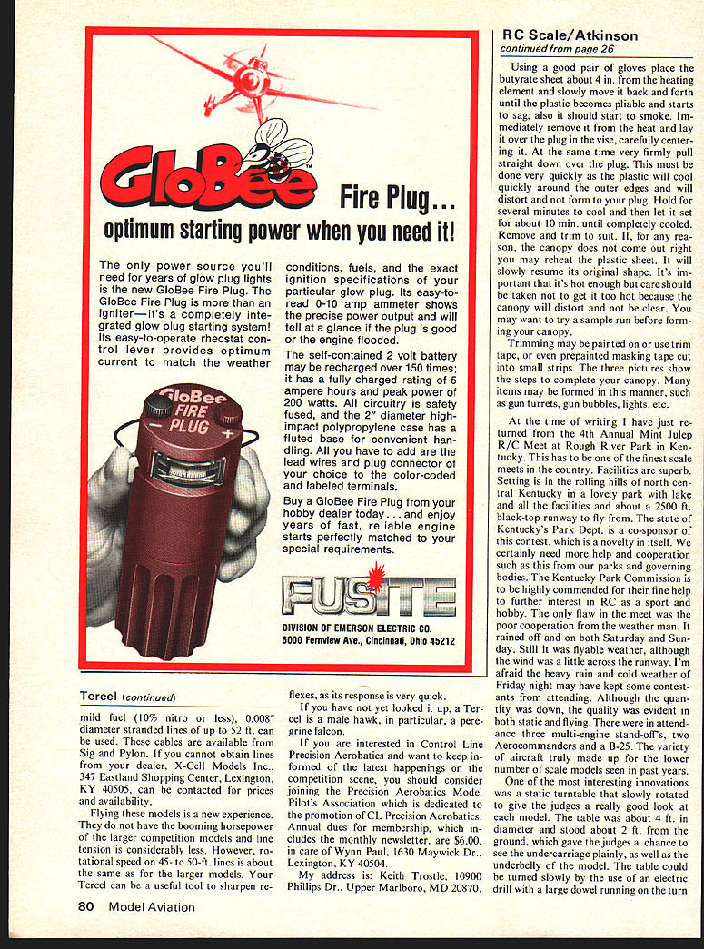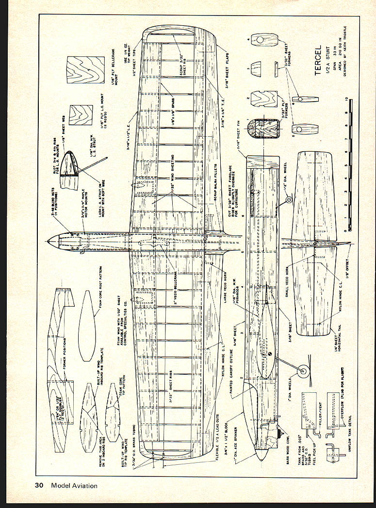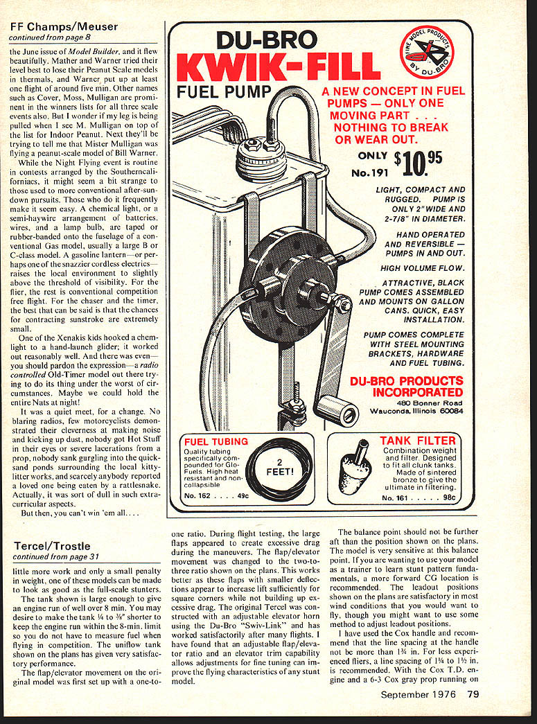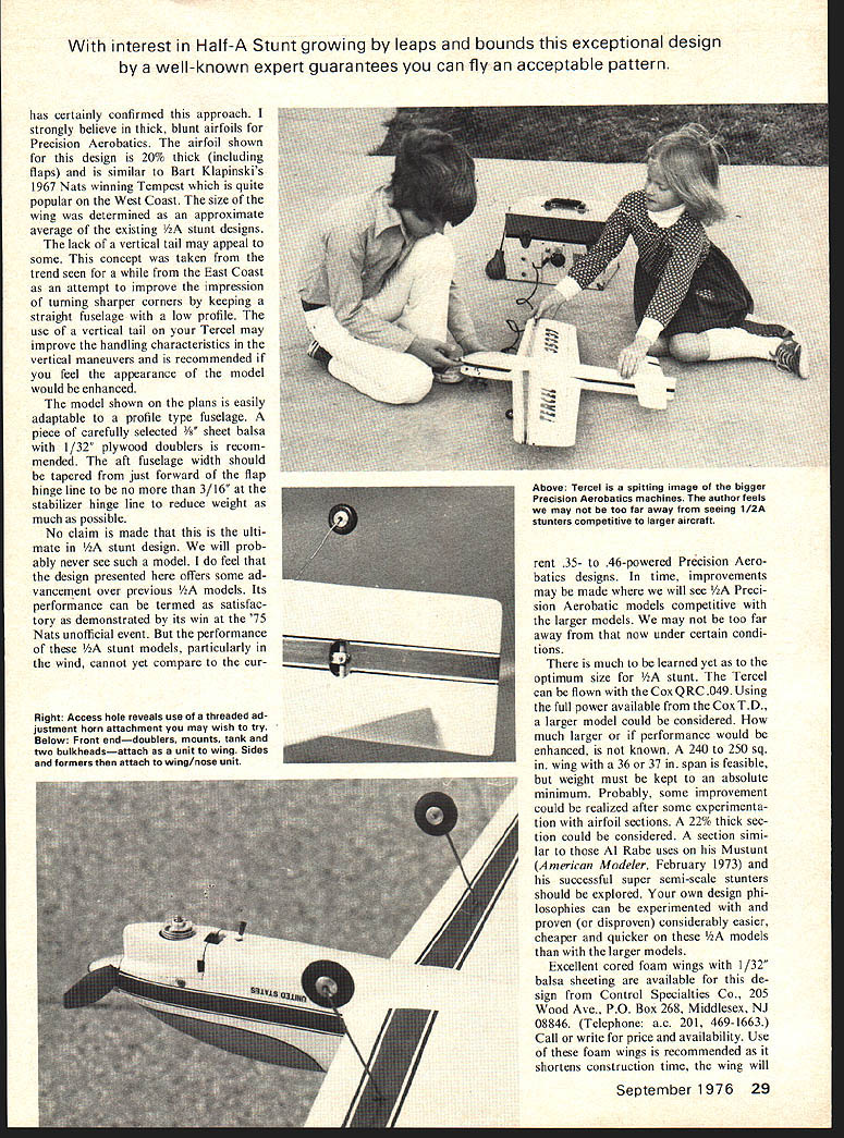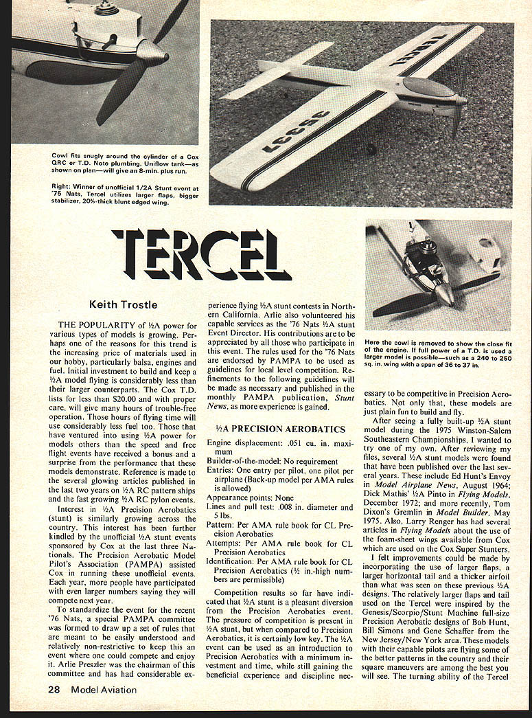 rhj Keith Trostle THE POPULARITY power various types models growing Per haps reasons trend increasing price materials used hobby particularly balsa engines fuel Initial investment build keep /2A model flying considerably less larger counterparts Cox TD lists less $2000 proper care will give hours trouble-free operation hours flying time will use considerably less fuel too have ventured using Y2A power models others speed free flight events have received bonus surprise performance models demonstrate Reference made several glowing articles published last two years RC pattern ships fast growing Y2A RC pylon events Interest Precision Aerobatics stunt similarly growing across country interest has further kindled unofficial stunt events sponsored Cox last three Nit tionals Precision Aerobatic Model Pilots Association PAMPA assisted Cox running unofficial events year people have participated larger numbers saying will compete next year standardize event recent 76 Nats special PAMPA committee formed draw up set rules meant easily understood relatively non-restrictive keep event could compete enjoy Arlie Preszler chairman committee has considerable ex perience flying /2A stunt contests North ern California Arlie also volunteered capable services 76 Nats stunt Event Director contributions appreciated participate event rules used 76 Nats endorsed PAMPA used guidelines local level competition Re finements following guidelines will made necessary published monthly PAMPA publication Stunt News experience gained PRECISION AEROBATICS Engine displacement 051 cu maxi mum Builder-of-the-model No requirement Entries entry per pilot pilot per airplane Back-up model per AMA rules allowed Appearance points None Lines pull test 008 diameter 5 lbs Pattern Per AMA rule book CL Pre cision Aerobatics Attempts Per AMA rule book CL Precision Aerobatics Identification Per AMA rule book CL Precision Aerobatics igh num bers permissible Competition results far have indi cated /2A stunt pleasant diversion Precision Aerobatics event pressure competition present stunt compared Precision Aerobatics certainly low key event can used introduction Precision Aerobatics minimum vestment time still gaining beneficial experience discipline necessary competitive Precision Aero batics models just plain fun build fly After seeing fully built-up Y2A stunt model during 1975 Winston-Salem Southeastern Championships wanted try own After reviewing files several Y2A stunt models found have published over last sev eral years include Ed Hunts Envoy Model Airplane News August 1964 Dick Mathis Pinto Flying Models December 1972 recently Tom Dixons Gremlin Model Builder May 1975 Also Larry Renger has several articles Flying Models about use foam-sheet wings available Cox used Cox Super Stunters felt improvements could made incorporating use larger flaps larger horizontal tail thicker airfoil what seen previous /2A designs relatively larger flaps tail used Tercel inspired Genesis/Scorpio/Stunt Machine full-size Precision Aerobatic designs Bob Hunt Bill Simons Gene Schaffer New Jersey/New York area models capable pilots flying some better patterns country square maneuvers among best will see turning ability Tercel 28 Model Aviation Cowl fits snugly around cylinder Cox QRC TO Note plumbing Uniflow tankas shown planwill give a-mm plus run Right Winner unofficial 1/2A Stunt event 75 Nats Tercel utilizes larger flaps bigger stabilizer 20%-thick blunt edged wing cowl removed show close fit engine full power TD used larger model possiblesuch 240 250 sq wing span 36 37 has certainly confirmed approach strongly believe thick blunt airfoils Precision Aerobatics airfoil shown design 20% thick including flaps similar Bart Klapinskis 1967 Nats winning Tempest quite popular West Coast size wing determined approximate average existing stunt designs lack vertical tail may appeal some concept taken trend seen East Coast attempt improve impression turning sharper corners keeping straight fuselage low profile use vertical tail Tercel may improve handling characteristics vertical maneuvers recommended feel appearance model would enhanced model shown plans easily adaptable profile type fuselage piece carefully selected t balsa 1/32 plywood doublers recom mended aft fuselage width should tapered just forward flap hinge line no 3/16 stabilizer hinge line reduce weight much possible No claim made ulti mate stunt design will prob ably never see such model feel design presented offers some ad vancement over previous models Its performance can termed satisfac tory demonstrated its win 75 Nats unofficial event performance stunt models particularly wind cannot yet compare curRight Access hole reveals use threaded ad justment horn attachment may wish try Below Front enddoublers mounts tank two bulkheadsattach unit wing Sides formers attach wing/nose unit rent 35- 46-powered Precision Aero batics designs time improvements may made will see Preci sion Aerobatic models competitive larger models may too far away now under certain condi tions much learned yet optimum size stunt Tercel can flown CoxQRC 049 Using full power available Cox TD larger model could considered much larger performance would enhanced known 240 250 sq wing 36 37 span feasible weight must kept absolute minimum Probably some improvement could realized after some experimenta tion airfoil sections 22% thick sec tion could considered section simi lar Al Rabe uses Mustunt American Modeler February 1973 successful super semi-scale stunters should explored own design phi losophies can experimented proven disproven considerably easier cheaper quicker models larger models Excellent cored foam wings 1/32 balsa sheeting available de sign Control Specialties Co 205 Wood Ave PO Box 268 Middlesex NJ 08846 Telephone ac 201 469-1663 Call write price availability Use foam wings recommended shortens construction time wing will September 1976 29 interest Half-A Stunt growing leaps bounds exceptional design well-known expert guaran