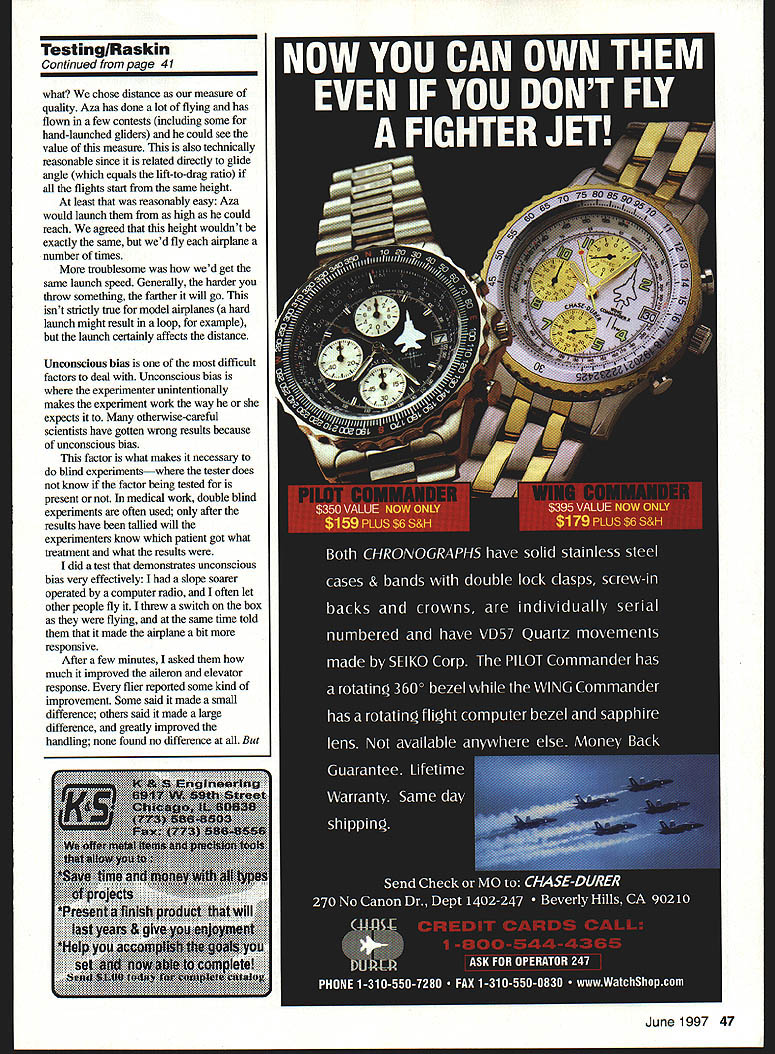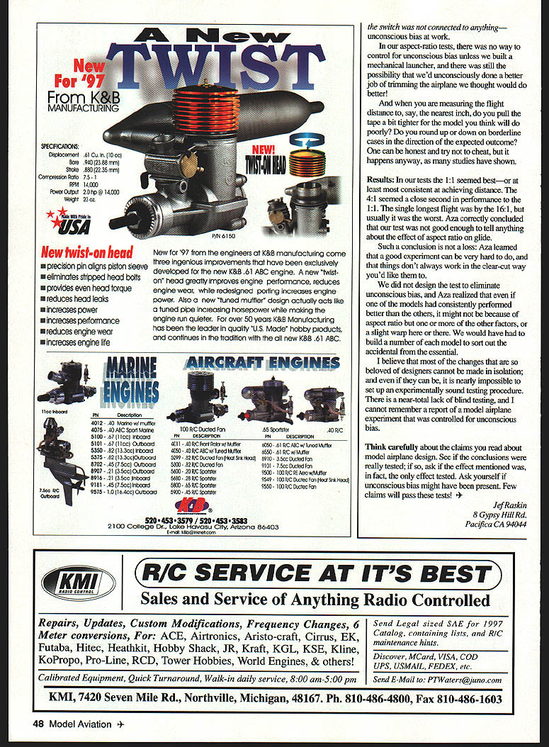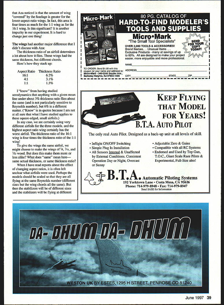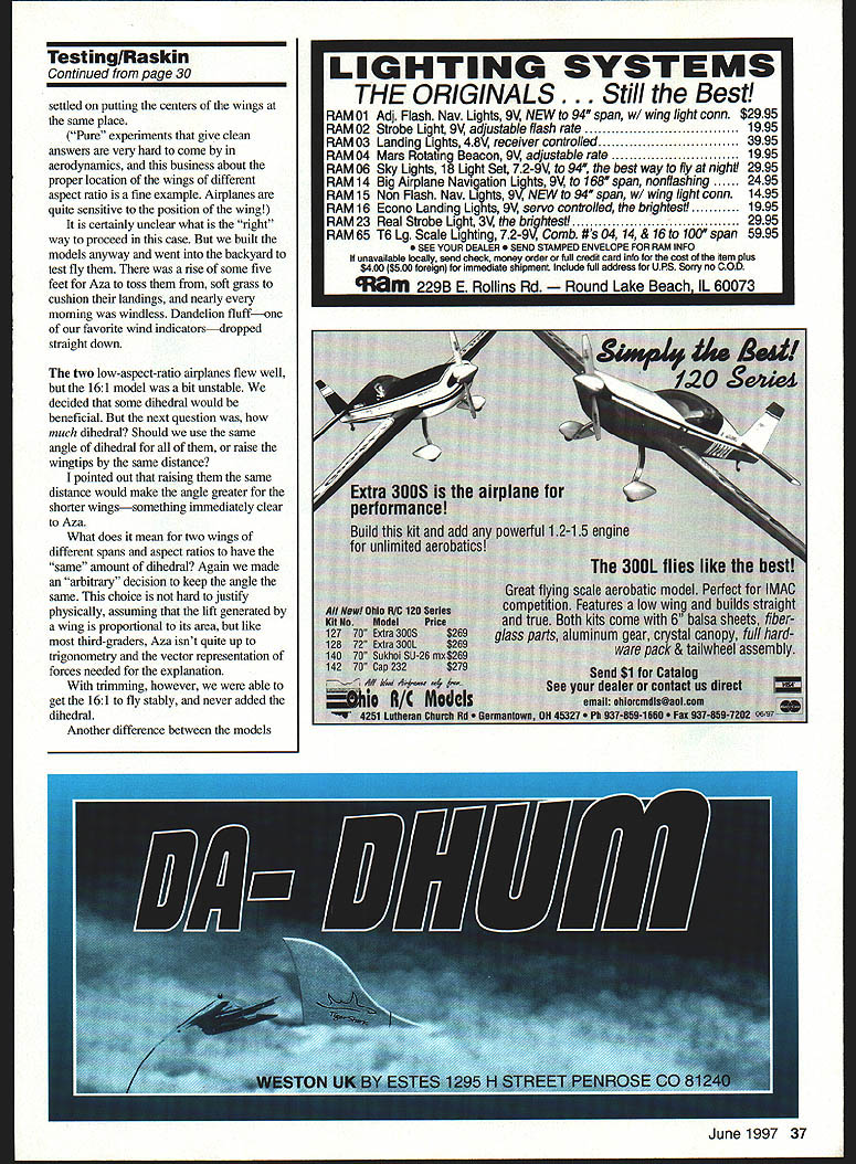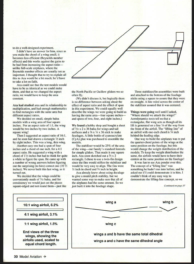 MODEL AIRPLANES Its easy think says author father-andson test program yielded some interesting results 28 Model Aviation f Raskiri explaining term aspect ratio then-nine-year-old son Aza taking part ages-old tradition passing knowledge generation next gave him simple example rectangular wing aspect ratio span divided chord wing foot span foot chord would have aspect ratio . interrupted Right said span four feet . aspect ratio would befour said Aza showed him notate aspect ratios 11 41 talked about bigger wings could carry weightor same weight larger wing could fly slowly smaller wings Aza has flying lot model airplanes made sense him really tiny wing added airplane would have fly very fast stay up Right said pleased observation showed him picture F-104 its tiny wings goes very fast Aza asked question trying lead him think about What difference does aspect ratio make way airplane flies full-size airplanes answered higher aspect ratios make efficient can go farther less fuel example What kind airplanes have very high aspect ratios Aza has plastic models hanging ceiling home including some sailplanes Gliders said can go long ways fuel use thermais climb So dont people just make airplanes large aspect ratios What would look like asked wings would long skinny replied what problems would cause would flex too much especially high speeds would hard put hangars youd need very long ramp get airport would have left subject wanted know did say full-size airplanes Isnt true models too Well extemporized things bit complicated Its easy find out said Aza Lets just make two modelsone high aspect ratio low aspect ratio everything else same see flies better Azas proposal sounded reasonable no finer way get truth Wings quarter-chords aligned Wings centers same line June1997 29 Area4 sq in Span 8 Chord 05 Aspect Ratio 16 Area 4 sq Span 4 Chord 1 Aspect Ratio 4 Area 4 sq Span 2 Chord 2 Aspect Ratio 1 -U 0 well-designed experiment didnt have answer him since make chord wing small becomes less efficient Reynolds number effects works against gains increasing aspect ratio unlike full-scale airplanes Reynolds number effects usually important thought try explain Aza would bit much hed have take lot faith Aza could see test models would have identical could make changed aspect ratio would have keep area constant Aza studied area its relationship multiplication enough mathematics find rectangles same area different aspect ratios decided small simple balsa models wing area four square inches aspect ratio 11 wing would two inches two inches square wing suggested aspect ratio 161 soon drawn rectangle 1/2 inch eight inches long thin wing Another easy span four inches chord inch 41 aspect ratio suggested wing chord 11/2 inches think quite figure span came up number wrong answers before figuring out surprising him correct 10 2/3 inches never built last wing turned out decided wings could conveniently made A2 balsa consistency would just cut pieces square-edged round themjust like F North Pacific Guillow gliders often fly didnt discuss logically no difference between asking about effect aspect ratio effect span experiment could equally well describe wings going build having same areafour square inches spans two four eight inches found hobby shop bought sheet A2 x 2 x 36 balsa wings tail surfaces 1/8 x stick make fuselages little bottle cyanoacrylate CyA glue purchased assemble models stabilizer would 25% area wingour familys standard formula simple gliders made square inch Aza soon sketched out x 2 rectangle chose use twin-fin design since fins would stiffen stabilizer would very easy align fins /2 inch chord 3/4 inch height Aza already knew about using decalage give model pitch stability wanted some way make sure airplanes same amount So just built fuselage shape Three stabilizer/fin assemblies built attached bottom fuselage sticks using square assure straight line ruled across center stabilizer assured centered Things going well until asked should attach wings Aerodynamics texts tell us rectangular flat wing acts though its lift generated line /4 way front airfoil lifting line airfoil one-inch chord behind leading edge way build airplanes put quarter-chord points wings same position fuselage would change weight distribution models keep weight distribution same airfoils would have have centers same position fuselage fun see Aza ponder over concept lifting line something hadnt run before asked could demonstrate him couldnt think easy way demonstrate lifting-line concept Continued page 37 30 Model Aviation wing airfoil 62% 41 wing airfoil 31% 11 wing airfoil 15% End views three wings showing airfoils used scaled equal chord length wing awing b wing c wings b have same total dihedral wings c have same dihedral angle TestinglRaskin Continued page 30 seffled putting centers wings same place Pure experiments give clean answers very hard come aerodynamics business about proper location wings different aspect ratio fine example Airplanes quite sensitive position wing certainly unclear what right way proceed case built models anyway went backyard test fly rise some five feet Aza toss soft grass cushion landings nearly morning windless Dandelion fluffone favorite wind indicatorsdropped straight down two low-aspect-ratio airplanes flew well 161 model bit unstable decided some dihedral would beneficial next question much dihedral Should use same angle dihedral raise wingtips same distance pointed out raising same distance would make angle greater shorter wingssomething immediately clear Aza What does mean two wings different spans aspect ratios have same amount dihedral Again made arbitrary decision keep angle same choice hard justify physically assuming lift generated wing proportional its area like third-graders Aza isnt quite up trigonometry vector representation forces needed explanation trimming however able get 161 fly stably never added dihedral Another difference between models June1997 37 LIGHTING SYSTEMS THE ORIGINALS. Still