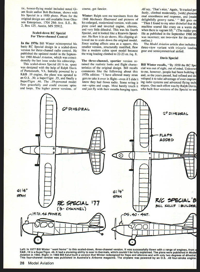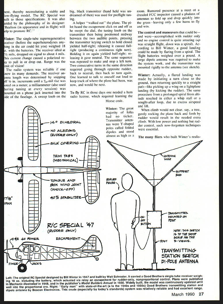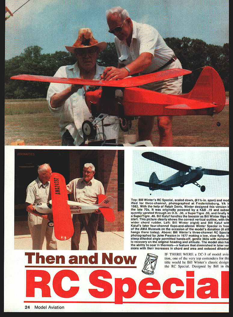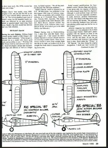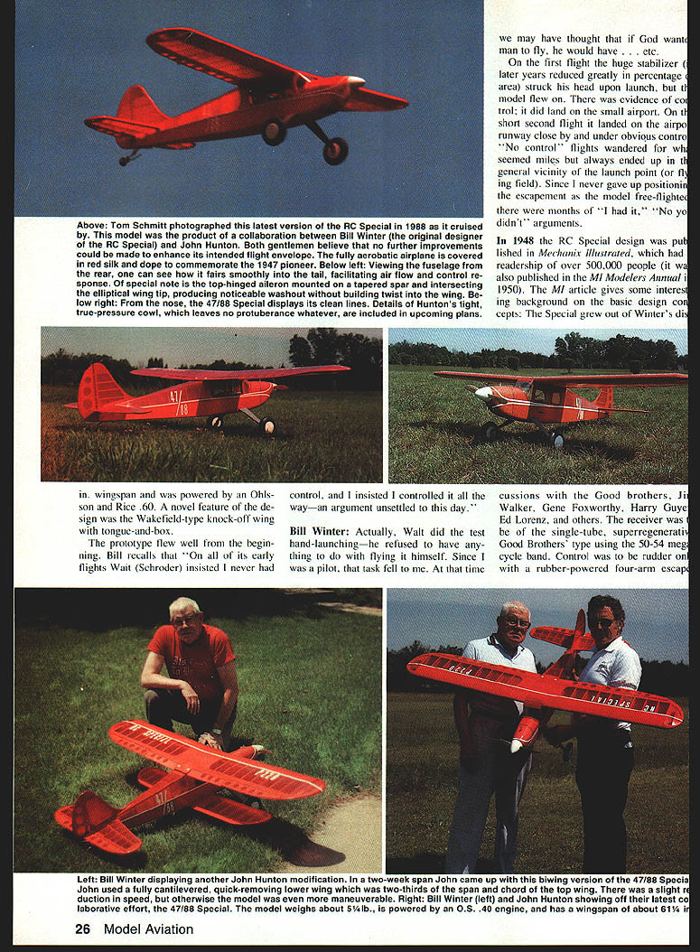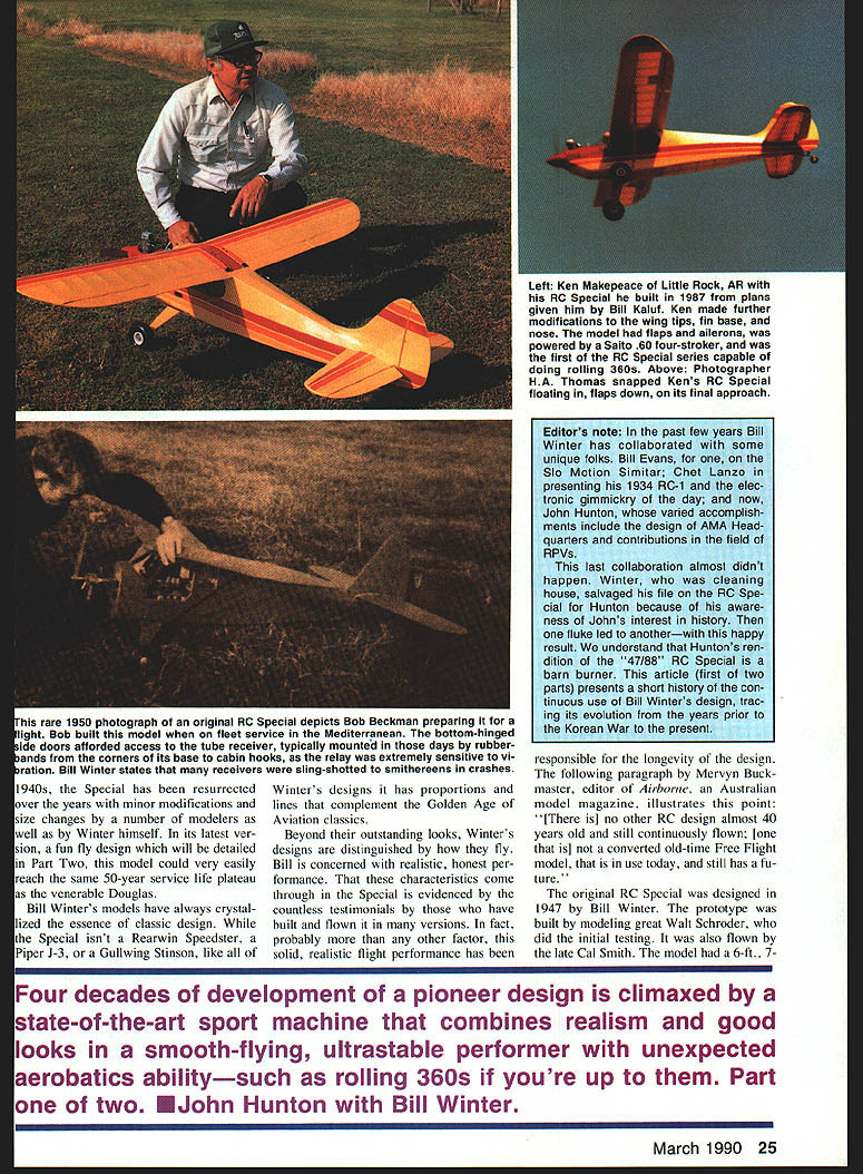 Top Bill Winters RC Special scaled down 61 -in span mo ified three-channel photographed Fredericksburg VA ii 1982 help Ralph Davis Winter designed version ii late 70s originally powered K&B 19 subse quently uprated through 05 30 SuperTigre 35 finally F SuperTigre 46 Bill Kaluf handles booster Bill Winter flips ti start picture clearly shows correct vertical outline thi wider chord rudder Left Bill Winter right Bill Kaluf witi Kalufs later four-channel flaps-and-aileron Winter Special fron AMA Museum occasion models donation stil hangs today Above Bill Winters three-channel RC Specia photographed John Preston 1977 making low slow flyby lt steep dihedral angle permitted hands-off gentle 360s automat ic recovery original heading altitude model also hai ability soar thermalsa feature diminished later ver sions increases chord area reduced dihedral IF THERE WERE DC-3 model avia tion very top contenders thi title would Bill Winters classic design RC Special Designed Bill th ec 24 Model Aviation Now 5 1940s Special has resurrected over years minor modifications size changes number modelers well Winter himself its latest ver sion fun fly design will detailed Part Two model could very easily reach same 50-year service life plateau venerable Douglas Bill Winters models have always crystal lized essence classic design Special isnt Rearwin Speedster Piper J-3 Gullwing Stinson like Winters designs has proportions lines complement Golden Age Aviation classics Beyond outstanding looks Winters designs distinguished fly Bill concerned realistic honest per formance characteristics come through Special evidenced countless testimonials have built flown versions fact probably other factor solid realistic flight performance has responsible longevity design following paragraph Mervyn Buckmaster editor Airborne Australian model magazine illustrates point [There is] no other RC design almost 40 years old still continuously flown lone is] converted old-time Free Flight model use today still has fu ture original RC Special designed 1947 Bill Winter prototype built modeling great Walt Schroder did initial testing also flown late Cal Smith model 6-ft 7our decades development pioneer design climaxed e-of-the-art sport machine combines realism good a smooth-flying ultrastable performer unexpected abilitysuch rolling 360s youre up Part ne two EJohn Hunton Bill Winter March 1990 25 Left Ken Makepeace Little Rock AR RC Special built 1987 plans given him Bill Kaluf Ken made further modifications wing tips fin base nose model flaps ailerons powered Saito 60 four-stroker first RC Special series capable doing rolling 360s Above Photographer HA Thomas snapped Kens RC Special floating flaps down its final approach Editors note past few years Bill Winter has collaborated some unique folks Bill Evans 510 Motion Simitar Chet Lanzo presenting 1934 RC-1 elec tronic gimmickry day now John Hunton varied accomplish ments include design AMA Head quarters contributions field RPVs last collaboration almost didnt happen Winter cleaning house salvaged file RC Spe cial Hunton because aware ness Johns interest history fluke led anotherwith happy result understand Huntons ren dition 47188 RC Special barn burner article first two parts presents short history con tinuous use Bill Winters design trac ing its evolution years prior Korean War present rare 1950 photograph original RO Special depicts Bob Beckman preparing Bob built model fleet service Mediterranean bottom-hinged doors afforded access tube receiver typically mountei days rubberfrom corners its base cabin hooks relay extremely sensitive vi Bill Winter states receivers sling-shotted smithereens crashes Above Tom Schmitt photographed latest version RC Special 1988 cruised model product collaboration between Bill Winter original designer RC Special John Hunton Both gentlemen believe no further improvements could made enhance its intended flight envelope fully acrobatic airplane covered red silk dope commemorate 1947 pioneer Below left Viewing fuselage rear can see fairs smoothly tail facilitating air flow control re sponse special note top-hinged aileron mounted tapered spar intersecting elliptical wing tip producing noticeable washout building twist wing low right nose 47/88 Special displays its clean lines Details Huntons tight true-pressure cowl leaves no protuberance whatever included upcoming plans may have thought God want man fly would have c first flight huge stabilizer later years reduced greatly percentage area struck head upon launch tI model flew evidence co trol did land small airport tI short second flight landed airpo runway close under obviqus contro No control flights wandered wh seemed miles always ended up ti general vicinity launch point 0 ing field Since never gave up positionir escapement model free-flighte months No yo didnt arguments 1948 RC Special design put lished Mechanix Illustrated readership over 500000 people w also published MI Modelers Annual 1950 Ml article gives some interesi ing background basic design cor cepts Special grew out Winters di wingspan powered Ohis son Rice 60 novel feature de sign Wakefield-type knock-off wing tongue-and-box prototype flew well begin ning Bill recalls its early flights Wait Schroder insisted never control insisted controlled wayan argument unsettled day Bill Winter Actually Walt did test hand-launchinghe refused have thing flying himself Since pilot task fell time cussions Good brothers Ji Walker Gene Foxworthy Harry Guyej Ed Lorenz others receiver II single-tube superregenerati Good Brothers type using 50-54 meg cycle band Control rudder rubber-powered four-arm escap Left Bill Winter displaying another Jo.. po n, a,v upiiii uwIIg v John used fully cantilevered quick-remc.ig lowe .. thirds span uriurd top wing nere saigni rq duction speed otherwise model miuverable Right Bill Winter left John Hunton showing off latest col laborative effort 47/88 Special model weighs about 5l/41b powered OS 40 engine has wingspan about 61