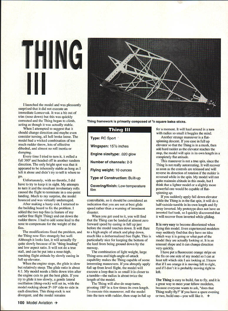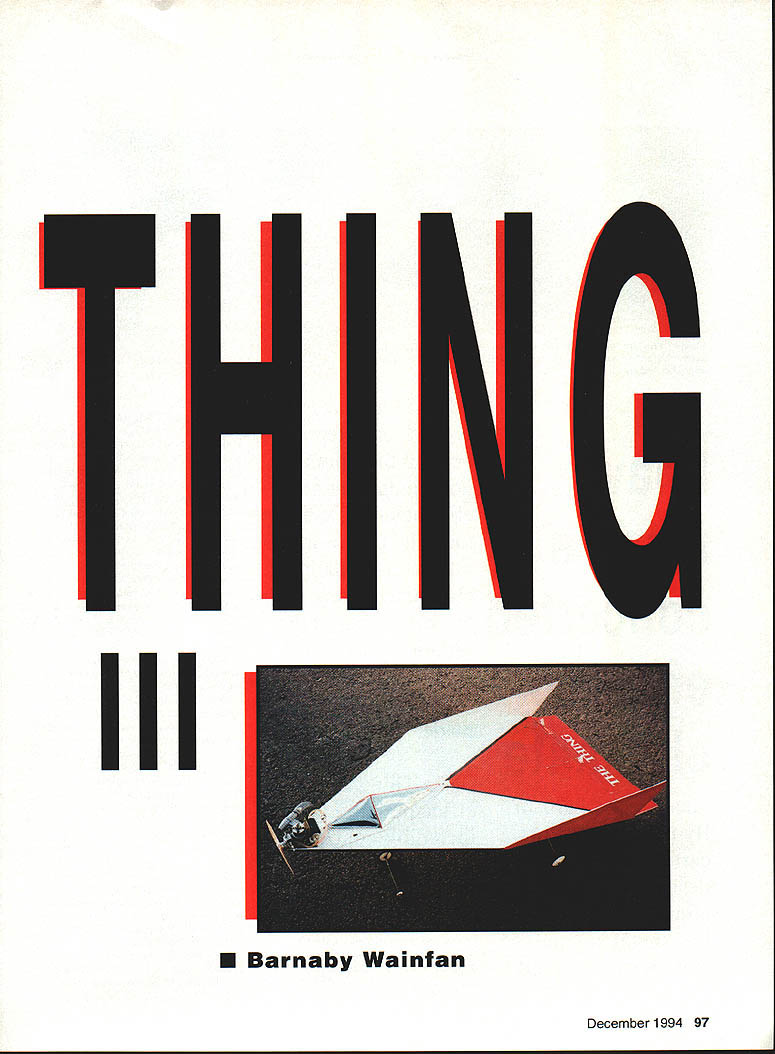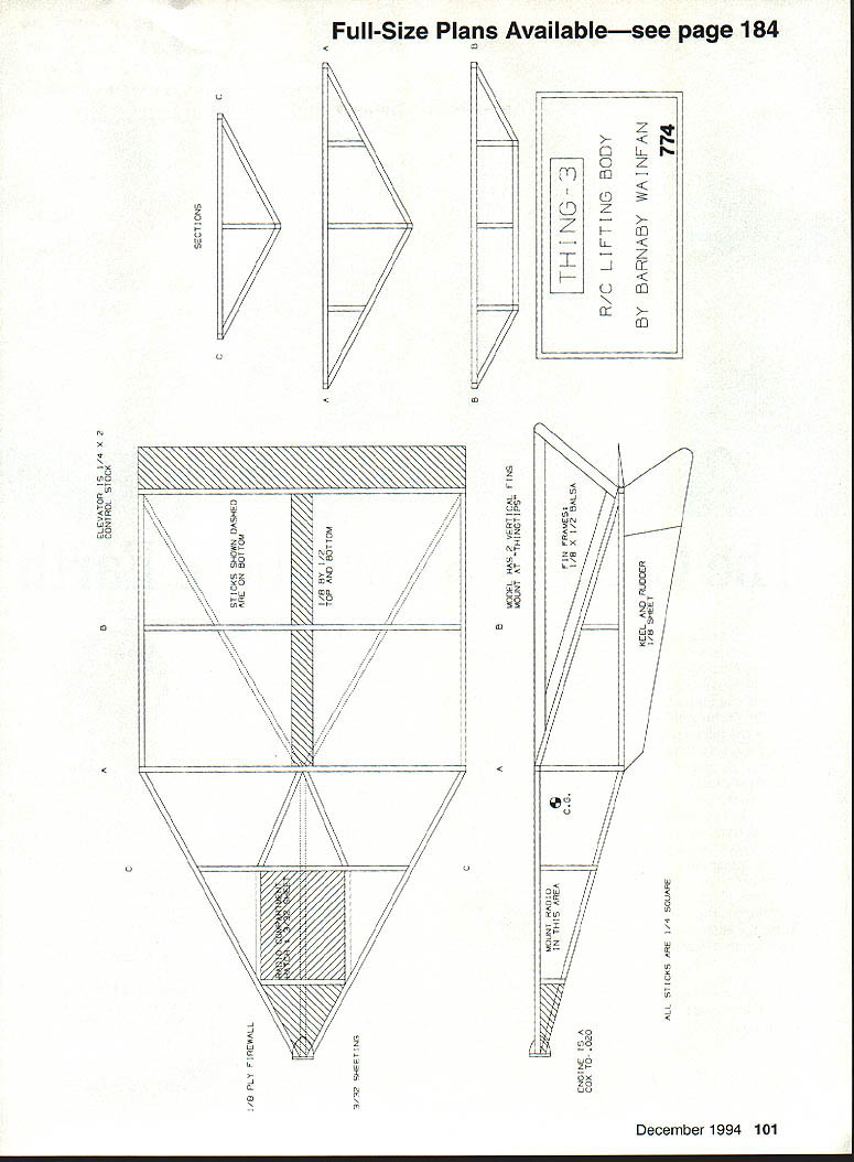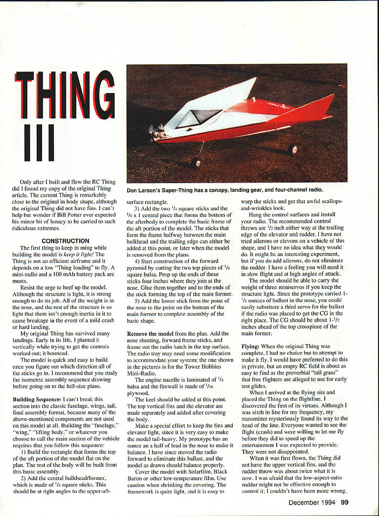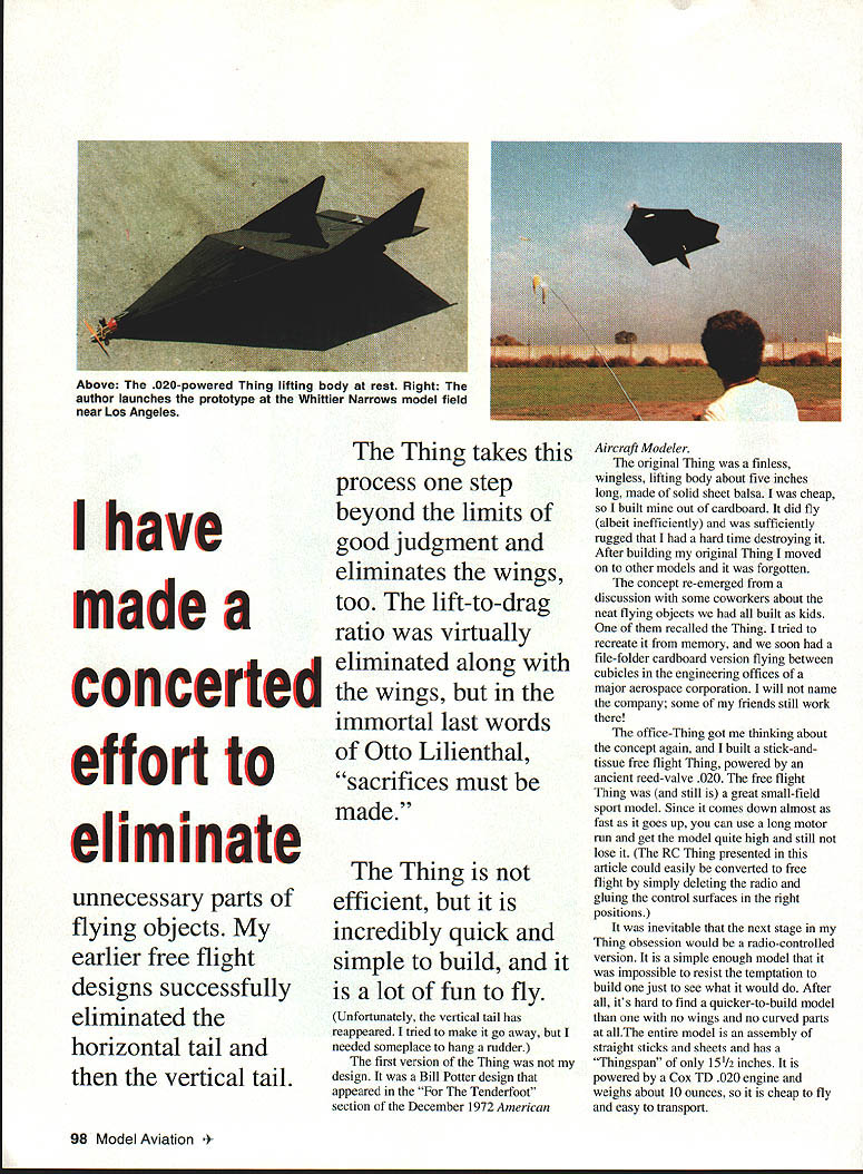 III mm m December 1994 97 U Barnaby Wainfan process step beyond limits good judgment eliminates wings too lift-to-drag ratio virtually d eliminated along Cwiiiithe wings effort eliminate unnecessary parts flying objects earlier free flight designs successfully eliminated horizontal tail vertical tail immortal last words Otto Lilienthal sacrifices must made Thing efficient incredibly quick simple build alot fun fly Unfortunately vertical tail has reappeared tried make go away needed someplace hang rudder first version Thing design Bill Potter design appeared Tenderfoot section December 1972 American Aircraft Modeler original Thing finless wingless lifting body about five inches long made solid sheet balsa cheap built out cardboard did fly albeit inefficiently sufficiently rugged hard time destroying After building original Thing moved other models forgotten concept re-emerged discussion some coworkers about neat flying objects built kids recalled Thing tried recreate memory soon file-folder cardboard version flying between cubicles engineering offices major aerospace corporation will name company some friends still work office-Thing got thinking about concept again built stick-andtissue free flight Thing powered ancient reed-valve 020 free flight Thing still great small-field sport model Since comes down almost fast goes up can use long motor run get model quite high still lose RC Thing presented article could easily converted free flight simply deleting radio gluing control surfaces right positions inevitable next stage Thing obsession would radio-controlled version simple enough model impossible resist temptation build just see what would After its hard find quicker-to-build model no wings no curved parts allThe entire model assembly straight sticks sheets has Thingspan 1512 inches powered Cox TD 020 engine weighs about 10 ounces cheap fly easy transport 98 Model Aviation e The 020-powered Thing lifting body rest Right author launches prototype Whittier Narrows model field near Los Angeles Thing takes have made THING III Only after built flew RC Thing did found copy original Thing article current Thing remarkably close original body shape although original Thing did have fins cant help wonder Bill Potter ever expected minor bit lunacy carried such ridiculous extremes CONSTRUCTION first thing keep ming building model keep light Thing efficient airframe depends low Thing loading fly mini-radio 100 mAh battery pack musts Resist urge beef up model Although structure light strong enough its job weight nose rest structure light isnt enough inertia cause breakage event mild crash hard landing original Thing has survived landings Early its life planted vertically trying get controls worked out bounced model quick easy build once figure out direction sticks go recommend study isometric assembly sequence drawing before going full-size plans Building Sequence cant break section classic fuselage wings tail final assembly format because above-mentioned components used model Building fuselage wing lifting body whatever choose call main section vehicle requires follow sequence 1 Build rectangle forms top aft portion model flat plan rest body will built basic assembly 2 Add central bulkhead/former made 1/4 square sticks should right angles upper-aftsurface rectangle 3 Add two 1/4 square sticks x 1 central piece forms bottom afterbody complete basic frame aft portion model sticks form frame halfway between main bulkhead trailing edge can either added point later model removed plans 4 Start construction forward pyramid cutting two top pieces 1/4 square balsa Prop up ends sticks four inches join nose Glue together ends stick forming top main former 5 Add lower stick point nose point bottom main former complete assembly basic shape Remove model plan Add nose sheeting forward frame sticks frame out radio hatch top surface radio tray may need some modification accommodate system shown pictures Tower Hobbies Mini-Radio engine nacelle laminated 1/4 balsa firewall made /16 plywood keel should added point top vertical fins elevator made separately added after covering body Make special effort keep fins elevator light since very easy make model tail-heavy prototype has ounce half lead nose make balance have since moved radio forward eliminate ballast model drawn should balance properly Cover model Solarfilm Black Baron other low-temperature film Use caution shrinking covering framework quite light easy warp sticks get awful scallopsand-wrinkles look Hang control surfaces install radio recommended control throws 1/2 inch either way trailing edge elevator rudder have tried ailerons elevons vehicle shape have no idea what would might interesting experiment add ailerons eliminate rudder have feeling will need slow flight high angles attack model should able carry weight three miniservos keep structure light Since prototype carried 11/2 ounces ballast nose could easily substitute third servo ballast radio placed get CC right place CC should about ll/2 inches ahead top crosspiece main former Flying When original Thing complete no choice attempt make fly would have preferred private empty RC field about easy find proverbial tall grass free fighters alleged use early test glides arrived flying site placed Thing flightline discovered first its virtues Although sixth line frequency transmitter mysteriously found its way head line Everyone wanted see flight crash willing let fly before did speed up entertainment expected provide disappointed first flown Thing did have upper vertical fins rudder throw about twice what now afraid low-aspect-ratio rudder might effective enough control couldnt have wrong December1994 99 Don Larsons Super-Thing has canopy landing gear four-channel radio THING III launched model pleasantly surprised did execute immediate Lomcevak bit out trim nose down quickly corrected Thing began climb acting though actually stable attempted suggest should change direction maybe consider turning hell broke loos
