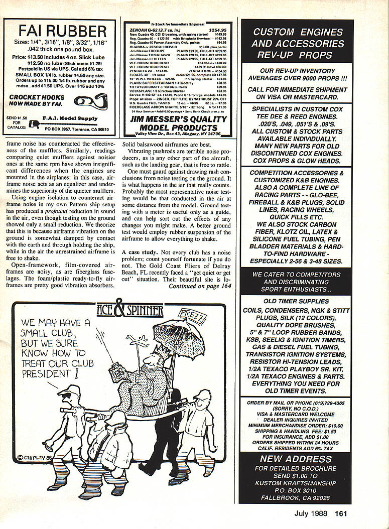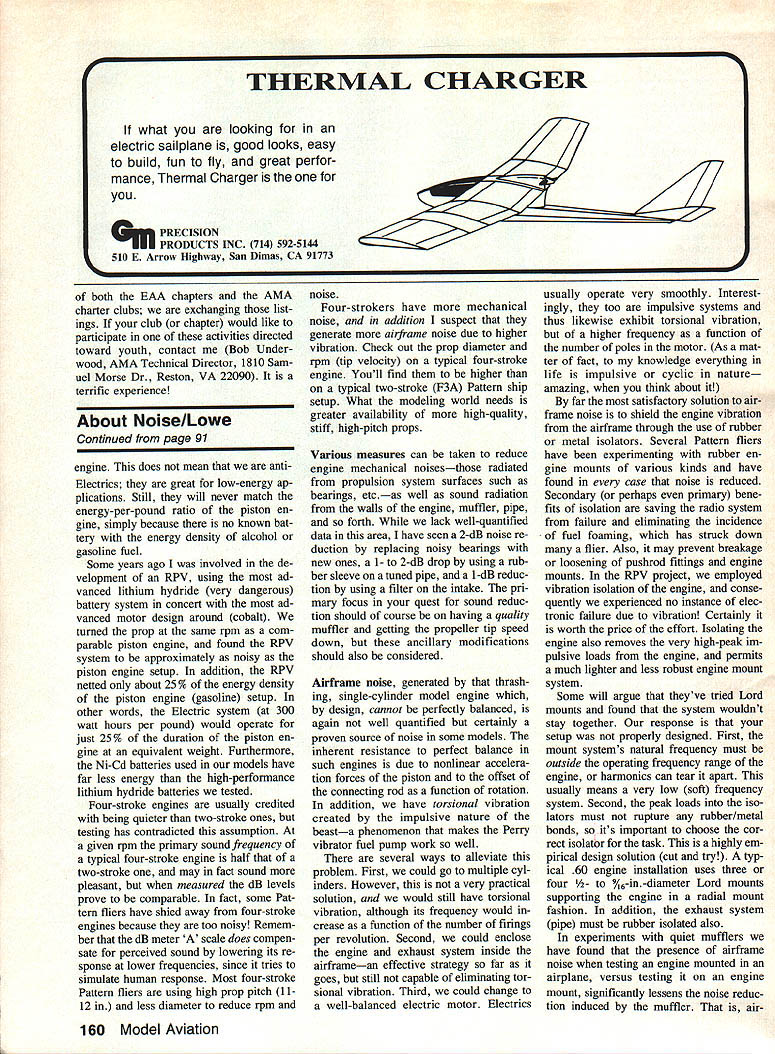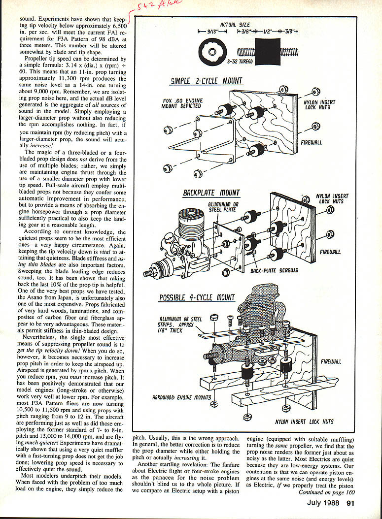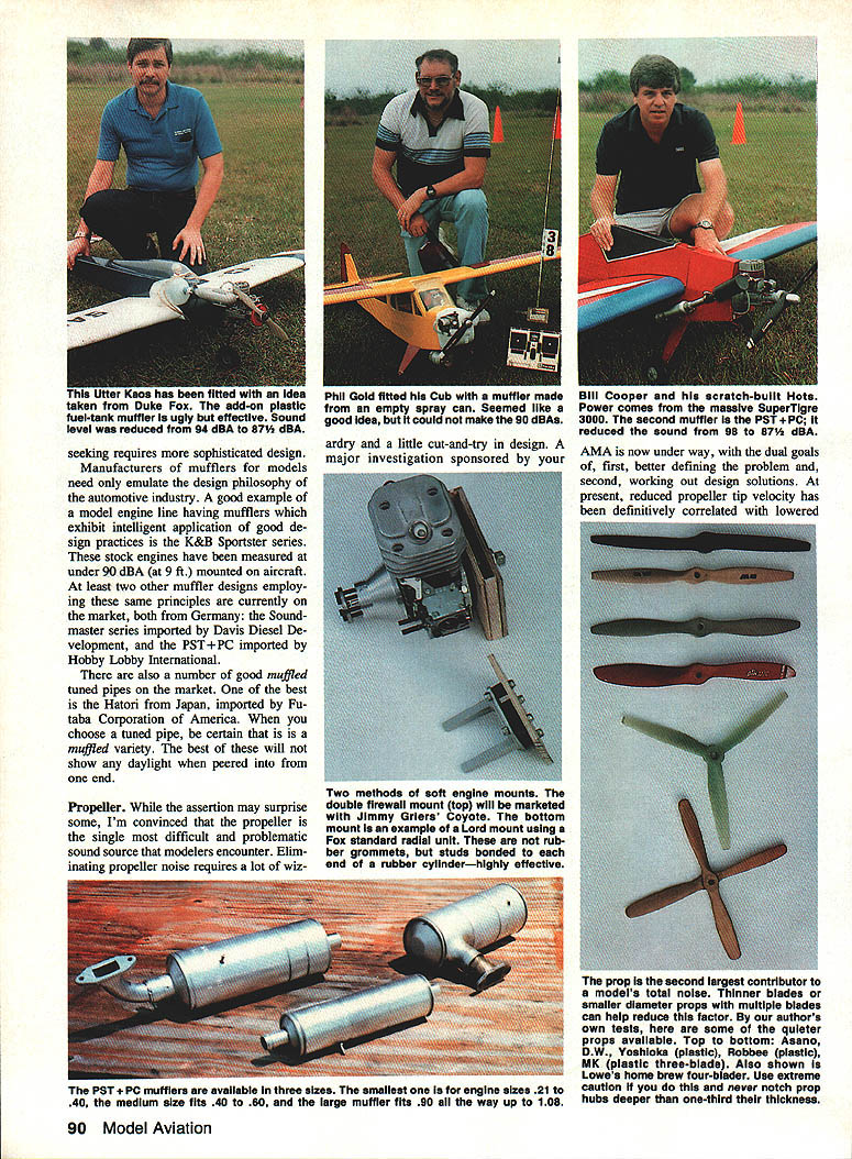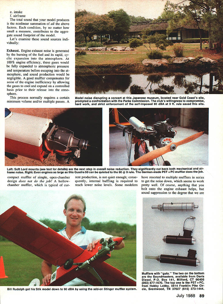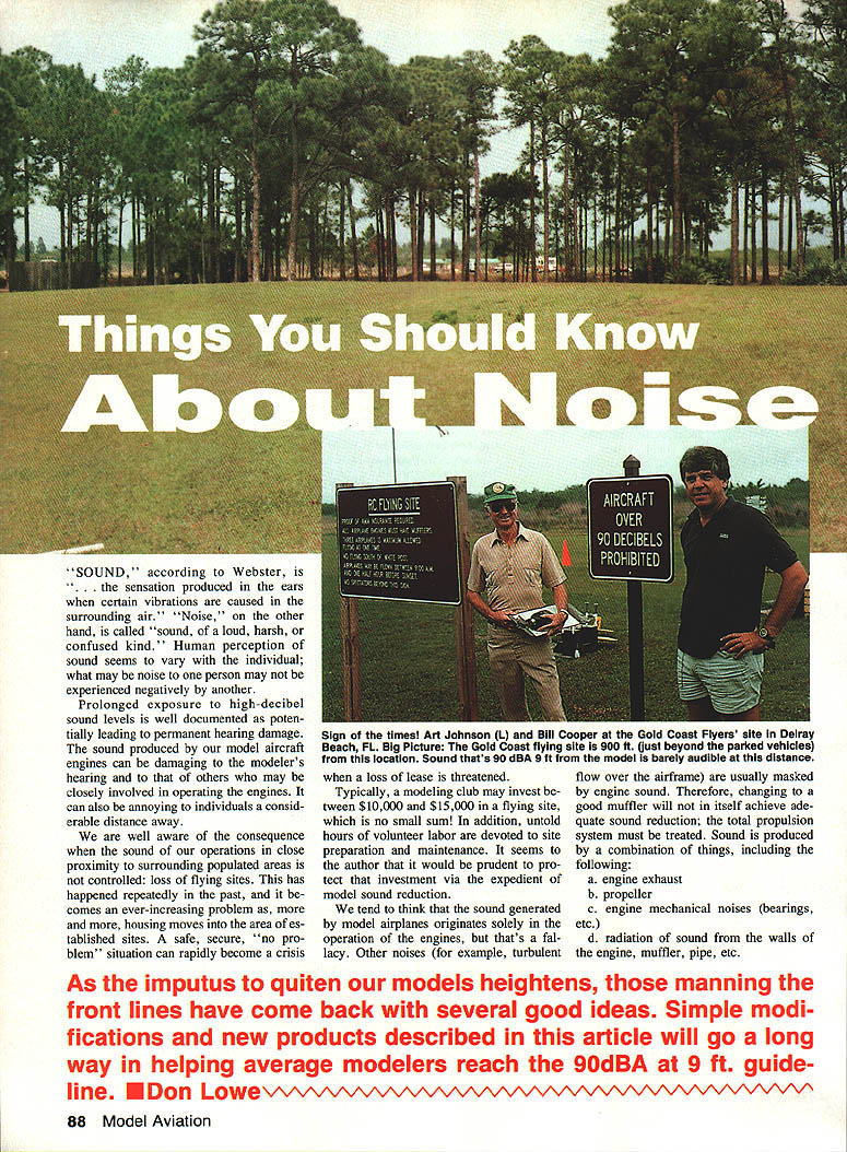 A SOUND according Webster sensation produced ears certain vibrations caused surrounding air Noise other hand called sound loud harsh confused kind Human perception sound seems vary individual what may noise person may experienced negatively another Prolonged exposure high-decibel sound levels well documented poten tially leading permanent hearing damage sound produced model aircraft engines can damaging modelers hearing others may closely involved operating engines can also annoying individuals consid erable distance away well aware consequence sound operations close proximity surrounding populated areas controlled loss flying sites has happened repeatedly past comes ever-increasing problem more housing moves area es tablished sites safe secure no pro blem situation can rapidly become crisis L Sign times Art Johnson L Bill Cooper Gold Coast Flyers site Delray Beach FL Big Picture Gold Coast flying site 900 ft Uust beyond parked vehicles location Sound thats 90 dBA 9 ft model barely audible distance loss lease threatened Typically modeling club may invest tween $10000 $15000 flying site no small sum addition untold hours volunteer labor devoted site preparation maintenance seems author would prudent pro tect investment via expedient model sound reduction tend think sound generated model airplanes originates solely operation engines thats fal lacy Other noises example turbulent flow over airframe usually masked engine sound Therefore changing good muffler will itself achieve ade quate sound reduction total propulsion system must treated Sound produced combination things including following a engine exhaust b propeller c engine mechanical noises bearings etc d radiation sound walls engine muffler pipe etc As imputus quiten models heightens manning front lines have come back several good ideas Simple modi fications new products described article will go long way helping average modelers reach 9OdBA 9 ft guide line EDon Lowev/vvvv-vvvvsvvwvvv/vvvv\tvv\VV\ 88 Model Aviation e intake f airframe total sound model produces nonlinear summation above factors condition no matter small measure contributes aggre gate sound footprint model Lets examine sound sources indi vidually Exhaust Engine exhaust noise generated burning fuel its rapid cy clic expansion atmosphere 100% engine efficiency gases would fully expanded atmospheric pressure temperature before escaping mosphere sound production would negligible good muffler compensates some engine inefficiency allowing gases cool expand controlled basis prior release atmo sphere process normally requires certain minimum volume and/or multiple passes Left Soft Lord mounts see text details next step overall noise reduction significantly cut back both mechanical air frame noise Right engines large Quadra 50 can quieted 90 @ 9 rule German-made PST uffler does job compact muffler simple open-chamber rent production quiet enough conse design does job hollow- quently internal baffling required chamber muffler typical cur- reach lower noise levels Some modelers 0 Bill Rudolph got Stik model down 90 dBA using add-on Stinger muffler sysTem have resorted multiple mufflers series get noise down seems work pretty well course anything bolt onto engine exhaust helps sound suppression degree Mufflers guts two bottom Soundmasters available Davis Diesel PO Box 141 Milford CT 06406 203 877-1670 top PST obby Lobby 5614 Franklin Pike Cir cle Brentwood TN 37027 615 373-1444 July 1988 89 Model noise disrupting concert Japanese museum located near Gold Coasts site prompted confrontation Parks Commission clubs willingness compromise hard work strict enforcement self-imposed 90 dBA 9 ft rule saved site seeking requires sophisticated design Manufacturers mufflers models need emulate design philosophy automotive industry good example model engine line having mufflers exhibit intelligent application good de sign practices K&B Sportster series stock engines have measured under 90 dBA 9 ft mounted aircraft least two other muffler designs employ ing same principles currently market both Germany Soundmaster series imported Davis Diesel De velopment PSTPC imported Hobby Lobby International also number good muffled tuned pipes market best Hatori Japan imported Fu tuba Corporation America choose tuned pipe certain is muffled variety best will show daylight peered end Propeller assertion may surprise some Im convinced propeller single difficult problematic sound source modelers enoounter Elim inating propeller noise requires lot wiz ardry little cut-and-try design major investigation sponsored Two methods soft engine mounts double firewall mount top will marketed wIth Jimmy Griers Coyote bottom mount example Lord mount using Fox standard radial unit rub ber grommets studs bonded end rubber cylinderhighly effective AMA now under way dual goals first better defining problem second working out design solutions present reduced propeller tip velocity has heen definitively correlated lowered prop lathe second largest contributor models total noise Thinner blades smaller diameter props multiple blades can help reduce factor authors own tests some quieter props available Top bottom Asano DW Yoshioka plastic Robbee plastic MK plastic three-blade Also shown Lowes home brew four-blader Use extreme caution never notch prop hubs deeper one-third thicknese 90 Model Aviation i-nil ijoma TIUSO nis lAID win munier made Bill Cooper scratch-built Hots empty spray can Seemed like Power comes massIve Superligre good idea could make 90 dBAs 3000 second muffler PST educed sound 98 87 dBA PSI i Pc mufflers avaIlable three sizes smallest engine sizes 21 40 medIum sIze fits 40 60 large muffler fits 90 way up 108 sound Experiments have shown keep ing tip velocity below approximately 6500 per sec will meet current FAI re quirement F3A Pattern 98 dBA three meters number will altered somewhat blade tip shape Propeller tip speed can determined simple formula 314 x dia x rpm 60 means 11-in prop turning approximately 11300 