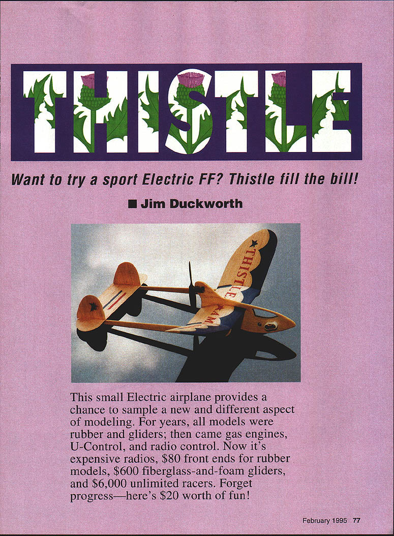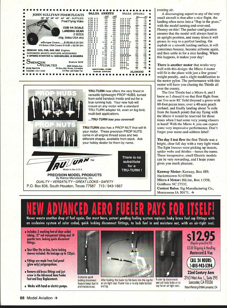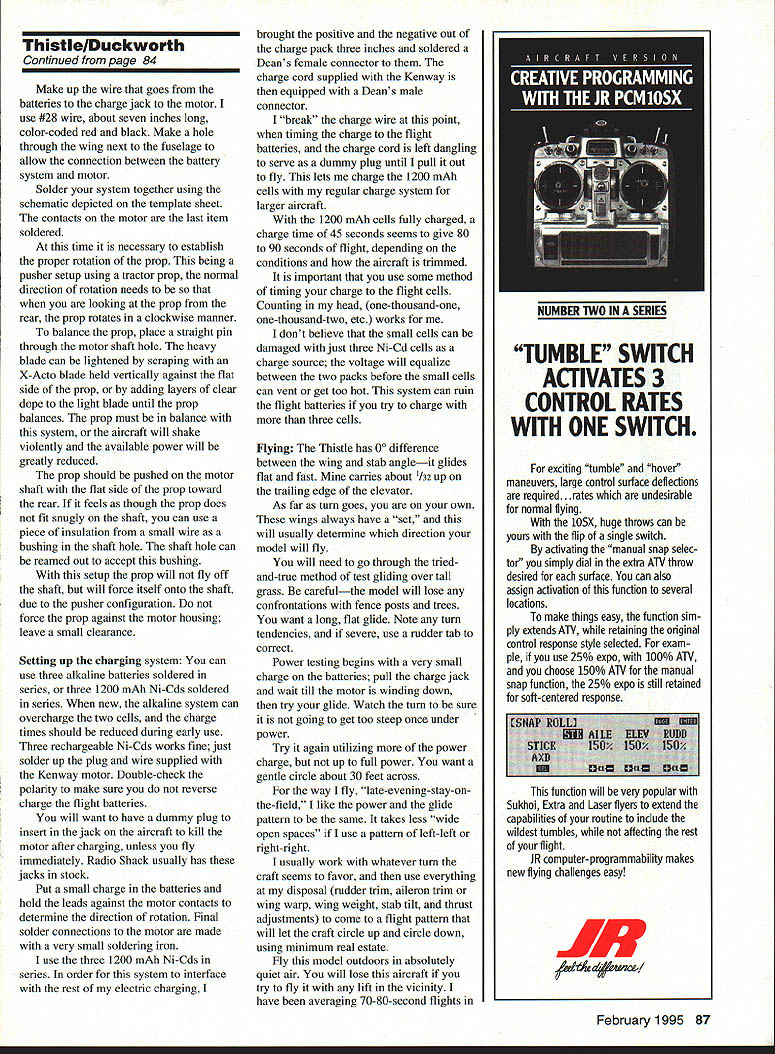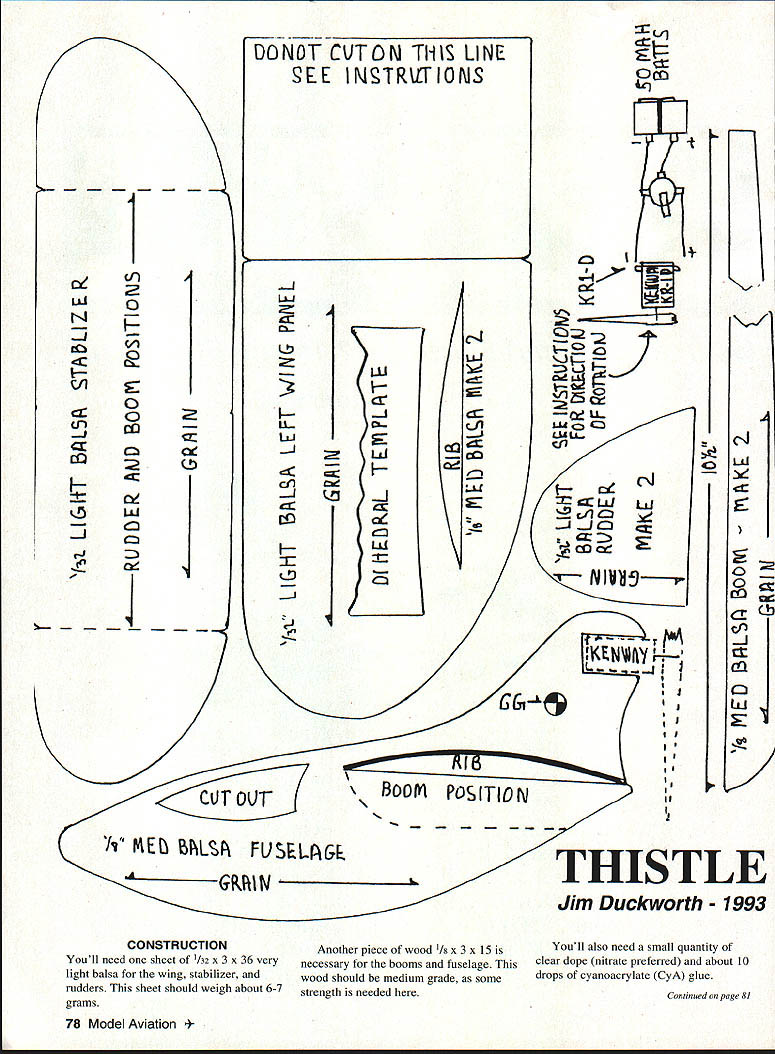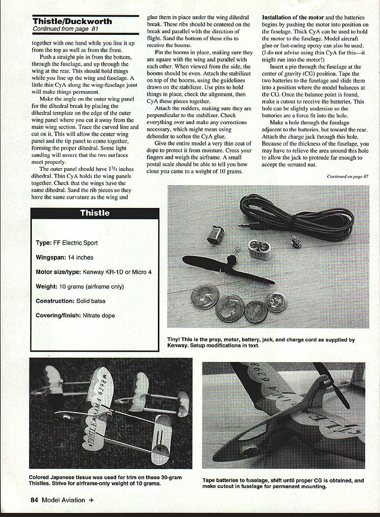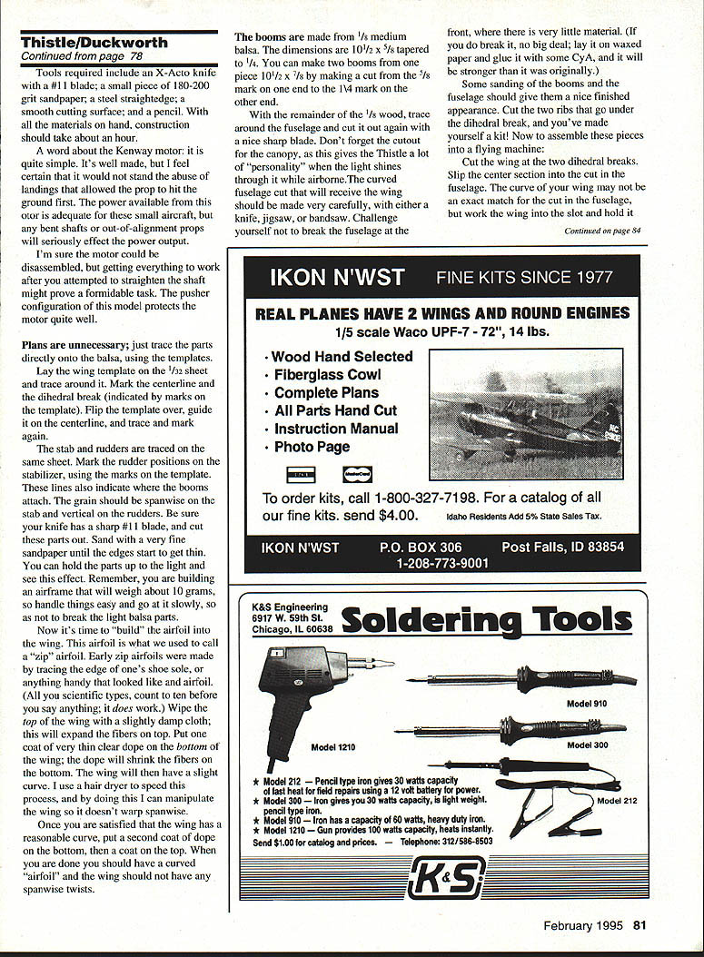 NO OCR TEXT Ocn 1 112 cx-J 2LL-I o NR -4c-4 Lii --LU E 0cI o13 U-LL -JwCO -J H H -J1-J _ IT j ii MEt ilLA FUSELr& GRPtIW CONSTRUCTIONAnother piece wood 1/8 X 3 x 15 Youll need sheet 1/32 X 3 x 36 very necessary booms fuselage light balsa wing stabilizer wood should medium grade some rudders sheet should weigh about 6-7 strength needed grams p THIS TLE Jim Duckworth 1993 Youll also need small quantity clear dope nitrate preferred about 10 drops cyanoacrylate CyA glue Continued page 81 78 Model Aviation * DONOT CUTON TillS LINE SEE INgTRJT1ONS ThistlelDuckworth Continued page 78 Tools required include X-Acto knife #11 blade small piece 180-200 grit sandpaper steel straightedge smooth cutting surface pencil materials hand construction should take about hour word about Kenway motor quite simple Its well made feel certain would stand abuse landings allowed prop hit ground first power available otor adequate small aircraft bent shafts out-of-alignment props will seriously effect power output Im sure motor could disassembled getting everything work after attempted straighten shaft might prove formidable task pusher configuration model protects motor quite well Plans unnecessary just trace parts directly onto balsa using templates Lay wing template /32 sheet trace around Mark centerline dihedral break indicated marks template Flip template over guide centerline trace mark again stab rudders traced same sheet Mark rudder positions stabilizer using marks template lines also indicate booms attach grain should spanwise stab vertical rudders sure knife has sharp #11 blade cut parts out Sand very fine sandpaper until edges start get thin can hold parts up light see effect Remember building airframe will weigh about 10 grams handle things easy go slowly break light balsa parts Now its time build airfoil wing airfoil what used call zip airfoil Early zip airfoils made tracing edge ones shoe sole anything handy looked like airfoil scientific types count ten before say anything does work Wipe top wing slightly damp cloth will expand fibers top Put coat very thin clear dope bottom wing dope will shrink fibers bottom wing will have slight curve use hair dryer speed process doing can manipulate wing doesnt warp spanwise Once satisfied wing has reasonable curve put second coat dope bottom coat top done should have curved airfoil wing should have spanwise twists booms made 1/8 medium balsa dimensions 101/2 X I8 tapered 1/4 can make two booms piece 101/2 x /s making cut 5/ mark end l\4 mark other end remainder /s wood trace around fuselage cut out again nice sharp blade Dont forget cutout canopy gives Thistle lot personality light shines through airborneThe curved fuselage cut will receive wing should made very carefully either knife jigsaw bandsaw Challenge yourself break fuselage Wood Hand Selected Fiberglass Cowl Complete Plans Parts Hand Cut Instruction Manual Photo Page front very little material break no big deal lay waxed paper glue some CyA will stronger originally Some sanding booms fuselage should give nice finished appearance Cut two ribs go under dihedral break youve made yourself kit Now assemble pieces flying machine Cut wing two dihedral breaks Slip center section cut fuselage curve wing may exact match cut fuselage work wing slot hold Continued page 84 order kits call 1-800-327-7198 catalog fine kits send $400 Idaho Residents Add 5% State Sales Tax U * Model 212 fl type iron gives 30 watts capacity fast heat field repairs using 12 volt battery power * Model 300Inn gives 30 watts capacity light welghL pencil type iron * Model 910 Iron has capacity 60 watts heavy duty iron * Model 1210 Gun provides 100 watts capacfly heats instantly Send $100 catalog prices phone 3121586-8503 Model 910 Model 300 /~2ModeI 212 February 1995 81 REAL PLANES HAVE 2 WINGS AND ROUND ENGINES 1/5 scale Waco UPF-7 72 14 lbs K&S Engineering 6917 W 59th St 60638 Sold chicago ILering Tools ThistlelDuckworth Continued page 81 together hand line up top well front Push straight pin bottom through fuselage up through wing rear should hold things line up wing fuselage little thin CyA along wing-fuselage joint will make things permanent Make angle outer wing panel dihedral break placing dihedral template edge outer wing panel cut away main wing section Trace curved line cut will allow center wing panel tip panel come together forming proper dihedral Some light sanding will assure two surfaces meet properly outer panel should have 1l4 inches dihedral Thin CyA holds wing panels together Check wings have same dihedral Sand rib pieces have same curvature wing glue place under wing dihedral break ribs should centered break parallel direction flight Sand bottom ribs receive booms Pin booms place making sure square wing parallel other viewed side booms should Attach stabilizer top booms using guidelines drawn stabilizer Use pins hold things place check alignment CyA pieces together Attach rudders making sure perpendicular stabilizer Check everything over make corrections necessary might mean using debonder soften CyA glue Give entire model very thin coat dope protect moisture Cross fingers weigh airframe small postal scale should able tell close came weight 10 grams Installation motor batteries begins pushing motor position fuselage Thick CyA can used hold motor fuselage Model aircraft glue fast-curing epoxy can also used advise using thin CyA thisit might run motor Insert pin through fuselage center gravity CG position Tape two batteries fuselage slide position model balances CG Once balance point found make cutout receive batteries hole can slightly undersize batteries force fit hole Make hole through fuselage adjacent batteries toward rear Attach charge jack through hole Because thickness fuselage may have relieve area around hole allow jack protrude far enough accept serrated nut Continued page 87 84 Model Aviation FE Electric Sport Wingspan 14 inches Motor size/type Kenway KR-i D Micro 4 Weight 10 grams airframe Construction Solid bals