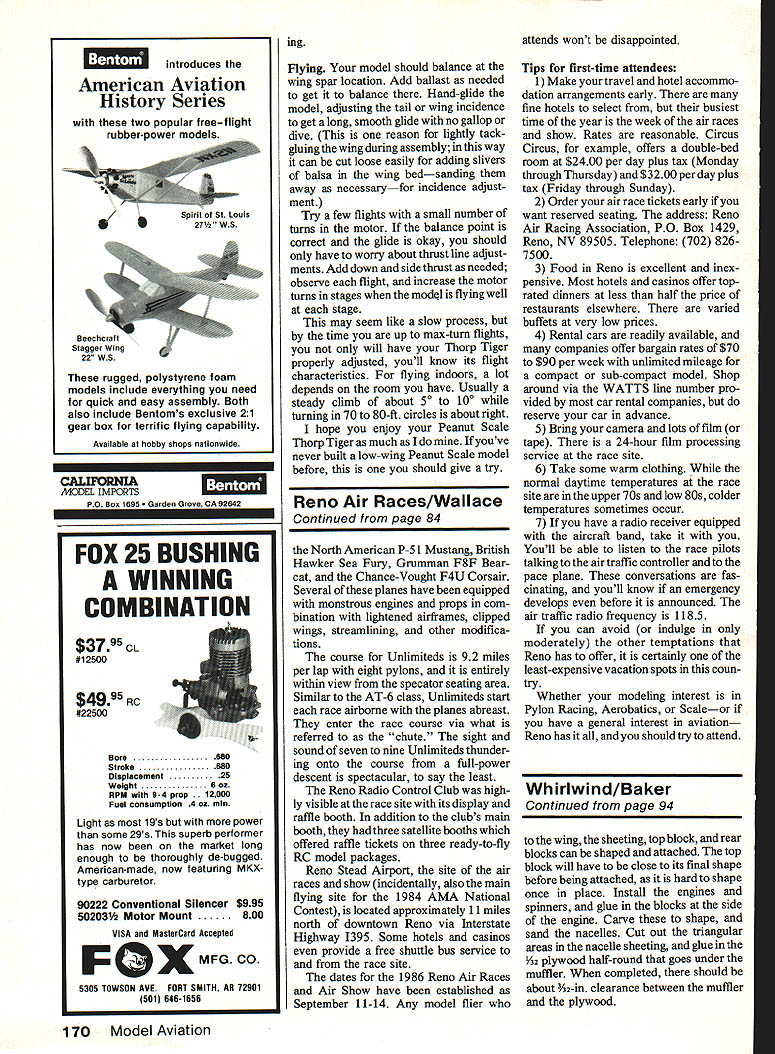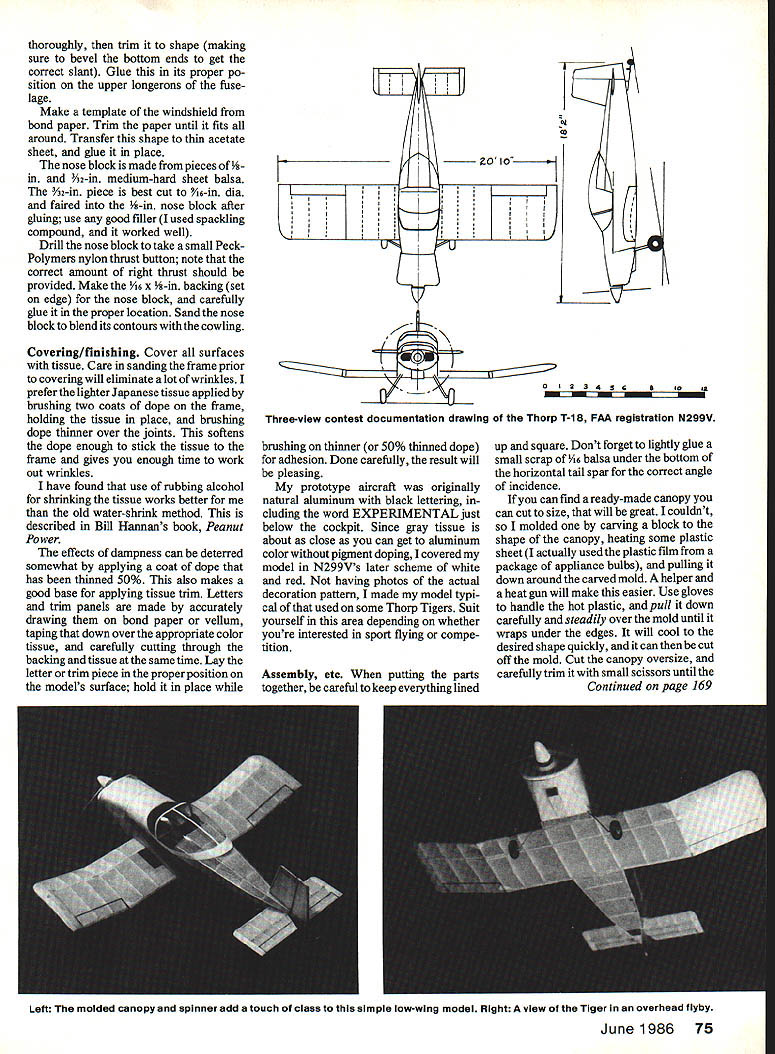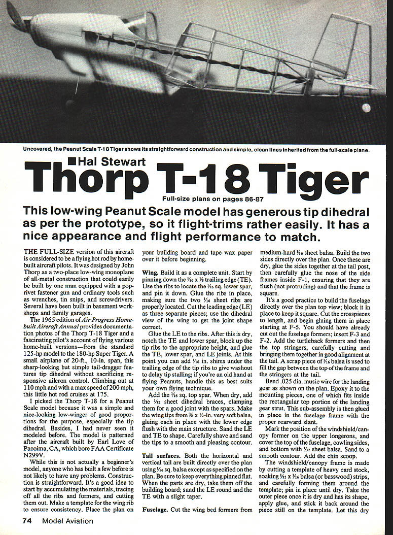 Uncovered Peanut Scale T-1 B Tiger shows its straightforward construction simple clean lines inherited full-scale plane EHal Stewart Thorp T-1 8 Tiger Full-size plans pages 86-87 low-wing Peanut Scale model has generous tip dihedral per prototype flight-trims rather easily has nice appearance flight performance match THE FULL-SIZE version aircraft considered flying hot rod homebuilt aircraft pilots designed John Thorp two-place low-wing monoplane all-metal construction could easily built man equipped poprivet fastener gun ordinary tools such wrenches tin snips screwdrivers Several have built basement work shops family garages 1965 edition ofAir Progress Home builtAircrqftAnnual provides documenta tion photos Thorp T- 18 Tiger fascinating pilots account flying various home-built versionsfrom standard 125-hp model 180-hp Super Tiger small airplane 20-ft 10-in span sharp-looking simple tail-dragger fea tures tip dihedral sacrificing re sponsive aileron control Climbing out 110mph amax speed 200 mph little hot rod cruises 175 picked Thorp T-1 8 Peanut Scale model because simple nice-looking low-winger good propor tions purpose especially tip dihedral Besides never seen modeled before model patterned after aircraft built Earl Love Pacoima CA bore FAA Certificate N299V actually beginners model anyone has built few before likely have problems Construc tion straightforward Its good idea start accumulating materials tracing off ribs formers cutting out Make template wing rib ensure consistency Place plan building board tape wax paper over before beginning Wing Build complete unit Start pinning down 1/16 x ling edge TE Use ribs locate A6 sq lower spar pin down Glue ribs place making sure two 1/16 sheet ribs properly located Cut leading edge LE three separate pieces use dihedral view wing get joint shape correct Glue LE ribs After dry notch TE lower spar block up tip ribs appropriate height glue TE lower spar LE joints point can add /16 shims under trailing edge tip ribs give washout delay tip stalling youre old hand flying Peanuts handle best suits own flying technique Add /16 sq top spar dry add /32 sheet dihedral braces clamping good joint spars Make wing tips 2-in very soft balsa gluing place lower edge flush main structure Sand LE TE shape Carefully shave sand tips smooth pleasing contour Tail surfaces Both horizontal vertical tail built directly over plan using A6 sq balsa except specified plan sure keep everything pinned flat parts dry take off building board sand LE round TE slight taper Fuselage Cut wing bed formers medium-hard A6 sheet balsa Build two sides directly over plan Once dry glue sides together tail post carefully glue nose side frames inside F-i ensuring flush protruding frame square Its good practice build fuselage directly over plan top view block place keep square Cut crosspieces length begin gluing place starting F-S should have already cut out fuselage formers insert F-3 F-2 Add turtleback formers top stringers carefully cutting bringing together good alignment tail scrap piece A6 balsa used fill gap between top frame stringers tail Bend 025 dia music wire landing gear shown plan Epoxy mounting pieces fits inside rectangular top portion landing gear strut sub-assembly glued place fuselage frame proper rearward slant Mark position windshield/can opy former upper longerons cover top fuselage cowling sides bottom sheet balsa Sand smooth contour Add chin scoop windshield/canopy frame made cutting template heavy card stock soaking x /16 balsa basswood strips carefully forming around template pin place until dry Take outer piece once dry has its shape apply glue stick back around piece still template Let dry 74 Model Aviation thoroughly trim shape making sure bevel bottom ends get correct slant Glue its proper po sition upper longerons fuse lage Make template windshield bond paper Trim paper until fits around Transfer shape thin acetate sheet glue place nose block made pieces Ys 3A2-in medium-hard sheet balsa Y32-in piece best cut %6-in dia faked -in nose block after gluing use good filler used spackling compound worked well Drill nose block take small PeckPolymers nylon thrust button note correct amount right thrust should provided Make /16 x -in backing set edge nose block carefully glue proper location Sand nose block blend its contours cowling Covering/finishing Cover surfaces tissue Care sanding frame prior covering will eliminate lot wrinkles prefer lighter Japanese tissue applied brushing two coats dope frame holding tissue place brushing dope thinner over joints softens dope enough stick tissue frame gives enough time work out wrinkles have found use rubbing alcohol shrinldng tissue works better old water-shrink method described Bill Hannans book Peanut Power effects dampness can deterred somewhat applying coat dope has thinned 50% also makes good base applying tissue trim Letters trim panels made accurately drawing bond paper vellum taping down over appropriate color tissue carefully cutting through backing tissue same time Lay letter trim piece proper position models surface hold place K N 10 II IIII IFII II II U \ 1~ 0 ala S4 56BGo Three-view contest documentation drawing Thorp T-18 FAA registration N299V brushing thinner 50% thinned dope adhesion Done carefully result will pleasing prototype aircraft originally natural aluminum black lettering cluding word EXPERIMENTAL just below cockpit Since gray tissue about close can get aluminum color pigment doping covered model N299Vs later scheme white red having photos actual decoration pattern made model typi cal used some Thorn Tigers Suit yourself area depending whether youre interested sport flying compe tition Assembly etc putting parts together careful keep everything lined up square Dont forget lightly glue small scrap A6 balsa under bottom horizontal tail spar correct angle incidence can find ready-made canopy can cut size will great couldnt molded carving block shape canopy heating some plastic sheet actually used p