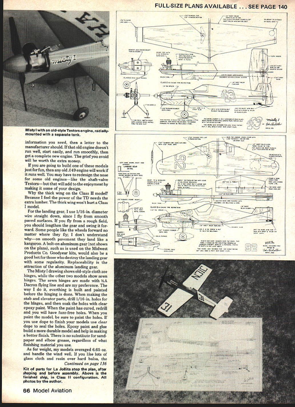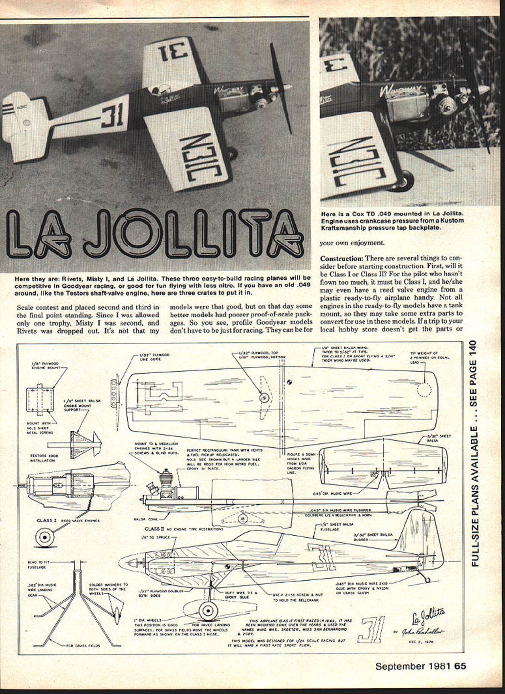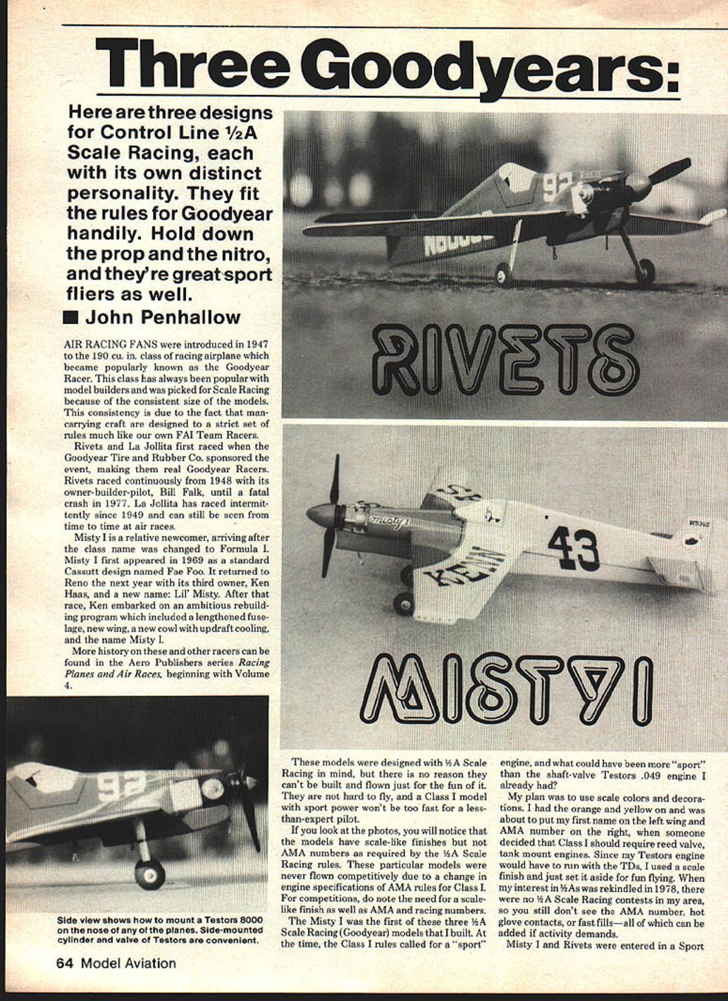 Three Goodyears three designs Control Line 1/2A Scale Racing its own distinct personality fit rules Goodyear handily Hold down prop nitro theyre greatsport fliers well U John Penhallow AIR RACING FANS introduced 1947 190 Cu fl class racing airplane became popularly known Goodyear Racer class has always popular model builders picked Scale Racing because consistent size models consistency due fact mancarrying craft designed strict set rules much like own FAI Team Racers Rivets La Jollita first raced Goodyear Tire Rubber Co sponsored event making real Goodyear Racers Rivets raced continuously 1948 its owner-builder-pilot Bill Falk until fatal crash 1977 La Jollita has raced intermit tently since 1949 can still seen time time air races Misty relative newcomer arriving after class name changed Formula L Misty first appeared 1969 standard Cassutt design named Fae Foo returned Reno next year its third owner Ken Haas new name Lil Misty After race Ken embarked ambitious rebuild ing program included lengthened fuse lage new wing new cowl updraft cooling name Misty history other racers can found Aero Publishers series Racing Planes Air Races beginning Volume 4 models designed Scale Racing mind no reason cant built flown just fun hard fly Class model sport power wont too fast lessthan-expert pilot look photos will notice models have scale-like finishes AMA numbers required Scale Racing rules particular models never flown competitively due change engine specifications AMA rules Class competitions note need scalelike finish well AMA racing numbers Misty first three hA Scale Racing Goodyear models built time Class rules called sport engine what could have sport shaft-valve Testors 049 engine already plan use scale colors decora tions orange yellow about put first name left wing AMA number right someone decided Class should require reed valve tank mount engines Since Testors engine would have run TDs used scale finish just set aside fun flying interest hAs rekindled 1978 no hA Scale Racing contests area still dont see AMA number hot glove contacts fast fillsall can added activity demands Misty Rivets entered Sport 64 Model Aviation Side view shows flow mount estors WUU nose of planes Side-mounted cylinder valve Testors convenient Scale contest placed second third final point standing Since allowed trophy Misty second Rivets dropped out Its models good day some better models poorer proof-of-scale pack ages So see profile Goodyear models dont have just racing can rA PLvWOOO ENGINE MOUNT I 111111 11111 III SHEET BALSA MOUNT WITH 7 NO2 SHEET / METAL SCREWS IItzN TESTHOS HHHO CLASS NEES HALVE ENGINES SOLDER WASHERS IA SHEET BALSA WING IUR PLYWOOD1714 PSYWOHO BOTTOMFOR CLASH OH SPOOT FLYING 3IO2 PENNIES HR EQUAL 0 0 0 SHREWS & BLISO NUTSA FOEL PICPGP RELOCATEDFIGURE 0 SEWS NO5 SIZE SHOWN RUT U LARGER SIZE HINGES MODE WILL RE HEHO FOR HIGH NITRO FUELFROG IZU_________ EFOOT IN PLACEHOCRON FLOING HUSOUN MUSIC WIRE IS2 PLYWOOD DOUBLER WIRE TIE THIS POSITION IS GOODFOR PAVED LANDING SORFUCES FOR UOHSS FIELDS MOVE THE WHEELSHF FOOWUOD AS SUOWN VS THE CLANS H NOSE TRIG AIRPLANE IS US IT FIRST HACCOIN BAG IT HAS BEEN MODIFIED SOME OVER THE TEARS S USED THE NAMES WINO WAG SHEETER HISS SAN RERRARDINO S ZORP THIN MODEL WAS DESIGNED FOR IIZA SCALE RACING ROT IT WILL HUGE FIRST HATE SPORT FLIER La~ $1oH~N4B4Hf DEC 2 IBYR September 1981 65 tney Rivets Misty La Jollita three easy-to-build racing planes will competitive Goodyear racing good fun flying less nitro have old 049 around like Testors shaft-valve engine three crates put Construction several things con sider before starting construction First will Class Class II pilot hasnt flown too much must Class he/she may have reed valve engine plastic ready-to-fly airplane handy engines ready-to-fly models have tank mount may take some extra parts convert use models trip local hobby store doesnt get parts 1 w CD 0 w w ci w -J C z 1 0 w N -J U information need letter manufacturer should old engine doesnt run well start easily run smoothly get complete new engine grief avoid will worth extra money going build models just fun old 049 engine will work runs well may have redesign nose some old engineslike shaft-valve Testorsbut will add enjoyment making some desigft thick wing Class II model Because feel power TD needs extra lumber thick wing wont hurt Class modeL landing gear use 1/16-in diameter wire straight down since fly smooth paved surfaces fly rough field should lengthen gear swing ward Some people like wheels forward no matter fly dont understand whyon smooth pavement land like kangaroo bolt-on aluminum gear shown plans such used Midwest Products Co Goodyear kits would also good bet destroy landing gear some regularity Replaceability attraction aluminum landing gear Misty drawing shows old-style cloth zee hinges other two models show sewn hinges sewn hinges made Dacron flying line preference way everthing built painted before hinging done making stab elevator parts drill 1/16-in holes hinges soak holes clear epoxy paint paint has cured redrill will have fuzz-free holes paint model sure paint holes use dope finish models use clear dope seal holes Epoxy paint glue build durable model help making better finish no substitute sand paper elbow grease regardless what finishing material use As weight models averaged 665 oz handle wind welL like lots glass cloth resin over hard balsa Continued page 136 Kit parts La Jollita atop plan after shaping before assembly Above finished ship Class II configuration photos author FULL-SIZE PLANS AVAILABLE. SEE PAGE 140 0 I0__ Misty old-style Testors engine raulally mounted separate tank add another 10% Keep mind thrust power outputs glow engines parallel typical reciprocating fullscale aircraft engines because glow engines develop power high rpm whereas larger gas engines generate horsepower through lower rpm higher torque Thrust propor tional torque reason use speed reducers larger gas engines some Giant Scale modelseven though normal power o