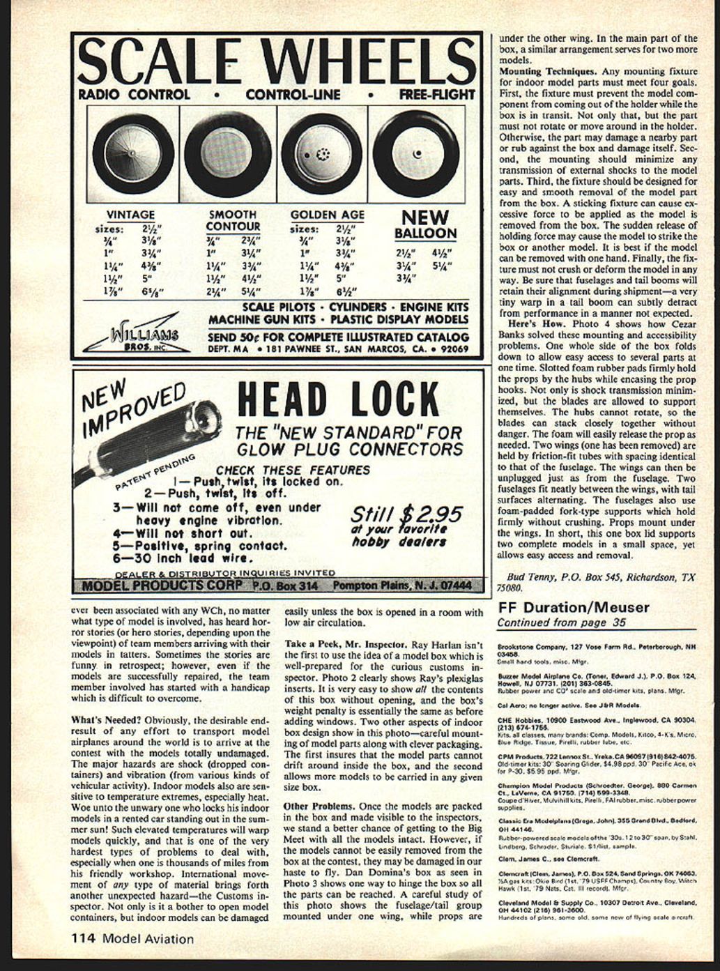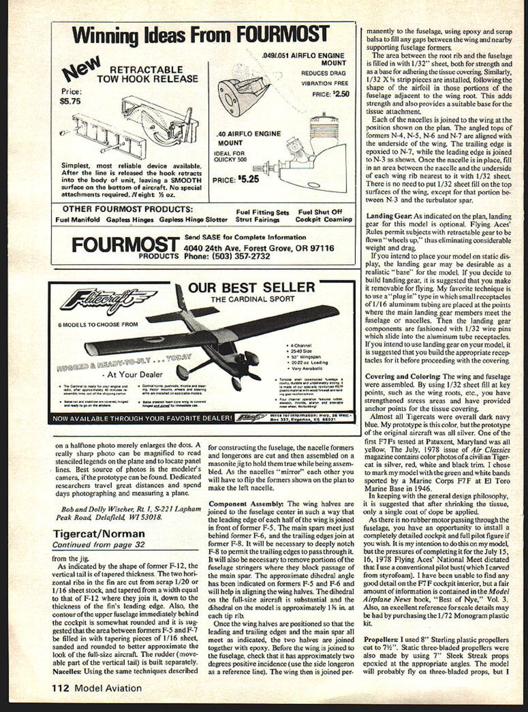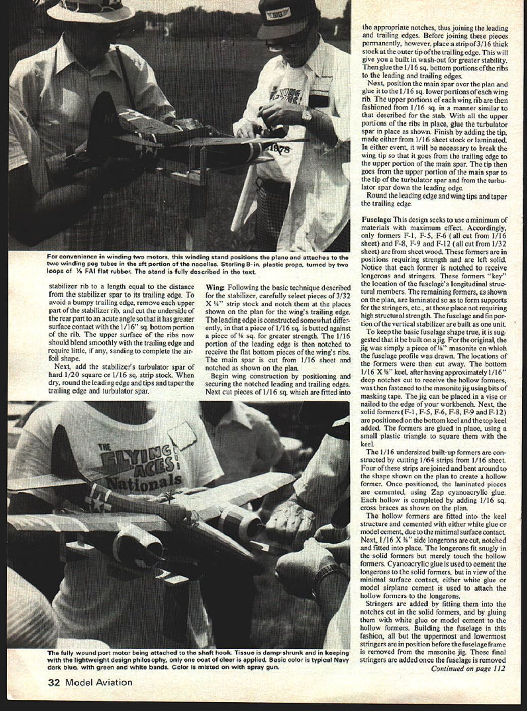 rflOsOs sy Muss OrOWS ana t flu autfior ALTHOUGH too late see WW II combat Tigercat has called hottest powerfiul twin-engine fighter its day Its angular wing full-bodied nacelles radial engines clearly show corpulence usually associated other cats Grummans WW II family surprise Tigercats de sign its extremely narrow very graceful fuselage virtually built around pilots dimen sions giving slim almost sailplane-like look nacelles proportionally longer widely spaced twin-engine subjects course particular signifi cance selecting rubber-power scale subject since nacelle length propeller size both important items consideration Construction The first consideration design ing Tigercat lightly constructed possible sacrificing strength scale appearance selection light-weight wood major importance wood used dh possible launch twin-engined model holding prop tossing ship two hands simultaneously Dennis prefers cradlesee text retains props cradle being held hand ship other Cradle pulled free ship launched conventional manner Insert Detachable gear static purposes construction prototype model purchased Micro-X- Products P 0 Box 1063 Lorain OH 44055 numerous other sources fine quality materials cannot select wood yourself sure instruct person making selection use care selecting straight grain light wood Much Tigercat built strip stock relatively short length already have recommend make purchase balsa stripper An excellent balsa stripper may purchased approximately $1000 Jim Jones 36631 Ledgestone Mt Clemens MI 43043 Straight-grained wood strips best re-emphasizes need careful wood selection model designed eye maximum efficiency minimum ofmaterials wing stabilizer instance built up strip stock using what has called cracked rib California rib construction Basically technique involves use con ventional leading trailing edges together notched main spar strip stock attached bottom flying surface flat top formed taking strip stock top main spar leading trailing edges respectively airfoil completed adding turbulator spar tapered strip stock half way between main spar leading edge wing should built wash-out tip leading edge flat plan outboard tip trailing edge propped up approximately 3/16 gradually creases makings stabilizing warp half wing have built several wings type have performed welL Being essentially 30 Model Aviation 00500 SO WET YTNWLCN OR RENA BOTTOM ONLYI I,ROOCO NS0WT a340050 \ I FlRRrCw il[F1 SPAR _ [ JI- ____ TAFRILLOFAR 5000040 LIRONEET RAIN SPASNEON \JLlI~ I1-N\IILOOOERONI[IILZOro. USA SOSTUFWCEOTON NASA II ISO II 5 CE El NOYDSO LONINATEN TO IIB NO 400000 NODROSY rAIN STRAWS vOrOI RUUENThO AO%OOPS WINOI4INRILOROERNNSNARED YAW ANON EUOON orosNO MOE SW Fr7 FSF PENOFror SOONER ONROON OLEFY WOE 05000AINSTOLNONY- -I-- AEVEI PANEL ORE IAN NOCET1-lS0IS INNS OSEET-.I-roN STOASPAR I3z Zr INN STAN SLERORT0 CEN FIE =E= --3~ P-SP-FZSSCALE OCYLAW 705 OS LOEESEOOSF SCALA ROd ONNASONE FOR FENTON NACELLE LAOA S S 57 SCASE NErO 0% AIRCRAFT RON MOO JANE ROEFEET ROEC BEST OF WEE 0048 1505 NAN 051041573- --- V2 SCALE LOAIOSO NASA FSOAE 005040 REN OION OIEN WOES SOWONiMJ OVER DANK kAlE WIThCrunuin F7F TigerCat TWIN RUBBER POWERED AENIOSED AND DROWN BY DENNIS C NOENON PEN NY lETS collection flat surfaces wing constructed fashion particularly suited aircraft wood metal skin tissue covering allowed stretch flat eliminating peaks valleys associated covering wing built using conventional ribs technique also uses minimum material result light fuselage nacelles also designed use materials sparingly Only formers located anticipated positions stress made sheet balsa other formers laminated thinly cut strip stock Stabilizer Tradition dictates building new model start its less complicated components give builder feeling construction technique involved mind select cut length tockfairly hard stabilizers leading edge Position over plan mark rib locations notch leading edge receive 1/16 sq strip will serve stabilizers ribs Similarly stabilizers spar cut straightgrain stock 1/16 1/20 thickness trailing edge 1/16 x stab spar trailing edge notched receive 1 / 16 sq stabilizer ribs Place notched trailing leading edges directly over plan securing build ing surface straight pins tips may either laminated 1/16 X 1/64 may cut light 1/16 sheet Add 1/16 stabilizer rib bottoms Next add stabilizer spar using 1/16 square stock construct upper portions stab ribs As leading edge k upper portions stabilizers ribs may simply fitted remaining IIIIII IIII April 1980 31 Co N w 0 w w C, w -J Sel -J C, z 0 w N ci -J -J UMaximum iency obtained minimum use materials ewing employs cracea rio California rib construction Wing cross section basically two triangles base base turbulator spar top between main spar leading edge may drive airfoil purists up wall such sections have used complete success radio combat well portions notches cut stabilizers ribs cut broken stabilizer spar leading edge Similarly upper parts theso can joined trailing edge As stabilizers ribs may fit notches thethe trailing edge 1/16 thick will find sparit necessary first cut upper part stabilizer rib length equal distance stabilizer spar its trailing edge avoid bumpy trailing edge remove upper part stabilizer rib cut underside rear part acute angle has greater surface contact 1/16 sq bottom portion rib upper surface ribs now should blend smoothly trailing edge require little sanding complete air foil shape Next add stabilizers turbulator spar hard 1/20 square 1/16 sq strip stock dry round leading edge tips taper trailing edge turbulator spar Win owing basic technique described stabilizer carefully select pieces 3/32 X p stock notch places shown plan wings trailing edge leading edge constructed somewhat differ ently piece 1 / 16 sq butted against piece reater strength 1/16 portion leading edge notched receive flat bottom pieces wings ribs main spar cut 1/16 sheet notched shown plan Begin wing construction positioning securing notched leading trailing edges Next cut pieces 1/16 sq fitted