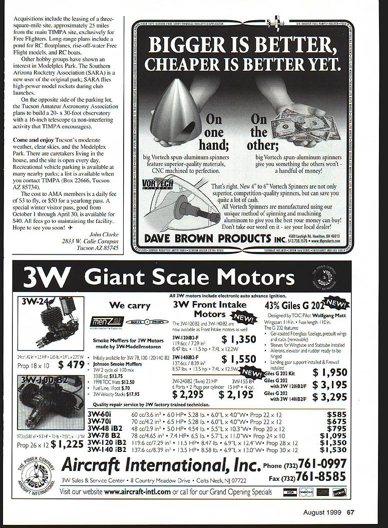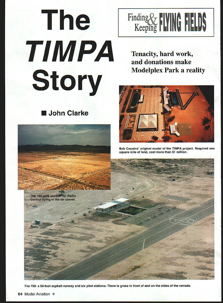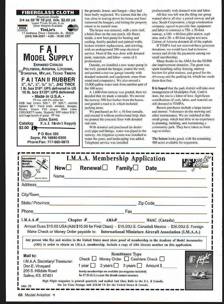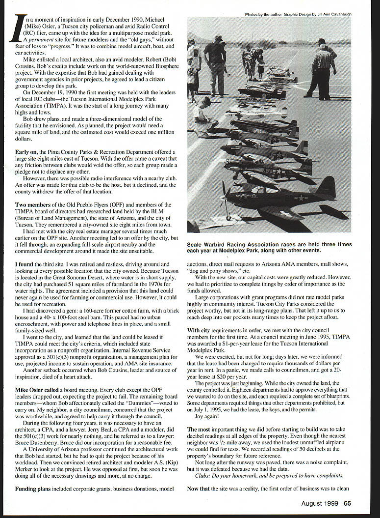 The TIM PA Story U John Clarke Tenacity hard work donations make Modelpiex Park reality 64 Model Aviation in Keel PlYING PIEhDS Bob Cousins original model TIMPA project Required square mile land cost $1 million 750- x 50-foot asphalt runway six pilot stations grass front sides ramada moment inspiration early December 1990 Michael Mike Osier Tucson city policeman avid Radio Control RC flier came up idea multipurpose model park ____ permanent site future modelers old guys fear loss progress combine model aircraft boat car activities Mike enlisted local architect also avid modeler Robert Bob Cousins Bobs credits include work world-renowned Biosphere project expertise Bob gained dealing government agencies prior projects agreed lead citizen group develop park December 19 1990 first meeting held leaders local RC clubsthe Tucson International Modelplex Park Association TIMPA start long journey highs lows Bob drew plans made three-dimensional model facility envisioned As planned project would need square mile land estimated cost would exceed million dollars Early Pima County Parks & Recreation Department offered large site eight miles east Tucson offer came caveat friction between clubs would void offer group made pledge displace other However possible radio interference nearby club An offer made club host declined county withdrew offer location Two members Old Pueblo Flyers OPF members TIMPA hoard directors researched land held BLM Bureau Land Management state Arizona city Tucson remembered city-owned site eight miles town met city real estate manager several times much earlier OPF site Another meeting led offer city fell through expanding full-scale airport nearby commercial development around made site unsuitable found third site retired restless driving around looking possible location city owned Because Tucson located Great Sonoran Desert water short supply city purchased 51 square miles farmland 1970s water rights agreement included provision land could never again used farming commercial use However could used recreation discovered gem 160-acre former cotton farm brick house 40- x 100-foot steel barn parcel no urban encroachment power telephone lines place small family-sized well went city learned land could leased TIMPA could meet citys criteria included state incorporation nonprofit organization Internal Revenue Service approval 501c3 nonprofit organization management plan use projected income sustain operation AMA site insurance Another setback occurred Bob Cousins leader source inspiration died heart attack Mike Osier called board meeting club except OPF leaders dropped out expecting project fail remaining board memberswhom Bob affectionately called Dummiesvoted carry neighbor city councilman concurred project worthwhile agreed help carry through council During following four years necessary have architect CPA lawyer Jerry Beal CPA modeler did 501 c3j work nearly nothing referred us lawyer Bruce Dusenberry Bruce did incorporation reasonable fee University Arizona professor continued architectural work Bob started quit project because workload convinced retired architect modeler AS Kip Merker look project opposed first soon doing necessary drawings no charge Funding plans included corporate grants business donations model auctions direct mail requests Arizona AMA members mall shows dog pony shows etc new site capital costs greatly reduced However prioritize complete things order importance funds allowed Large corporations grant programs did rate model parks highly community interest Tucson City Parks considered project worthy its long-range plans left up us reach deep pockets times keep project afloat city requirements order met city council members first time council meeting June 1995 TIMPA awarded $1 -per-year lease Tucson International Modelplex Park excited long days later informed lease changed require thousands dollars per year rent panic made calls councilmen got 20year lease $20 per year project just beginning city owned land county controlled Eighteen departments approve everything wanted site required complete set blueprints Some departments required things other departments prohibited July 1 1995 lease keys permits Joy again important thing did before starting build take decibel readings edges property though nearest neighbor 1/2-mile away used loudest unmuffled airplane could find tests recorded readings 50 decibels propertys boundary future reference long after runway paved noise complaint defeated because data Clubs homework prepared have complaints Now site reality first order business clean August1999 65 Scale Warbird Racing Association races held three times year Modelpiex Park along other events {e-1 W44Es i ium Grade 3/4 oz 38W 10 yrd mm $250 yd Lower Prices 30 yds & up Other Weights Available VISA TinLins 17 Andrews Drive- Daleville AL 36322 334 598-2287 400 1000 OST grounds house hangarthey badly neglected learned city close tearing down house barn renamed hangar letting property return its natural state house restored new roof brick floor rear porch tile floors inside new heat pump heating cooling freshly patched painted walls broken window replacement rewiring underground 200-amp electrical service Most done donated paint materials laborsome professional Outside installed new water pump well painted hangar coated roof painted one-car garage mostly donated materials equipment some rental tool companies also moved 10000-gallon water tank another part 160 acres 1600-foot runway graded decided made mistake moved runway 500 feet further house graded road included parking areas purchased 84- x 16-foot ramada erected professional help poured concrete floor donated redi-mix donated purchased dealer cost pipe fittings water piped runway An irrigation system installed water grass landscaping added Telephone service installed professionally donated wire labor left thing group wanted above else paved runway pit area Sundt Corporation large construction company agreed provid