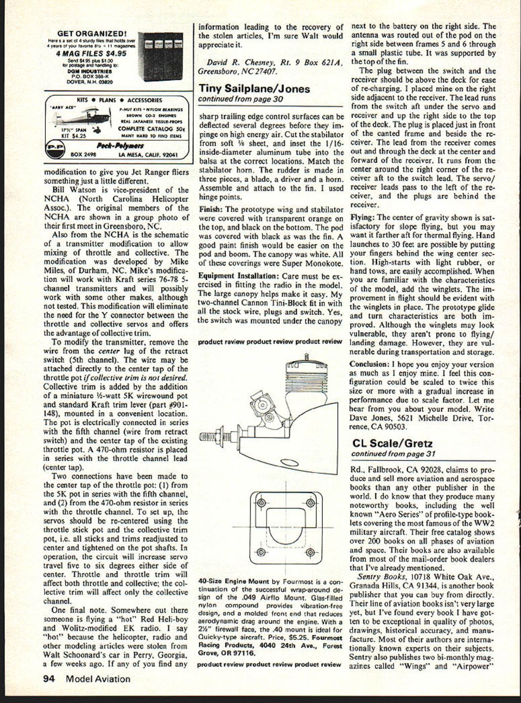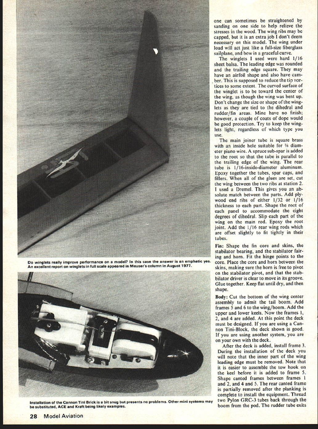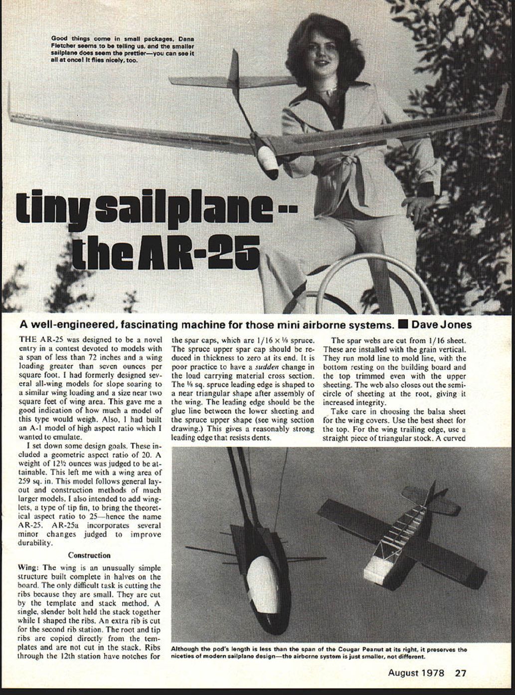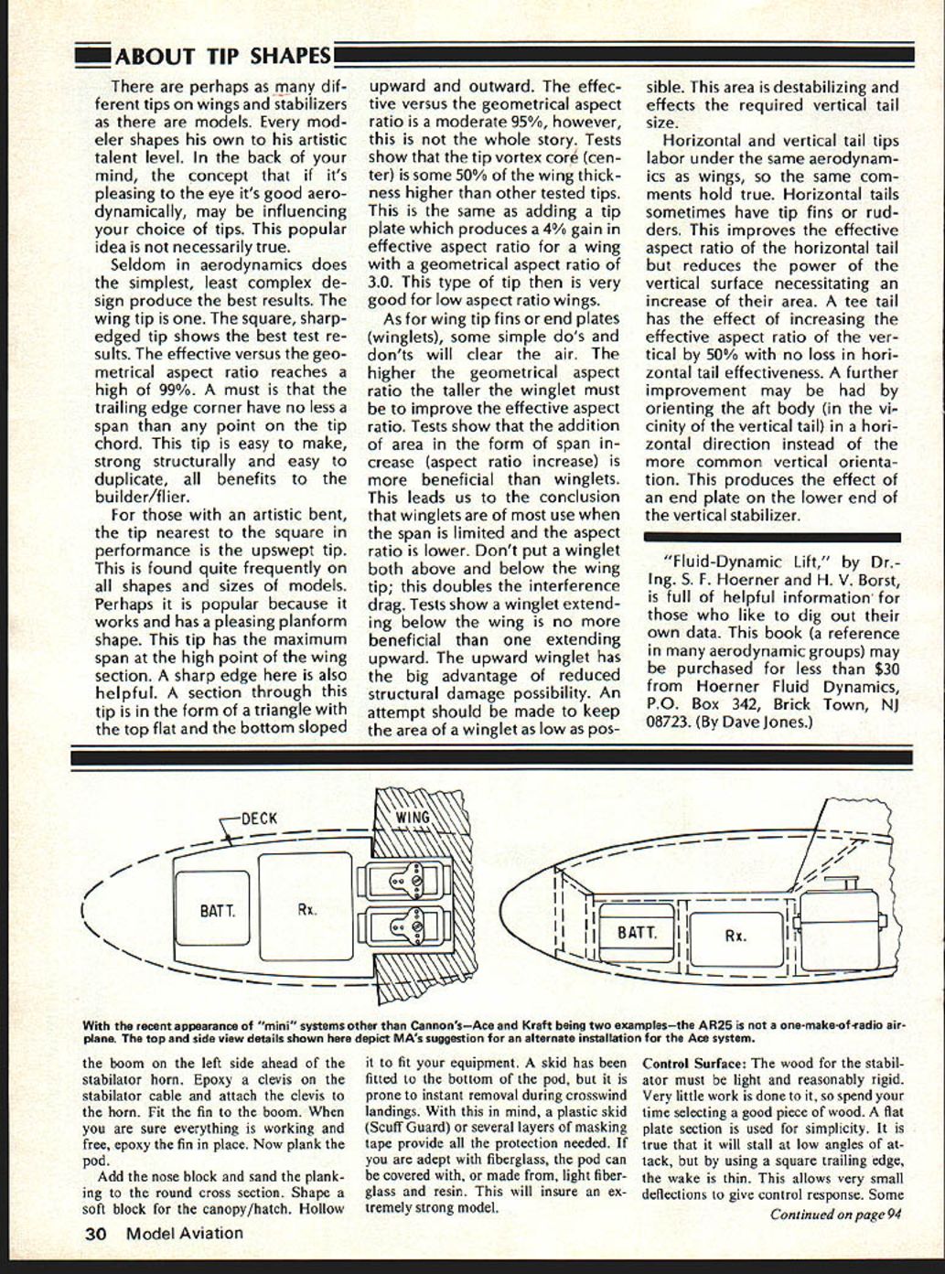 A well-engineered fascinating machine mini airborne systems U Dave Jones THE AR-25 designed novel entry contest devoted models span less 72 inches wing loading greater seven ounces per square foot formerly designed sev eral all-wing models slope soaring similar wing loading size near two square feet wing area gave good indication much model type would weigh Also built A-l model high aspect ratio wanted emulate set down some design goals cluded geometric aspect ratio 20 weight 12/2 ounces judged tainable left wing area 259 sq model follows general lay out construction methods much larger models also intended add winglets type tip fin bring theoret ical aspect ratio 25hence name AR-25 AR-25a incorporates several minor changes judged improve durability Construction Wing The wing unusually simple structure built complete halves board difficult task cutting ribs because small cut template stack method single slender bolt held stack together shaped ribs An extra rib cut second rib station root tip ribs copied directly tem plates cut stack Ribs through 12th station have notches spar caps 1/16 x 1/8 spruce spruce upper spar cap should re duced thickness zero its end poor practice have sudden change load carrying material cross section /8 sq spruce leading edge shaped near triangular shape after assembly wing leading edge should glue line between lower sheeting spruce upper shape see wing section drawing gives reasonably strong leading edge resists dents spar webs cut 1/16 sheet installed grain vertical run mold line mold line bottom resting building board top trimmed upper sheeting web also closes out semi circle sheeting root giving increased integrity Take care choosing balsa sheet wing covers Use best sheet top wing trailing edge use straight piece triangular stock curved August1978 27 Although pods length less span Cougar Peanut its right preserves niceties modern sailplane designthe airborne system just smaller different can sometimes straightened sanding side help relieve stresses wood wing ribs may capped extra job dont deem necessary model wing under load will act just like full-size fiberglass sailplane bow graceful curve winglets used hard 1/16 sheet balsa leading edge rounded trailing edge square may have airfoil shape also have cam ber supposed reduce tip vor tices some extent curved surface winglet toward center wing though wing bent up Dont change size shape winglets tied dihedral rudder/fin areas Mine have no finish however couple coats dope would good protection Try keep winglets light regardless type use main joiner tube square brass inside hole suitable /s diam eter piano wire spruce sub-spar added root tube parallel trailing edge wing rear tube 1/16-inside-diameter aluminum Epoxy together tubes spar caps fillers glues set cut wing between two ribs station 2 used Dremel gives ab solute match between parts Add ply wood end ribs either 1/32 1/16 thickness part Shape root panel accommodate eight degrees dihedral Slip part wing main rod Epoxy root joint Add 1/16 rear wing rods offset slightly fit tightly tubes Fin Shape fin core skins stabilator bearing stabilator fair ing horn Fit hinge points core Place core horn between skins making sure horn free pivot stabilator pivot stab bilator driver clear move its groove Glue together Keep flat until dry shape Body Cut bottom wing center assembly admit tail boom Add frames 5 6 wing/boom Add upper lower keels Now frames 2 4 added point deck must designed using Can non Tini-Block deck shown good using another system own deck After deck added install frame 3 During installation deck will note inner part wing leading edge must removed Note easier assemble tow hook keel before added frame 5 Shape canted frames between frames 2 4 5 rear canted frame partially removed after planking complete install equipment Thread two Pylon GRC-3 tubes back through boom pod rudder tube exits 28 Model Aviation winglets really improve performance model case answer emphatic yes An excellent report winglets full scale appeared Meusers column August 1977 Installation Cannon Tini Brick bit snug presents no problems Other mini systems may substituted ACE Kraft being likely examples 0 Il iF 0-DIAMETER REQ REQUIRED SQ SQUARE KIN7/BHIBR Ae vERTICAL UAN DECK-PLYWINGII/IGiH-GRAIN----- SPACING TYPSPRUCE4 1-5A6-JLIA6D 3PLS uUPPERU}9I6R -iI5/32R.j6fIAID CANNON TINHBLO K/80/ -l/l /32R5 5I-- 2-GR LOWER-P 1/6STABILATOR TRIBESiWYIA6 IFRAME 4-PLY 6Q-j FRAME 6ALUM 2 REQ WING ROD-SPRING STEEL1-3/4 2 7/8H 2 REQ2PL-A6 GRAN//~WING TUBE RED BRASS 2INSIDEUPPERI362R-4 VeALUM 2REO- WING TUBE- SQT EPOXY TO STRUCTORE 2-3/4EPOXY TO STABILATOR HORN CTURE I/B PLY525/32 2 EA REQt~/I67/B 1/25132RIII S/32R 2PLSSTABILATOR FAIRING 16-IA6D1 3j4I/BFRAME 5-PLYGP/1 L ~ILP r-I/4 -~A6R I/61tV16RLL \ 3/~I4 6__T1-3/4 KEELPLYLOWER UPPE6/32L~TO Iii-lI - --V4jIA STABILATOP BEARINGI/S 7/6R W HOOK-/6 PLY2 REQ NOSE PNESPRING STEEL116GRAIN4 VBFRAME 3-PLYORAN--FULL RADIUS3/32STABILATQR PIVOT LOWER DDER-I/4 SPRINU STEEL 6371 I--*6EPOXY TO HORN 58-17/16 AT5/16I7/B4~2AWZ803/32RI RB BLANK 50 REQRUDDER HORN-PLYI VB2/T 1/4HINGE POINT 2 PLSSTABILATOR SPRING IDRIVERI9 3/B RUDDERSTEELSPAN725o WING8 7/6 UT OUT AFTER ASSY SKID-EPOXY ONCOVER WITH MONOKOTE EP%XY PUSH RODS PYLON GRC-32-7/d PLYI/eR FRAME KEEL 80DM NOSE AND TOW HOOK ASSEMBLY CARVE WING LOWER Cr Co CPLANK WITH I/BI/4 -4 CD FULL-SIZE PLANS AVAILABLE.. SEE PAGE 104 36 __ABOUT TIP SHA perhaps dif ferent tips wings stabilizers models mod eler shapes own artistic talent level back mind concept its pleasing eye its good aero dynamically may influencing choice tips popular idea necessarily true Seldom aerodynamics does simplest least complex de sign produce best results wing tip square sharpedged tip shows best test re sults effective versus geo metrical aspect ratio reaches high 990/0 must trailing edge corner have no less span point tip chord tip easy make strong structurally easy duplicate benefits builder/flier artistic bent tip nearest square performance upswept tip