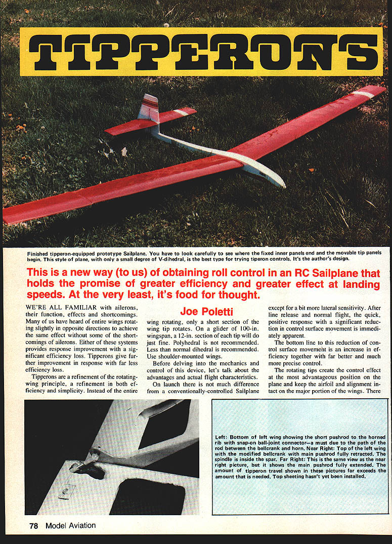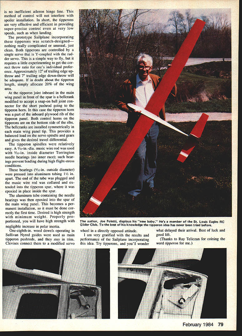 Finished tipperon-equipped prototype Sailplane have look carefully see fixed inner panels end movable tip panels begin style plane small degree V-dihedral best type trying tiperon controls Its authors design new way us obtaining roll control RC Sailplane holds promise greater efficiency greater effect landing speeds very least its food thought WERE ALL FAMILIAR ailerons function effects shortcomings us have heard entire wings rotat ing slightly opposite directions achieve same effect some short comings ailerons Either systems provides response improvement sig nificant efficiency loss Tipperons give fur ther improvement response far less efficiency loss Tipperons refinement rotatingwing principle refinement both ef ficiency simplicity Instead entire Joe Poletti wing rotating short section wing tip rotates glider 100-in wingspan 12-in section tip will just fine Polyhedral recommended Less normal dihedral recommended Use shoulder-mounted wings Before delving mechanics control device lets talk about advantages actual flight characteristics launch much difference conventionally-controlled Sailplane except bit lateral sensitivity After line release normal flight quick positive response significant reduc tion control surface movement immedi ately apparent bottom line reduction con trol surface movement increase ef ficiency together far better much precise control rotating tips create control effect advantageous position plane keep airfoil alignment tact major portion wings 78 Model Aviation Left Bottom left wing showing short pushrod horned rib snap-on ball-joint connectora must due path rod between bellcrank horn Near Right Top left wing modified bellcrank main pushrod fully retracted spindle inside spar Far Right same view near right picture shows main pushrod fully extended amount tipperon travel shown pictures far exceeds amount needed Top sheeting hasnt yet installed no inefficient aileron hinge line method control will interfere spoiler installation short tipperons very effective efficient providing super-precise control very low speeds such landing prototype Sailplane incorporating tipperons scratch-designednothing really complicated unusual just clean Both tipperons controlled single servo Y-coupled rud der servo simple way fly requires little experimenting get cor rect throw ratio ones individual prefer ence Approximately 120 trailing edge upthrow 70 trailing edge down-throw will adequate doubt about tipperon length simply allocate 20% wing area tipperon joint inboard main wing panel front spar bellcrank modified accept snap-on ball joint con nector short pushrod going tipperon horn case tipperon horn part inboard plywood rib tipperon panel Both control horns tipperons bottom side ribs bellcranks installed symmetrically main wing panel tip provides balanced load servo spindle gears gives desired travel differential tipperon spindles relatively easy 5A2-in-dia music wire rod used 5A2-in inside diameter Torrington needle bearings no inner race such bear ings prevent binding during high flight-stress conditions bearings %2-in outside diameter pressed aluminum tubing 1 apart end tube plugged music wire rod collared ex tended tipperon spar epoxied place inside spar aluminum tube containing needle bearings epoxied spar main wing panel becomes per manent installation must done cor rectly first time Desired high strength minimum weight Properly pro portioned will have high strength negligible increase polar inertia One-eighth-in wood dowels operating Sullivan Nyrod guides used main tipperon pushrods stay trim Clevises connect modified servo wheel directly opposed attitude am very gratified results performance Sailplane incorporating idea Try tipperons youll wonder February 1984 79 author Joe PoIetti displays new baby Hes member St Louis Eagles RC Glider Club best knowledge tipperon idea has never tried before what delayed arrival Best luck good lift Thanks Ray Teliczan coining word tipperon me