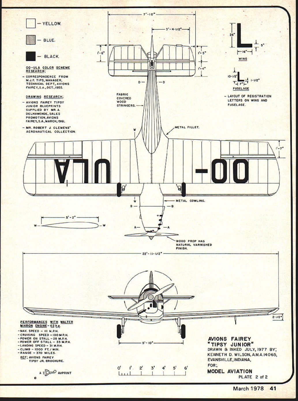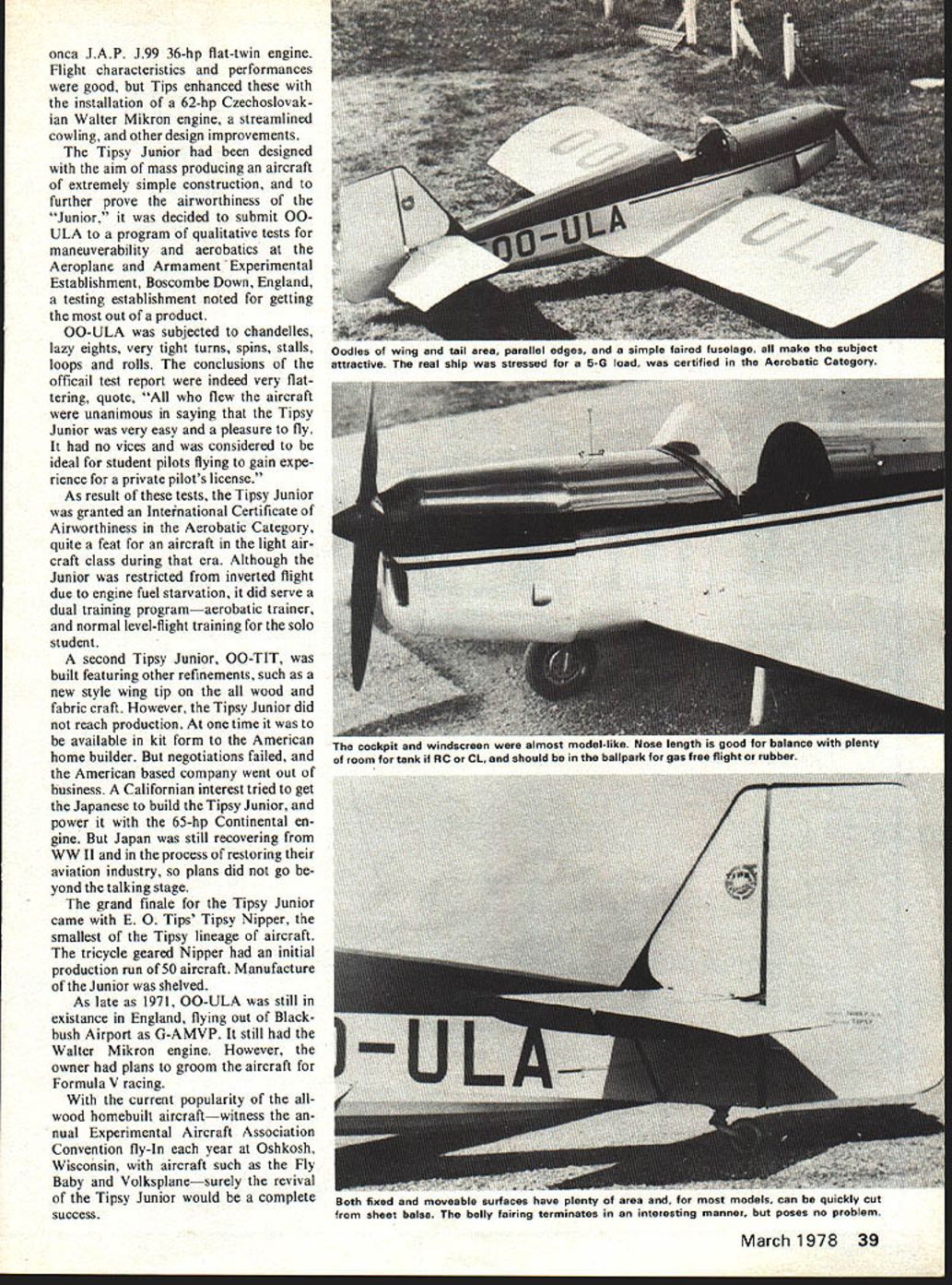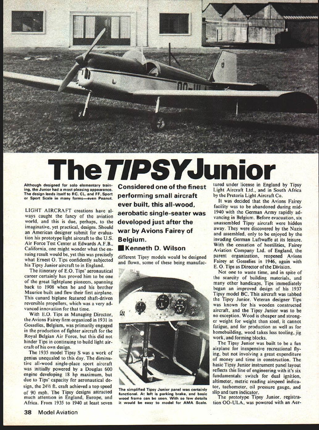 The TIPSYJunIor Although designed solo elementary train ing Junior pleasing appearance design lends itself RC CL FF Sport Sport Scale formseven Peanut LIGHT AIRCRAFT creations have al ways caught fancy aviation world due perhaps imaginative yet practical designs Should American designer submit evalua tion prototype light aircraft US Air Force Test Center Edwards AFB California might wonder what en suing result would yet precisely what Ernest 0 Tips confidently subjected Tipsy Junior aircraft England itinerary E0 Tips aeronautical career certainly has proved him great lightplane pioneers spanning back 1908 brother Maurice built flew first airplane canard biplane featured shaft-driven reversible propellers very ad vanced innovation time EO Tips Managing Director Avions Fairey firm organized 1931 Gosselies Belgium primarily engaged production fighter aircraft Royal Belgian Air Force did hinder Tips continuing build light air craft own design 1935 model Tipsy S work genius unequaled day diminu tive all-wood single-place sport aircraft initially powered Douglas 600 engine developing 18 hp maximum due Tips capacity aeronautical de sign 24/2 ft craft achieved top speed 90 mph Tipsy designs attracted much attention England Europe Africa 1935 1940 least seven Considered finest performing small aircraft ever built all-wood aerobatic single-seater developed just after war Avions Fairey Belgium U Kenneth D Wilson different Tipsy models would designed flown some being manufac tured under license England Tipsy Light Aircraft Ltd South Africa Pretoria Light Aircraft Co decided Avions Fairey facility abandoned during mid1940 German Army rapidly ad vancing Belgium Before evacuation six unassembled Tipsy aircraft hidden away discovered Nazis assembled enjoyed invading German Luftwaffe its leisure cessation hostilities Fairey Aviation Company Ltd England parent organization reopened Avions Fairey Gosselies 1946 again E 0 Tips Director Division waste time spite scarcity building materials other handicaps Tips immediately began improved design 1937 Tipsy model BC aircraft tabbed Tipsy Junior Veteran designer Tips known wooden constructed aircraft Tipsy Junior no exception Wood cheaper strong er weight weight steel cannot fatigue production well homebuilding wood takes less tooling jig work forming blocks Tipsy Junior built fun airplane inexpensive recreational fly ing involving great expenditure money time construction basic Tipsy Junior instrument panel layout reflects line engineering its six fundamentals switch dual ignition altimeter metric reading airspeed indica tor tachometer oil pressure gauge slip turn indicator prototype Tipsy Junior registra tion 00-ULA powered Aer 38 Model Aviation simplified Tipsy Junior panel certainly functional left parking brake basic wood frame can seen few details would easy model AMA Scale onca JAP J99 36-hp flat-twin engine Flight characteristics performances good Tips enhanced installation 62-hp Czechoslovak ian Walter Mikron engine streamlined cowling other design improvements Tipsy Junior designed aim mass producing aircraft extremely simple construction further prove airworthiness Junior decided submit 00ULA program qualitative tests maneuverability aerobatics Aeroplane Armament Experimental Establishment Boscombe Down England testing establishment noted getting out product 00-ULA subjected chandelles lazy eights very tight turns spins stalls loops rolls conclusions officail test report indeed very flat tering quote flew aircraft unanimous saying Tipsy Junior very easy pleasure fly no vices considered ideal student pilots flying gain expe rience private pilots license As result tests Tipsy Junior granted Inteinational Certificate Airworthiness Aerobatic Category quite feat aircraft light air craft class during era Although Junior restricted inverted flight due engine fuel starvation did serve dual training programaerobatic trainer normal level-flight training solo student second Tipsy Junior 00-TIT built featuring other refinements such new style wing tip wood fabric craft However Tipsy Junior did reach production time available kit form American home builder negotiations failed American based company went out business Californian interest tried get Japanese build Tipsy Junior power 65-hp Continental en gine Japan still recovering WW II process restoring aviation industry plans did go yond talking stage grand finale Tipsy Junior came F 0 Tips Tipsy Nipper smallest Tipsy lineage aircraft tricycle geared Nipper initial production run 50 aircraft Manufacture Junior shelved As late 1971 00-ULA still existance England flying out Blackbush Airport G-AMVP still Walter Mikron engine However owner plans groom aircraft Formula V racing current popularity allwood homebuilt aircraftwitness nual Experimental Aircraft Association Convention fly-In year Oshkosh Wisconsin aircraft such Fly Baby Volksplanesurely revival Tipsy Junior would complete success March 1978 39 Oodles wing tail area parallel edges simple faired fuselage make subject attractive real ship stressed 5-G load certified Aerobatic Category cockpit winascreen aimosi moo u enty room tank RC CL should oaiipark gas free flight rubber Both fixed moveable surtaces nave pienxy OT area ann Tar models can quickly cut sheet balsa belly fairing terminates interesting manner poses no problem r AVIONS FAIREYsA DivisioN TIPSY AERODROME GOSSE LIES LETTERING DETAIL WHICH APPEARS ON BOTH SIDES OF RUDDER NO SCALE ELEVATOR AND. ww STABILIZERIS WOODCONSTRUCTED WITH FABRIC COVERING0D FABRIC COVERED WOOD STRINGERS WING IS OF DOUBLE SPAR CONSTRUCTION WOOD RIBS AND FABRIC COVERED EO TIPS TIPSY JUNIOR LOGO WHICH APPEARS ON BOTH SIDES OF FIN NO SCALE METAL FILLETAILERONS ARE WOOD CONSTRUCTED WITH FABRIC COVERING L LEADING EDGE OF WING IS WOOD COVERED TO FRONT SPAR WITH FABRIC OVERLAY B OIL FILL METAL COWLING COOLING AIR OUTLET RIGHT SIDE COWLING METAL FUEL TANK 13 GAL CAPACITY B ABC -A YQ2JbtbY B C r FUEL GAUGE AND TANK FILL C B A__725~ N IA