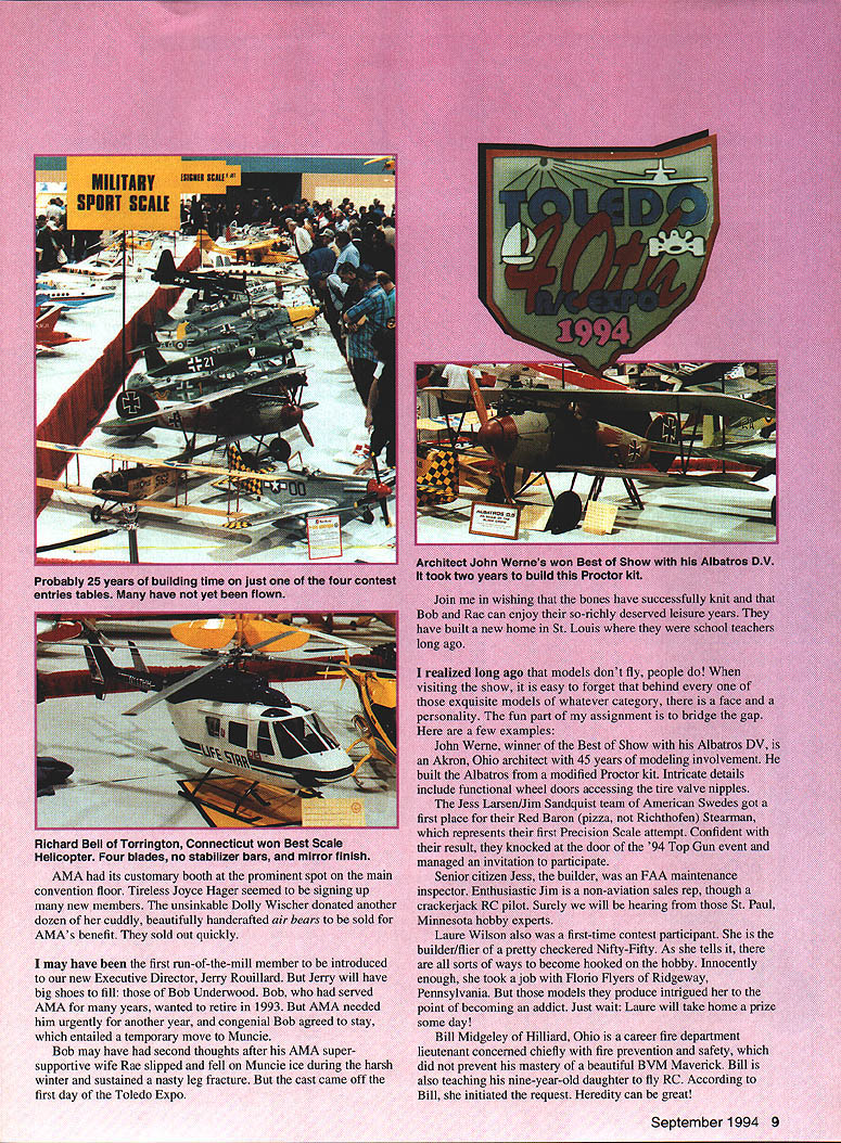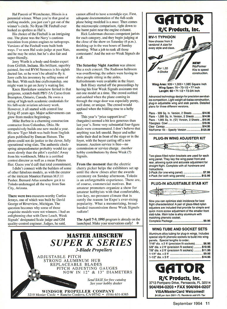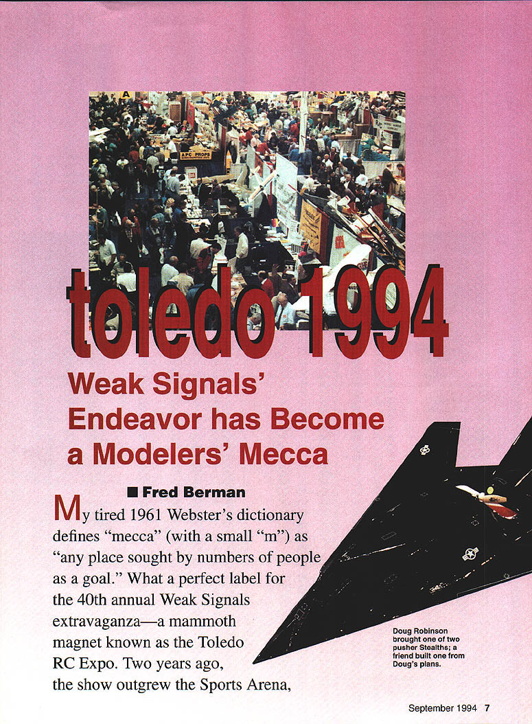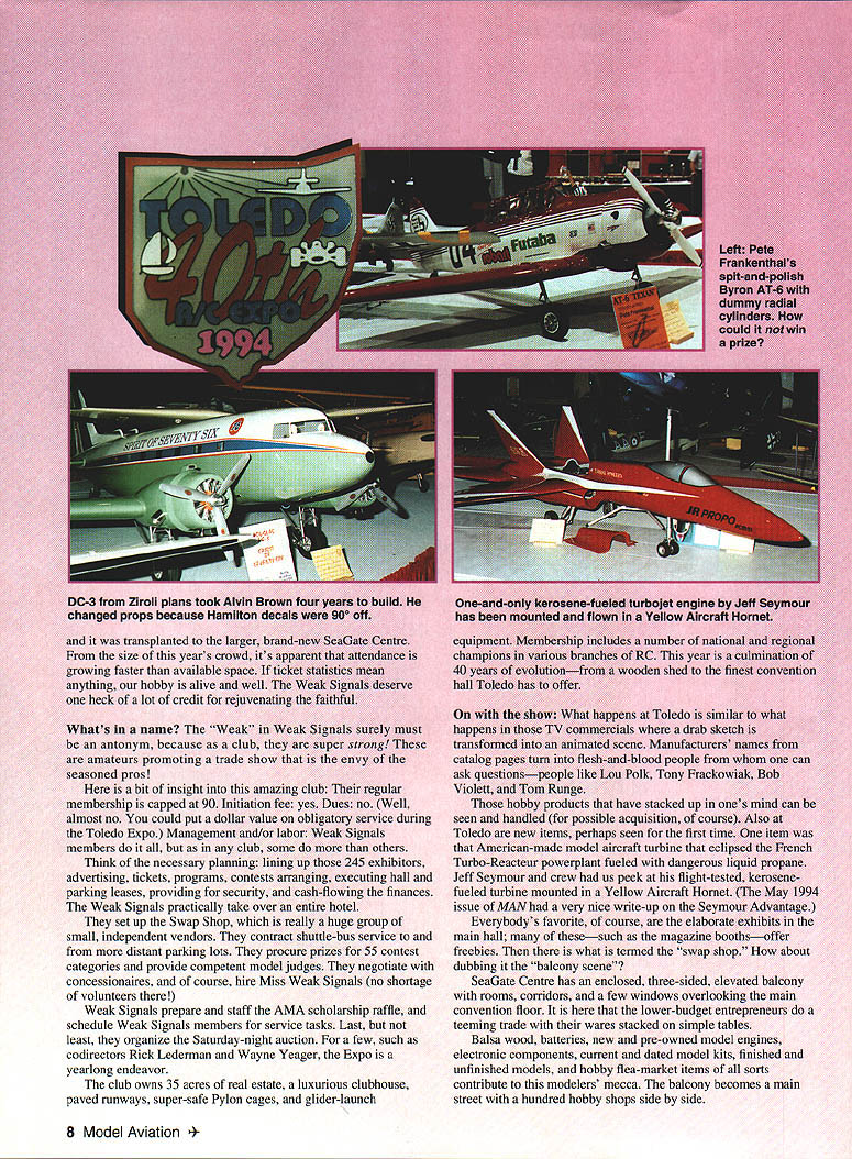 % Weak Signals Endeavor has Become Modelers Mecca MEFred Berman y tired 1961 Websters dictionary defines mecca small 'any place sought numbers people goal What perfect label 40th annual Weak Signals extravaganzaa mammoth magnet known Toledo RC Expo Two years ago show outgrew Sports Arena Doug Robinson brought two pusher Stealths friend built Dougs plans September 1994 7 DC-3 Ziroli plans took Alvin Brown four years build changed props because Hamilton decals 900 off transplanted larger brand-new SeaGate Centre size years crowd its apparent attendance growing faster available space ticket statistics mean anything hobby alive well Weak Signals deserve heck lot credit rejuvenating faithful Whats name Weak Weak Signals surely must antonym because club super strong amateurs promoting trade show envy seasoned pros bit insight amazing club regular membership capped 90 Initiation fee yes Dues no Well almost no could put dollar value obligatory service during Toledo Expo Management and/or labor Weak Signals members club some others Think necessary planning lining up 245 exhibitors advertising tickets programs contests arranging executing hall parking leases providing security cash-flowing finances Weak Signals practically take over entire hotel set up Swap Shop really huge group small independent vendors contract shuttle-bus service distant parking lots procure prizes 55 contest categories provide competent model judges negotiate concessionaires course hire Miss Weak Signals no shortage volunteers Weak Signals prepare staff AMA scholarship raffle schedule Weak Signals members service tasks Last least organize Saturday-night auction few such codirectors Rick Lederman Wayne Yeager Expo yearlong endeavor club owns 35 acres real estate luxurious clubhouse paved runways super-safe Pylon cages glider-launch thehappens Toledo similar what happens th mercials drab sketch transformed animated scene Manufacturers names catalog pages turn flesh-and-blood people can ask questionspeople like Lou Polk Tony Frackowiak Bob Violett Tom Runge hobby products have stacked up ones mind can seen handled possible acquisition course Also Toledo new items perhaps seen first time item American-made model aircraft turbine eclipsed French Turbo-Reacteur powerplant fueled dangerous liquid propane Jeff Seymour crew us peek flight-tested kerosenefueled turbine mounted Yellow Aircraft Hornet May 1994 issue MAN very nice write-up Seymour Advantage Everybodys favorite course elaborate exhibits main hall thesesuch magazine boothsoffer freebies what termed swap shop about dubbing balcony scene SeaGate Centre has enclosed three-sided elevated balcony rooms corridors few windows overlooking main convention floor lower-budget entrepreneurs teeming trade wares stacked simple tables Balsa wood batteries new pre-owned model engines electronic components current dated model kits finished unfinished models hobby flea-market items sorts contribute modelers mecca balcony becomes main street hundred hobby shops side side 8 Model Aviation uiIdlng ave p Richard Bell Torrington Connecticut won Best Scale Helicopter Four blades no stabilizer bars mirror finIsh AMA its customary booth prominent spot main convention floor Tireless Joyce Hager seemed signing up new members unsinkable Dolly Wischer donated another dozen cuddly beautifully handcrafted air bears sold AMAs benefit sold out quickly may have first run-of-the-mill member introduced new Executive Director Jerry Roujilard Jerry will have big shoes fill Bob Underwood Bob served AMA years wanted retire 1993 AMA needed him urgently another year congenial Bob agreed stay entailed temporary move Muncie Bob may have second thoughts after AMA supersupportive wife Rae slipped fell Muncie ice during harsh winter sustained nasty leg fracture cast came off first day Toledo Expo Bob have lon re Jim sedB firsi essft J leisu y si p1 nd th persoi nA deling inv built meKit Intncate includehe tire val Themericai first placchthofe whichattempt resme 94 Top managed Senior citizthe builwas FAA mair inspector Enthusiastic Jim a-aviation sales ngh crackerjack RC pilotSurely wewill hearing Paul Minnesota hobby experts Laure Wilson also first-time contest particip~ builder/flier pretty checkered Nifty-Fifty As tells sorts ways become hooked hobby Innocently enough took job Florio Flyers Ridgeway Pennsylvania models produce intrigued point becoming addict Just wait Laure will take home prize some day Bill Midgeley Hilliard Ohio career fire department lieutenant concerned chiefly fire prevention safety did prevent mastery beautiful BVM Maverick Bill also teaching nine-year-old daughter fly RC According Bill initiated request Heredity can great September 1994 9 Hal Parenti Westchester Illinois perennial winner youre good crafting models just cant get out winners circle No Ryan FR Fireball ever looked spotless Hals choice Fireball intriguing plane Navys cautious transition piston engines turboprops Versions Fireball built both ways Ive seen Hal scale-judge past Nats may strict hes also fair super-friendly Jerry Worth body-and-fender expert Griffith Indiana brilliant superbly painted fire-red BVM Nemesis eighth ducted fan wont afraid fly Jerry culls inventory selling some fleet such fine craftsmanship might want get Jerrys waiting list Knox Hawkshaw somehow ferried gorgeous scratch-built PBY-5A Canso Brampton Ontario Canada owns string high-tech academic credentials full-scale aviation advisory work However started control line flying 45 years ago Major achievements can grow modest beginnings Mike Barbee charming construction contractor Columbus Ohio compulsively builds new model year new Tiger Moth built English plans published Duncan Hutson photo could justice clever fully operational wing slats authentic clock spring airspeedometer probably would ice up slowly pilots eyelids Away workbench Mike certified contest director well mean Pattern flier Guess youd call total commitment didnt connect builders some other fabulo