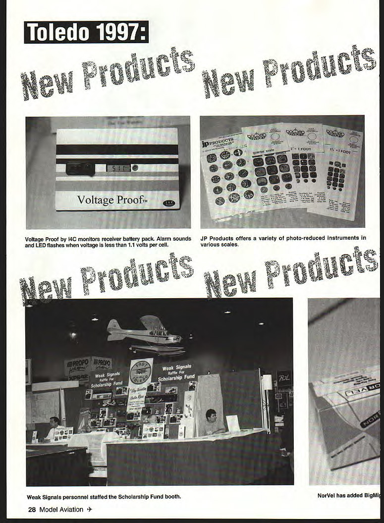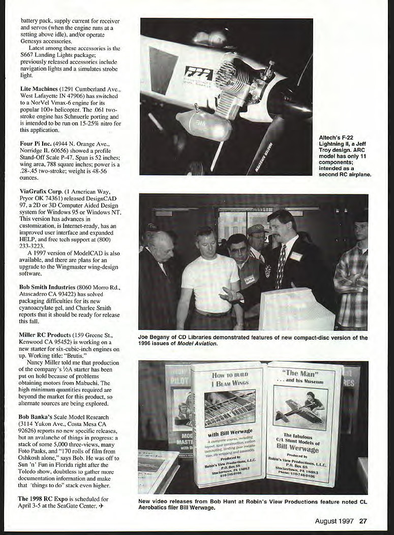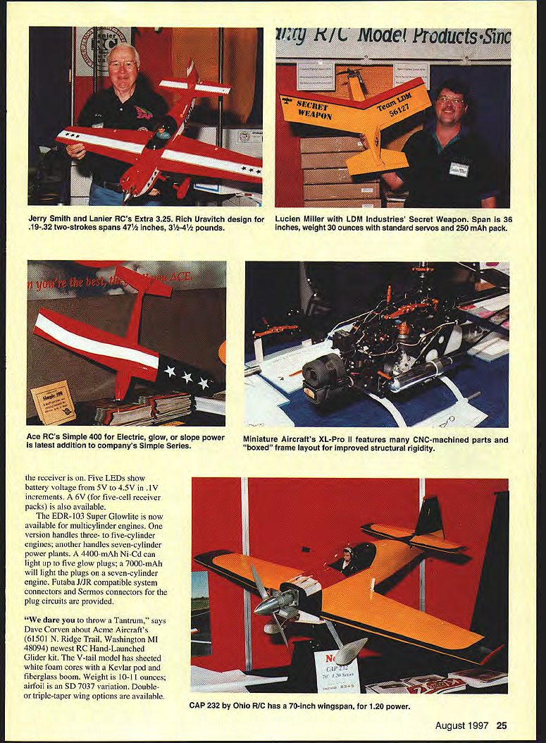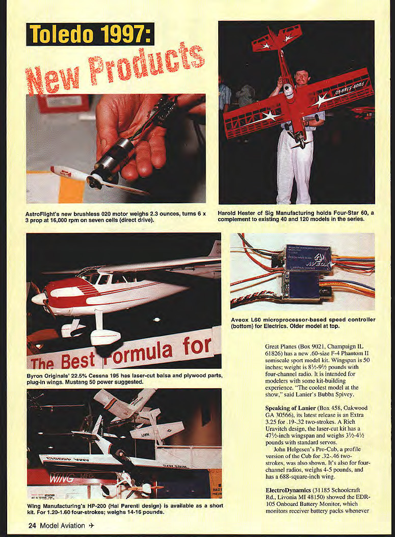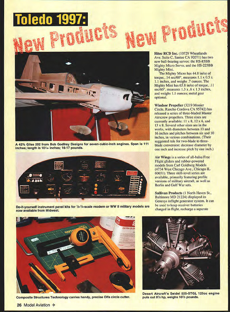 The 43rd Annual Toledo Radio Control Exposition held April 4-6 SeaGate Center Toledo Ohio As has case recent years report will focus new productsitems released Toledo show release imminent Note See Del Ellis RC Jets column issue latest ducted fans turbines Although plenty new merchandise see Toledo fewer total new products past years number manufacturers both large small holding steady product lines anticipating releases latter part 1997 Heres sampling what found August1997 23 Great Planes semiscale F-4 Phantom II 60-75 two-stroke engines four-channel radios Wingspan 50 inches wood ABS pans Weight 81/~91/ pounds Photos author Granhic Desian Carta Hart Kunz K&B Manufacturings new ABC 61 two-stroke #61 50 features twist-on head revised porting tuned muffler JRs new XP642 computer radio available helicopter aircraft versions Thats Karen Veagers hand [illD [IUI1Im Great Planes Box 9021 Champaign IL 61826 has new 60-size F-4 Phantom II semiscale sport model kit Wingspan 50 inches weight 81/291/2 pounds four-channel radio intended modelers some kit-building experience coolest model show said Laniers Bubba Spivey Speaking Lamer Box 458 Oakwood GA 30566 its latest release Extra 325 19-32 two-strokes Rich Uravitch design laser-cut kit has 471/2-inch wingspan weighs 31/241/2 pounds standard servos John Helgesens Pro-Cub profile version Cub 32-46 twostrokes also shown Its also fourchannel radios weighs 4-5 pounds has 688-square-inch wing ElectroDynamics 31185 Schoolcraft Rd Livonia MI 48150 showed EDR 105 Onboard Battery Monitor monitors receiver battery packs whenever 24 Model Aviation troFlights new brushless 020 motor weighs 23 ounces turns 6 x 3 prop 16000 rpm seven cells direct drive Harold Hester Sig Manufacturing holds Four-Star 60 complement existing 40 120 models series Aveox L60 microprocessor-based speed controller bottom Electrics Older model top w Byron Originals 225% Cessna 195 has laser-cut balsa plywood parts plug-in wings Mustang 50 power suggested *1 4ma Wing Manufacturings HP-200 Hal Parenti design available short kit 120-160 four-strokes weighs 14-16 pounds receiver Five LEDs show battery voltage 5V 45V lV increments 6V five-cell receiver packs also available EDR-103 Super Glowlite now available multicylinder engines version handles three- five-cylinder engines another handles seven-cylinder power plants 4400-mAh Ni-Cd can light up five glow plugs 7000-mAb will light plugs seven-cylinder engine Futaba J/JR compatible system connectors Sermos connectors plug circuits provided dare throw Tantrum says Dave Corven about Acme Aircrafts 61501 N Ridge Trail Washington MI 48094 newest RC Hand-Launched Glider kit V-tail model has sheeted white foam cores Kevlar pod fiberglass boom Weight 10-11 ounces airfoil SD 7037 variation Doubleor triple-taper wing options available August1997 25 Jerry Smith Lanier RCs Extra 325 Rich Uravitch design Lucien Miller LDM Industries Secret Weapon Span 36 19-32 two-strokes spans 471h inches 3141A pounds inches weight 30 ounces standard servos 250 mAh pack Ace RCs Simple 400 Electric glow slope power latest addition companys Simple Series Miniature Aircrafts XL-Pro II features CNC-machined parts boxed frame layout improved structural rigidity CAP 232 Ohio RIC has 70-inch wingspan 120 power IrnnmuIUR Hitec RCD Inc 10729 Wheatlands Ave Suite C Santee CA 92071 has two new ball-bearing servos HS-85BB Mighty Micro Servo HS-225BB Mighty Mini Mighty Micro has 448 inloz torque 14 sec/600 measures 11 x 05 x 11 inches weighs 7 ounces Mighty Mini has 658 inloz torque 11 sec/60 measures 13 x 6 x 13 inches weighs 11 ounces metal gear optional Windsor Propeller 3219 Monier Circle Rancho Cordova CA 95742 has released series three-bladed Master Airscrew propellers Three sizes currently available 11 x 8 12 x 6 13 x 8 Several other sizes works diameters between 10 16 inches pitches between six 10 inches various combinations suggested rule two-blade threeblade conversion decrease diameter inch increase pitch inch Air Wings series all-balsa Free Flight gliders rubber-powered models Carl Goldberg Models 4734 West Chicago Ave Chicago IL 60651 Three skill-level series available primarily featuring profile versions military aircraft well Berlin Gulf War sets Sullivan Products 1 North Haven St Baltimore MD 21224 displayed its Genesys inflight generator system can used keep receiver batteries charged flight recharge separate 26 Model Aviation Giles 202 trom Bob Godfrey Designs seven-cubic-inch engines Span 111 inches length 101 inches 16-17 pounds Do-it-yourself instrument panel kits --scale modern WW II military models now available Midwest Desert Aircrafts Seidel 525-STGL 125cc engine Composite Structures Technology carries handy precise Olfa circle cutterputs out 8 hp weighs 10 pounds battery pack supply current receiver servos engine runs setting above idle and/or operate Genesys accessories Latest among accessories 5667 Landing Lights package previously released accessories include navigation lights simulates strobe light Lite Machines 1291 Cumberland Ave West Lafayette IN 47906 has switched NorVel Vmax-6 engine its popular 100 helicopter 061 twostroke engine has Schnuerle porting intended run 15-25% nitro application Altechs F-22 Four Pi Inc 4944 N Orange AveLightning II Jeff Norridge IL 60656 showed profileTray design ARC Stand-Off Scale P-47 Span 52 inchesmodel has 11 wing area 788 square inches power acomponents intended 28-45 two-stroke weight 4856second RC airplane ounces ViaGrafix Corp 1 American Way Pryor OK 74361 released DesignCAD 97 2D 3D Computer Aided Design system Windows 95 Windows NT version has advances customization Internet-ready has improved user interface expanded HELP free tech support 800 233-3223 1997 version ModelCAD also available plans upgrade Wingmaster wing-design software Bob Smith Industries 8060 Mono Rd Atascadero CA 93422 has solved packaging difficulties its new cyanoacrylate gel Charlee Smith reports should ready release fall Miller RC Product