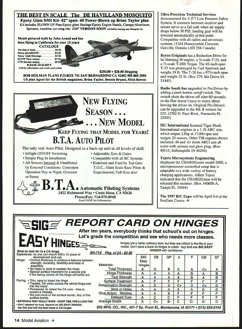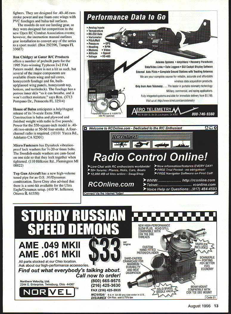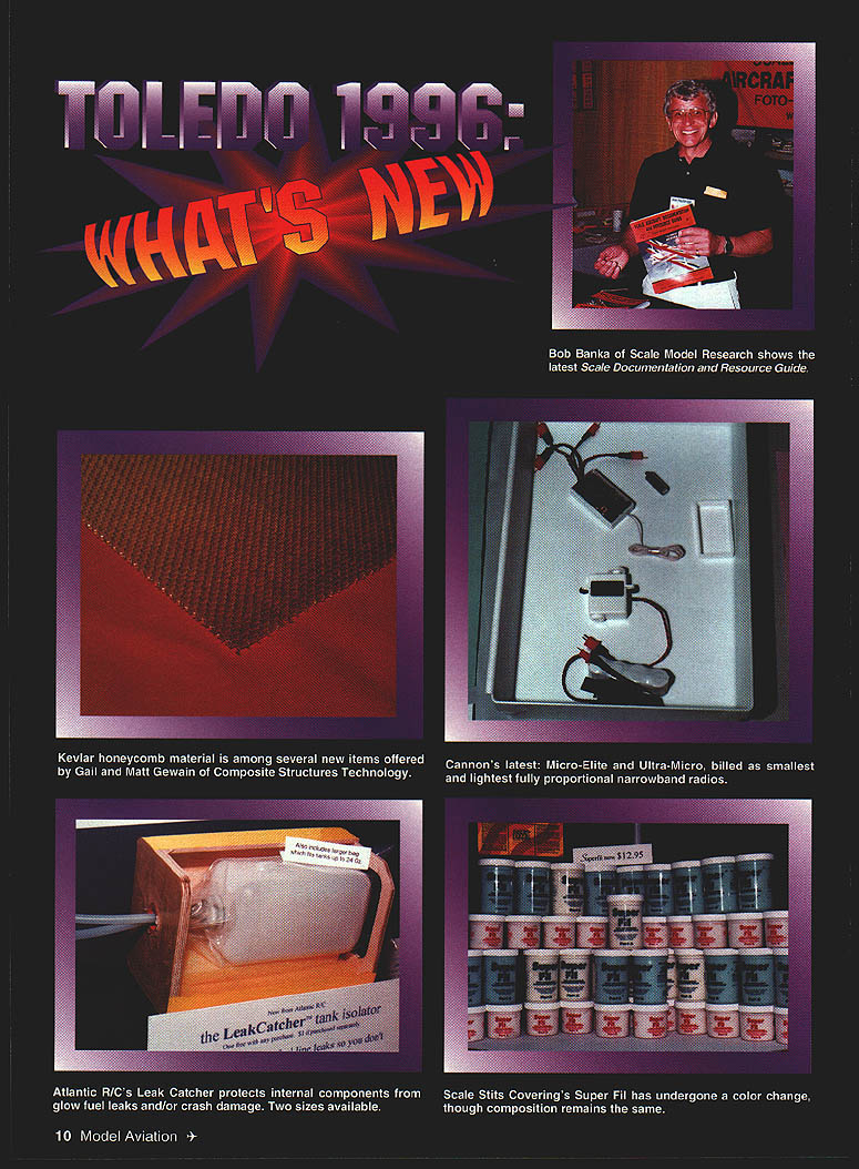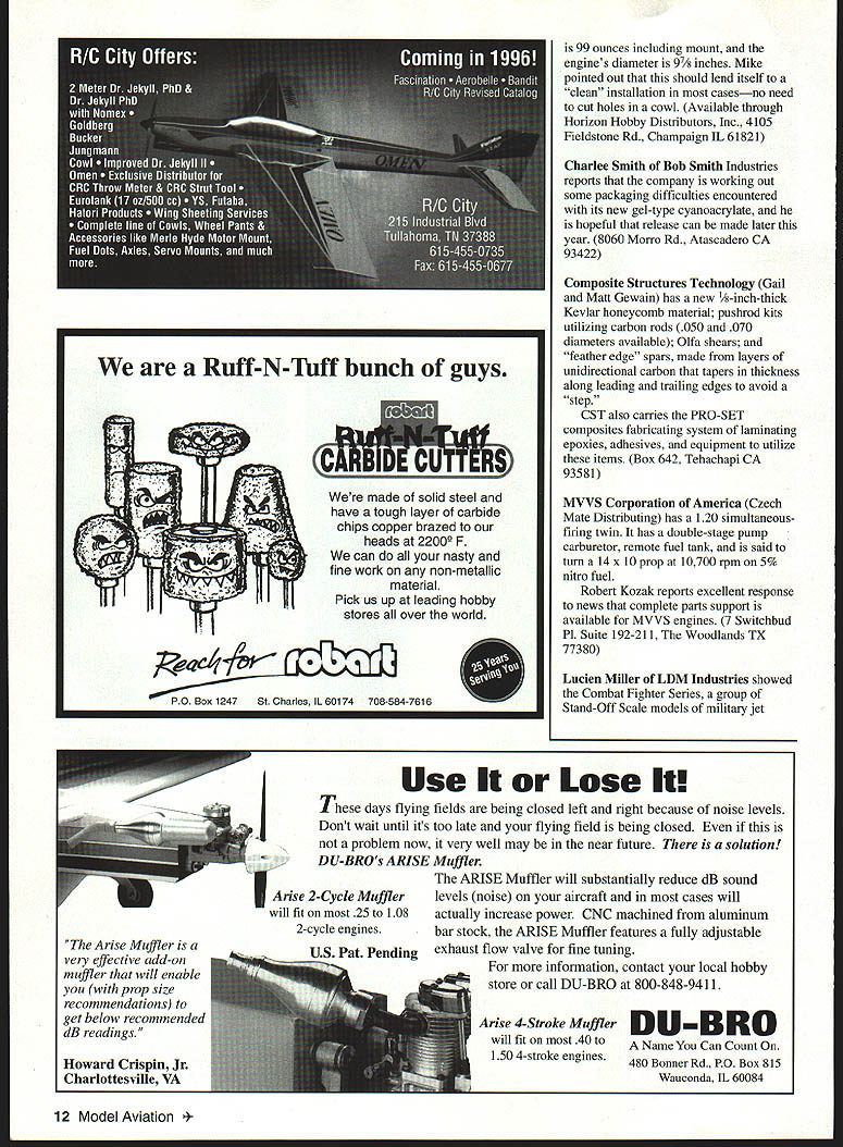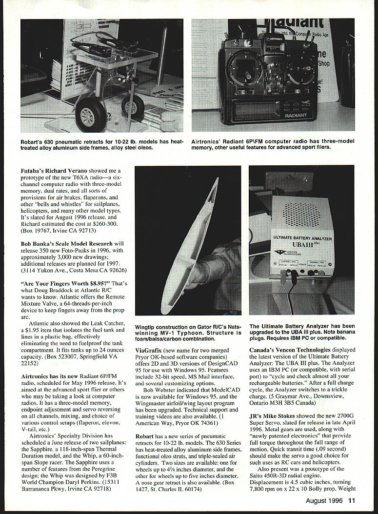 NO OCR TEXT NO OCR TEXT NO OCR TEXT Futabas Richard Verano showed prototype new T6XA radioa sixchannel computer radio three-model memory dual rates sorts provisions air brakes flaperons other bells whistles sailplanes helicopters other model types Its slated August 1996 release Richard estimated cost $260-300 Box 19767 Irvine CA 92713 Bob Bankas Scale Model Research will release 350 new Foto-Paaks 1996 approximately 3000 new drawings additional releases planned 1997 3114 Yukon Ave Costa Mesa CA 92626 Are Fingers Worth $895 Thats what Doug Braddock Atlantic R/C wants know Atlantic offers Remote Mixture Valve 64-threads-per-inch device keep fingers away prop arc Atlantic also showed Leak Catcher $195 item isolates fuel tank lines plastic bag effectively eliminating need fuelproof tank compartment fits tanks up 24 ounces capacity Box 523007 Springfield VA 22152 Airtronics has its new Radiant 6P/FM radio scheduled May 1996 release Its aimed advanced sport flier others may taking look computer radios has three-model memory endpoint adjustment servo reversing channels mixing choice various control setups flaperon elevon V-tail etc Airtronics Specialty Division has scheduled June release two sailplanes Sapphire 118-inch-span Thermal Duration model Whip 60-inchspan Slope racer Sapphire uses number features Peregrine design Whip designed F3B World Champion Daryl Perkins 15311 Barrananca Pkwy Irvine CA 92718 ViaGrafix new name two merged Pryor OK-based software companies offers 2D 3D versions DesignCAD 95 use Windows 95 Features include 32-bit speed MS Mail interface several customizing options Bob Webster indicated ModelCAD now available Windows 95 Wingmaster airfoil/wing layout program has upgraded Technical support training videos also available 1 American Way Pryor OK 74361 Robart has new series pneumatic retracts 10-22 lb models 630 Series has heat-treated alloy aluminum side frames functional oleo struts triple-sealed air cylinders Two sizes available wheels up 4 inches diameter other wheels up five inches diameter nose gear retract also available Box 1427 St Charles IL 60174 Canadas Vencon Technologies displayed latest version Ultimate Battery Analyzer UBA III plus Analyzer uses IBM PC compatible serial port cycle check almost rechargeable batteries After full charge cycle Analyzer switches trickle charge 5 Graymar Ave Downsview Ontario M3H 3B5 Canada JRs Mike Stokes showed new 2700G Super Servo slated release late April 1996 Metal gears used along newly patented electronics provide full torque throughout full range motion Quick transit time 09 second should make servo good choice such uses RC cars helicopters Also present prototype Saito 450R-3D radial engine Displacement 45 cubic inches turning 7800 rpm x 22 x 10 Bolly prop Weight August 1996 11 Robarts 630 pneumatic retracts 10-22 lb models has heat- Airtronics Radiant 6P\FM computer radio has three-model treated alloy aluminum side frames alloy steel oleos memory other useful features advanced sport fliers Wingtip construction Gator RICs Nats- Ultimate Battery Analyzer has winning MV-i Typhoon Structure upgraded UBA Ill plus Note banana foam/balsalcarbon combination plugs Requires IBM PC compatible Howard Crispin Jr Charlottesville VA 99 ounces including mount engines diameter 97/s inches Mike pointed out should lend itself clean installation casesno need cut holes cowl Available through Horizon Hobby Distributors Inc 4105 Fieldstone Rd Champaign IL 61821 Charlee Smith Bob Smith Industries reports company working out some packaging difficulties encountered its new gel-type cyanoacrylate hopeful release can made later year 8060 Morro Rd Atascadero CA 93422 Composite Structures Technology Gail Matt Gewain has new Vs-inch-thick Kevlar honeycomb material pushrod kits utilizing carbon rods 050 070 diameters available Olfa shears feather edge spars made layers unidirectional carbon tapers thickness along leading trailing edges avoid 'step~ CST also carries PRO-SET composites fabricating system laminating epoxies adhesives equipment utilize items Box 642 Tehachapi CA 93581 MVVS Corporation America Czech Mate Distributing has 120 simultaneousfiring twin has double-stage pump carburetor remote fuel tank said turn 14 x 10 prop 10700 rpm 5% nitro fuel Robert Kozak reports excellent response news complete parts support available MVVS engines 7 Switchbud P1 Suite 192-211 Woodlands TX 77380 Lucien Miller LDM Industries showed Combat Fighter Series group Stand-Off Scale models military jet Use Lose days flying fields being closed left right because noise levels Dont wait until its too late flying field being closed problem now very well may near future solution DU-BROs ARISE Muffler ARISE Muffler will substantially reduce dB sound Arise 2-Cycle Muffler levels noise aircraft cases will will fit 25 108 actually increase power CNC machined aluminum 2-cycle engines bar stock ARISE Muffler features fully adjustable US Pat Pending exhaust flow valve fine tuning information contact local hobby store call DU-BRO 800-848-9411 Arise 4-Stroke Muffler 0 U fit 40 toA Name Can Count 150 4-stroke engines480 Bonner Rd P0 Box 815 Wauconda IL 60084 12 Model Aviation -N-Tuff bunch guys re made solid steel have tough layer carbide chips copper brazed heads 22OO F can nasty fine work non-metallic material Pick us up leading hobby stores over world S P0 Box 1247st charles IL 60174 708-584-7616 Arise Muffler very effective add-on muffler will enable prop size recommendations get below recommended dB readings fighters designed 40-46 twostroke power use foam core wings PVC fuselages balsa tail surfaces models use landing gear designed competition new Open RC Combat Association events however instruction manual outlines gear installation convert series sport model Box 292396 Tampa FL 33687 Ron Chidgey Gator R/C Products offers number prebuilt parts 1995 Nats-winning Typhoon 22 FAI Pattern model kit such several major components available foam wing tail cores honeycomb fuselage