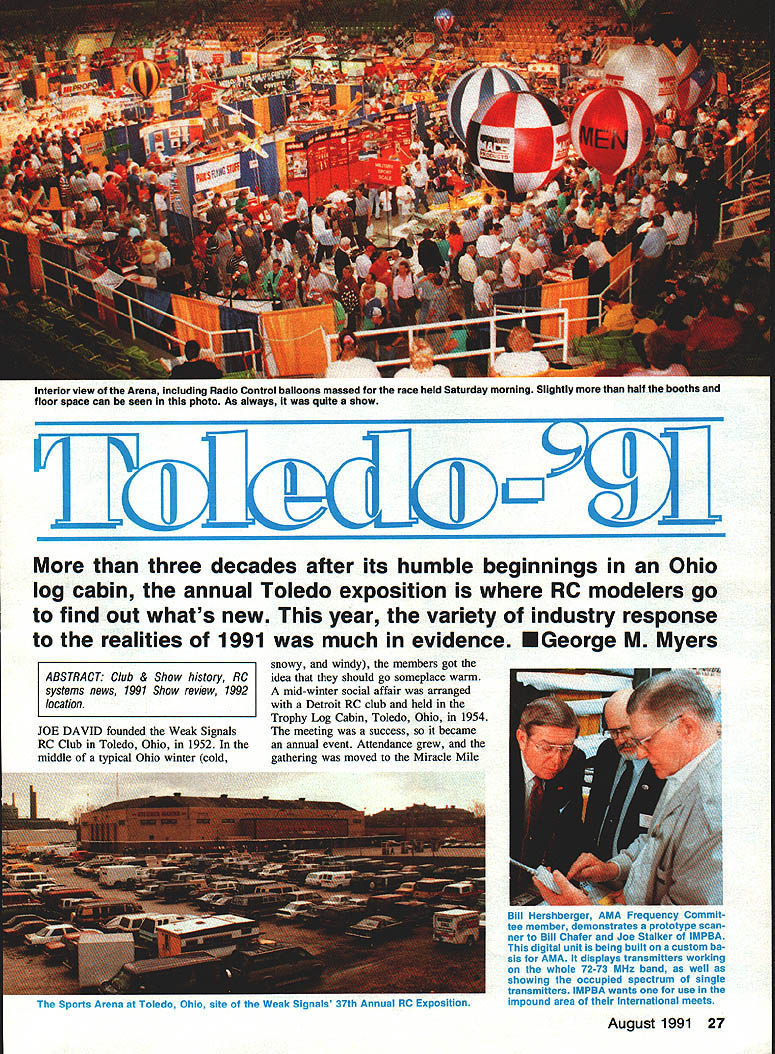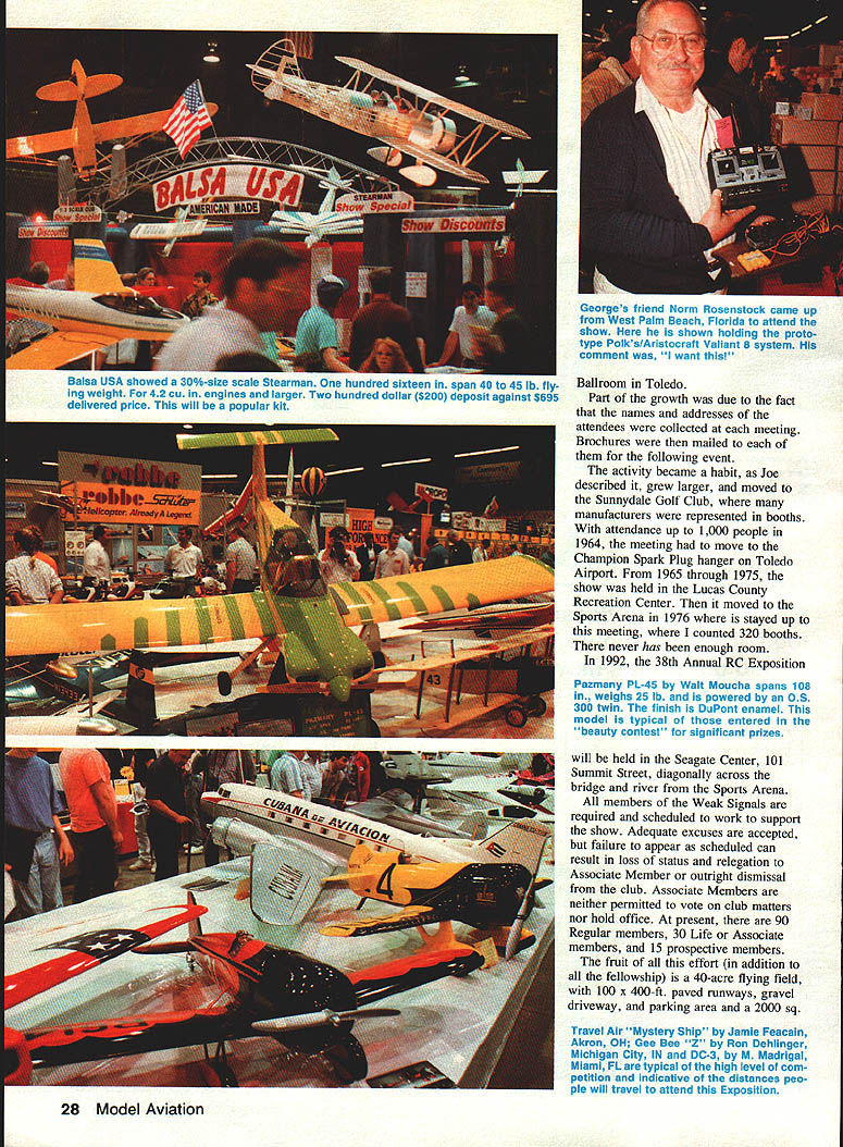 Interior view Arena Including Radio Control balloons massed race held Saturday morning Slightly half booths floor space can seen photo As always quite show LJO three decades after its humble beginnings Ohio log cabin annual Toledo exposition RC modelers go find out whats new year variety industry response realities 1991 much evidence EGeorge M Myers snowy windy members got ABSTRACT Club & Show history RC idea should go someplace warm systems news 1991 Show review 1992 mid-winter social affair arranged location with Detroit RC club held Trophy Log Cabin Toledo Ohio 1954 JOE DAVID founded Weak Signals meeting success became RC Club Toledo Ohio 1952 annual event Attendance grew middle typical Ohio winter cold gathering moved Miracle Mile Bill Hershberger AMA Frequency Commit tee member demonstrates prototype scan ner Bill Chafer Joe Stalker IMPBA digital unit being built custom ba sis AMA displays transmitters working whole 72-73 MHz band well showing occupied spectrum single transmitters IMPBA wants use impound area International meets August 1991 27 Sports Arena Toledo Ohio site Weak Signals 37th Annual RC Exposition Ballroom Toledo Part growth due fact names addresses attendees collected meeting Brochures mailed following event activity became habit Joe described grew larger moved Sunnydale Golf Club manufacturers represented booths attendance up 1000 people 1964 meeting move Champion Spark Plug hanger Toledo Airport 1965 through 1975 show held Lucas County Recreation Center moved Sports Arena 1976 stayed up meeting counted 320 booths never has enough room 1992 38th Annual RC Exposition Pazmany PL-45 Walt Moucha spans 108 weighs 25 lb powered 05 300 twin finish DuPont enamel model typical entered beauty contest significant prizes will held Seagate Center 101 Summit Street diagonally across bridge river Sports Arena members Weak Signals required scheduled work support show Adequate excuses accepted failure appear scheduled can result loss status relegation Associate Member outright dismissal club Associate Members neither permitted vote club matters nor hold office present 90 Regular members 30 Life Associate members 15 prospective members fruit effort addition fellowship 40-acre flying field 100 x 400-ft paved runways gravel driveway parking area 2000 sq Travel Air Mystery Ship Jamie Feacain Akron OH Gee Bee Z Ron Dehlinger Michigan City IN DC-3 M Madrigal Miami FL typical high level com petition indicative distances peo ple will travel attend Exposition 28 Model Aviation Balsa USA showed 30%-size scale Stearman hundred sixteen span qu 4 lb THy ing weight 42 cu engines larger Two hundred dollar $200 deposit against $695 delivered price will popular kit Georges friend Norm Rosenstock came up West Palm Beach Florida attend show shown holding proto type Polks/Aristocraft Valiant 8 system comment want Anderson Pylon scratch-built Chuck Schooley Taylor MN features Forster 99 power Old-Timers have strong support hobby ft clubhouse electricity water phone nearby Lascille Michigan purchased 1980 Weak Signals primarily sailplane pylon race club though other activities encouraged Meetings held clubhouse May through September club hosts three four AMA-Sanctioned contests year plus club contest other weekend Members required fly least club contest per year re-qualify demonstrate pilot proficiency drop Associate Member status Points Late Sunday afternoon presenters line up collect awards garnered handiwork Booths being dismantled background accumulated contest toward yearend club championship no conflict between contest fliers sport fliers because above rules known followed Member has key field clubhouse Visitors welcome shown great courtesy David Howard Vice President Joe David Life Member plus members working show such its Coordinator Wayne Yeager news items standpoint RC systems follows PolkslAristocraft showed prototype Valiant 8 FM/PCM system features scan before select synthesizer generating RC frequencies other interesting features inexpensive $350 list price PCM radio expected available Hobby Shop October 1992 Valiant 8 system uses dualThe Giant Scale brotherhood repre sented civilian P-51 built Henry Kasprowicz Detroit Ml Stinson SR 9 created Leldon George Halerville AL August 1991 29 U John Tatone wife Tern represent Mom & Pop shops have sup ported hobby long Formerly manufacturer such well-known products Tatone timers Free Flight models cast mufflers engines now offer metal engine mounts vibration iso lators scale instrument panel dials Snuffler line muffler cartridges doing bus iness JTec Weak Signals reward effort fine facility both grass paved runways supported clubhouse back ground Interior view part clubhouse right showing trophy case picnic tables windows screened conversion narrow-band airplane receiver scanning receiver phase-locked loop frequency synthesizer generates frequencies allow system scan 50 RC Airplane Only frequencies search find open channel LEDs flash buzzer sounds announce interference Once open channel found Valiant 8 can locked channel Projected availability Oct 1991 Price $350 full equipment four servos Sold through normal hobby channels Airtronics described dealerconfigurable synthesized RF system idea dealer stocks sample line time purchase dealer sets whatever channel user desires simplifies stock Percival Mew Gull racer Dr Keith Shaw spans 745 weighs 95 lb powered Astro Cobalt 60 28 Sanyo 1200 SCR batteries through Jomar SC-6 control ler Electric airplanes now phase hobby showing development George believes Electrics soon will bigger ducted fans Giant Scale situation because no need stock 50 sets crystals 50 different receivers just make sale After being set system acts like fixed-crystal system concept may satisfy believe user-selectable frequency synthesizers dangerous Futaba reports Attack transmitters manufactured after May 1990 narrow-band its 114 117 receivers worthy listing narrow-band list Model Aviation 1991 sticker will identify narrow-band Futaba re
