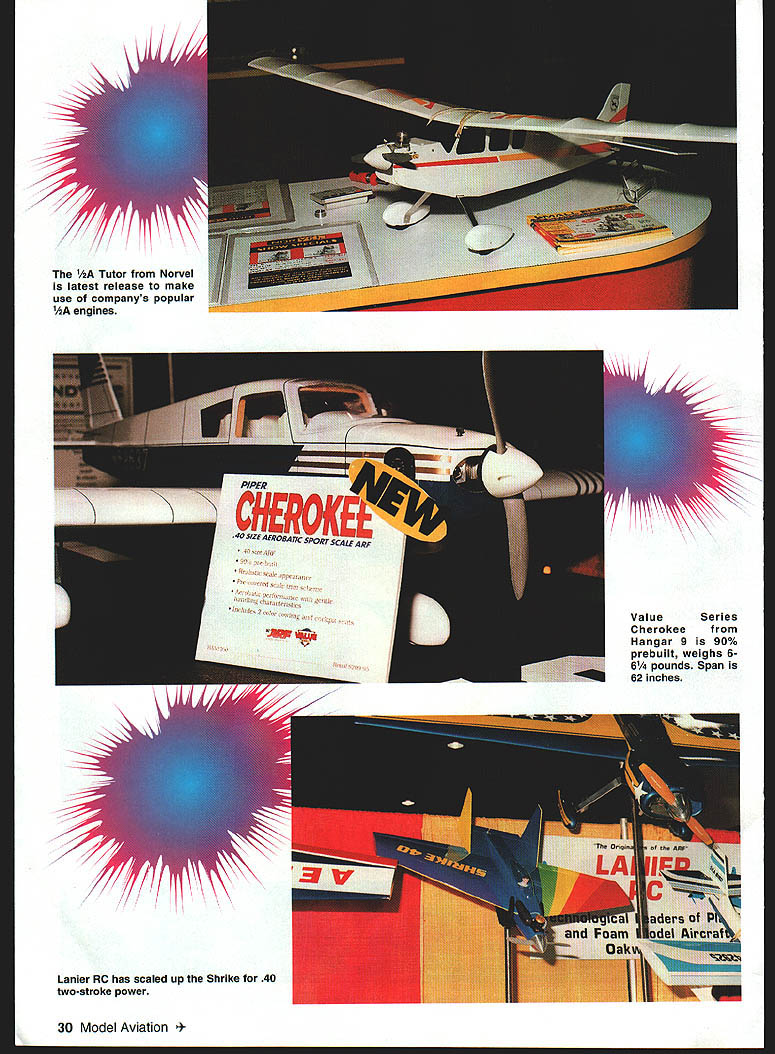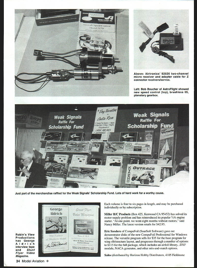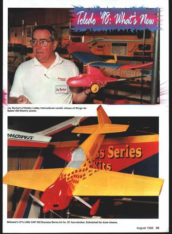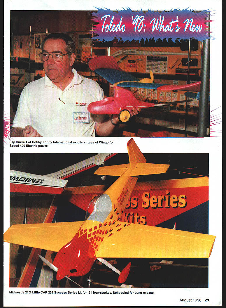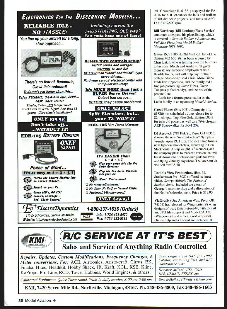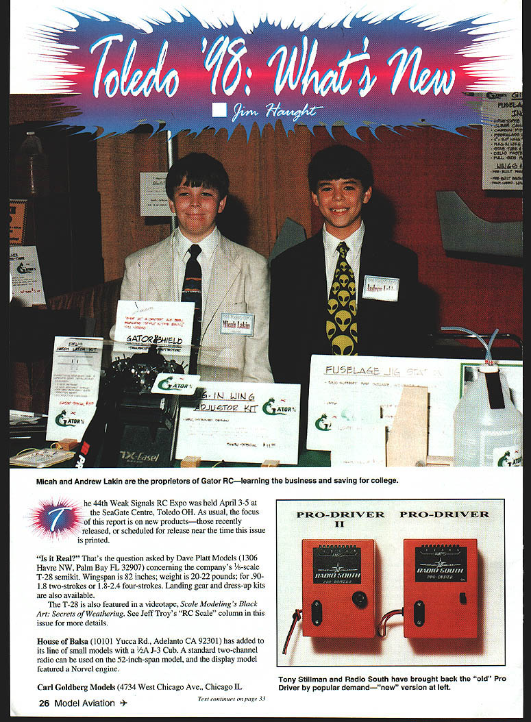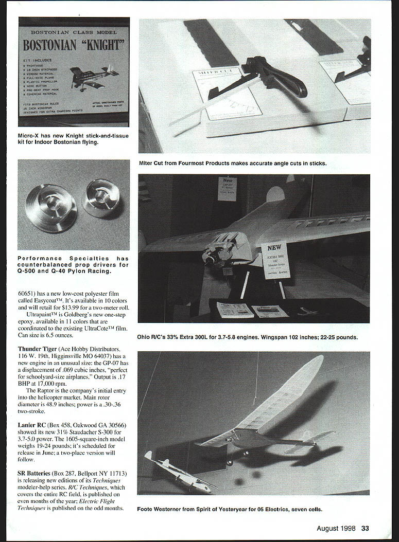 Micah Andrew Lakin proprietors Gator RCIearning business saving college 44th Weak Signals RC Expo held April 3-5 ate Centre Toledo OH As usual focus ~c report new productsthose recently released scheduled release near time issue printed Real Thats question asked Dave Platt Models 1306 Havre NW Palm Bay FL 32907 concerning companys %-scale T-28 semikit Wingspan 82 inches weight 20-22 pounds 9018 two-strokes 18-24 four-strokes Landing gear dress-up kits also available T-28 also featured videotape Scale Modelings Black Art Secrets Weathering See Jeff Troys RC Scale column issue details House Balsa 10101 Yucca Rd Adelanto CA 92301 has added its line small models 1IA J-3 Cub standard two-channel radio can used 52-inch-span model display model featured Norvel engine Carl Goldberg Models 4734 West Chicago Ave Chicago IL Text continues poge 33 26 Model Aviation DRIV ER II PR-DRWER / Tony Stiliman Radio South have brought back old Pro Driver popular demandnew version left Pro\\ s made al urn available sever odized olors August1998 27 Photos author Graphic Design Osris Kunz K&B Manufacturings Screamin 48 has Schnuerle porting remote needle valve puts out 2 hp 15000 rpm One-piece APC Giant Scale props 17- 26-inch diameters fromComposite Structures Technology has powdered neon Landing Products require separate hubpigment glitters add clear epoxy before molding 28 Model Aviation OEZ soft mount Futaba l I r er Classics 44% G-202 Desert Aircraft 97 TOC designer Dave von Linsowe K Jay 1iwAa Jay Burkart Hobby Lobby International extolls virtues Wingo Speed 400 Electric power Midwests 21% Little CAP 232 Success Series kit 91 four-strokes Scheduled June release / August1998 29 Lanier RC has scaled up Shrike 40 two-stroke power 30 Model Aviation 1 has new low-cost polyester film called Easycoat1M Its available 10 colors will retail $1399 two-meter roll UltrapaintTM Goldbergs new one-step epoxy available 11 colors coordinated existing UltraCoteTM film Can size 65 ounces Thunder Tiger Ace Hobby Distributors 116 W 19th Higginsville MO 64037 has new engine unusual size GP-07 has displacement 069 cubic inches perfect schoolyard-size airplanes Output 17 BHPat 17000rpm Raptor companys initial entry helicopter market Main rotor diameter 489 inches power 30-36 two-stroke Lanier RC Box 458 Oakwood GA 30566 showed its new 31% Staudacher S-300 37-50 power 1605-square-inch model weighs 19-24 pounds its scheduled release June two-place version will follow SR Batteries Box 287 Bellport NY 11713 releasing new editions its Techniques modeler-help series RIC Techniques covers entire RC field published months year Electric Flight Techniques published odd months August1998 33 Micro-X has new Knight stick-and-tissue kit Indoor Bostonian flying Miter Cut Fourmost Products makes accurate angle cuts sticks Performance Specialties has counterbalanced prop drivers 0-500 0-40 Pylon Racing Ohio RICs 33% Extra 300L 37-58 engines Wingspan 102 inches 22-25 pounds Foote Westerner Spirit Yesteryear 05 Electrics seven cells Left Bob Boucher Astrolight showed new speed control top brushless 05 planetary gearbox Robins View Productions has George Aldrich interview tape Stunt Flyer Video Magazine 34 Model Aviation me four six pages length may purchased individually subscription Miller R/C Products Box 425 Kenwood CA 95452 has solved its motor-supply problem has reintroduced its popular engine starter point went eight months motors said Nancy Miller latest version retails $4295 Eric Sanders CompuFoil SoarSoft Software gave out demonstrator disks new CompuFoil Professional Windows release versatile program sells $35 base program wing rib/structure layout progresses through number options $115 full package includes airfoil library DXF module NACA generator other mix-and-match options Saito distributed Horizon Hobby Distributors 4105 Fieldstone Above Airtronics 92826 two-channel micro receiver adapter cable Z connector receivers/servos Just part merchandise raffled Weak Signals Scholarship Fund Lots hard work worthy cause Eajey REIJflLE S-L-D-O-W Idle PLUS. E4SY S4FE studsl Singles Twins NO Interference Works Rxs Light Less 35 grams Ultra-simple installation ~3roDiinamics 3 1185 Schoolcraft Livonia MI 48150 Website http//wirweIectTodynamcom US EASIER man 1-2-31 Plug peer serve lt P Serve Reverser * Plug Pre Sen Reverser late peer Ra Wew Peere dead o No messy adjustments O No Jitter No Drift Neutral Shifts o Fuelproof Vibration proofi WJk5 FL La 1-800-337-1638 Orders Info 1-734-422-5420 Fax 1-734-422-5338 W Rd Champiagn IL 61821 displayed FA 9OTS twin enhances look realism 60-size scale projects turns APC 13x8 9500 rpm Bill Northrop Bill Northrop Plans Service continues expand plans listing covered Scratch Builders Almanac Full Size Plans irom Model Builder Magazine 1971-] 996 Gator RC 2100 N Old Mill Rd Brookline Station MO 65619 has acquired Chris Lakin turning over business sons Micah Andrew gives steady part-time employment flexible hours will help pay college education said Chris Mom Diana lends support too family did fine job promoting Gator Tubes Gator Tongues fuel caddy rest product line Look feature presentation Laldn family upcoming Model Aviation Great Planes Box 9021 Champaign IL 61826 has scheduled June release its 82-inch-span Top Flite Gold Edition DC-3 twin 40 power well 79-inch-span ARF Spacewalker 60-I 20s DJ Aerotech 719 Fisk St Piqua OH 45356 showed new mosquito-class Nymph 3/4-meter-span RC HLG idea came new Japanese model class according Don Stackhouse All-up weight 34 ounces company plans market version will break down briefcase-size parts travel flying virtually anywhere laser-cut kit will sell $35-SO Robins View Productions Box 68 Stockertown PA 18083 offered its latest video George Aldrich Father Modern Stunt Included tour Georges machine shop discussion Noblers development Price $1995 Viarafix American Way Pryor OK 74361 has released its Wingmaster 98 wing design software Internet-ready E-mail JPG file support ModelCAD 98