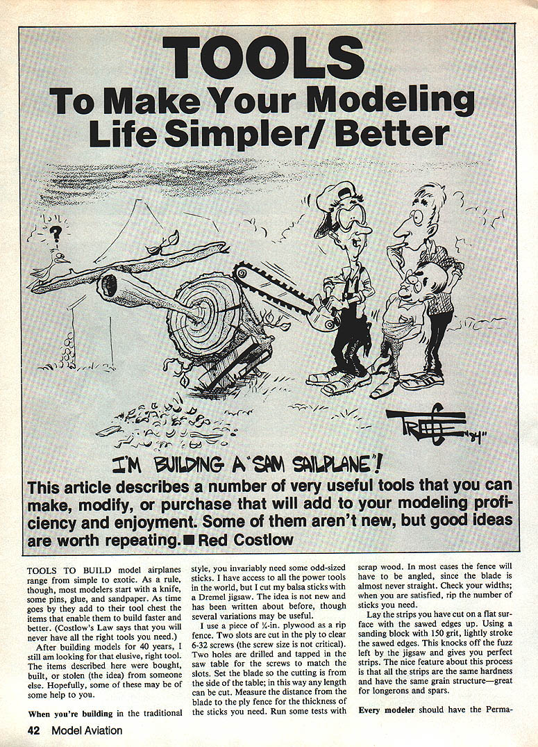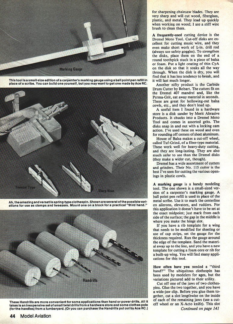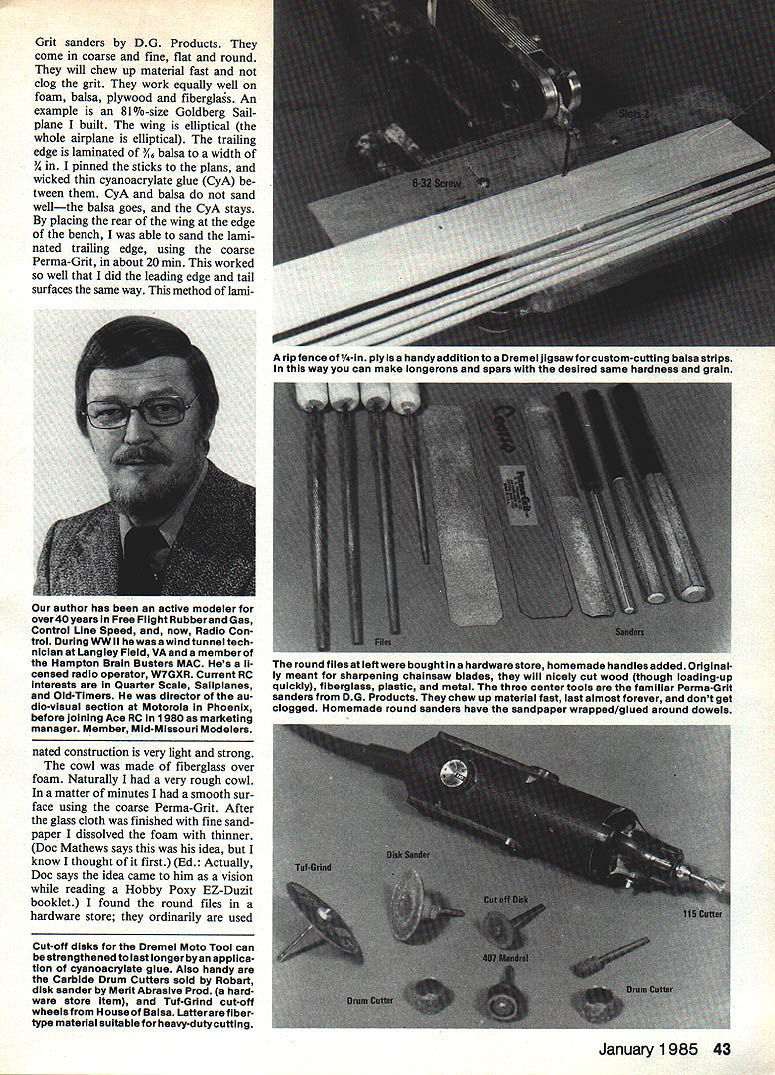 TOOLS TO BUILD model airplanes range simple exotic As rule though modelers start knife some pins glue sandpaper As time goes add tool chest items enable build faster better Costlows Law says will never have right tools need After building models 40 years still am looking elusive right tool items described bought built stolen idea someone else Hopefully some may some help youre building traditional style invariably need some odd-sized sticks have access power tools world cut balsa sticks Dremel jigsaw idea new has written about before though several variations may useful use piece A-in plywood rip fence Two slots cut ply clear 6-32 screws screw size critical Two holes drilled tapped saw table screws match slots Set blade cutting side table way length can cut Measure distance blade ply fence thickness sticks need Run some tests scrap wood cases fence will have angled since blade almost never straight Check widths satisfied rip number sticks need Lay strips have cut flat sur face sawed edges up Using sanding block 150 grit lightly stroke sawed edges knocks off fuzz left jigsaw gives perfect strips nice feature about process strips same hardness have same grain structuregreat longerons spars modeler should have Perma 42 Model Aviation Grit sanders DG Products come coarse fine flat round will chew up material fast clog grit work equally well foam balsa plywood fiberglas An example 81 %-size Goldberg Sail plane built wing elliptical whole airplane elliptical trailing edge laminated 3A6 balsa width 3/4 pinned sticks plans wicked thin cyanoacrylate glue CyA tween CyA balsa sand wellthe balsa goes CyA stays placing rear wing edge bench able sand lami nated trailing edge using coarse Perma-Grit about 20 mm worked well did leading edge tail surfaces same way method lami author has active modeler over4Oyearsln Free Flight Rubberand Gas Control Line Speed now Radio Con trol During WW ii hewasa wind tunnel tech nicianatLangleyFieldVAanda memberof Hampton Brain Busters MAC Hes li censed radio operator W7GXR Current RC interests Quarter Scale Sailpianes Old-Timers director au dio-visual section Motorola Phoenix before joining Ace RC 1980 marketing manager Member Mid-Missouri Modelers nated construction very light strong cowl made fiberglass over foam Naturally very rough cowl matter minutes smooth sur face using coarse Perma-Grit After glass cloth finished fine sand paper dissolved foam thinner Doc Mathews says idea know thought first Ed Actually Doc says idea came him vision reading Hobby Poxy EZ-Duzit booklet found round files hardware store ordinarily used Cut-off disks Dremel Moto Tool can strengthened last longer byan applica tion cyanoacrylate glue Also handy Carbide Drum Cutters sold Robart disk sander Merit Abrasive Prod hard ware store item Tuf-Grind cut-off wheels House Balsa Latterare fibertype materiai suitable heavy-dutycutting January1985 43 rip fence -in ply isa handy addition Dremel jigsaw custom-cutting balsa strips way can make longerons spars desired same hardness grain round files leftwere bought hardware store homemade handles added Original ly meant sharpening chainsaw blades will nicely cut wood though loading-up quickly fiberglass plastic metal three center tools familiar Perma-Grit sanders DG Products chew up material fast last almost forever dont get clogged Homemade round sanders have sandpaper wrapped/glued around dowels sharpening chainsaw blades very sharp will cut wood fiberglass plastic metal load up quickly working wood use stiff wire brush clean frequently-used cutting device Dremel Moto Tool Cut-off disks ex cellent cutting music wire make short work A-in drill rod always use safety goggles strengthen disks place end round toothpick stuck piece balsa foam Put light coating thin CyA disk soaks way through disk dry will find has less tendency break will last much longer Another nifty product Carbide Drum Cutter Robart cutters fit Dremel 407 mandrel like Perma-Grit eat away material seconds great hollowing-out balsa cowls etc dont load up useful item found hardware store disk sander Merit Abrasive Products chucks Dremel Moto Tool comes assorted grits disks snap out locking cam action Ive used wood rounding off corners sheet aluminum House Balsa makes cut-off wheel called Tuf-Grind fiber-type material work well heavy-duty cutting long-lasting also much safer use Dremel disks make wider cut though Dremel has wide assortment cutters grinders No 115 cutter best Ive seen cutting various open ings plastic cowls marking gauge handy modeling tool shown small-sized ver sion carpenters marking gauge ball point pen refill used place metal scribe Use mark centerline ailerons elevators rudders application doesnt have set exact midpoint just mark side surface gap middle make hinge slot have rib template wing needs modified sheeting use cap strips set gauge thickness required Run gauge around edge template Sand materi al away up line have new template cutting foam core rib built-up wing will find appli cations tool often have needed third hand ubiquitous clothespin has used modelers ages variations pictured add utility Cut off jaws two clothes pins Glue two together have wide-jaw clip Before glue gether cut slot lengthwise inside of remaining jaws use cut off wheel X-Acto knife slot Continued page 141 44 Model Aviation tool isa small-size edition ofa carpenters marking gauge using ballpoint pen refill place scribe can build yourself may want get made Ace RC Ah amazing versatile spring-type clothespin Shown several possible vari ations use clamps tweezers Mount block practical third hand Handrills convenient some applications hand power drills takes inexpensive set small twist drills hardware store some clothes pole handles lumberyard Oryou can purchase Handrills put out Ace RC S KY FOX SPORT FLYER Wing Span Wing Area Length Weight Engine Radio SEE YOUR 54 Inches 620 Sq 43 Inches 55 Lbs 40 50 4 Channel DEALER RLA MODELS513866-0105 P 0 BOX 640 WEST CARROLLTON OHIO 45449 Direct Orders Send