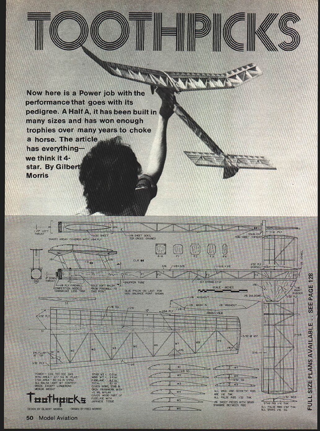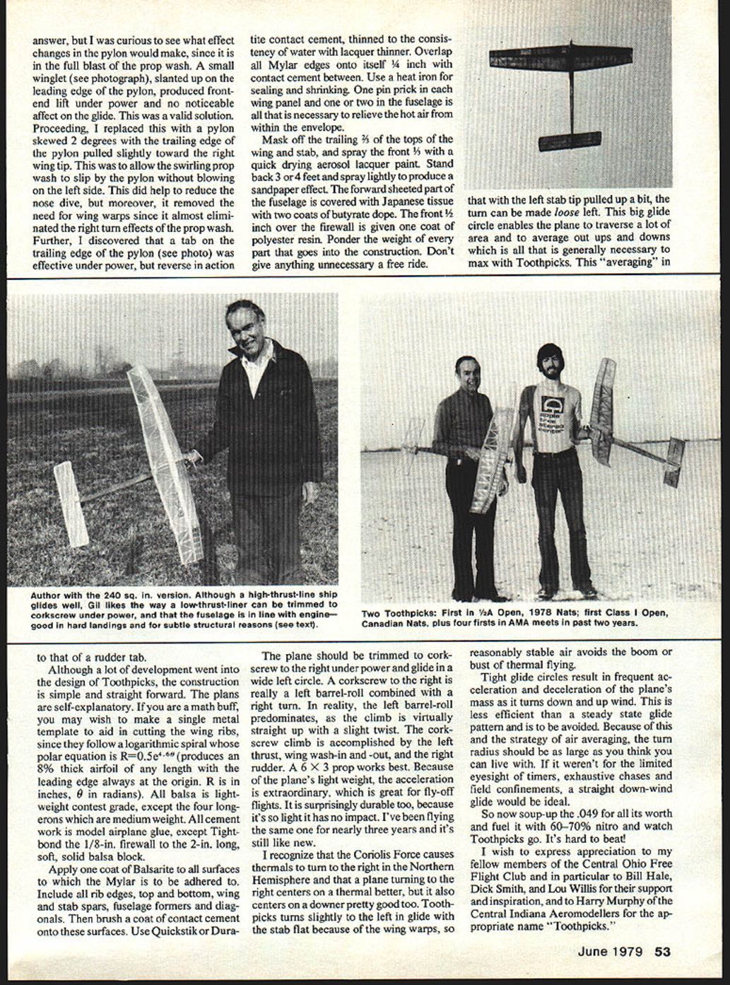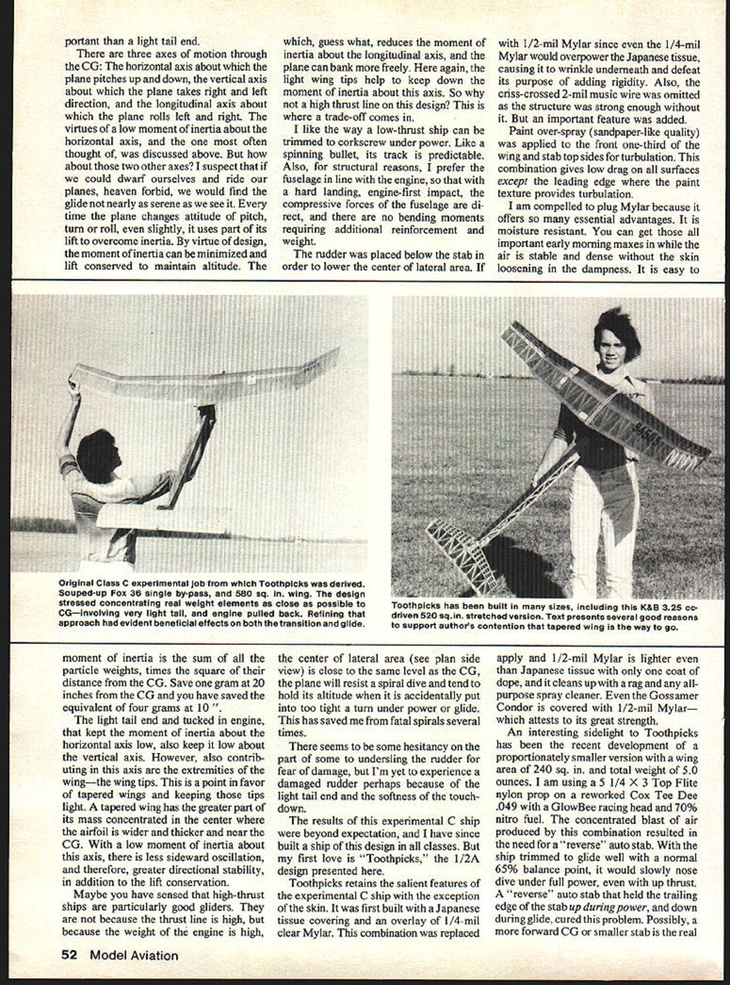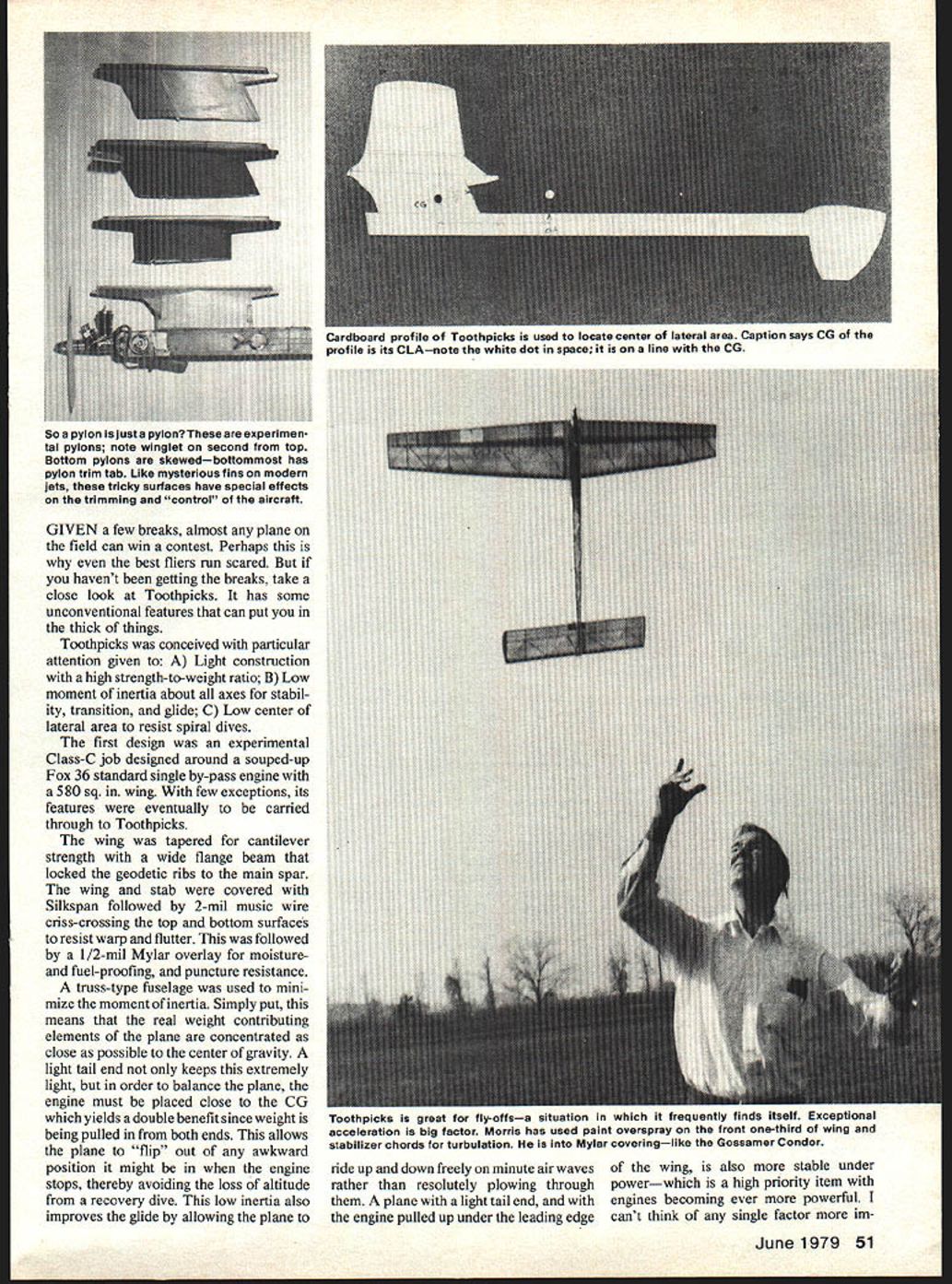 NO OCR TEXT GIVEN few breaks almost plane field can win contest Perhaps best fliers run scared havent getting breaks take close look Toothpicks has some unconventional features can put thick things Toothpicks conceived particular attention given Light construction high strength-to-weight ratio B Low moment inertia about axes stabil ity transition glide C Low center lateral area resist spiral dives first design experimental Class-C job designed around souped-up Fox 36 standard single by-pass engine 580 sq wing few exceptions its features eventually carried through Toothpicks wing tapered cantilever strength wide flange beam locked geodetic ribs main spar wing stab covered Silkspan followed 2-mil music wire criss-crossing top bottom surfaces resist warp flutter followed 1/2-mil Mylar overlay moistureand fuel-proofing puncture resistance truss-type fuselage used mini mize moment inertia Simply put means real weight contributing elements plane concentrated close possible center gravity light tail end keeps extremely light order balance plane engine must placed close CG yields double benefit since weight being pulled both ends allows plane flip out awkward position might engine stops thereby avoiding loss altitude recovery dive low inertia also improves glide allowing plane ride up down freely minute air waves wing also stable under rather resolutely plowing through powerwhich high priority item plane light tail end engines becoming ever powerful engine pulled up under leading edge cant think single factor im June 1979 51 Cardboard profile Toothpicks used locate center lateral area Caption says CG profile its CIAnote white dot space line CG So pylon just pylon experimen tal pylons note winglet second top Bottom pylons skewedbottommost has pylon trim tab Like mysterious fins modern jets tricky surfaces have special effects trimming control aircraft Tootflplcks great fly-oilsa situation frequently finds itself Exceptional acceleration big factor Morris has used paint overspray front one-third wing stabilizer chords turbulation Mylar coveringlike Gossamer Condor portant light tail end three axes motion through CG horizontal axis about plane pitches up down vertical axis about plane takes right left direction longitudinal axis about plane rolls left right virtues low moment inertia about horizontal axis often thought discussed above about two other axes suspect could dwarf ourselves ride planes heaven forbid would find glide nearly serene see time plane changes attitude pitch turn roll slightly uses part its lift overcome inertia virtue design moment inertia can minimized lift conserved maintain altitude guess what reduces moment inertia about longitudinal axis plane can bank freely again light wing tips help keep down moment inertia about axis So high thrust line design trade-off comes like way low-thrust ship can trimmed corkscrew under power Like spinning bullet its track predictable Also structural reasons prefer fuselage line engine hard landing engine-first impact compressive forces fuselage di rect no bending moments requiring additional reinforcement weight rudder placed below stab order lower center lateral area 1/2-mil Mylar since 1/4-mil Mylar would overpower Japanese tissue causing wrinkle underneath defeat its purpose adding rigidity Also criss-crossed 2-mil music wire omitted structure strong enough important feature added Paint over-spray sandpaper-like quality applied front one-third wing stab top sides turbulation combination gives low drag surfaces except leading edge paint texture provides turbulation am compelled plug Mylar because offers essential advantages moisture resistant can get important early morning maxes air stable dense skin loosening dampness easy moment inertia sum particle weights times square distance CG Save gram 20 inches CG have saved equivalent four grams 10 t tail end tucked engine kept moment inertia about horizontal axis low also keep low about vertical axis However also contrib uting axis extremities wingthe wing tips point favor tapered wings keeping tips light tapered wing has greater part its mass concentrated center airfoil wider thicker near CG low moment inertia about axis less sideward oscillation therefore greater directional stability addition lift conservation Maybe have sensed high-thrust ships particularly good gliders because thrust line high because weight engine high center lateral area see plan side view close same level CG plane will resist spiral dive tend hold its altitude accidentally put too tight turn under power glide has saved fatal spirals several times seems some hesitancy part some undersling rudder fear damage Im yet experience damaged rudder perhaps because light tail end softness touch down results experimental C ship beyond expectation have since built ship design classes first love Toothpicks l/2A design presented Toothpicks retains salient features experimental C ship exception skin first built Japanese tissue covering overlay 1/4-mil clear Mylar combination replaced apply 1 /2-mil Mylar lighter Japanese tissue coat dope cleans up rag allpurpose spray cleaner Gossamer Condor covered 1/2-mil Mylar attests its great strength An interesting sidelight Toothpicks has recent development proportionately smaller version wing area 240 sq total weight 50 ounces am using 5 1/4 X 3 Top Flite nylon prop reworked Cox Tee Dee 049 GlowBee racing head 70% nitro fuel concentrated blast air produced combination resulted need reverse auto stab ship trimmed glide well normal 65% balance point would slowly nose dive under full power up thrust reverse auto stab held trailing edge stab up during power down during glide cured problem Possibly forward CG smaller stab real 52 Model Aviation Original Class C experimental job Toothpicjcs derived Souped-up Fox 36 single by-pass 580 sq wing design stressed concentrating real weight elements close possible CGinvolving very light tail engine pulled back Refining approach evident beneficial effects both 