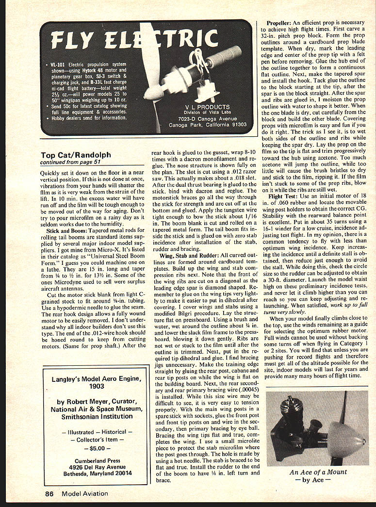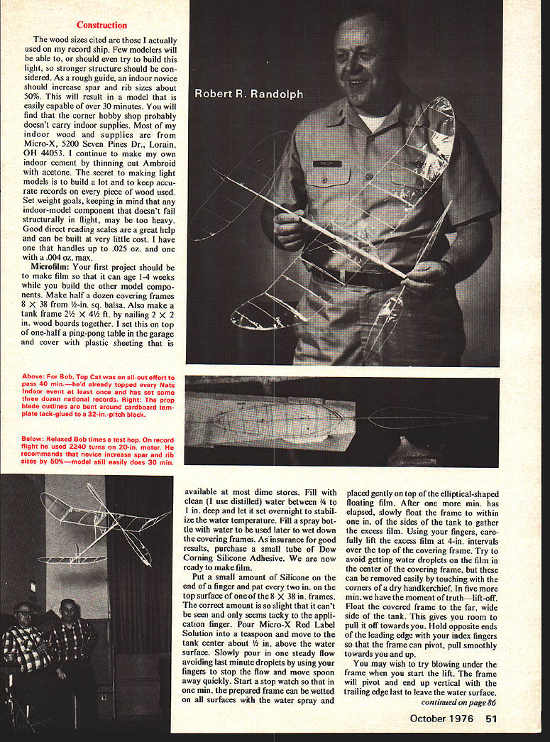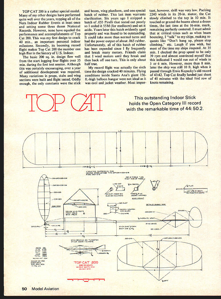TOP CAT 200 rather special model other designs have performed quite well over years topping Nats Indoor Rubber Events least once setting some three dozen National Records However have equaled performance accomplishments Top Cat 200 first design crack 40 mm important personal indoor milestone Secondly its booming record flight makes Top Cat 200 number high flier history US Indoor basic 200 sq design flew well start logging four flights over 35 mm during first test session Although certainly encouraging over year additional development required variations props stabs wing sections built flight tested Oddly enough constants stick boom wing planform special batch rubber last item warrants clarification Six years ago stripped batch 055 Pirelli tested out poorly coded 55M mediocre set aside Years later batch evidently aged properly found outstanding could take normal turns power output about 065 rubber Unfortunately batch rubber has expended since fly frequently break motors Friends claim wind motors until break back off turn about half true record flight actually sixth time design cracked 40 minutes Flying conditions inside Santa Anas giant 156ft-high balloon hangar ideal cool jacket weather Most impor tant however drift very low Packing 2240 winds its 20-in motor Cat slowly climbed top 10 mm touched grazed beams about dozen times last time 16-mm mark remaining perfectly centered must admit critical times such beam bouncing talk ships making re quests like Dont hang up please stop climbing etc Laugh wish time ships respond 35 mm clocked prop speed 39 rpm almost convinced myself indicated would run out winds 5 6 mm However 8 mm later ship still 10 ft high passed through Ernie Kopeckys old record 4342 Top Cat finally landed just short 45 minutes ideal Ard row knots remaining TOP QIT outstanding Indoor Stick holds Open Category Ill record remarkable time 44502 LE 6 C ffi O CBNRCES CO PSESSIGO RIBS CENTER SPARS ORE TIPS OSNIOZ4W0Z4OlB RIBS 0000 015 OSOoOIBO2S0OIB OAB 50400056 IS/BA PROP OONAURALOIAWIRE 4 ZOR70020SG 000000 00OUABZ RING POSTS FRONT 41-tI-A BACK SCCA 1~ CSRLDTISSI-E TUBE 0141-IT SICK OR MOOEL NOUCER RAZOR BAROOSIdt RING GLC 000 BULOOBAG040055 WRAPPED WING MOUNT DETAILS DOUBLE SIZE 040000 WRAPPED COD GLI-ED 000J117 010 WIRE MICROLITE WRAP STICK 0145 OPOOM BOOM COB 4k STICK BRACING 001 TIINGSTBN OTHER COOKS NICOROME 0~~ _ TOP CAT 200 NOB RAIIOOLOl AC MAY 1073 N IK 007 ORG4OROC0 S 7 ILBET 50 Model Aviation LAS 0% 00 84041 SCI-ICOCO ROTORS RE WGV0OZ 571CC0140 0000 Q4 TOTAL 0004 ONCOAC 04 000 POWER 00050 RCOOTIJRON COO ORM RZ4 717% CO Construction wood sizes cited actually used record ship Few modelers will able should try build light stronger structure should con sidered As rough guide indoor novice should increase spar rib sizes about 50% will result model easily capable over 30 minutes will find corner hobby shop probably doesnt carry indoor supplies Most indoor wood supplies Micro-X 5200 Seven Pines Dr Lorain OH 053 continue make own indoor cement thinning out Ambroid acetone secret making light models build lot keep accu rate records piece wood used Set weight goals keeping mind indoor-model component doesnt fail structurally flight may too heavy Good direct reading scales great help can built very little cost have handles up 025 oz 004 oz max Microfilm Your first project should make film can age 1-4 weeks build other model compo nents Make half dozen covering frames 8 X 38 -in sq balsa Also make tank frame 2 X 4 ft nailing 2 X 2 wood boards together set top one-half ping-pong table garage cover plastic sheeting Above For Bob Top Cat all-out effort pass 40 mmhed already topped Nats Indoor event least once has set some three dozen national records Right prop blade outlines bent around cardboard tem plate tack-glued 32-in-pitch block Below Relaxed Bob times test hop record flight used 2240 turns 20-in motor recommends novice increase spar rib sizes 50%model still easily does 30 mm available dime stores Fill clean use distilled water between ep let set overnight stabil ize water temperature Fill spray bot tle water used later wet down covering frames As insurance good results purchase small tube Dow Corning Silicone Adhesive now ready make film Put small amount Silicone end finger pat two top surface 8 X 38 frames correct amount slight cant seen seems tacky appli cation finger Pour Micro-X Red Label Solution teaspoon move tank center about e water surface Slowly pour steady flow avoiding last minute droplets using fingers stop flow move spoon away quickly Start stop watch mm prepared frame can wetted surfaces water spray placed gently top elliptical-shaped floating film After mm has elapsed slowly float frame within sides tank gather excess ifim Using fingers care fully lift excess film 4-in intervals over top covering frame Try avoid getting water droplets film center covering frame can removed easily touching corners dry handkerchief five mm have moment truthlift-off Float covered frame far wide side tank gives room pull off towards Hold opposite ends leading edge index fingers frame can pivot pull smoothly towards up may wish try blowing under frame start lift frame will pivot end up vertical trailing edge last leave water surface continued page 86 October1976 51 Quickly set down floor near vertical position done once vibrations hands will shatter film very weak strain lift 10 mm excess water will have run off film will tough enough moved out way aging Dont try pour microfilm rainy day seldom works due humidity Stick Boom Tapered metal rods rolling tail booms standard items sup plied several major indoor model sup pliers got Micro-X Its listed catalog Universal Steel Boom Form guess could machine lathe 15 long taper Some ones Microdyne used sell surplus aircraft antennas Cut motor stick blank light C grained stock fit around A-in tubing Use hypodermic needle glue seam rear hook design allows fully wound motor easily removed dont under stand indoor builders dont use type end 012-wire