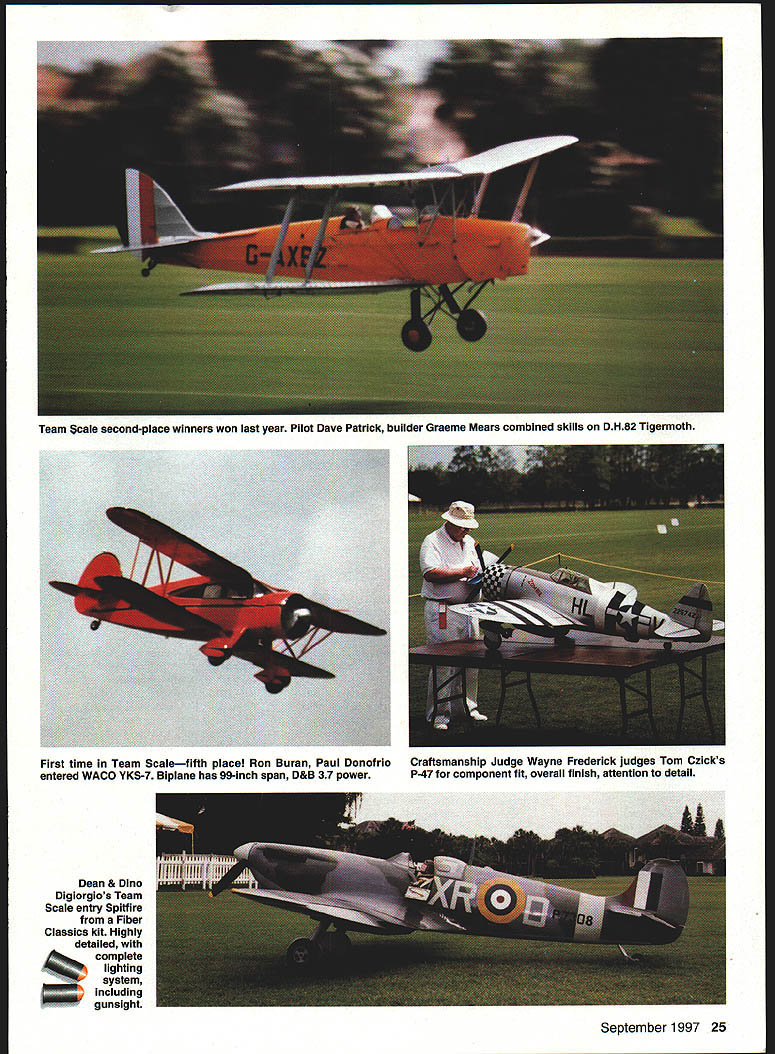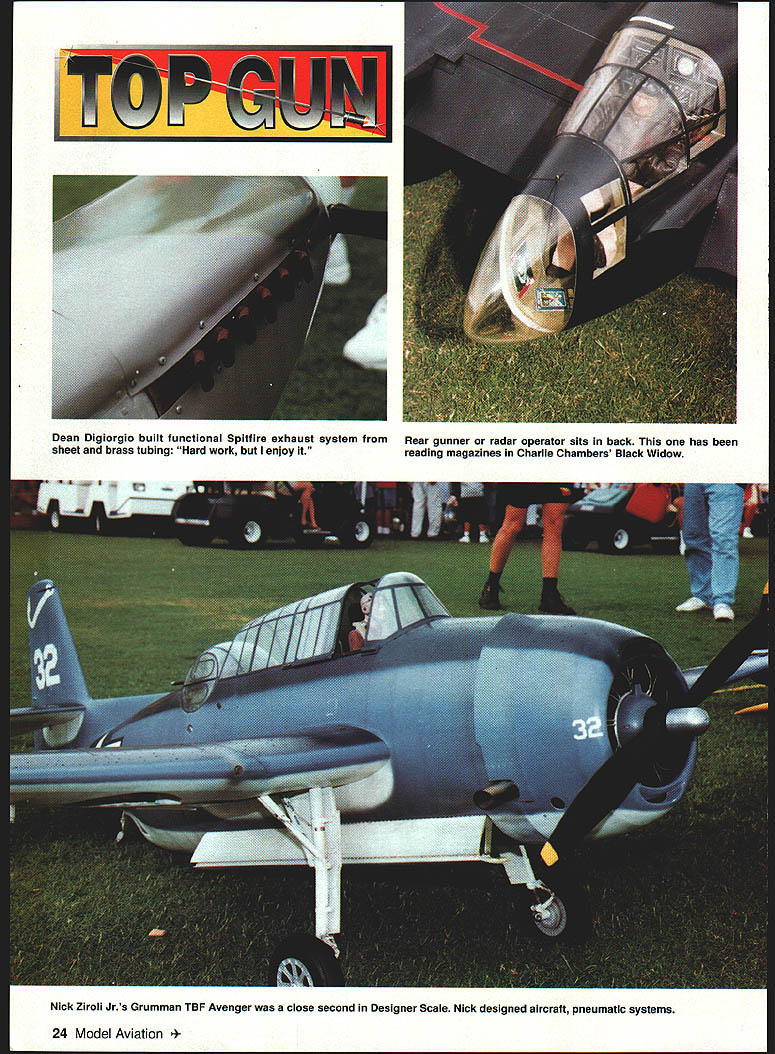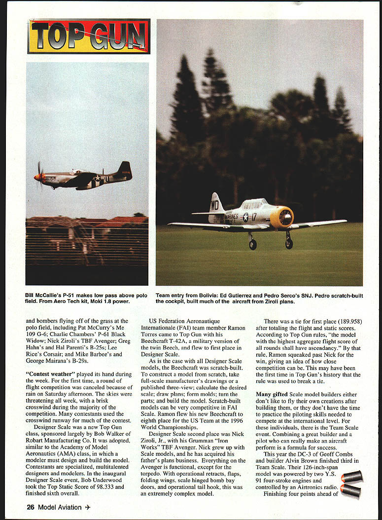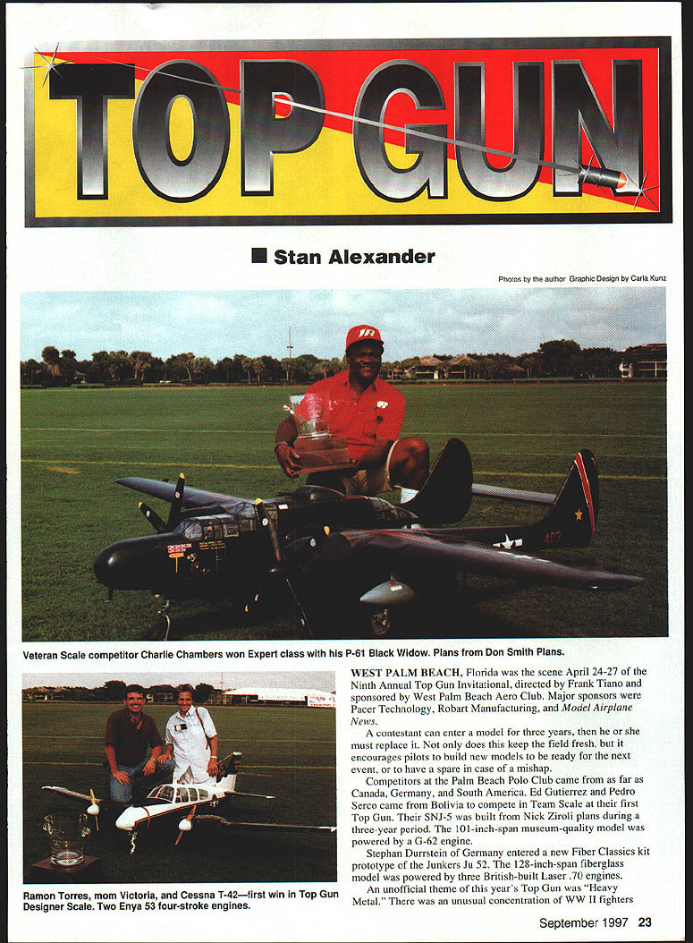 Photos author Graphic Design Carla Kunz Veteran Scale competitor Charlie Chambers won Expert class P-61 Black Widow Plans Don Smith Plans WEST PALM BEACH Florida scene April 24-27 Ninth Annual Top Gun Invitational directed Frank Tiano sponsored West Palm Beach Aero Club Major sponsors Pacer Technology Robart Manufacturing Model Airplane News contestant can enter model three years must replace does keep field fresh encourages pilots build new models ready next event have spare case mishap Competitors Palm Beach Polo Club came far Canada Germany South America Ed Gutierrez Pedro Serco came Bolivia compete Team Scale first Top Gun SNJ-5 built Nick Ziroli plans during three-year period 101-inch-span museum-quality model powered G-62 engine Stephan Durrstein Germany entered new Fiber Classics kit prototype Junkers Ju 52 128-inch-span fiberglass model powered three British-built Laser 70 engines An unofficial theme years Top Gun Heavy Metal unusual concentration WW II fighters September 1997 23 U Stan Alexander Ramon Torres mom Victoria Cessna T-42first win Top Gun Designer Scale Two Enya 53 four-stroke engines ick Ziroli Jrs Grumman TBF Avenger close second Designer Scale Nick designed aircraft pneumatic systems 24 Model Aviation Digiorgio built functional Spitfire exhaust system Rear gunner radar operator sits back has sheet brass tubing Hard work enjoy reading magazines Charlie Chambers Black Widow Dean & Dm0 Digiorgios Team Scale entry Spitfire Fiber Classics kit Highly detailed complete lighting system including gunsight September 1997 25 Team Scale second-place winners won last year Pilot Dave Patrick builder Graeme Mears combined skills DH82 Tigermoth First time Team Scalefifth place Ron Buran Paul Donofrio Craftsmanship Judge Wayne Frederick judges Tom Czicks entered WACO YKS-7 Biplane has 99-inch span D&B 37 power P-47 component fit overall finish attention detail bombers flying off grass poio field including Pat McCurrys 109 G-6 Charlie Chambers P-61 Black Widow Nick Zirolis TBF Avenger Greg Hahns Hal Parentis B-25s Lee Rices Corsair Mike Barbees George Mairanas B-29s Contest weather played its hand during week first time round flight competition canceled because rain Saturday afternoon skies threatening week brisk crosswind during majority competition contestants used crosswind runway much contest Designer Scale new Top Gun class sponsored largely Bob Walker Robart Manufacturing Co adopted similar Academy Model Aeronautics AMA class modeler must design build model Contestants specialized multitalented designers modelers inaugural Designer Scale event Bob Underwood took Top Static Score 98333 finished sixth overall US Federation Aeronautique Internationale FAI team member Ramon Tones came Top Gun Beechcraft T-42A military version twin Beech flew first place Designer Scale As case Designer Scale models Beechcraft scratch-built construct model scratch take full-scale manufacturers drawings published three-view calculate desired scale draw plans form molds turn parts build model Scratch-built models can very competitive FAI Scale Ramon flew new Beechcraft eighth place US Team 1996 World Championships Designer Scale second place Nick Ziroli Jr Grumman Iron Works TBF Avenger Nick grew up Scale models has acquired fathers plans business Everything Avenger functional except torpedo operational retracts flaps folding wings scale hinged bomb bay doors operational tail hook extremely complex model tie first place 189958 after totaling flight static scores According Top Gun rules model highest aggregate flight score rounds shall have ascendancy rule Ramon squeaked past Nick win giving idea close competition can may have first time Top Guns history rule used break tie gifted Scale model builders either dont like fly own creations after building dont have time practice piloting skills needed compete international level individuals Team Scale event Combining great builder pilot can really make aircraft perform formula success year DC-3 Geoff Combs builder Alvin Brown finished third Team Scale 126-inch-span model powered two YS 91 four-stroke engines controlled Airtronics radio Finishing four points ahead 26 Model Aviation McCalIies P-51 makes low pass above polo field Aero Tech kit Moki 18 power Team entry Bolivia Ed Gutierrez Pedro Sercos SNJ Pedro scratch-built cockpit built much aircraft Ziroli plans Brown Combs pilot Dave Patrick builder Graeme Mears flew /3-scale Tiger Moth model took awards Best Biplane Best Two-Stroke Performance powered Moki 36 detail finish scale flight performance breezy crosswind large lightly loaded model impressive years Team Scale winners no strangers first-place trophies Pilot Bob Violett builder Jerry Caudle teamed Bob Violett Models F-80 TV-i finish 267 ahead Patrick/Mears BVM JPX turbine propane-powered jet very stable quiet flight performance fast impressive model 72-inch wingspan weighed 20 pounds complemented retracts flaps wheel brakes scale speed brake persons Scale competition much social function contest Top Gun cocktail parties dinner-dance Saturday night provide chance see old friends catch up others activities families Top Gun special awards given out dinner top static scores class Static store top honors went Kim Fosters Sopwith Pup Expert class Bob Underwoods Hyperbipe Designer Scale Jerry Caudles F-80 TV-i Team Scale contestant received radio system check $200 Bob Underwood donated money US FAL Scale Team Fund team will compete South Africa 1998 build model kit someones plans semikit fly model yourself could invited enter Top Guns Expert class has largest number entries32 63 total entries year Several first-time Top Gun entries included Mike Brewer flying -scale Aeronca LC Al Kretz flying Dornier 23G German bomber Randy Hansen Cessna A-188 AGWagon several new Expert models year some teething RADIO SOUTH INC September1997 27 PRO-DRIVER Contains 4 1300 mah battery cells senses plug fouled & boosts power LED bar garaph meter display plug condition Suppor
