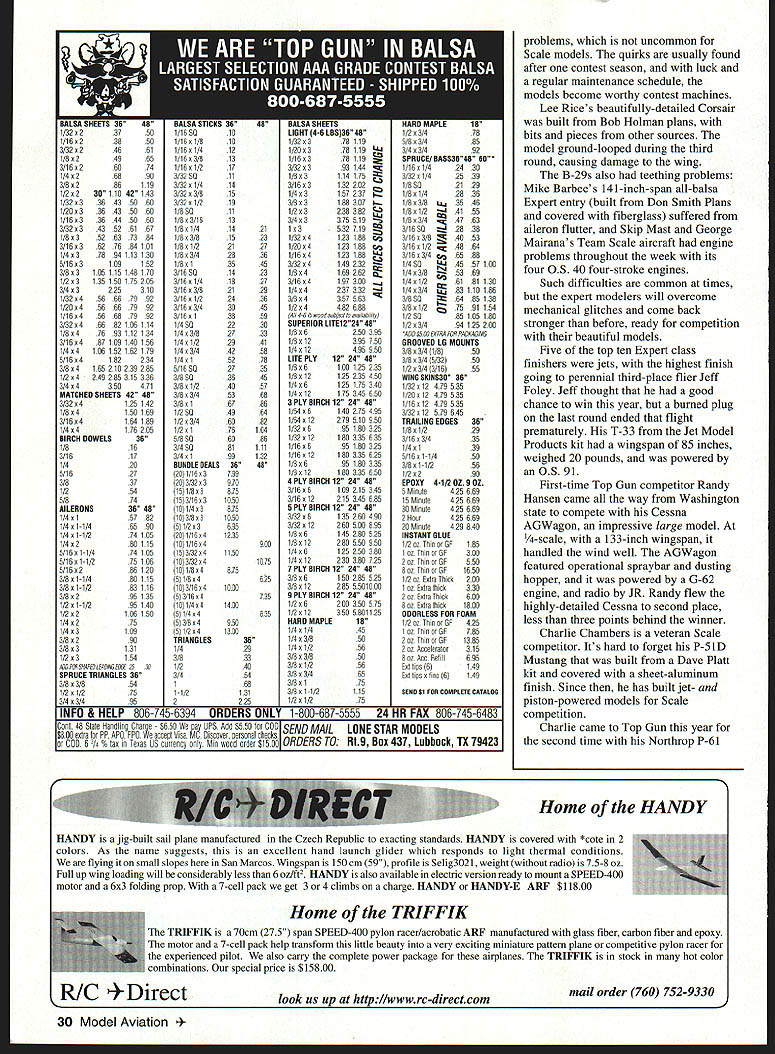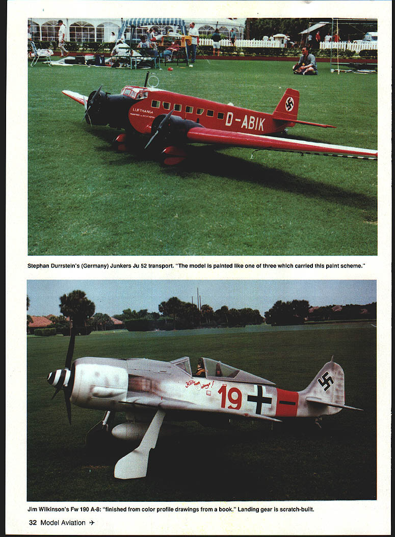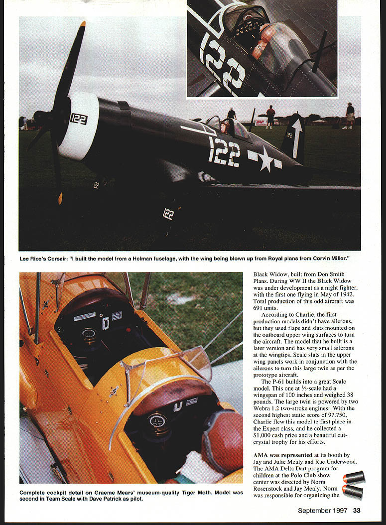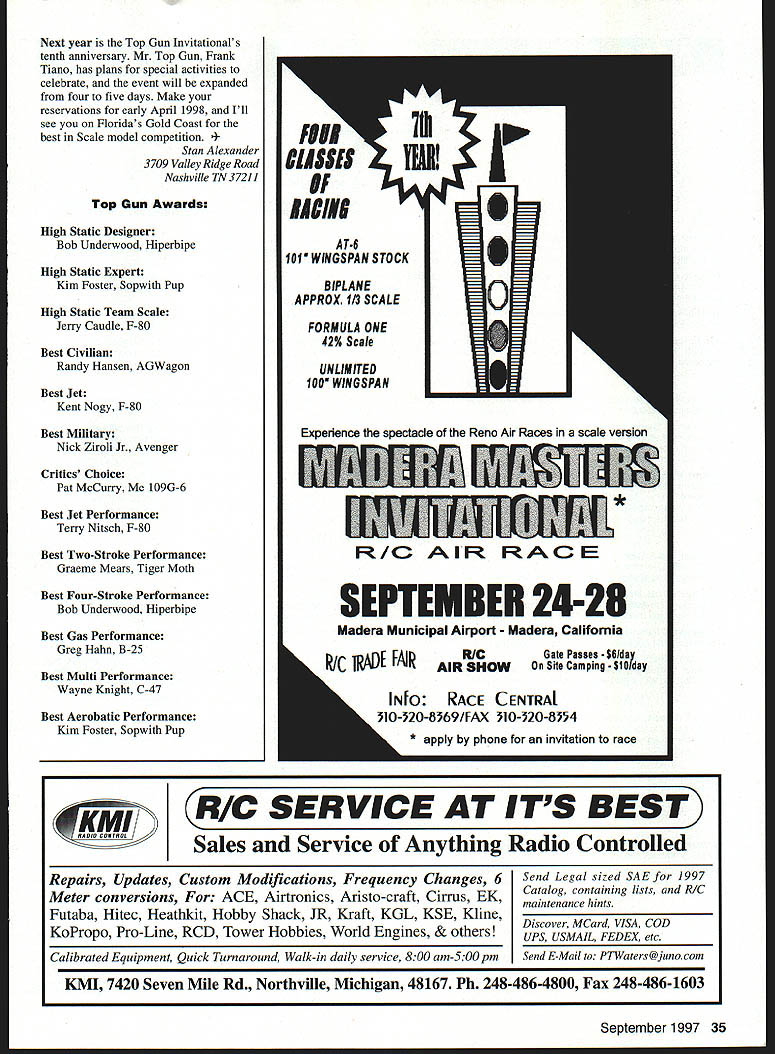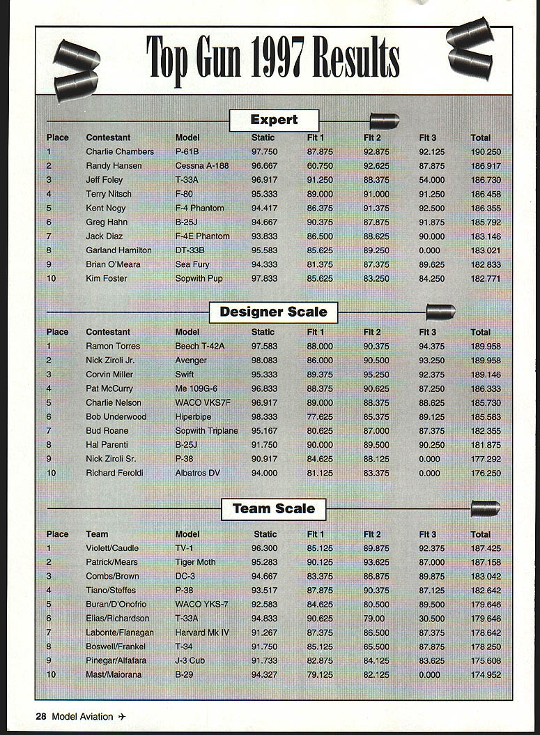 Photos author Graphic Design Carla Kunz Veteran Scale competitor Charlie Chambers won Expert class P-61 Black Widow Plans Don Smith Plans WEST PALM BEACH Florida scene April 24-27 Ninth Annual Top Gun Invitational directed Frank Tiano sponsored West Palm Beach Aero Club Major sponsors Pacer Technology Robart Manufacturing Model Airplane News contestant can enter model three years must replace does keep field fresh encourages pilots build new models ready next event have spare case mishap Competitors Palm Beach Polo Club came far Canada Germany South America Ed Gutierrez Pedro Serco came Bolivia compete Team Scale first Top Gun SNJ-5 built Nick Ziroli plans during three-year period 101-inch-span museum-quality model powered G-62 engine Stephan Durrstein Germany entered new Fiber Classics kit prototype Junkers Ju 52 128-inch-span fiberglass model powered three British-built Laser 70 engines An unofficial theme years Top Gun Heavy Metal unusual concentration WW II fighters September 1997 23 U Stan Alexander Ramon Torres mom Victoria Cessna T-42first win Top Gun Designer Scale Two Enya 53 four-stroke engines ick Ziroli Jrs Grumman TBF Avenger close second Designer Scale Nick designed aircraft pneumatic systems 24 Model Aviation Digiorgio built functional Spitfire exhaust system Rear gunner radar operator sits back has sheet brass tubing Hard work enjoy reading magazines Charlie Chambers Black Widow Dean & Dm0 Digiorgios Team Scale entry Spitfire Fiber Classics kit Highly detailed complete lighting system including gunsight September 1997 25 Team Scale second-place winners won last year Pilot Dave Patrick builder Graeme Mears combined skills DH82 Tigermoth First time Team Scalefifth place Ron Buran Paul Donofrio Craftsmanship Judge Wayne Frederick judges Tom Czicks entered WACO YKS-7 Biplane has 99-inch span D&B 37 power P-47 component fit overall finish attention detail bombers flying off grass poio field including Pat McCurrys 109 G-6 Charlie Chambers P-61 Black Widow Nick Zirolis TBF Avenger Greg Hahns Hal Parentis B-25s Lee Rices Corsair Mike Barbees George Mairanas B-29s Contest weather played its hand during week first time round flight competition canceled because rain Saturday afternoon skies threatening week brisk crosswind during majority competition contestants used crosswind runway much contest Designer Scale new Top Gun class sponsored largely Bob Walker Robart Manufacturing Co adopted similar Academy Model Aeronautics AMA class modeler must design build model Contestants specialized multitalented designers modelers inaugural Designer Scale event Bob Underwood took Top Static Score 98333 finished sixth overall US Federation Aeronautique Internationale FAI team member Ramon Tones came Top Gun Beechcraft T-42A military version twin Beech flew first place Designer Scale As case Designer Scale models Beechcraft scratch-built construct model scratch take full-scale manufacturers drawings published three-view calculate desired scale draw plans form molds turn parts build model Scratch-built models can very competitive FAI Scale Ramon flew new Beechcraft eighth place US Team 1996 World Championships Designer Scale second place Nick Ziroli Jr Grumman Iron Works TBF Avenger Nick grew up Scale models has acquired fathers plans business Everything Avenger functional except torpedo operational retracts flaps folding wings scale hinged bomb bay doors operational tail hook extremely complex model tie first place 189958 after totaling flight static scores According Top Gun rules model highest aggregate flight score rounds shall have ascendancy rule Ramon squeaked past Nick win giving idea close competition can may have first time Top Guns history rule used break tie gifted Scale model builders either dont like fly own creations after building dont have time practice piloting skills needed compete international level individuals Team Scale event Combining great builder pilot can really make aircraft perform formula success year DC-3 Geoff Combs builder Alvin Brown finished third Team Scale 126-inch-span model powered two YS 91 four-stroke engines controlled Airtronics radio Finishing four points ahead 26 Model Aviation McCalIies P-51 makes low pass above polo field Aero Tech kit Moki 18 power Team entry Bolivia Ed Gutierrez Pedro Sercos SNJ Pedro scratch-built cockpit built much aircraft Ziroli plans Brown Combs pilot Dave Patrick builder Graeme Mears flew /3-scale Tiger Moth model took awards Best Biplane Best Two-Stroke Performance powered Moki 36 detail finish scale flight performance breezy crosswind large lightly loaded model impressive years Team Scale winners no strangers first-place trophies Pilot Bob Violett builder Jerry Caudle teamed Bob Violett Models F-80 TV-i finish 267 ahead Patrick/Mears BVM JPX turbine propane-powered jet very stable quiet flight performance fast impressive model 72-inch wingspan weighed 20 pounds complemented retracts flaps wheel brakes scale speed brake persons Scale competition much social function contest Top Gun cocktail parties dinner-dance Saturday night provide chance see old friends catch up others activities families Top Gun special awards given out dinner top static scores class Static store top honors went Kim Fosters Sopwith Pup Expert class Bob Underwoods Hyperbipe Designer Scale Jerry Caudles F-80 TV-i Team Scale contestant received radio system check $200 Bob Underwood donated money US FAL Scale Team Fund team will compete South Africa 1998 build model kit someones plans semikit fly model yourself could invited enter Top Guns Expert class has largest number entries32 63 total entries year Several first-time Top Gun entries included Mike Brewer flying -scale Aeronca LC Al Kretz flying Dornier 23G German bomber Randy Hansen Cessna A-188 AGWagon several new Expert models year some teething RADIO SOUTH INC September1997 27 PRO-DRIVER Contains 4 1300 mah battery cells senses plug fouled & boosts power LED bar garaph meter display plug condition Suppor