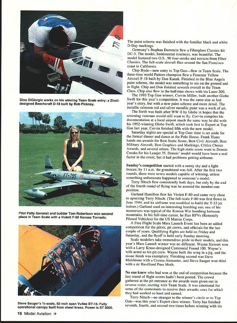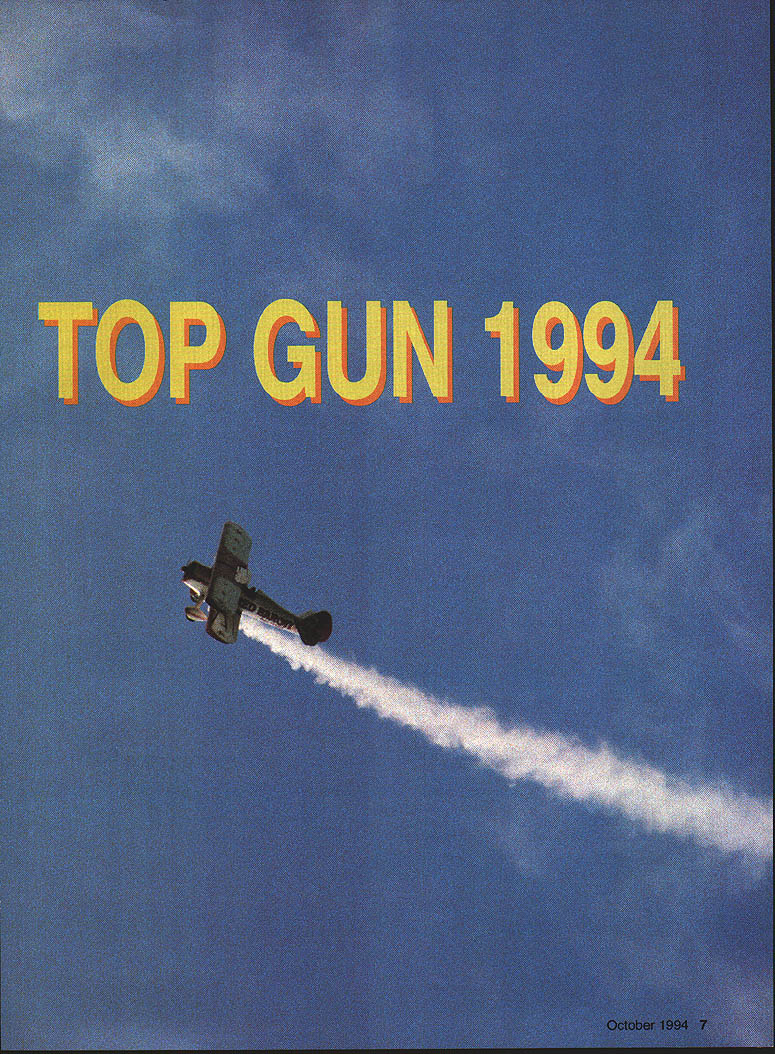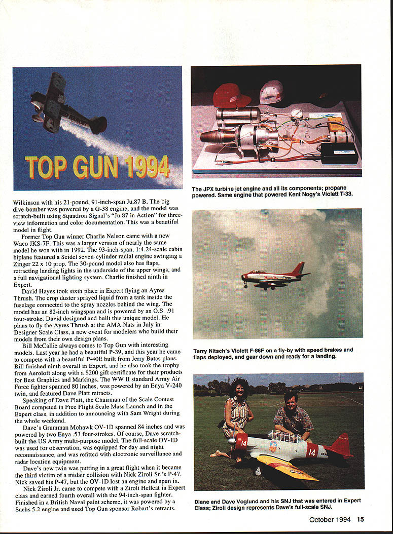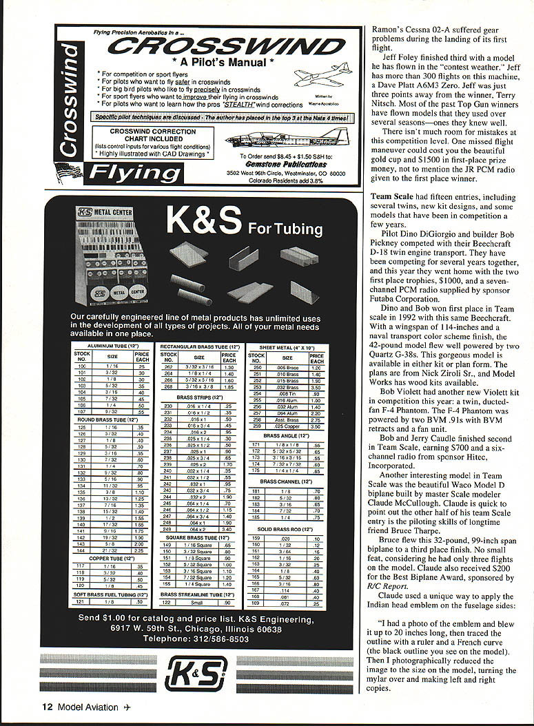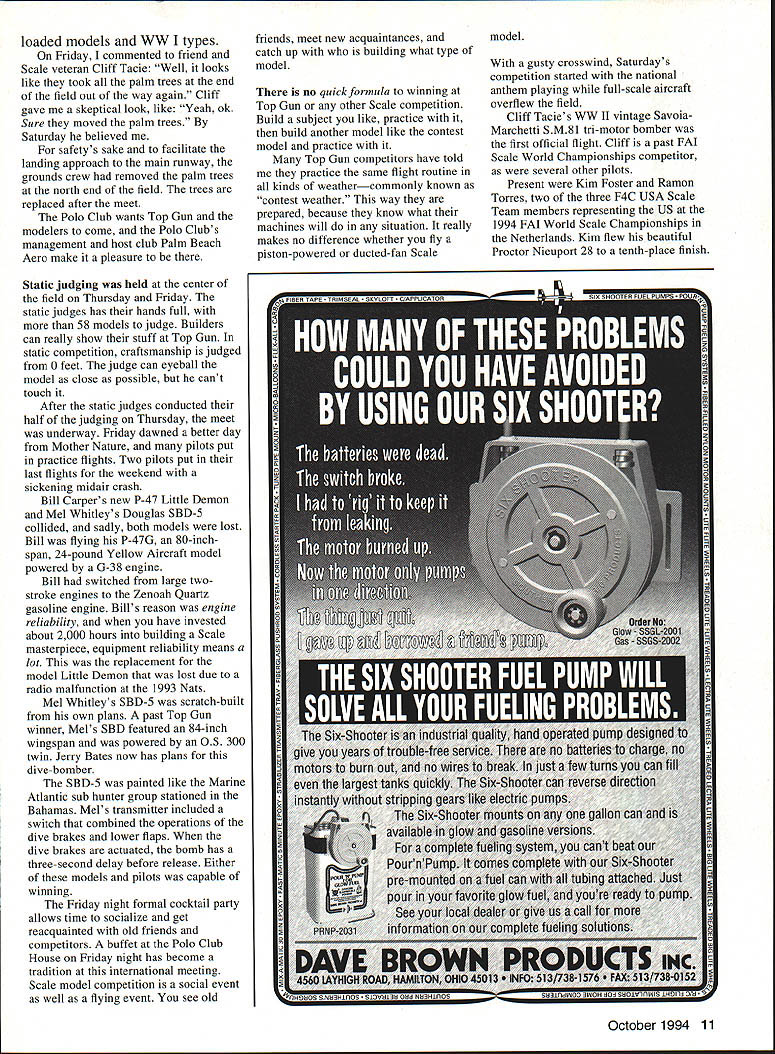 NO OCR TEXT uners 1/4 042 pow n teem th m cyst buIlt T B Ins pei coven grou Ut eet 14 C isthiofdre Frank wan reases ea Lundersto made F Thursday pr rain wind r NO OCR TEXT loaded models WW types Friday commented friend Scale veteran Cliff Tacie Well looks like took palm trees end field out way again Cliff gave skeptical look like Yeah ok Sure moved palm trees Saturday believed safetys sake facilitate landing approach main runway grounds crew removed palm trees north end field trees replaced after meet Polo Club wants Top Gun modelers come Polo Clubs management host club Palm Beach Aero make pleasure friends meet new acquaintances catch up building what type model no quick formula winning Top Gun other Scale competition Build subject like practice build another model like contest model practice Top Gun competitors have told practice same flight routine kinds weathercommonly known contest weather way prepared because know what machines will situation really makes no difference whether fly piston-powered ducted-fan Scale model gusty crosswind Saturdays competition started national anthem playing full-scale aircraft overfiew field Cliff Tacies WW II vintage Savoia Marchetti SM8 1 tn-motor bomber first official flight Cliff past FAL Scale World Championships competitor several other pilots Present Kim Foster Ramon Tomes two three F4C USA Scale Team members representing US 1994 FAI World Scale Championships Netherlands Kim flew beautiful Proctor Nieuport 28 tenth-place finish Static judging held center field Thursday Friday static judges has hands full 58 models judge Builders can really show stuff Top Gun static competition craftsmanship judged 0 feet judge can eyeball model close possible cant touch After static judges conducted half judging Thursday meet underway Friday dawned better day Mother Nature pilots put practice flights Two pilots put last flights weekend sickening midair crash Bill Carpers new P-47 Little Demon Mel Whitleys Douglas SBD-5 collided sadly both models lost Bill flying P-47G 80-inchspan 24-pound Yellow Aircraft model powered G-38 engine Bill switched large twostroke engines Zenoah Quartz gasoline engine Bills reason engine reliability have invested about 2000 hours building Scale masterpiece equipment reliability means lot replacement model Little Demon lost due radio malfunction 1993 Nats Mel Whitleys SBD-5 scratch-built own plans past Top Gun winner Mels SBD featured 84-inch wingspan powered 0S 300 twin Jerry Bates now has plans dive-bomber SBD-5 painted like Marine Atlantic sub hunter group stationed Bahamas Mels transmitter included switch combined operations dive brakes lower flaps dive brakes actuated bomb has three-second delay before release Either models pilots capable winning Friday night formal cocktail party allows time socialize get reacquainted old friends competitors buffet Polo Club House Friday night has become tradition international meeting Scale model competition social event well flying event see old October1994 11 U Flying Precision Aerobatics * Pilots Manual * * For competition sport flyers pilots want fly safer crosswinds big bird pilots like fly ciaaiy crosswinds sport flyers want improve flying crosswinds pilots want learn pros TH* wind correct o s #tPPi1df fhflhttiet*w se Th rhepbciA tdtp 3ettheAtet4 lIewI L CROSSWIND CORRECTION CHART INCLUDED lusts control inputs various flight conditionsi Highly illustrated CAD Drawings Order send $a45 S&H ewsftae P#Mkwtloas 3502 West 96th Circle Westminster CO a0030 Cot orado Residents add 3a% Ramons Cessna 02-A suffered gear problems during landing its first flight Jeff Foley finished third model has flown contest weather Jeff has 300 flights machine Dave Platt A6M3 Zero Jeff just three points away winner Terry Nitsch Most past Top Gun winners have flown models used over several seasonsones knew well isnt much room mistakes competition level missed flight maneuver could cost beautiful gold cup $1500 first-place prize money mention JR PCM radio given first place winner Team Scale fifteen entries including several twins new kit designs some models have competition few years Pilot Dino DiGiorgio builder Bob Pickney competed Beechcraft D- 18 twin engine transport have competing several years together year went home two first place trophies $1000 sevenchannel PCM radio supplied sponsor Futaba Corporation Dino Bob won first place Team scale 1992 same Beechcraft wingspan 114-inches naval transport color scheme finish 42-pound model flew well powered two Quartz G-38s gorgeous model available either kit plan form plans Nick Ziroli Sr Model Works has wood kits available Bob Violett another new Violett kit competition year twin ducted fan F-4 Phantom F-4 Phantom powered two BVM 91s BVM retracts fan unit Bob Jerry Caudle finished second Team Scale earning $700 sixchannel radio sponsor Hitec Incorporated Another interesting model Team Scale beautiful Waco Model D biplane built master Scale modeler Claude McCullough Claude quick point out other half team Scale entry piloting skills longtime friend Bruce Tharpe Bruce flew 32-pound 99-inch span biplane third place finish No small feat considering three flights model Claude also received $200 Best Biplane Award sponsored RIC Report Claude used unique way apply Indian head emblem fuselage sides photo emblem blew up 20 inches long traced outline ruler French curve black outline see model photographically reduced image size model turning mylar over making left right copies 12 Model Aviation Aeroloft Decals Incorporated make decals black outline both sides model white primer slapped outline decal paint-by-number set took airbrush frisket paper brush small parts color paint between lines goof up some black outlines see So took another black decal slapped over color part top color bottom main problem using Aeroloft decals finish model dont recommend using decals dope Dope will dissolve over years have developed system dusting very light coat dope letting dry putting another dus