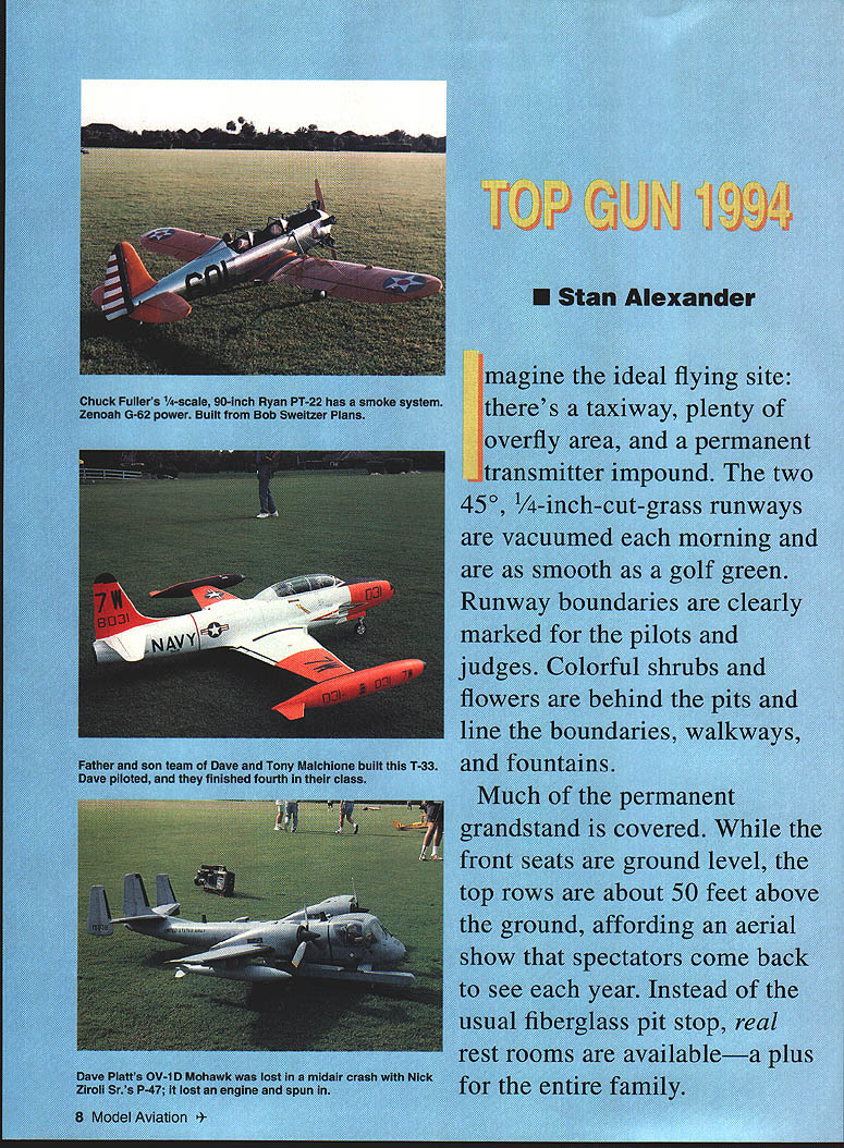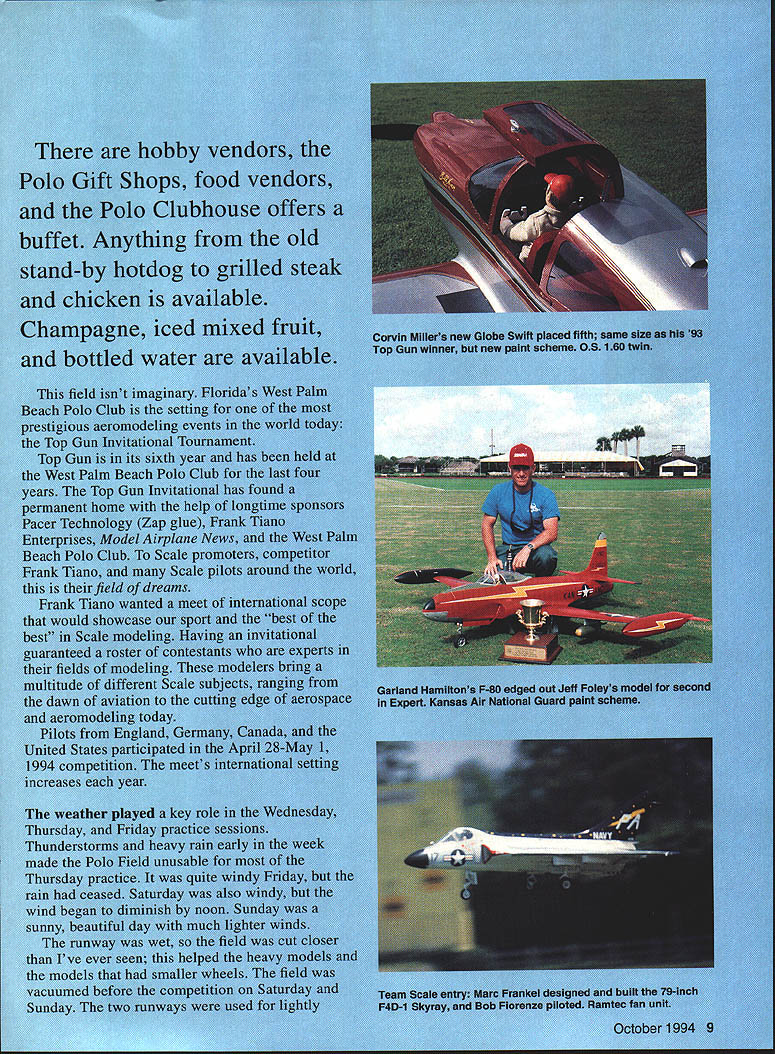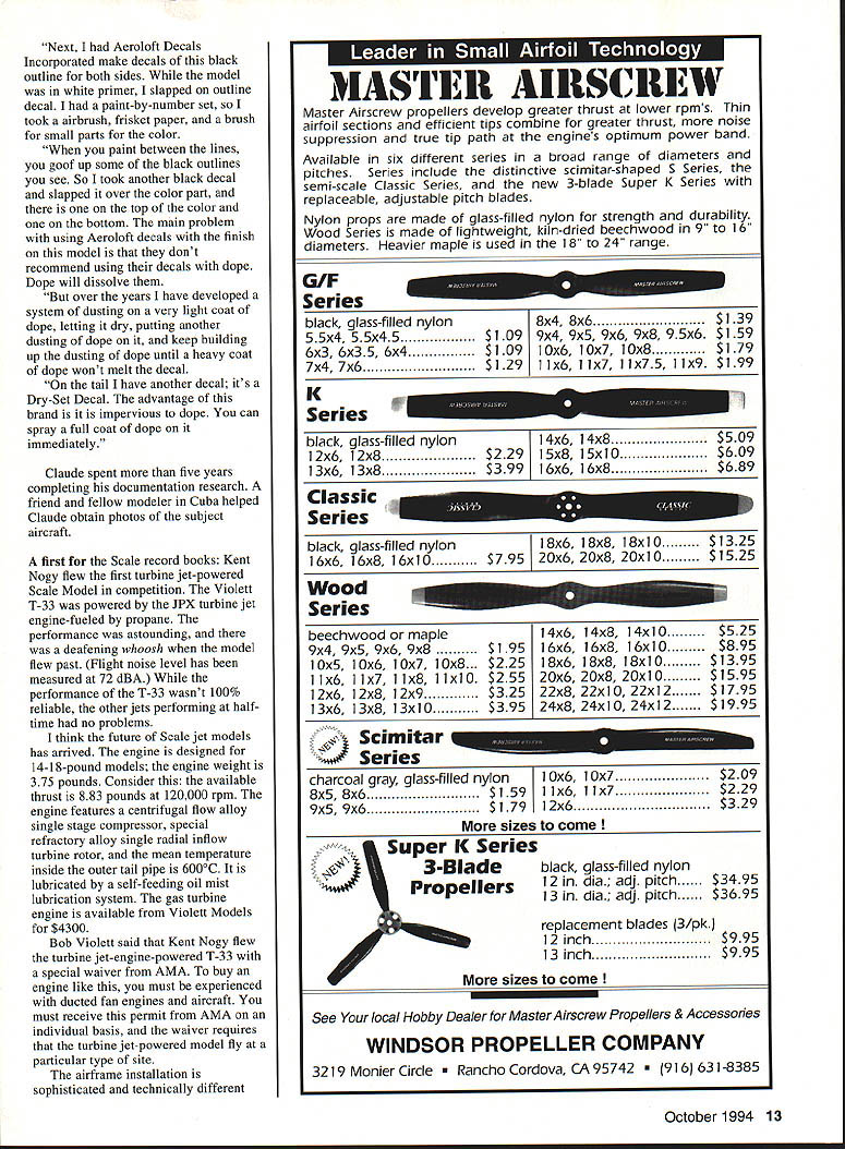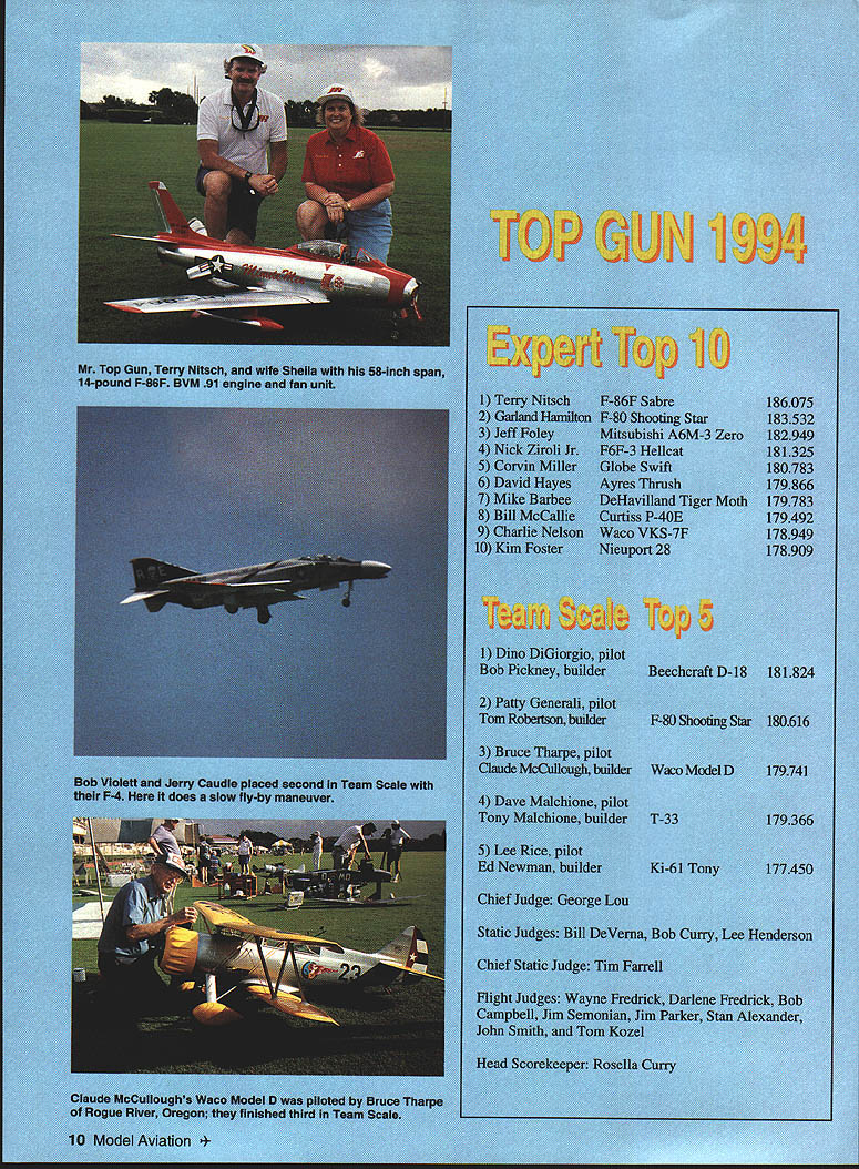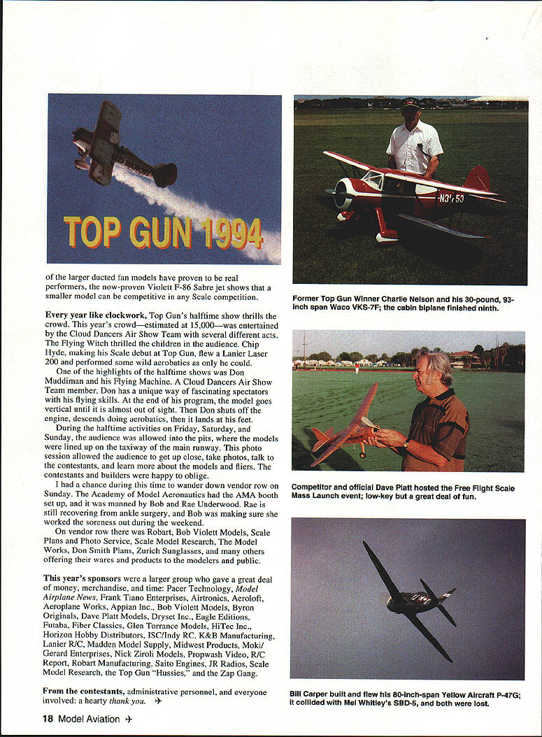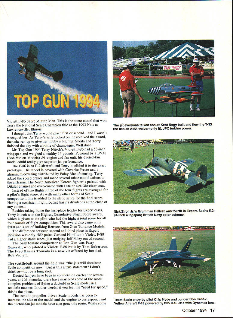 NO OCR TEXT uners 1/4 042 pow n teem th m cyst buIlt T B Ins pei coven grou Ut eet 14 C isthiofdre Frank wan reases ea Lundersto made F Thursday pr rain wind r NO OCR TEXT loaded models WW types Friday commented friend Scale veteran Cliff Tacie Well looks like took palm trees end field out way again Cliff gave skeptical look like Yeah ok Sure moved palm trees Saturday believed safetys sake facilitate landing approach main runway grounds crew removed palm trees north end field trees replaced after meet Polo Club wants Top Gun modelers come Polo Clubs management host club Palm Beach Aero make pleasure friends meet new acquaintances catch up building what type model no quick formula winning Top Gun other Scale competition Build subject like practice build another model like contest model practice Top Gun competitors have told practice same flight routine kinds weathercommonly known contest weather way prepared because know what machines will situation really makes no difference whether fly piston-powered ducted-fan Scale model gusty crosswind Saturdays competition started national anthem playing full-scale aircraft overfiew field Cliff Tacies WW II vintage Savoia Marchetti SM8 1 tn-motor bomber first official flight Cliff past FAL Scale World Championships competitor several other pilots Present Kim Foster Ramon Tomes two three F4C USA Scale Team members representing US 1994 FAI World Scale Championships Netherlands Kim flew beautiful Proctor Nieuport 28 tenth-place finish Static judging held center field Thursday Friday static judges has hands full 58 models judge Builders can really show stuff Top Gun static competition craftsmanship judged 0 feet judge can eyeball model close possible cant touch After static judges conducted half judging Thursday meet underway Friday dawned better day Mother Nature pilots put practice flights Two pilots put last flights weekend sickening midair crash Bill Carpers new P-47 Little Demon Mel Whitleys Douglas SBD-5 collided sadly both models lost Bill flying P-47G 80-inchspan 24-pound Yellow Aircraft model powered G-38 engine Bill switched large twostroke engines Zenoah Quartz gasoline engine Bills reason engine reliability have invested about 2000 hours building Scale masterpiece equipment reliability means lot replacement model Little Demon lost due radio malfunction 1993 Nats Mel Whitleys SBD-5 scratch-built own plans past Top Gun winner Mels SBD featured 84-inch wingspan powered 0S 300 twin Jerry Bates now has plans dive-bomber SBD-5 painted like Marine Atlantic sub hunter group stationed Bahamas Mels transmitter included switch combined operations dive brakes lower flaps dive brakes actuated bomb has three-second delay before release Either models pilots capable winning Friday night formal cocktail party allows time socialize get reacquainted old friends competitors buffet Polo Club House Friday night has become tradition international meeting Scale model competition social event well flying event see old October1994 11 U Flying Precision Aerobatics * Pilots Manual * * For competition sport flyers pilots want fly safer crosswinds big bird pilots like fly ciaaiy crosswinds sport flyers want improve flying crosswinds pilots want learn pros TH* wind correct o s #tPPi1df fhflhttiet*w se Th rhepbciA tdtp 3ettheAtet4 lIewI L CROSSWIND CORRECTION CHART INCLUDED lusts control inputs various flight conditionsi Highly illustrated CAD Drawings Order send $a45 S&H ewsftae P#Mkwtloas 3502 West 96th Circle Westminster CO a0030 Cot orado Residents add 3a% Ramons Cessna 02-A suffered gear problems during landing its first flight Jeff Foley finished third model has flown contest weather Jeff has 300 flights machine Dave Platt A6M3 Zero Jeff just three points away winner Terry Nitsch Most past Top Gun winners have flown models used over several seasonsones knew well isnt much room mistakes competition level missed flight maneuver could cost beautiful gold cup $1500 first-place prize money mention JR PCM radio given first place winner Team Scale fifteen entries including several twins new kit designs some models have competition few years Pilot Dino DiGiorgio builder Bob Pickney competed Beechcraft D- 18 twin engine transport have competing several years together year went home two first place trophies $1000 sevenchannel PCM radio supplied sponsor Futaba Corporation Dino Bob won first place Team scale 1992 same Beechcraft wingspan 114-inches naval transport color scheme finish 42-pound model flew well powered two Quartz G-38s gorgeous model available either kit plan form plans Nick Ziroli Sr Model Works has wood kits available Bob Violett another new Violett kit competition year twin ducted fan F-4 Phantom F-4 Phantom powered two BVM 91s BVM retracts fan unit Bob Jerry Caudle finished second Team Scale earning $700 sixchannel radio sponsor Hitec Incorporated Another interesting model Team Scale beautiful Waco Model D biplane built master Scale modeler Claude McCullough Claude quick point out other half team Scale entry piloting skills longtime friend Bruce Tharpe Bruce flew 32-pound 99-inch span biplane third place finish No small feat considering three flights model Claude also received $200 Best Biplane Award sponsored RIC Report Claude used unique way apply Indian head emblem fuselage sides photo emblem blew up 20 inches long traced outline ruler French curve black outline see model photographically reduced image size model turning mylar over making left right copies 12 Model Aviation Aeroloft Decals Incorporated make decals black outline both sides model white primer slapped outline decal paint-by-number set took airbrush frisket paper brush small parts color paint between lines goof up some black outlines see So took another black decal slapped over color part top color bottom main problem using Aeroloft decals finish model dont recommend using decals dope Dope will dissolve over years have developed system dusting very light coat dope letting dry putting another dus