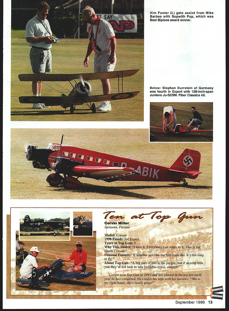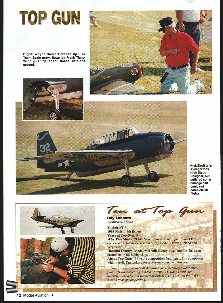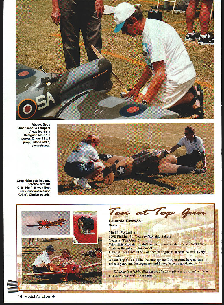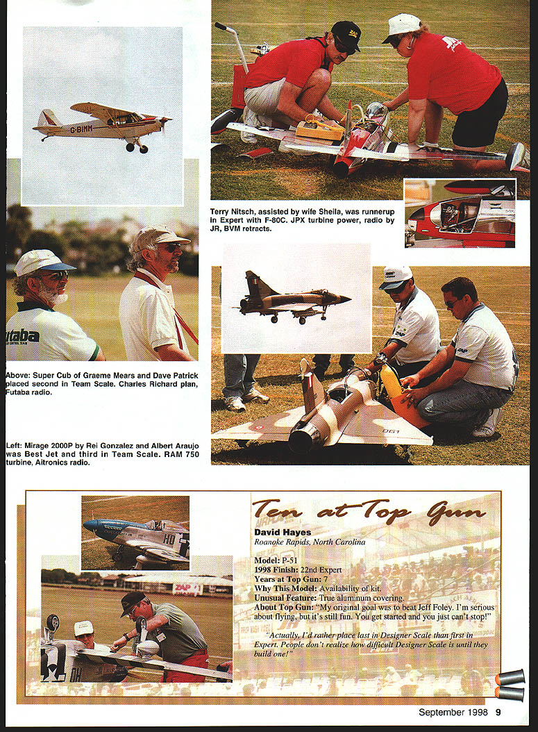 Text continues page 19 %k d14~ wepops4v 9CA4 W O4di4M4iO1A44 0/61 tenth Top Gun Invitational held Apnl 22 1998 Palm Beach FL Polo Club field Expert Designer Team Scale classes flown Pacer Technology Model Airplane News platinum-level sponsors Charlie Chambers repeated 1997 Expert win outstanding P-61B Black Widow Jeff Foleys Me-109E-7 won Designer Scale Mariano Alfafara Dave Pinegar won Team Scale superb J-3 Cub third final Top Gun Charlies model accordance Three-Year Rule event ensures certain amount turnover models year Charlie contacted concerning possible donation model museum anyway its possible models distinguished flying career drawing close Any top ten competitors will tell flying win said think best competition Ten Top Gun seems theres almost always story behind construction flight Scale model Subjects arent just picked Team Scale victors Mariano Alfafara Dave Pinegar J-3 Cub Mike Gretz plan Span 86 inches weight 18 pounds r Charlie Chambers Wellington Model P 19S Ye Wi 8 Model Aviation 4Photos Author Jeff Foleys 86-inch-span Me-109E won Designer Scale Moki 18 power Menz 18 x 8 prop radio JR Plaft retracts Graphic Design carla Kunz Above Super Cub Graeme Mears Dave Patrick placed second Team Scale Charles Richard plan Futaba radio Left Mirage 2000P Rei Gonzalez Albert Araujo Best Jet third Team Scale RAM 750 turbine Aitronics radio eptemer rry Nitsch assisted wife Sheila runnerup Expert F-80C JPX turbine power radio JR BVM retracts Tom Polapinks Pfalz DiIIA third Designer its first contest Span 74 inches 14 pounds 05 120 Airtronics radio Sopwith Triplane Bud Roane fifth Designer Saito 150 18 x 8 prop Futaba radio scale 15 pounds Left WACO YKS-7 Randy Ott Paul Donofrio fourth Team Scale Span 99 inches 35 pounds Futaba radio 10 Model Aviation la Tweedy Retail Operations Director among staff members worked AMA exhibitor booth Above Jim Wilkinsons Fw 190 AS sixth Expert 0S 300 Futaba radio own retracts High Static Expert 0 C C z Left Roy Vailancourt second Designer /6-scale Fw 190 AS Q-65 power three-blade Zinger 24 x 10 prop September 1998 11 TOP GUN Right Wayne Siewert cranks up P-47 Team Scale entry flown Frank Tiano Wind gust pushed model ground 12 Model Aviation Foster L gets assist Mike Barbee Sopwith Pup Best Biplane award winner Below Stephan Durrstein Germany fourth Expert 128-inch-span Junkers Ju-521SM Fiber Classics kit eptemer irn 13 John Chevalier flew first flight Top Gun 98 Ryan STM voted Best Pre-WW II Aircraft z 0 Rich Feroldis kids hang cranks up Albatros Sixth Designer Sachs 58 power Futaba radio 35 pounds 14 Model Aviation is Rene Alvarez relaxes before flight new 1A-scale F-80C BYM 91 Viojett fan radio JR BVM retracts 16 pounds MiG-17 Ted Krzanowski Jim Hiller placed fifth Team Scale Golden West turbine 1h scale original design Charlie Chambers P-61 B Black Widow lands winning flight Expert less point ahead Terry Nitsch Greg Hahn gets some practice C-45 P-38 won Best Gas Performance Critics Choice awards Eduardo Esteves Brazil Model 1998 F Years Scale 16 Model Aviation e Sepp Uiberlachers Tempest V fourth Designer Moki 18 power Zinger 18 x 8 prop Futaba radio own retracts B-25 Bill FuorilJohn Tozser team last crash still Mike Stokes L Pete Ferris far right AMA Cub winners won High Static Team Best Craftsmanship awards Palm Beach Skyhawks members assisted program See Top Gun Results Focus CompetItIon Left Jim Sandquists T-34 crashed first flight finished 24th Expert OS 320 four-cylinder Futaba radio Robart retracts September 1998 17 Top Gun/Naught Continued page 8 chance some interesting models necessarily win particular contest So interviewed number pilots asked about models get some feelingthe emotioninvolved selection construction flight Ten pilots stories appear sidebars bottom pages Scoring combination models static score plus average best three four flights Designer Scale added attraction/difficulty models truly scratch-built design literally begins blank piece paper least nothing three-view offers added challenge incentive some modelers like show up something fairly unique said Pat McCuny 109 G 6 suffered mechanical problems did fly think airplane represents what fighter should small airframe big engine reasons fully explainable large number model casualties Interference unlikely possibility nearly cases some losses simple pilot error and/or nerves some result mechanical failure persistent gusty crosswind didnt help matters either Nick Ziroli Jrs Avenger among models damaged wind Greg Hahns Critics Choice-winning P-38 clearly victim battery failure Control became intermittent just seemed might able save model pitched up rolled over dove sad thing witness what helpless feeling must have Greg models representing two years work apiece prepare damage loss huge terms time effort money some extent final standings therefore represent able best handle situation conditions Perhaps says something Charlie Chambers does September 1998 19 DC Flight Training Beginner advanced tailored individual long-time modeler full size airplane flight instruc tor will make progress fun easy during week stay beautiful far western North Carolina Write call information RC Flight Training 1635 Setawig Rd Brasstown NC 28902 828-389-8968 have backup/practice model pilots P-61 has 160 flights can clearly handle just about anything model Charlie needed experience Teny Nitschs IPX turbine-powered Minute Men P-80 right heels entire contest Static scores less three-tenths point apart Charlies margin victory less point Both pilots used radios JR Unlike Team Scale entries modeler builds aircraft other flies B-25 Bill Fuon John Tozser true team effort built part model results joined later takes real commitment said John got results B-25 scored 10 Craftsmanship won High Static Team Best Craftsmanship awards contest airplane its Top Gun airplane judges know difference Ive loved model since ten years old said Bill stall shortly after takeoff caused considerable damage model resulted 14th-place finis