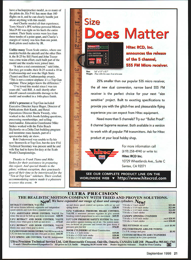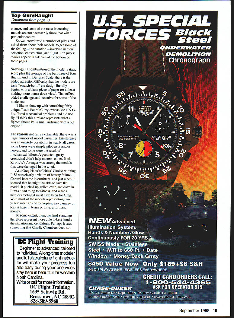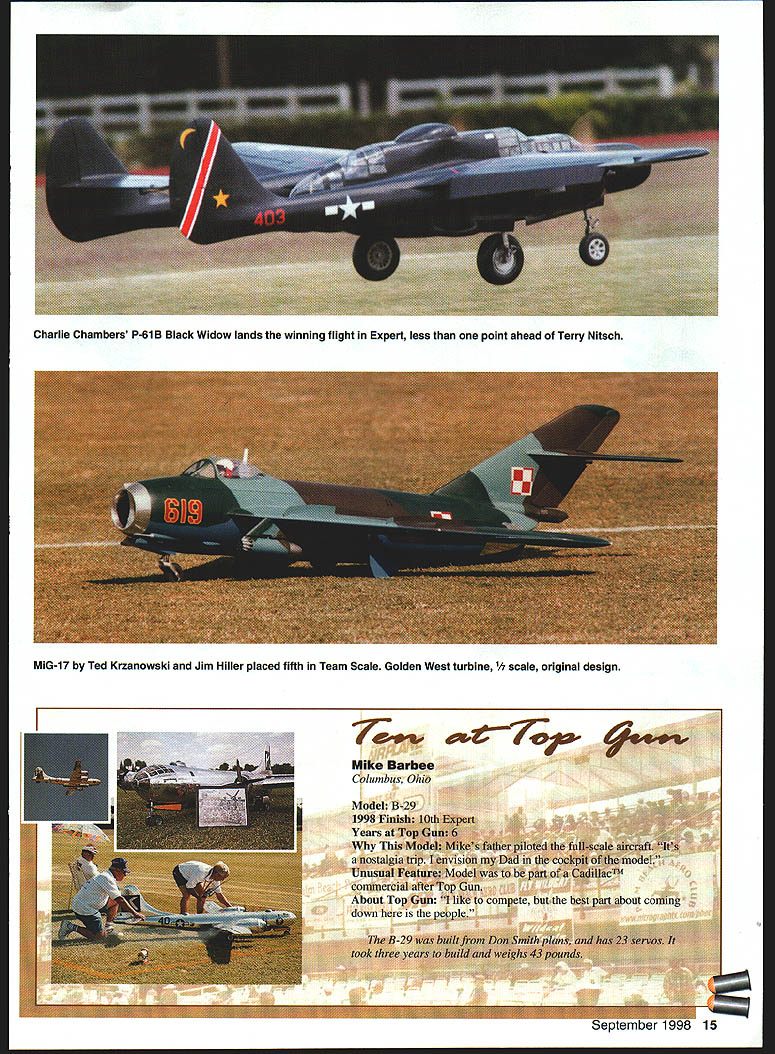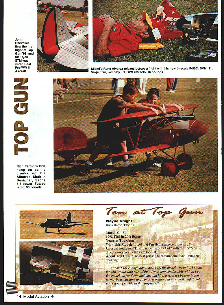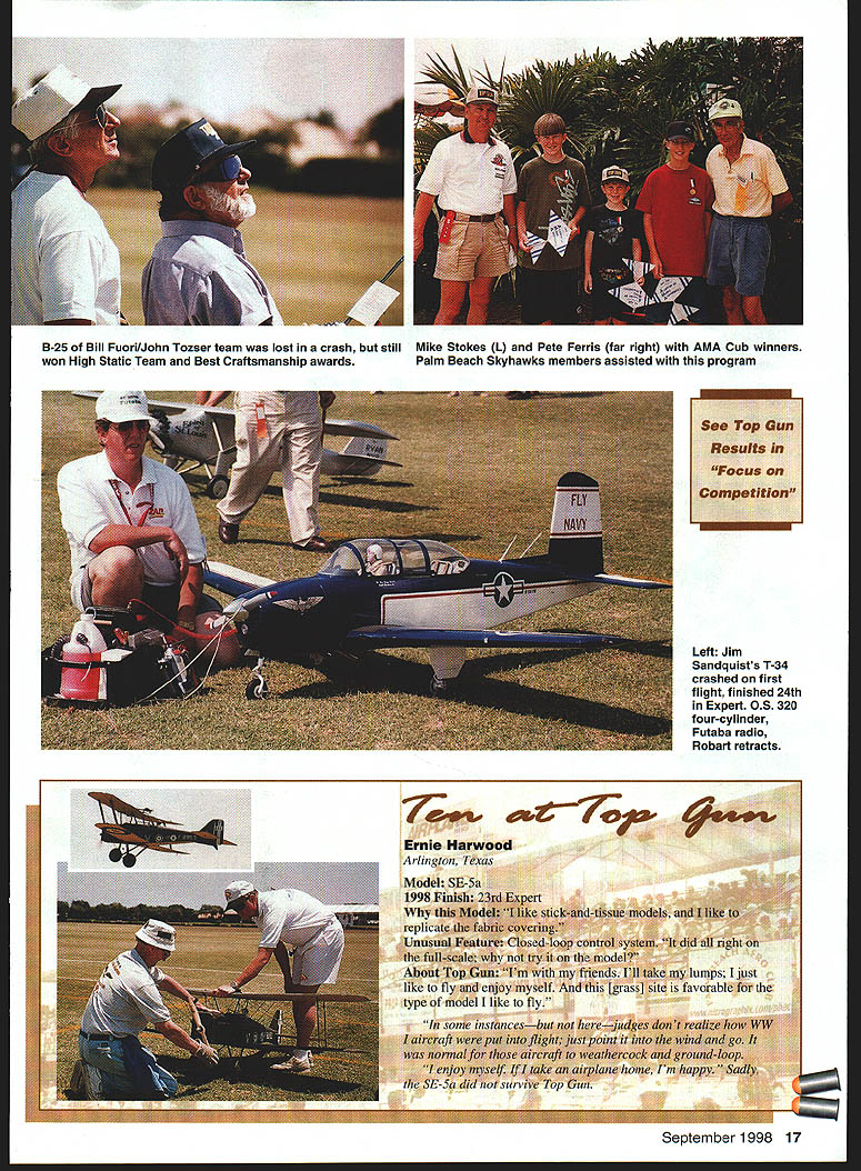 Text continues page 19 %k d14~ wepops4v 9CA4 W O4di4M4iO1A44 0/61 tenth Top Gun Invitational held Apnl 22 1998 Palm Beach FL Polo Club field Expert Designer Team Scale classes flown Pacer Technology Model Airplane News platinum-level sponsors Charlie Chambers repeated 1997 Expert win outstanding P-61B Black Widow Jeff Foleys Me-109E-7 won Designer Scale Mariano Alfafara Dave Pinegar won Team Scale superb J-3 Cub third final Top Gun Charlies model accordance Three-Year Rule event ensures certain amount turnover models year Charlie contacted concerning possible donation model museum anyway its possible models distinguished flying career drawing close Any top ten competitors will tell flying win said think best competition Ten Top Gun seems theres almost always story behind construction flight Scale model Subjects arent just picked Team Scale victors Mariano Alfafara Dave Pinegar J-3 Cub Mike Gretz plan Span 86 inches weight 18 pounds r Charlie Chambers Wellington Model P 19S Ye Wi 8 Model Aviation 4Photos Author Jeff Foleys 86-inch-span Me-109E won Designer Scale Moki 18 power Menz 18 x 8 prop radio JR Plaft retracts Graphic Design carla Kunz Above Super Cub Graeme Mears Dave Patrick placed second Team Scale Charles Richard plan Futaba radio Left Mirage 2000P Rei Gonzalez Albert Araujo Best Jet third Team Scale RAM 750 turbine Aitronics radio eptemer rry Nitsch assisted wife Sheila runnerup Expert F-80C JPX turbine power radio JR BVM retracts Tom Polapinks Pfalz DiIIA third Designer its first contest Span 74 inches 14 pounds 05 120 Airtronics radio Sopwith Triplane Bud Roane fifth Designer Saito 150 18 x 8 prop Futaba radio scale 15 pounds Left WACO YKS-7 Randy Ott Paul Donofrio fourth Team Scale Span 99 inches 35 pounds Futaba radio 10 Model Aviation la Tweedy Retail Operations Director among staff members worked AMA exhibitor booth Above Jim Wilkinsons Fw 190 AS sixth Expert 0S 300 Futaba radio own retracts High Static Expert 0 C C z Left Roy Vailancourt second Designer /6-scale Fw 190 AS Q-65 power three-blade Zinger 24 x 10 prop September 1998 11 TOP GUN Right Wayne Siewert cranks up P-47 Team Scale entry flown Frank Tiano Wind gust pushed model ground 12 Model Aviation Foster L gets assist Mike Barbee Sopwith Pup Best Biplane award winner Below Stephan Durrstein Germany fourth Expert 128-inch-span Junkers Ju-521SM Fiber Classics kit eptemer irn 13 John Chevalier flew first flight Top Gun 98 Ryan STM voted Best Pre-WW II Aircraft z 0 Rich Feroldis kids hang cranks up Albatros Sixth Designer Sachs 58 power Futaba radio 35 pounds 14 Model Aviation is Rene Alvarez relaxes before flight new 1A-scale F-80C BYM 91 Viojett fan radio JR BVM retracts 16 pounds MiG-17 Ted Krzanowski Jim Hiller placed fifth Team Scale Golden West turbine 1h scale original design Charlie Chambers P-61 B Black Widow lands winning flight Expert less point ahead Terry Nitsch Greg Hahn gets some practice C-45 P-38 won Best Gas Performance Critics Choice awards Eduardo Esteves Brazil Model 1998 F Years Scale 16 Model Aviation e Sepp Uiberlachers Tempest V fourth Designer Moki 18 power Zinger 18 x 8 prop Futaba radio own retracts B-25 Bill FuorilJohn Tozser team last crash still Mike Stokes L Pete Ferris far right AMA Cub winners won High Static Team Best Craftsmanship awards Palm Beach Skyhawks members assisted program See Top Gun Results Focus CompetItIon Left Jim Sandquists T-34 crashed first flight finished 24th Expert OS 320 four-cylinder Futaba radio Robart retracts September 1998 17 Top Gun/Naught Continued page 8 chance some interesting models necessarily win particular contest So interviewed number pilots asked about models get some feelingthe emotioninvolved selection construction flight Ten pilots stories appear sidebars bottom pages Scoring combination models static score plus average best three four flights Designer Scale added attraction/difficulty models truly scratch-built design literally begins blank piece paper least nothing three-view offers added challenge incentive some modelers like show up something fairly unique said Pat McCuny 109 G 6 suffered mechanical problems did fly think airplane represents what fighter should small airframe big engine reasons fully explainable large number model casualties Interference unlikely possibility nearly cases some losses simple pilot error and/or nerves some result mechanical failure persistent gusty crosswind didnt help matters either Nick Ziroli Jrs Avenger among models damaged wind Greg Hahns Critics Choice-winning P-38 clearly victim battery failure Control became intermittent just seemed might able save model pitched up rolled over dove sad thing witness what helpless feeling must have Greg models representing two years work apiece prepare damage loss huge terms time effort money some extent final standings therefore represent able best handle situation conditions Perhaps says something Charlie Chambers does September 1998 19 DC Flight Training Beginner advanced tailored individual long-time modeler full size airplane flight instruc tor will make progress fun easy during week stay beautiful far western North Carolina Write call information RC Flight Training 1635 Setawig Rd Brasstown NC 28902 828-389-8968 have backup/practice model pilots P-61 has 160 flights can clearly handle just about anything model Charlie needed experience Teny Nitschs IPX turbine-powered Minute Men P-80 right heels entire contest Static scores less three-tenths point apart Charlies margin victory less point Both pilots used radios JR Unlike Team Scale entries modeler builds aircraft other flies B-25 Bill Fuon John Tozser true team effort built part model results joined later takes real commitment said John got results B-25 scored 10 Craftsmanship won High Static Team Best Craftsmanship awards contest airplane its Top Gun airplane judges know difference Ive loved model since ten years old said Bill stall shortly after takeoff caused considerable damage model resulted 14th-place finis