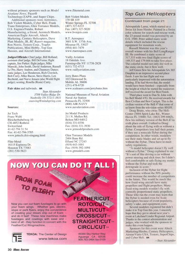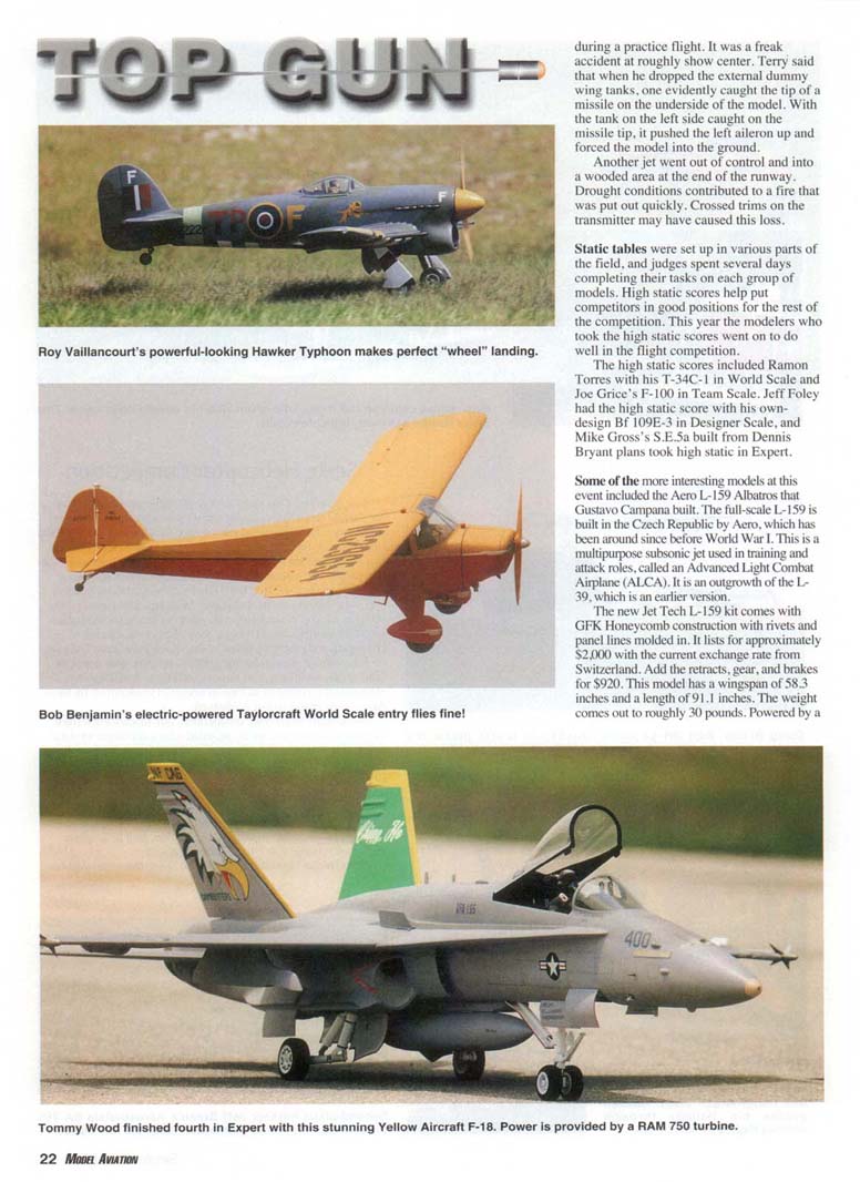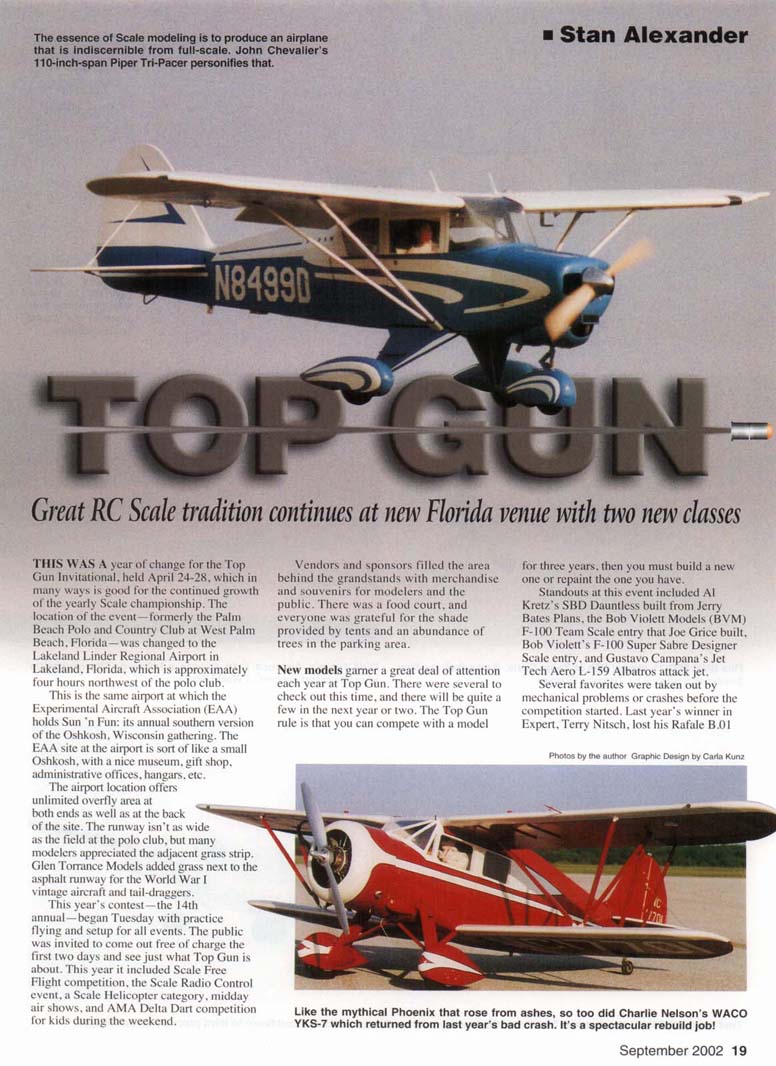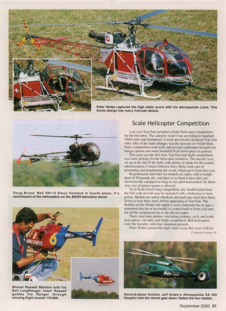 Great RC Scale tradition continues at new Florida venue with two new classes THIS WAS A year of change for the Top Gun Invitational, held April 24-28, which in many ways is good for the continued growth of the yearly Scale championship. The location of the event—formerly the Palm Beach Polo and Country Club at West Palm Beach, Florida—was changed to the Lakeland Linder Regional Airport in Lakeland, Florida, which is approximately four hours northwest of the polo club. This is the same airport at which the Experimental Aircraft Association (EAA) holds Sun 'n Fun: its annual southern version of the Oshkosh. Wisconsin gathering. The EAA site at the airport is sort of like a small Oshkosh, with a nice museum, gift shop, administrative offices, hangars, etc. The airport location offers unlimited overfly area at both ends as well as at the back of the site. The runway isn't as wide as the field at the polo club, but many modelers appreciated the adjacent grass strip. Glen Torrance Models added grass next to the asphalt runway for the World War I vintage aircraft and tail-draggers. This year's contest —the I4th annual —began Tuesday with practice flying and setup for all events. The public was invited to come out free of charge the first two days and see just what Top Gun is about. This year it included Scale Free Flight competition, the Scale Radio Control event, a Scale Helicopter category, midday air shows, and AMA Delta Dart competition for kids during the weekend. Vendors and sponsors filled the area behind the grandstands with merchandise and souvenirs for modelers and the public. There was a food court, and everyone was grateful for the shade provided by tents and an abundance of trees in the parking area. New models garner a great deal of attention each year at Top Gun. There were several to check out this time, and there will be quite a few in the next year or two. The Top Gun rule is that you can compete with a model for three years, then you must build a new one or repaint the one you have. Standouts at this event included Al Kret/'s SBD Dauntless built from Jerry Bates Plans, the Bob Violett Models (BVM) F-100 Team Scale entry that Joe Grice built. Bob Violett's F-IOO Super Sabre Designer Scale entry, and Gustavo Campana's Jet Tech Aero L-I59 Albatros attack jet. Several favorites were taken out by mechanical problems or crashes before the competition started. Last year's winner in Expert.Terry Nitsch. lost his Rafale B.OI Photos by the author Graphic Design by Carla Kunz Like the mythical Phoenix that rose from ashes, so too did Charlie Nelson's WACO YKS-7 which returned from last year's bad crash. It's a spectacular rebuild job! September 2002 19 Results in "Focus on Competition" Ramon Torres's flawless T-34C returns to base after capturing first place in the World Scale category. This BVM MiG-15 placed fifth in Team Scale. It was built by Sam Snyder and piloted by Thomas Dodgen. Cliff Tacie's Aeronca L-16 shoots a landing. The gorgeous aircraft placed second in World Scale. That's not a B-29! It's the Russian Tu-4 Team Scale entry built by George Maiorana and flown to third place by David Pinegar. 20 MeoaAmiUH Peter Wales captured the high static score with his Aerospatiale Lama. This Swiss design has many intricate details. Doug Bruns' Bell OH-13 Sioux finished in fourth place. It's reminiscent of the helicopters on the MASH television show! Winner Russell Mattieni with his Bell LongRanger. Inset: Russell guides his Ranger through winning flight scored 179.666. Scale Helicopter Competition Last year Top Gun included a Scale Helicopter competition for the first time. The category wasn't run according to standard AMA rules and limitations: it used specifically designed Top Gun rules. One of the main changes was the increase in weight limit. Static competition went well, and several contestants brought out hangar queens and some beautiful Scale helicopters in general. This year was the first time Top Gun had flight competition and static judging for the helicopter modelers. The aircraft were set up at the end of the field, with plenty of shade for the contest administration. Contest Director Jerry Hicks took care of promoting and preplanning the event, which grew from last year. Requirements and rules for models are open, with a weight limit of 50 pounds dry, and there is no limit to how they are electronically equipped as long as one-pilot transmitters fly them. Any size of piston engine is allowed. As in Scale fixed-wing competition, any modification from the full-scale aircraft may be included with a deduction in static points. Models are safety-checked, and each one must have been tlown at least three times before appearing at Top Gun. The Builder-of-the-Model rule applies; each contestant has to sign a statement that his or her model is scratch-built or from a kit and list all the components he or she did not make. There were nine entries—including military, civil, and work helicopters—in static and flight competition. Bell helicopters were the favorite, with four variations present. Peter Wales earned the high static score this year with his Coniituti'il on pu^i' 30 Second-place finisher Jeff Green's Aerospatiale SA 365 Dauphin with the retract gear down. Notice the four blades. September 2002 21 Roy Vaillancourt's powerful-looking Hawker Typhoon makes perfect "wheel" landing. Bob Benjamin's electric-powered Taylorcraft World Scale entry flies fine! during a practice flight. It was a freak accident at roughly show center. Terry said that when he dropped the external dummy wing tanks, one evidently caught the tip of a missile on the underside of the model. With the tank on the left side caught on the missile tip, it pushed the left aileron up and forced the model into the ground. Another jet went out of control and into a wooded area at the end of the runway. Drought conditions contributed to a fire that was put out quickly. Crossed trims on the transmitter may hav