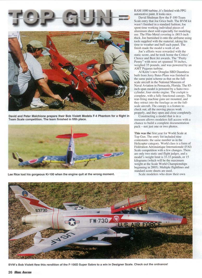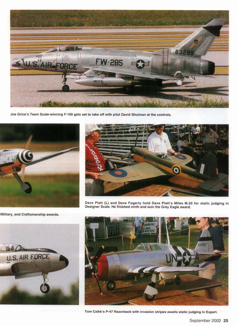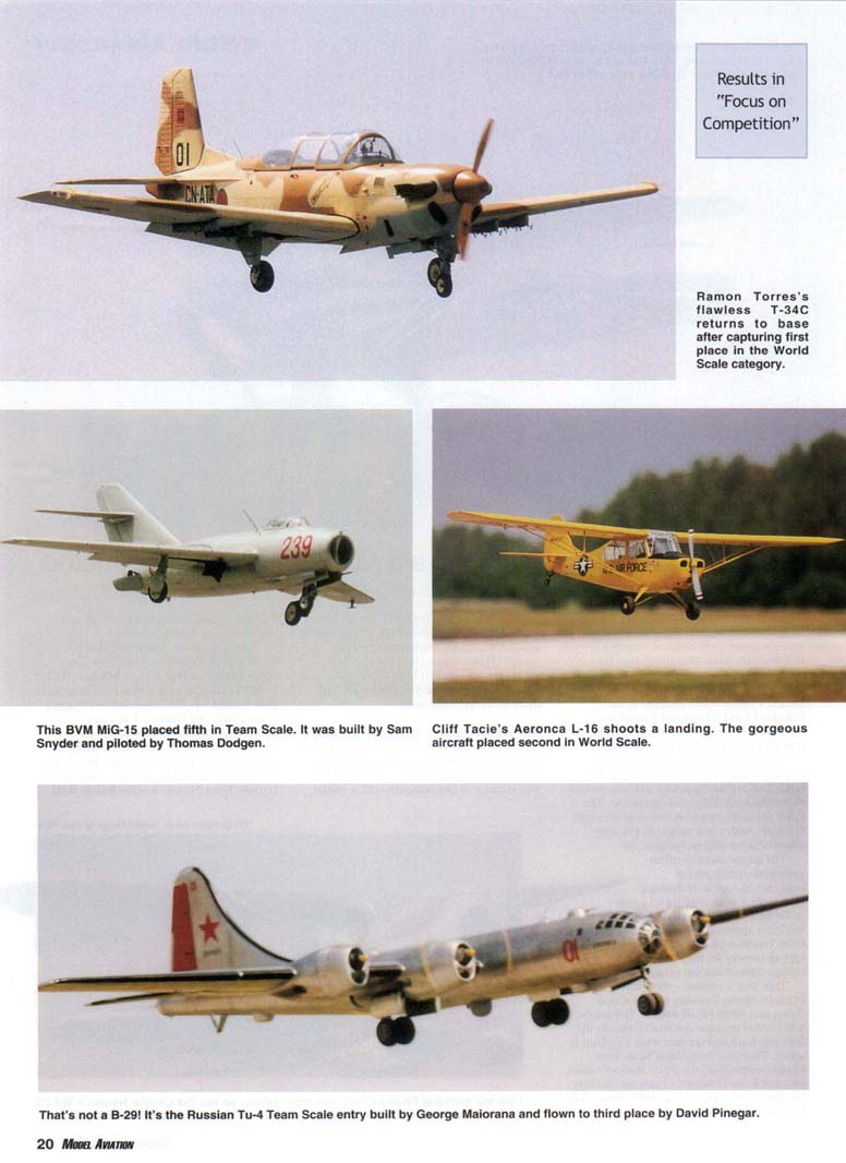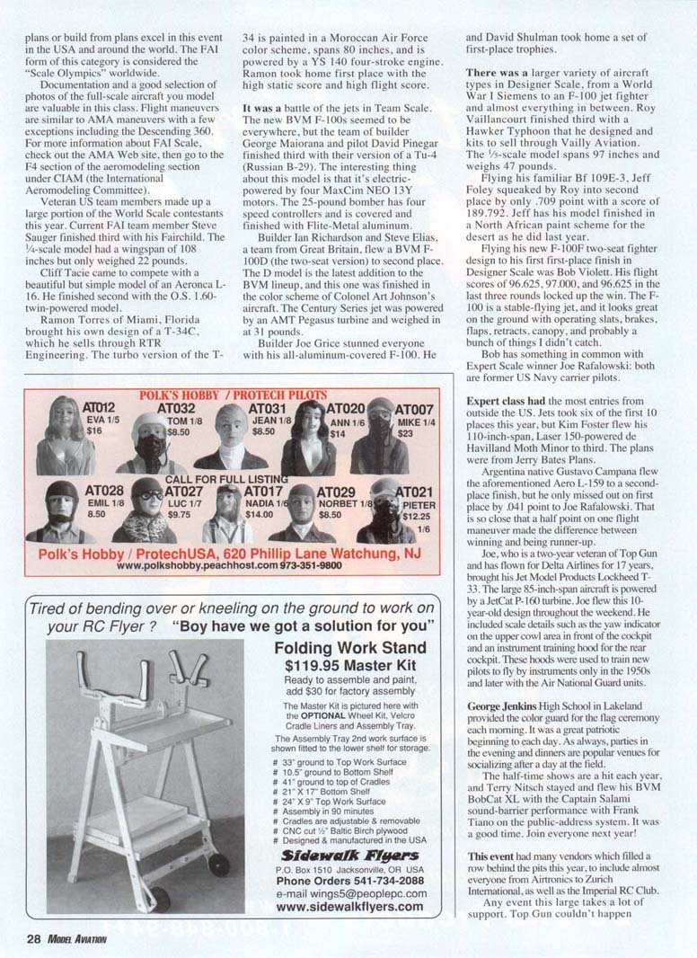 Great RC Scale tradition continues at new Florida venue with two new classes THIS WAS A year of change for the Top Gun Invitational, held April 24-28, which in many ways is good for the continued growth of the yearly Scale championship. The location of the event—formerly the Palm Beach Polo and Country Club at West Palm Beach, Florida—was changed to the Lakeland Linder Regional Airport in Lakeland, Florida, which is approximately four hours northwest of the polo club. This is the same airport at which the Experimental Aircraft Association (EAA) holds Sun 'n Fun: its annual southern version of the Oshkosh. Wisconsin gathering. The EAA site at the airport is sort of like a small Oshkosh, with a nice museum, gift shop, administrative offices, hangars, etc. The airport location offers unlimited overfly area at both ends as well as at the back of the site. The runway isn't as wide as the field at the polo club, but many modelers appreciated the adjacent grass strip. Glen Torrance Models added grass next to the asphalt runway for the World War I vintage aircraft and tail-draggers. This year's contest —the I4th annual —began Tuesday with practice flying and setup for all events. The public was invited to come out free of charge the first two days and see just what Top Gun is about. This year it included Scale Free Flight competition, the Scale Radio Control event, a Scale Helicopter category, midday air shows, and AMA Delta Dart competition for kids during the weekend. Vendors and sponsors filled the area behind the grandstands with merchandise and souvenirs for modelers and the public. There was a food court, and everyone was grateful for the shade provided by tents and an abundance of trees in the parking area. New models garner a great deal of attention each year at Top Gun. There were several to check out this time, and there will be quite a few in the next year or two. The Top Gun rule is that you can compete with a model for three years, then you must build a new one or repaint the one you have. Standouts at this event included Al Kret/'s SBD Dauntless built from Jerry Bates Plans, the Bob Violett Models (BVM) F-100 Team Scale entry that Joe Grice built. Bob Violett's F-IOO Super Sabre Designer Scale entry, and Gustavo Campana's Jet Tech Aero L-I59 Albatros attack jet. Several favorites were taken out by mechanical problems or crashes before the competition started. Last year's winner in Expert.Terry Nitsch. lost his Rafale B.OI Photos by the author Graphic Design by Carla Kunz Like the mythical Phoenix that rose from ashes, so too did Charlie Nelson's WACO YKS-7 which returned from last year's bad crash. It's a spectacular rebuild job! September 2002 19 Results in "Focus on Competition" Ramon Torres's flawless T-34C returns to base after capturing first place in the World Scale category. This BVM MiG-15 placed fifth in Team Scale. It was built by Sam Snyder and piloted by Thomas Dodgen. Cliff Tacie's Aeronca L-16 shoots a landing. The gorgeous aircraft placed second in World Scale. That's not a B-29! It's the Russian Tu-4 Team Scale entry built by George Maiorana and flown to third place by David Pinegar. 20 MeoaAmiUH Peter Wales captured the high static score with his Aerospatiale Lama. This Swiss design has many intricate details. Doug Bruns' Bell OH-13 Sioux finished in fourth place. It's reminiscent of the helicopters on the MASH television show! Winner Russell Mattieni with his Bell LongRanger. Inset: Russell guides his Ranger through winning flight scored 179.666. Scale Helicopter Competition Last year Top Gun included a Scale Helicopter competition for the first time. The category wasn't run according to standard AMA rules and limitations: it used specifically designed Top Gun rules. One of the main changes was the increase in weight limit. Static competition went well, and several contestants brought out hangar queens and some beautiful Scale helicopters in general. This year was the first time Top Gun had flight competition and static judging for the helicopter modelers. The aircraft were set up at the end of the field, with plenty of shade for the contest administration. Contest Director Jerry Hicks took care of promoting and preplanning the event, which grew from last year. Requirements and rules for models are open, with a weight limit of 50 pounds dry, and there is no limit to how they are electronically equipped as long as one-pilot transmitters fly them. Any size of piston engine is allowed. As in Scale fixed-wing competition, any modification from the full-scale aircraft may be included with a deduction in static points. Models are safety-checked, and each one must have been tlown at least three times before appearing at Top Gun. The Builder-of-the-Model rule applies; each contestant has to sign a statement that his or her model is scratch-built or from a kit and list all the components he or she did not make. There were nine entries—including military, civil, and work helicopters—in static and flight competition. Bell helicopters were the favorite, with four variations present. Peter Wales earned the high static score this year with his Coniituti'il on pu^i' 30 Second-place finisher Jeff Green's Aerospatiale SA 365 Dauphin with the retract gear down. Notice the four blades. September 2002 21 Roy Vaillancourt's powerful-looking Hawker Typhoon makes perfect "wheel" landing. Bob Benjamin's electric-powered Taylorcraft World Scale entry flies fine! during a practice flight. It was a freak accident at roughly show center. Terry said that when he dropped the external dummy wing tanks, one evidently caught the tip of a missile on the underside of the model. With the tank on the left side caught on the missile tip, it pushed the left aileron up and forced the model into the ground. Another jet went out of control and into a wooded area at the end of the runway. Drought conditions contributed to a fire that was put out quickly. Crossed trims on the transmitter may hav
