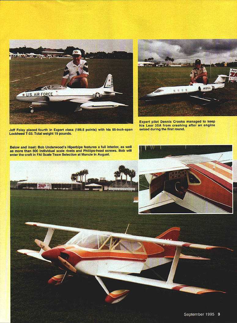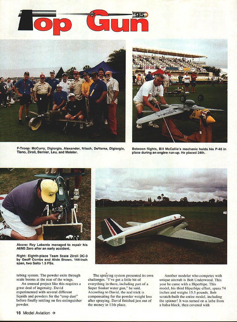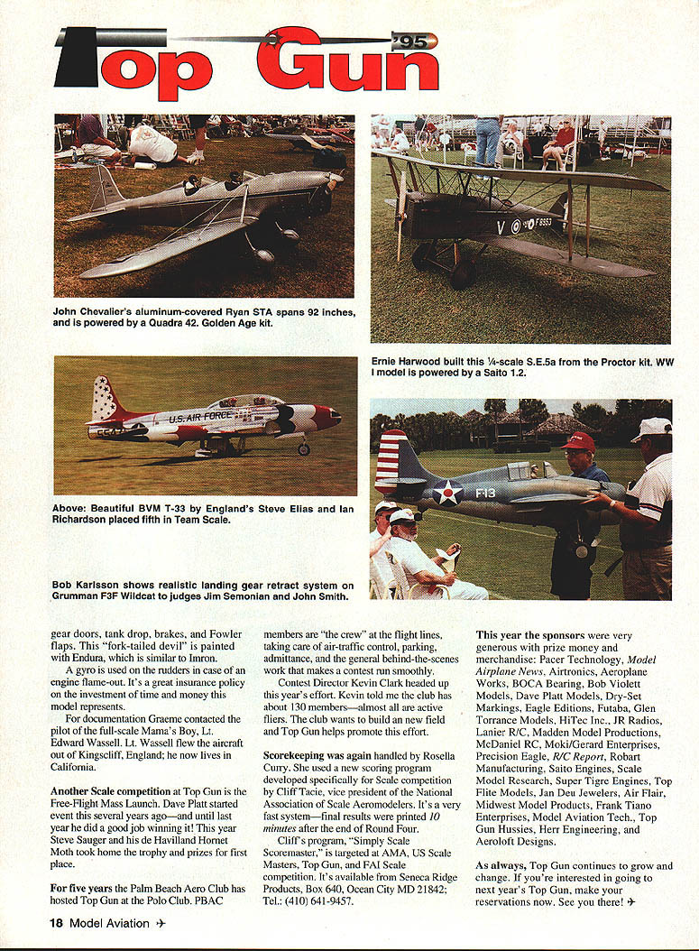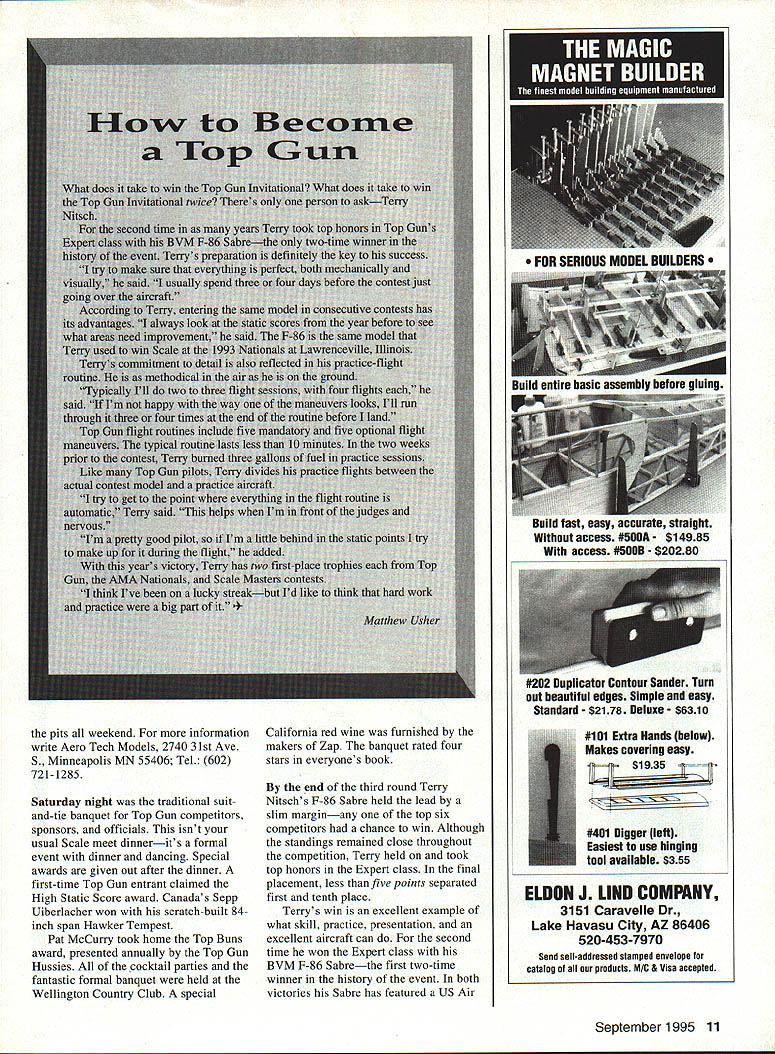 Terry Nitsch does ft again U Stan Alexander ONCE YEAR aeromodelings best best converge West Palm Beach Florida compete worlds prestigious Scale eventsthe Top Gun Invitational international competition held Palm Beach Polo Club April 27-30 Hosted Palm Beach Aero Club meet marked its fifth year polo field Its different events onean air show spectators world-class championship competitor great September 1995 7 Terry Nitsch repairs nose gear winning BVM F-86 Sabre Jet Gear collapsed during first-round landing Jim Sandquist preps Super Stearman Jess Larsons flight Team Scale event team took sixth place Above The P-38 Team Scale entry Bob Fiorenze Graeme Mears Yellow Aircraft model took fourth event Left Spectators admire Dave Plafts Grumman Mohawk /e scale model lost after left engine failure 8 Model Aviation w Inset Bob Underwoods Hiporbipe features full interior well 600 indivIdual scale rivets Phillips-head screws Bob will enter craft FAI Scale Team Selection Muncie August Expert pilot DennIs Crooks managed keep Lear 35A crashing after engine Jeff Foley placed fourth Expert class 1895 points 85-inch-span seized during first round Lockheed T-33 Total weight 19 pounds Bud Roanes $opwltti Pup goes through Its maneuvers Buds clessic WW effort finIshed 13th Expert class opportunity show off products hobby industry Contestants came Canada England Germany Brazil Columbia United States different countries origin spoke understood same plane language Rain threatened field several times during week couple downpours though polo field wet wasnt unmanageable didnt affect flying very much wind behaved itself during eventseveral biplane pilots really seemed enjoying themselves know vendors manufacturers appreciated having walled exhibition tent Static judging started 830 am Thursday April 27 Most Expert Class judged day several late arrivals Friday judged Team Scale aircraft Friday afternoon Chief Judge George Len runs tight ship Competitors strict time schedule judgingthis keeps entire process moving along During judging some pilots practiced routines put show audience Nearly 15000 spectators attended four-day competition An air show also held Friday gave competitors time make repairs talk friends watched show Air shows also held Saturday Sunday during halftime breaks After pilots meeting Saturday morning opening ceremonies started Star Spangled Bannercomplete Pitts biplane doing aerobatics overhead first round competition flying usually pilots work out jitters mechanical problems make final adjustments routine Garland Hamiltons F-80 Shooting Star first off runway interesting aircraft lined pits during week first time great Messerschmitt Bf 1 09G sliced through sky above polo grounds aircraft built Pat McCurry Dave Platt kit aircraft finished Erich Hartmann markings study Scale detail details seemed appear longer looked No area overlookedhatches vents engine cowl hinges cockpit showed remarkable attention detail Pat scratchbuilt canopy G- 14 model well other details Pat used Dave Platt s painting technique apply custom-mixed K&B epoxy standard Luftwaffe winter camouflage scheme followed several light-gray washes finish rubbed fine steel wool effect familiar name flying OV-ID Mohawk years competition Dave Platt replaced Mohawk lost midair collision during last years competition latest version slightly larger last years model 1/6-scale craft has 96-inch span powered two OS 91 fourstroke engines Unfortunately bit history repeated itself Daves first competition flight model went down Mohawks left engine died during right turn craft went Hamilton Lake Fortunately water minimized damage model Wayne Siewert represented Imperial Japanese Army Air Force WW Il-era Nakajima Ki-84 Frank new breed hightech models Top Gunits constructed carbon fiber fighter has aluminum spar runs length 88-inch-span wing Plates epoxied spar leading edge wrapped Kevlar support 32pound weight model during landing According Wayne its first carbon-fiber kit Aero Tech Models company will soon release its version North American P-51D will have approximately same dimensions weight Ki-84 prototype 10 Model Aviation weekend information write Aero Tech Models 2740 31st Ave S Minneapolis MN 55406 Tel 602 721-1285 Saturday night traditional suitand-tie banquet Top Gun competitors sponsors officials isnt usual Scale meet dinnerits formal event dinner dancing Special awards given out after dinner first-time Top Gun entrant claimed High Static Score award Canadas Sepp Uiberlacher won scratch-built 84inch span Hawker Tempest Pat McCurry took home Top Buns award presented annually Top Gun Hussies cocktail parties fantastic formal banquet held Wellington Country Club special California red wine furnished makers Zap banquet rated four stars everyones book end third round Terry Nitschs F-86 Sabre held lead slim marginany top six competitors chance win Although standings remained close throughout competition Terry held took top honors Expert class final placement less thanfive points separated first tenth place Terrys win excellent example what skill practice presentation excellent aircraft can second time won Expert class BVM F-86 Sabrethe first two-time winner history event both victories Sabre has featured US Air #191 Extra Hands below Makes covering easy #401 Digger left Easiest use hinging tool available $355 ELDON J LIND COMPANY 3151 Caravelle Dr Lake Havasu City AZ 86406 520-453-7970 Send self-addressed stamped envelope catalog products M/C & Visa accepted September 1995 11 Build fast easy accurate straight Without access #SOOA $14985 access #50GB $20280 #202 Duplicator Contour Sander Turn out beautiful edges Simple easy Standard $2178 Deluxe $6310 -I Ufl Expert Standings After Round 4 Static Pilot/Model Tony F-86 2Garland F-80 Sho Ramon Tv Cessna 04Jeff Foley T-33A 5Nick Zirol Hellcat 8KIm Fosto Sopwith F Score Flight 1 Score Flight 2 Score Flight 3 Score Flight 4Total ScoreScore 96750 92750 95750 94375 91000 94750 92125 12 Model Aviation 0 e Ban 