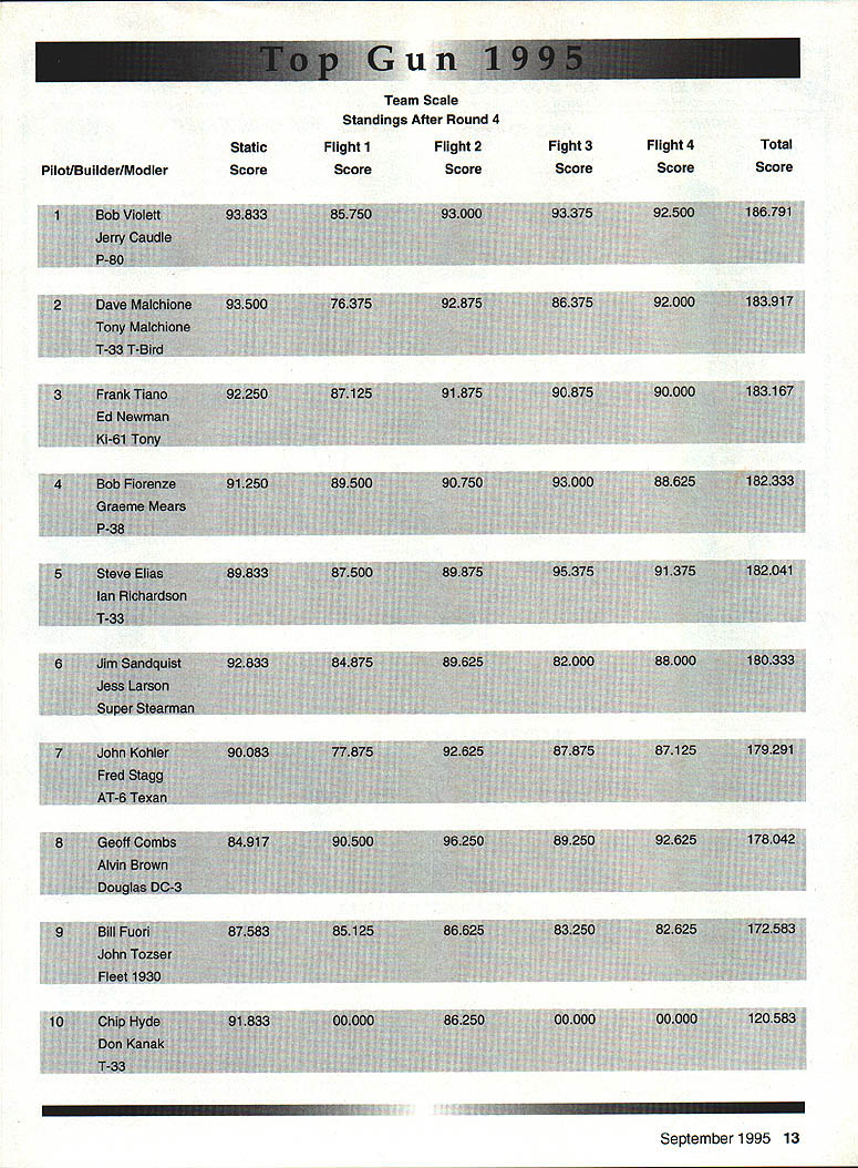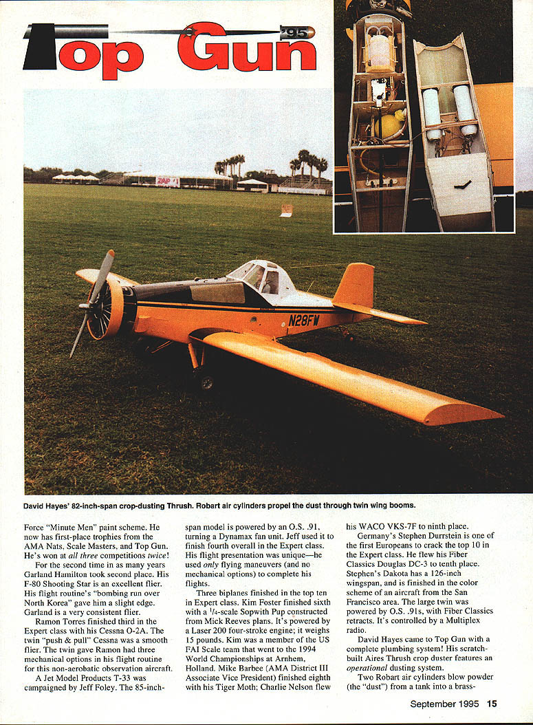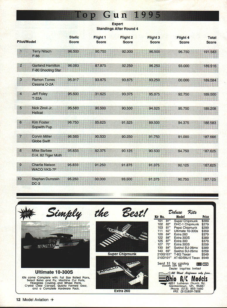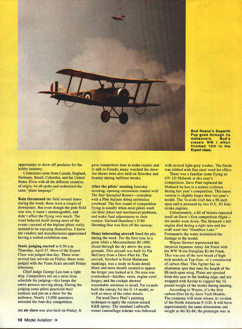 Terry Nitsch does ft again U Stan Alexander ONCE YEAR aeromodelings best best converge West Palm Beach Florida compete worlds prestigious Scale eventsthe Top Gun Invitational international competition held Palm Beach Polo Club April 27-30 Hosted Palm Beach Aero Club meet marked its fifth year polo field Its different events onean air show spectators world-class championship competitor great September 1995 7 Terry Nitsch repairs nose gear winning BVM F-86 Sabre Jet Gear collapsed during first-round landing Jim Sandquist preps Super Stearman Jess Larsons flight Team Scale event team took sixth place Above The P-38 Team Scale entry Bob Fiorenze Graeme Mears Yellow Aircraft model took fourth event Left Spectators admire Dave Plafts Grumman Mohawk /e scale model lost after left engine failure 8 Model Aviation w Inset Bob Underwoods Hiporbipe features full interior well 600 indivIdual scale rivets Phillips-head screws Bob will enter craft FAI Scale Team Selection Muncie August Expert pilot DennIs Crooks managed keep Lear 35A crashing after engine Jeff Foley placed fourth Expert class 1895 points 85-inch-span seized during first round Lockheed T-33 Total weight 19 pounds Bud Roanes $opwltti Pup goes through Its maneuvers Buds clessic WW effort finIshed 13th Expert class opportunity show off products hobby industry Contestants came Canada England Germany Brazil Columbia United States different countries origin spoke understood same plane language Rain threatened field several times during week couple downpours though polo field wet wasnt unmanageable didnt affect flying very much wind behaved itself during eventseveral biplane pilots really seemed enjoying themselves know vendors manufacturers appreciated having walled exhibition tent Static judging started 830 am Thursday April 27 Most Expert Class judged day several late arrivals Friday judged Team Scale aircraft Friday afternoon Chief Judge George Len runs tight ship Competitors strict time schedule judgingthis keeps entire process moving along During judging some pilots practiced routines put show audience Nearly 15000 spectators attended four-day competition An air show also held Friday gave competitors time make repairs talk friends watched show Air shows also held Saturday Sunday during halftime breaks After pilots meeting Saturday morning opening ceremonies started Star Spangled Bannercomplete Pitts biplane doing aerobatics overhead first round competition flying usually pilots work out jitters mechanical problems make final adjustments routine Garland Hamiltons F-80 Shooting Star first off runway interesting aircraft lined pits during week first time great Messerschmitt Bf 1 09G sliced through sky above polo grounds aircraft built Pat McCurry Dave Platt kit aircraft finished Erich Hartmann markings study Scale detail details seemed appear longer looked No area overlookedhatches vents engine cowl hinges cockpit showed remarkable attention detail Pat scratchbuilt canopy G- 14 model well other details Pat used Dave Platt s painting technique apply custom-mixed K&B epoxy standard Luftwaffe winter camouflage scheme followed several light-gray washes finish rubbed fine steel wool effect familiar name flying OV-ID Mohawk years competition Dave Platt replaced Mohawk lost midair collision during last years competition latest version slightly larger last years model 1/6-scale craft has 96-inch span powered two OS 91 fourstroke engines Unfortunately bit history repeated itself Daves first competition flight model went down Mohawks left engine died during right turn craft went Hamilton Lake Fortunately water minimized damage model Wayne Siewert represented Imperial Japanese Army Air Force WW Il-era Nakajima Ki-84 Frank new breed hightech models Top Gunits constructed carbon fiber fighter has aluminum spar runs length 88-inch-span wing Plates epoxied spar leading edge wrapped Kevlar support 32pound weight model during landing According Wayne its first carbon-fiber kit Aero Tech Models company will soon release its version North American P-51D will have approximately same dimensions weight Ki-84 prototype 10 Model Aviation weekend information write Aero Tech Models 2740 31st Ave S Minneapolis MN 55406 Tel 602 721-1285 Saturday night traditional suitand-tie banquet Top Gun competitors sponsors officials isnt usual Scale meet dinnerits formal event dinner dancing Special awards given out after dinner first-time Top Gun entrant claimed High Static Score award Canadas Sepp Uiberlacher won scratch-built 84inch span Hawker Tempest Pat McCurry took home Top Buns award presented annually Top Gun Hussies cocktail parties fantastic formal banquet held Wellington Country Club special California red wine furnished makers Zap banquet rated four stars everyones book end third round Terry Nitschs F-86 Sabre held lead slim marginany top six competitors chance win Although standings remained close throughout competition Terry held took top honors Expert class final placement less thanfive points separated first tenth place Terrys win excellent example what skill practice presentation excellent aircraft can second time won Expert class BVM F-86 Sabrethe first two-time winner history event both victories Sabre has featured US Air #191 Extra Hands below Makes covering easy #401 Digger left Easiest use hinging tool available $355 ELDON J LIND COMPANY 3151 Caravelle Dr Lake Havasu City AZ 86406 520-453-7970 Send self-addressed stamped envelope catalog products M/C & Visa accepted September 1995 11 Build fast easy accurate straight Without access #SOOA $14985 access #50GB $20280 #202 Duplicator Contour Sander Turn out beautiful edges Simple easy Standard $2178 Deluxe $6310 -I Ufl Expert Standings After Round 4 Static Pilot/Model Tony F-86 2Garland F-80 Sho Ramon Tv Cessna 04Jeff Foley T-33A 5Nick Zirol Hellcat 8KIm Fosto Sopwith F Score Flight 1 Score Flight 2 Score Flight 3 Score Flight 4Total ScoreScore 96750 92750 95750 94375 91000 94750 92125 12 Model Aviation 0 e Ban 