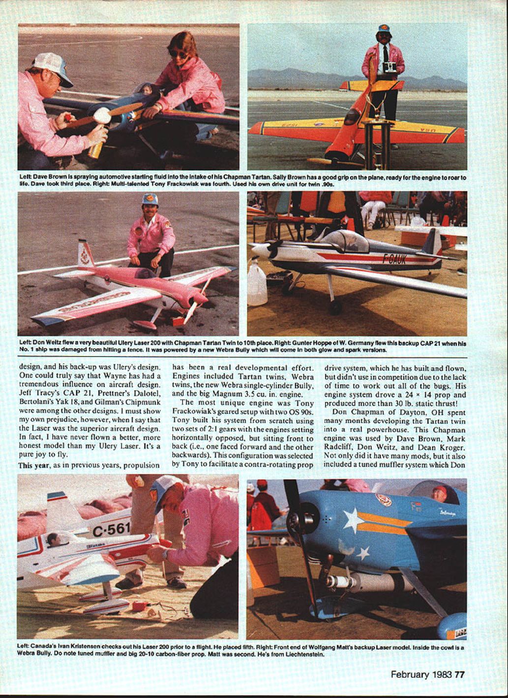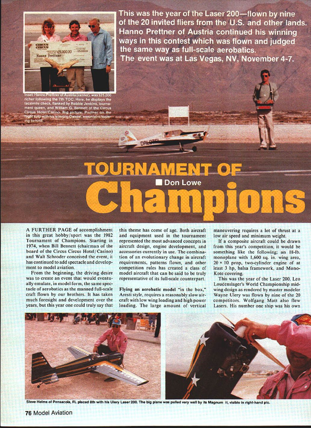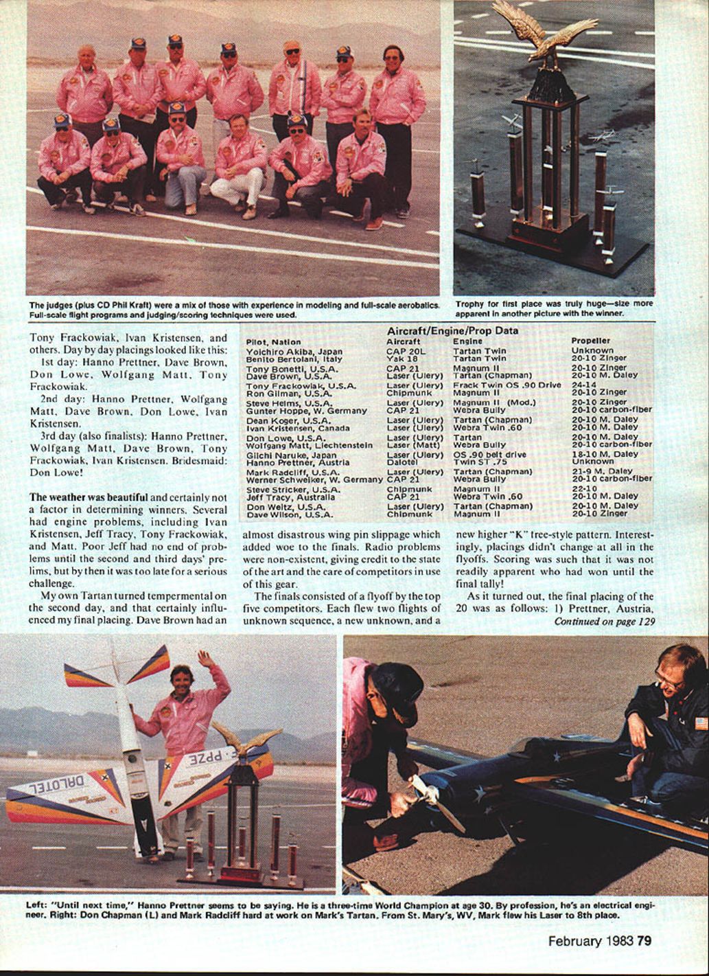 A FURTHER PAGE accomplishment great hobby/sport 1982 Tournament Champions Starting 1974 Bill Bennett chairman board Circus Circus Hotel Casino Walt Schroder conceived event has continued add spectacle develop ment model aviation beginning driving desire create event would eventu ally emulate model form same spec tacle aerobatics manned full-scale craft flown brothers has taken much foresight development over years year could truly say theme has come age Both aircraft equipment used tournament represented advanced concepts aircraft design engine development accessories currently use combina tion evolutionary change aircraft requirements patterns flown other competition rules has created class model aircraft can said truly representative its full-scale counterpart Flying aerobatic model box Aresti style requires reasonably slow air craft low wing loading high power loading large amount vertical maneuvering requires lot thrust low air speed minimum weight composite aircraft could drawn years competition would something like following 18-lb monoplane 1600 sq wing area 20 x 10 prop two-cylinder engine least 3 hp balsa framework Mono Kote covering year Laser 200 Leo Loudenslagers World Championship midwing design rendered master modeler Wayne Ulery flown nine 20 competitors Wolfgang Matt also flew Lasers number ship own plane pulled very well Its Magnum II visibte right-hand plc 76 Model Aviation design back-up Ulerys design could truly say Wayne has tremendous influence aircraft design Jeff Tracys CAP 21 Prettners Dalotel Bertolanis Yak 18 Gilmans Chipmunk among other designs must show own prejudice however say Laser superior aircraft design fact have never flown better honest model Ulery Laser Its pure joy fly year previous years propulsion has real developmental effort Engines included Tartan twins Webra twins new Webra single-cylinder Bully big Magnum 35 cu engine unique engine Tony Frackowiaks geared setup two OS 90s Tony built system scratch using two sets 21 gears engines setting horizontally opposed sitting front back ie faced forward other backwards configuration selected Tony facilitate contra-rotating prop drive system has built flown didnt use competition due lack time work out bugs engine system drove 24 x 14 prop produced 30 lb static thrust Don Chapman Dayton OH spent months developing Tartan twin real powerhouse Chapman engine used Dave Brown Mark Radcliff Don Weitz Dean Kroger did have mods also included tuned muffler system Don February 198377 Left Dave Brown spraying automotive starting fluid Intake Chapman Tartan Salty Brown has good grip plane ready engine roar life Dave took third place Right Multi-talented Tony Frackowiak fourth Used own drive unit twin 90s Leit Don weitz flew very beautiful Ulery Laser 200 Chapman Tartan Twin 10th place Right Gunter Hoppa W Germany flaw backup CAP 21 No 1 ship damaged hitting fence powered new Webra Bully wlii come both glow spark versions Left Canadas ivan Kristensen checks out Laser 200 prior flight placed fifth Right Front end Wolfgang Malts backup Laser model inside cowl isa Webra Buily note tuned muftier big 20-10 carbon-fiber prop Malt second Hes Liechtenstein developed An engine really caught fancy new 21 cu Webra Bully used Matt Hoppe Schweiker Europe Bully will soon available Circus Hobbies turned 20 rop 8000 rpm static accomplished using tuned muffler sys tem Webra special carbon-fiber narrow-blade prop obtained Hoppe West Germany engine will avail able both glow ignition versions designed scratch model use Magnums new 35 cu engine used Steve Helms Tony Bonetti Steve Stricker Dave Wilson gave very good account itself seemed have lot power pull 18 19-lb airplane flying TOC better ever obvious start Reigning Champion Hanno Prettner Austria would severly challenged Being true champion however gave him just edge necessary emerge victorious 7th consecutive time Counting years winnings has date won over $95000 competi tions bad income supplement Flying scored mixture model full-scale judges scores normalized computer system used full-scale aerobatics bring high low judges line average must say judging both fair accurate Much credit must go Chief Judge Jim Edwards Clint McHenry out standing job respect Judging has always weak link sport TOC high aliber Patterns used years event just like full-scale aerobatics known 20maneuver sequence flown first day second day unknown sequencegiven contestants night beforewas flown No per mitted practice unknown pattern prior competition third day flew free-style pattern invented individual contestant approved accuracy advance competition Five finalists selected basis top scores accumulated days flying As turned out Hanno Prettner led start challenged Wolfgang Matt Dave Brown yours truly Don Lowe 78 Model Aviation No eyes arent deceiving choppers flying upside down other rightside up Kait Helicopter Team put spectacu lar exhibitions during interludes Some ot vies i uu tL-HJ singer uioaen uouIeu oniesi uurcIor vnhI Iuufl Jenkins Chief Judge Jim Edwards Walt Schroder Wait helped start TOC concepi Pretiners L uses aouwe-gangeo servos control surface single fuel tank Y connection twin 75s Yoichlro Akiba Japan placed 17th CAP 201 powered Tartan Twin Rules required models full-scale aerobatic planes Right good view ot weora Bully engine its companion CDI Ignition system Bully flown contest Hoppe Maft Schwelker Tony Frackowiak Ivan Kristensen others Day day placings looked like 1st day Hanno Prettner Dave Brown Don Lowe Wolfgang Matt Tony Frackowiak 2nd day Hanno Prettner Wolfgang Matt Dave Brown Don Lowe Ivan Kristensen 3rd day also finalists Hanno Prettner Wolfgang Matt Dave Brown Tony Frackowiak Ivan Kristensen Bridesmaid Don Lowe weather beautiful certainly factor determining winners Several engine problems including Ivan Kristensen Jeff Tracy Tony Frackowiak Matt Poor Jeff no end prob lems until second third days pre lims too late serious challenge own Tartan turned tempermental second day certainly i