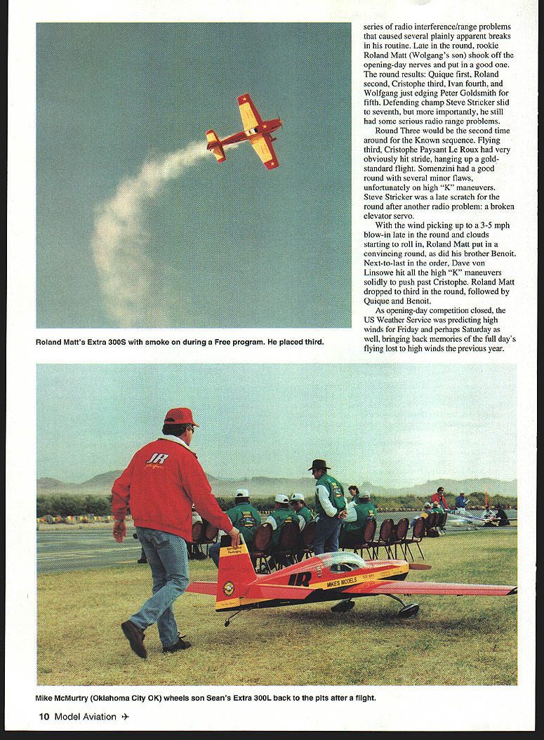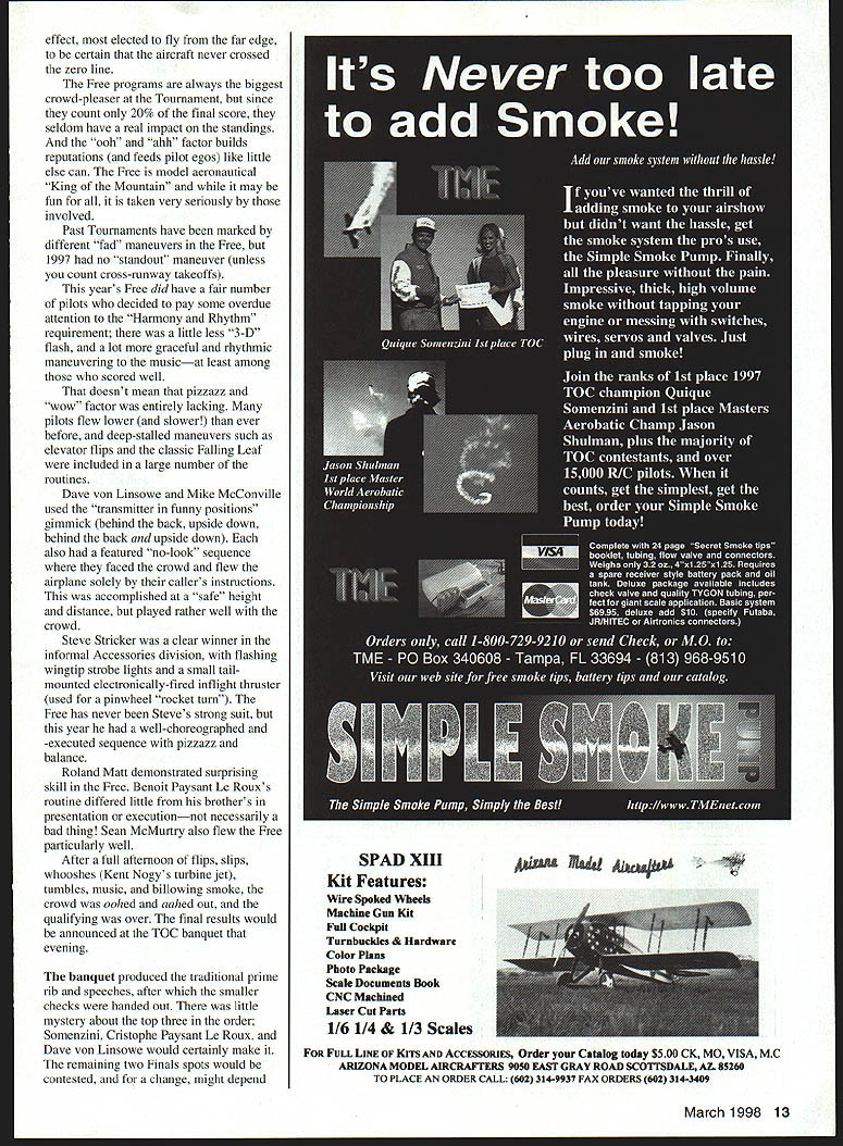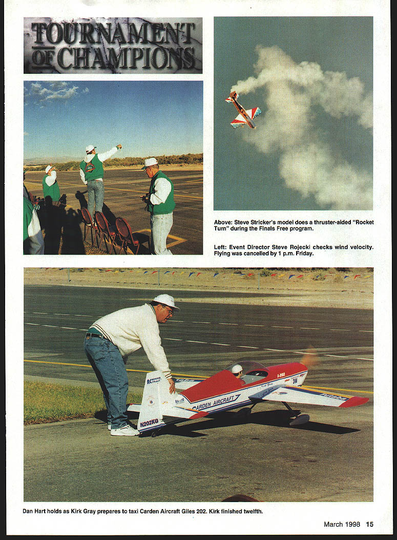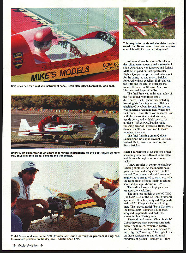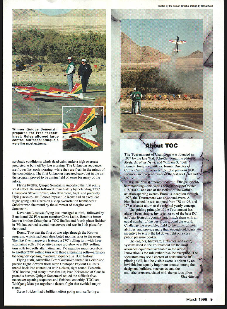 mm warn ON CRISP desert day late October 1997 Quique Somenzini Argentina won 14th International Tournament Champions joining seven-time champion Hanno Prettner Chip Hyde multiple winners event Quique justly famous spectacular low-level Freestyle work did time disciplined consistent effort spanned skill spectrum During qualifying won round program category Known Unknown Four-Minute Free never placing lower fourth flight Finals nearly reprised effort taking Known Unknown round convincing fashion before giving ground Free second-place finisher Cristophe Paysant Le Roux France surprising TOC rookie Liechtenstein third-place finisher Roland Matt marked first time foreign entrants have captured top three spots event dates October 23-26 1997 site William G Bennett RC Field Las Vegas Nevada As 1996 Sahara Hotel Casino host establishment contest format called three days qualifying flights split follows Four rounds Known Compulsory Program three different Unknown Compulsory Programs handed contestants night before must flownno practice allowed flown once two Four Minute Free Programs qualifying leads six-round finals Sunday top five pilots evenly split among two Knowns two new Unknown sequences created just Finals two additional Free programs preliminaries finals lowest-scoring flight program type dropped scoring modified IAC rules weighted 50% Unknowns 30% Knowns balance 20% 4minute Free Programs Tournament custom-assembled contest management FAI Aresti catalog aerobatic figures Qualifying opened Thursday morning under nearly flawless 8 Model Aviation nd-place finisher Christophe Paysant Le Roux starts model brother Benoit father Jacques hold Rick Allison Pha byihi muthw GmpNo DuuIgn byOmila batic conditions winds dead calm under high overcast predicted burn off late morning Unknown sequences flown first morning fresh minds competitors first Unknown appeared easy air program proved minefield zeros pilots Flying twelfth Quique Somenzini uncorked first really solid effort followed immediately defending TOC Champion Steve Stricker flew close tight precisely Flying next-to-last Benoit Paysant Le Roux excellent flight going until zero snap overrotation blemished Stricker won round slimmest margins over Somenzini Dave von Linsowe flying last managed third followed Benoit US F3A team member Chris Lakin Benoits betterknown brother Cristophe TOC finalist fourth-place finisher 96 zeroed several maneuvers 14th place round Round Two first two trips through Known program distributed months prior event first five maneuvers featured 2700 rolling turn three alternating rolls 1 /2 positive snaps crossbox 1800 rolling turn two rolls alternating 11/2 negative snaps crossbox another 2700 rolling turn three alternating rollsarguably toughest opening maneuver sequence TOC history Flying sixth Australian Peter Goldsmith turned crisp precise flight Several fliers later Cristophe Paysant Le Roux roared back contention clean tight round Perennial TOC invitee times finalist Ivan Kristensen Canada posted burner Quique Somenzini nailed difficult fivemaneuver opening sequence finished smoothly TOC vet Wolfgang Matt put together decent flight avoided major errors Steve Sticker brilliant effort going until suffering March 1998 9 Tournamentampis 1974 late Wait chr6&r longtime ect Model Airplane Newi William G Bill Bennett liformer Director ushe previousOC I/tel ax inTheiiisi series radio interference/range problems caused several plainly apparent breaks routine Late round rookie Roland Matt Wolgangs son shook off opening-day nerves put good round results Quique first Roland second Cristophe third Ivan fourth Wolfgang just edging Peter Goldsmith fifth Defending champ Steve Stricker slid seventh importantly still some serious radio range problems Round Three would second time around Known sequence flying third Cristophe Paysant Le Roux very obviously hit stride hanging up goldstandard flight Somenzini good round several minor flaws unfortunately high K maneuvers Steve Stricker late scratch round after another radio problem broken elevator servo wind picking up 3-5 mph blow-in late round clouds starting roll Roland Matt put convincing round did brother Benoit Next-to-last order Dave von Linsowe hit high K maneuvers solidly push past Cristophe Roland Matt dropped third round followed Quique Benoit As opening-day competition closed US Weather Service predicting high winds Friday perhaps Saturday well bringing back memories full days flying lost high winds previous year 10 Model Aviation nd Malis Extra 3005 smoke during Free program placed third Mike McMurtry Oklahoma City OK wheels son Seans Extra 300L back pits after flight predictions Friday morning proved semi-accurate temperature dropped 20 degrees overnight 20 mph 900 blow-in waiting 8 am opening bell Tournament rules provide pilot vote cancellation sustained winds exceed 20 knots about 26 mph After measuring wind velocity Event Director Steve Rojecki elected proceed vote Higher winds 25-35 mph range gusting 45 mph predicted before noon avoid altering structure event least two rounds program type would need flown during qualifyingand getting least mornings scheduled Unknown round would key importance high winds arrived predicted Unknown #2 featured long vertical 450 lines multiple rolls crossover spinall surely challenge under conditions significant flow problems fifth maneuvera horizontal eight directly followed tail slide roll sequence rolling turn entered top rather bottom very first flight apparent precision symmetry taken back seat simple survivaland after watching half round also obvious single aerobatic maneuver found would defeat best efforts comers card Horizontal Eight 4/8 rolls first 2/4 rolls second entered exited top won round best efforts saw amounted score 6 7 pilots 3-5 range Several pilots windy regions made significant gains Rookie Todd Blose fresh windy Texas plains nice effort eighth round Sean McMurtry also Texas turned much better flight previous efforts Fl