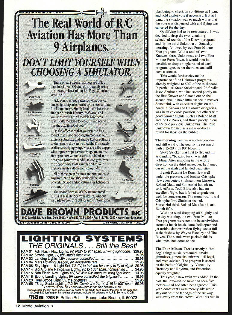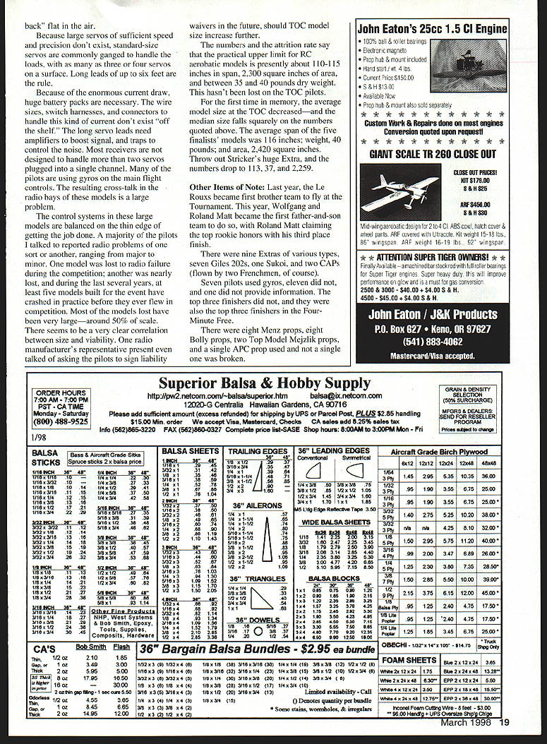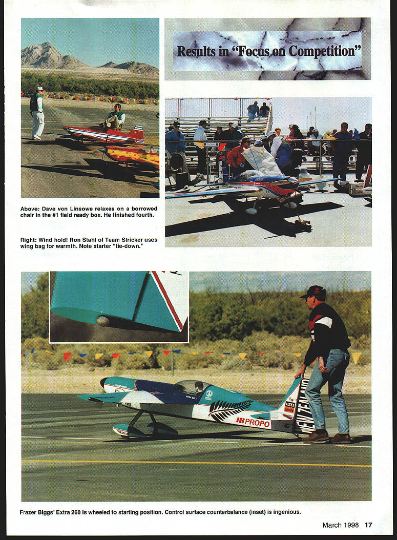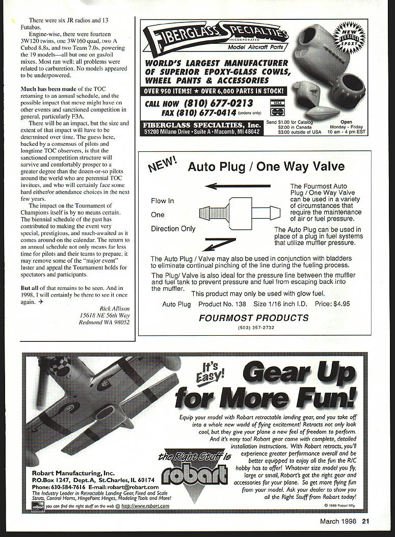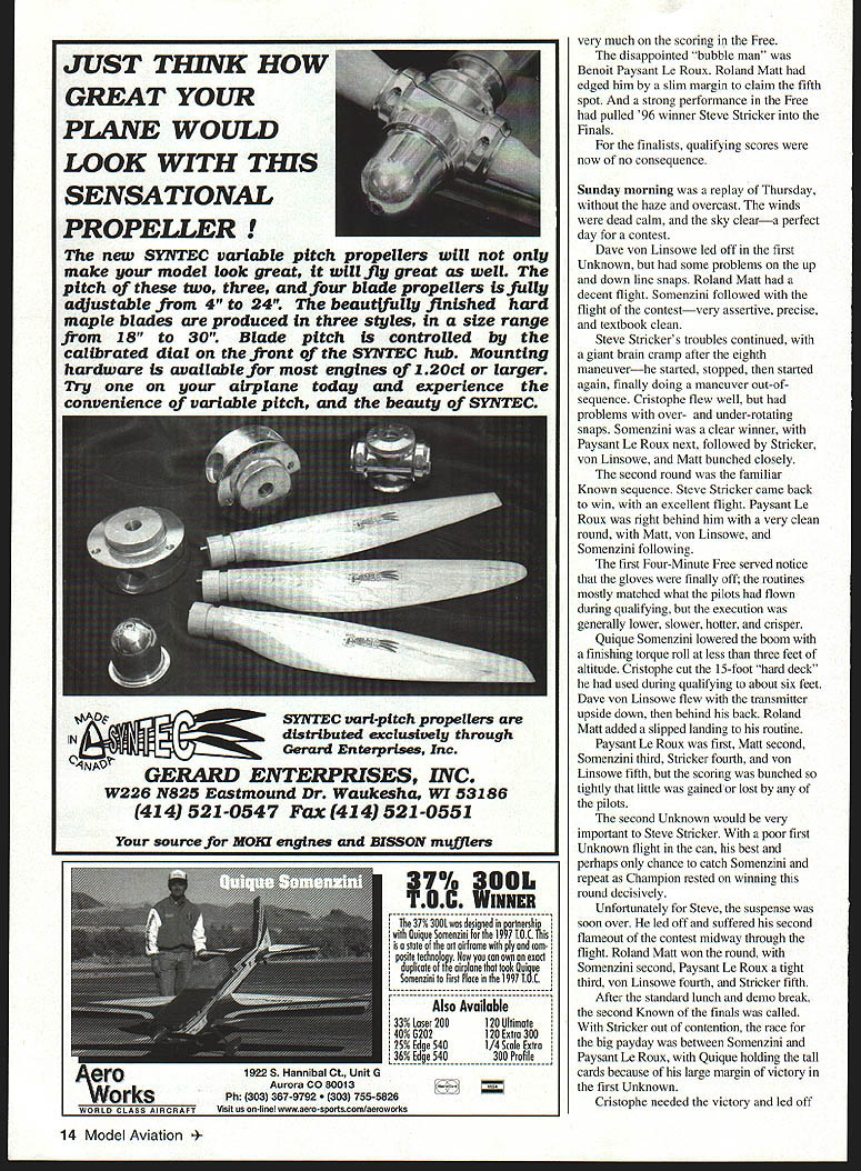 mm warn ON CRISP desert day late October 1997 Quique Somenzini Argentina won 14th International Tournament Champions joining seven-time champion Hanno Prettner Chip Hyde multiple winners event Quique justly famous spectacular low-level Freestyle work did time disciplined consistent effort spanned skill spectrum During qualifying won round program category Known Unknown Four-Minute Free never placing lower fourth flight Finals nearly reprised effort taking Known Unknown round convincing fashion before giving ground Free second-place finisher Cristophe Paysant Le Roux France surprising TOC rookie Liechtenstein third-place finisher Roland Matt marked first time foreign entrants have captured top three spots event dates October 23-26 1997 site William G Bennett RC Field Las Vegas Nevada As 1996 Sahara Hotel Casino host establishment contest format called three days qualifying flights split follows Four rounds Known Compulsory Program three different Unknown Compulsory Programs handed contestants night before must flownno practice allowed flown once two Four Minute Free Programs qualifying leads six-round finals Sunday top five pilots evenly split among two Knowns two new Unknown sequences created just Finals two additional Free programs preliminaries finals lowest-scoring flight program type dropped scoring modified IAC rules weighted 50% Unknowns 30% Knowns balance 20% 4minute Free Programs Tournament custom-assembled contest management FAI Aresti catalog aerobatic figures Qualifying opened Thursday morning under nearly flawless 8 Model Aviation nd-place finisher Christophe Paysant Le Roux starts model brother Benoit father Jacques hold Rick Allison Pha byihi muthw GmpNo DuuIgn byOmila batic conditions winds dead calm under high overcast predicted burn off late morning Unknown sequences flown first morning fresh minds competitors first Unknown appeared easy air program proved minefield zeros pilots Flying twelfth Quique Somenzini uncorked first really solid effort followed immediately defending TOC Champion Steve Stricker flew close tight precisely Flying next-to-last Benoit Paysant Le Roux excellent flight going until zero snap overrotation blemished Stricker won round slimmest margins over Somenzini Dave von Linsowe flying last managed third followed Benoit US F3A team member Chris Lakin Benoits betterknown brother Cristophe TOC finalist fourth-place finisher 96 zeroed several maneuvers 14th place round Round Two first two trips through Known program distributed months prior event first five maneuvers featured 2700 rolling turn three alternating rolls 1 /2 positive snaps crossbox 1800 rolling turn two rolls alternating 11/2 negative snaps crossbox another 2700 rolling turn three alternating rollsarguably toughest opening maneuver sequence TOC history Flying sixth Australian Peter Goldsmith turned crisp precise flight Several fliers later Cristophe Paysant Le Roux roared back contention clean tight round Perennial TOC invitee times finalist Ivan Kristensen Canada posted burner Quique Somenzini nailed difficult fivemaneuver opening sequence finished smoothly TOC vet Wolfgang Matt put together decent flight avoided major errors Steve Sticker brilliant effort going until suffering March 1998 9 Tournamentampis 1974 late Wait chr6&r longtime ect Model Airplane Newi William G Bill Bennett liformer Director ushe previousOC I/tel ax inTheiiisi series radio interference/range problems caused several plainly apparent breaks routine Late round rookie Roland Matt Wolgangs son shook off opening-day nerves put good round results Quique first Roland second Cristophe third Ivan fourth Wolfgang just edging Peter Goldsmith fifth Defending champ Steve Stricker slid seventh importantly still some serious radio range problems Round Three would second time around Known sequence flying third Cristophe Paysant Le Roux very obviously hit stride hanging up goldstandard flight Somenzini good round several minor flaws unfortunately high K maneuvers Steve Stricker late scratch round after another radio problem broken elevator servo wind picking up 3-5 mph blow-in late round clouds starting roll Roland Matt put convincing round did brother Benoit Next-to-last order Dave von Linsowe hit high K maneuvers solidly push past Cristophe Roland Matt dropped third round followed Quique Benoit As opening-day competition closed US Weather Service predicting high winds Friday perhaps Saturday well bringing back memories full days flying lost high winds previous year 10 Model Aviation nd Malis Extra 3005 smoke during Free program placed third Mike McMurtry Oklahoma City OK wheels son Seans Extra 300L back pits after flight predictions Friday morning proved semi-accurate temperature dropped 20 degrees overnight 20 mph 900 blow-in waiting 8 am opening bell Tournament rules provide pilot vote cancellation sustained winds exceed 20 knots about 26 mph After measuring wind velocity Event Director Steve Rojecki elected proceed vote Higher winds 25-35 mph range gusting 45 mph predicted before noon avoid altering structure event least two rounds program type would need flown during qualifyingand getting least mornings scheduled Unknown round would key importance high winds arrived predicted Unknown #2 featured long vertical 450 lines multiple rolls crossover spinall surely challenge under conditions significant flow problems fifth maneuvera horizontal eight directly followed tail slide roll sequence rolling turn entered top rather bottom very first flight apparent precision symmetry taken back seat simple survivaland after watching half round also obvious single aerobatic maneuver found would defeat best efforts comers card Horizontal Eight 4/8 rolls first 2/4 rolls second entered exited top won round best efforts saw amounted score 6 7 pilots 3-5 range Several pilots windy regions made significant gains Rookie Todd Blose fresh windy Texas plains nice effort eighth round Sean McMurtry also Texas turned much better flight previous efforts Fl