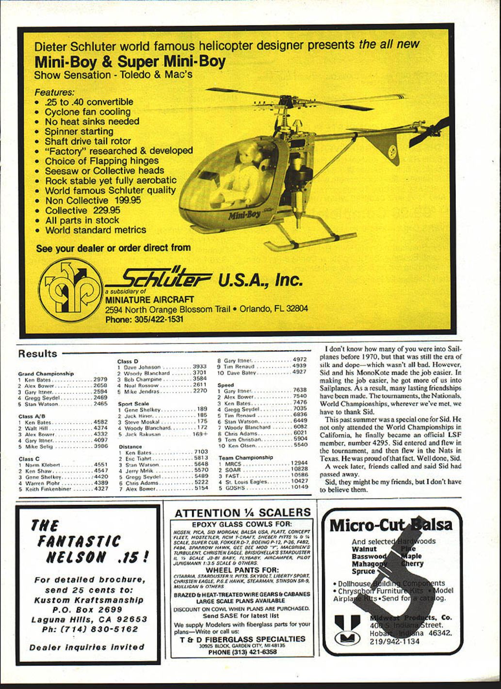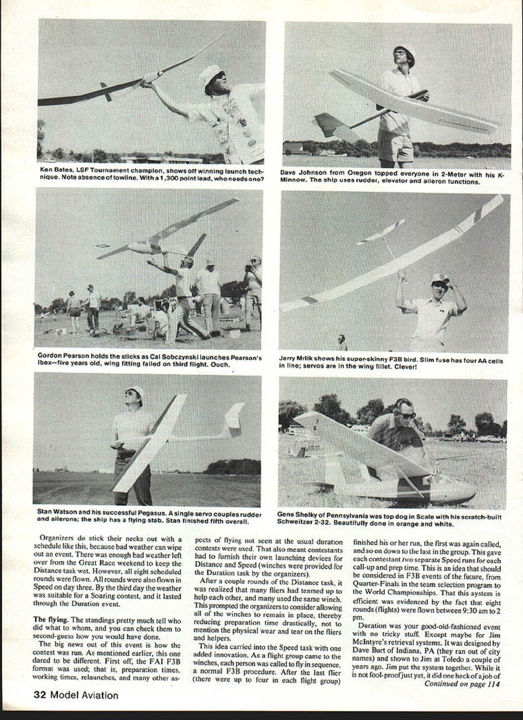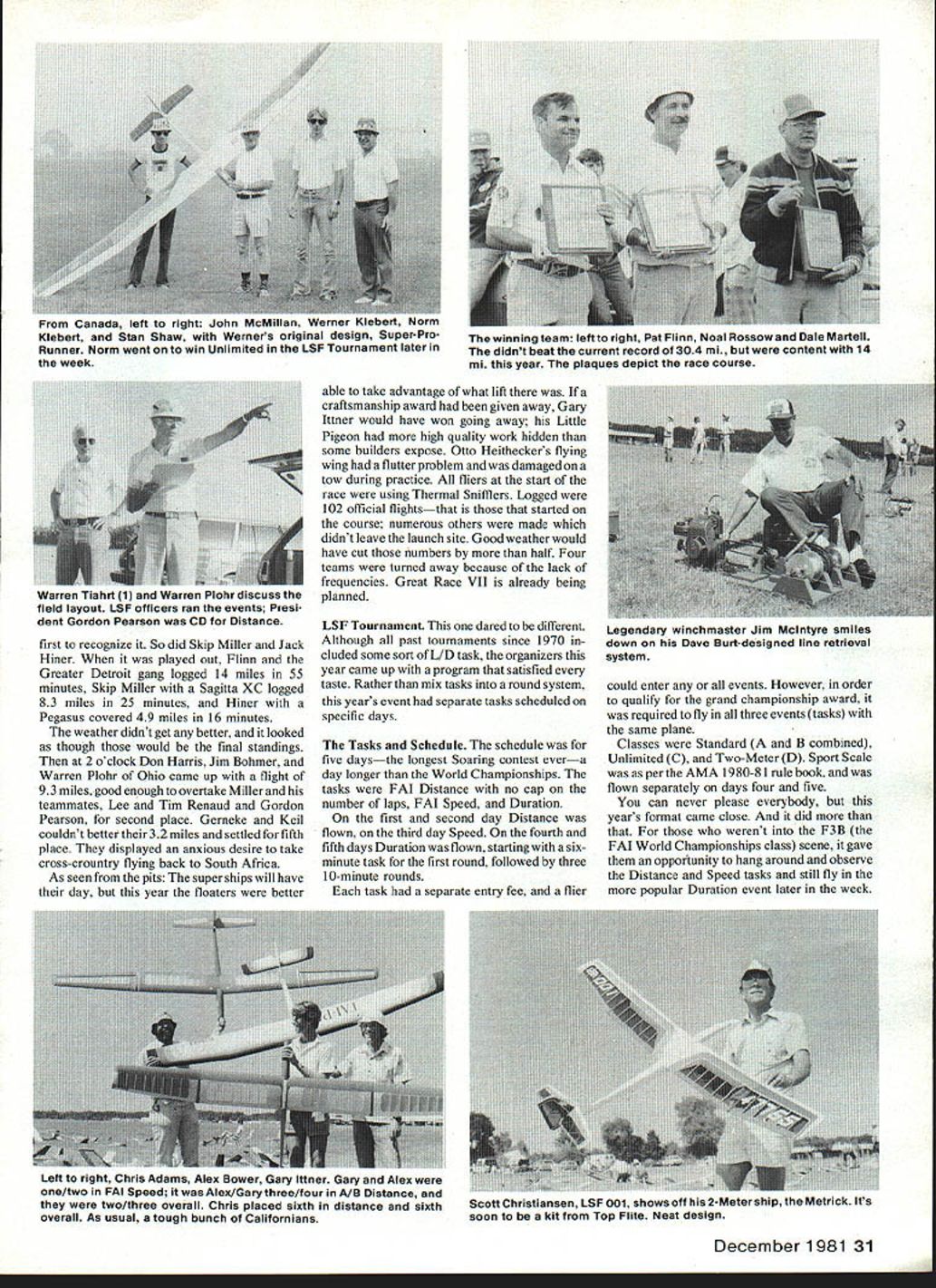 0 Tournament & Great RaceVI League Silent Flight staged seven-day bash Sailplane fliers consisting sixth Great Race annual LSF Tourna ment Weather bit sad race determined fliers stuck out blessed great tournament Rules operations different year line FAIs style running meet contestants approvedE Dan Pruss.J GREAT RACE VI. Easter parades county racing month before event Stan Watson fairs grand prix circuits arent always -flew complete course practice runthe guaranteed sunny weekends first second accomplish feat During week time six years Great Race can added before contest Gary Ittner Alex Bower list alibi goes should have California logged 14 miles day 20 week beforeand after another official practice day before matter race Watson set out establish AMA Sixteen teams entered onethe largest Thermal Duration record logged 3-hr 10field everwith roster including Canada mm flight South Africa year super Saturday came So did complete cloud shipsthose designed strictly cross-country cover What event teams would launch few times attempts go-for-broke flight became winch batteries worn out because number relaunches end day Nord Gerneke Andy Keil South Africa first place run 32 miles Only six other teams nudged past two-mile mark Sunday weather worse lower ceilings stronger threat rain 11 oclock bump came through few people took advantage Pat Flinn 30 Model Aviation time Pat Flinn Greater Detroit Soaring Hiking Society Astro Maggie both three-time winners SOARs Great Race Andy Rell Nord Gerneke South Africa Nords F3B Great Race entry ahead first day ended up fifth overall first recognize So did Skip Miller Jack Hiner played out Flinn Greater Detroit gang logged 14 miles 55 minutes Skip Miller Sagitta XC logged 83 miles 25 minutes Hiner Pegasus covered 49 miles 16 minutes weather didnt get better looked though would final standings 2 oclock Don Harris Jim Bobmer Warren Plohr Ohio came up flight 93 miles good enough overtake Miller teammates Lee Tim Renaud Gordon Pearson second place Gerneke Keil couldnt better 32 miles settled fifth place displayed anxious desire take cross-crountry flying back South Africa As seen pits super ships will have day year floaters better able take advantage what lift craftsmanship award given away Gary Ittner would have won going away Little Pigeon high quality work hidden some builders expose Otto Heitheckers flying wing flutter problem damaged tow during practice fliers start race using Thermal Snifflers Logged 102 official flightsthat started course numerous others made didnt leave launch site Good weather would have cut numbers half Four teams turned away because lack frequencies Great Race VII already being planned LSF Tournament dared different Although past tournaments since 1970 cluded some sort L/D task organizers year came up program satisfied taste Rather mix tasks round system years event separate tasks scheduled specific days Tasks Schedule schedule five daysthe longest Soaring contest evera day longer World Championships tasks FAI Distance no cap number laps FAT Speed Duration first second day Distance flown third day Speed fourth fifth days Duration flown starting sixminute task first round followed three 10-minute rounds task separate entry fee flier could enter events However order qualify grand championship award required fly three events tasks same plane Classes Standard B combined Unlimited C Two-Meter D Sport Scale per AMA 1980-81 rule book flown separately days four five can never please everybody years format came close did werent F3B FAI World Championships class scene gave opportunity hang around observe Distance Speed tasks still fly popular Duration event later week December 1981 31 Canada left right John l Werner Kiebert Stan Shaw Werners original design uper-rro Runner Norm went win Unlimited LSF Tournament later week winning team leftto right Pat Flinn Noal Rossowand Dale Martell didnt beat current record 304 ml content 14 mi year plaques depict race course warren i iann 1 ano warren rionr uISCUSS tn field layout LSF officers ran events Presi dent Gordon Pearson CD Distance Legendary winchmaster Jim McIntyre smiles down Dave Burt-designed line retrieval system Left right Chris Adams Alex Bower Gary lttner Gary Alex one/two FAI Speed Alex/Gary three/four A/B Distance two/three overall Chris placed sixth distance sixth overall As usual tough bunch Californians Scott Christiansen LSF ooi shows off 2-Metership Metrick Its soon kit Top Flite Neat design Organizers stick necks Out schedule like because bad weather can wipe out event enough bad weather left over Great Race weekend keep Distance task wet However eight scheduled rounds flown rounds also flown Speed day three third day weather suitable Soaring contest lasted through Duration event flying standings pretty much tell did what can check second-guess would have done big news out event contest run As mentioned earlier dared different First off FAI F3B format used preparation times working times relaunches other aspects flying seen usual duration contests used also meant contestants furnish own launching devices Distance Speed winches provided Duration task organizers After couple rounds Distance task realized fliers teamed up help other used same winch prompted organizers consider allowing winches remain place thereby reducing preparation time drastically mention physical wear tear fliers helpers idea carried Speed task added innovation As flight group came winches person called fly sequence normal F3B procedure After last flier up four flight group finished run first again called down last group gave contestant two separate Speed runs call-up prep time idea should considered F3B events future Quarter-Finals team selection program World Championships system efficient evidenced fact eight rounds flights flown between 930 am 2 pm Duration good-old-fashioned event no tricky stuff Except maybe Jim McIntyres retrieval systems designed Dave Burt Indiana PA ran out city names shown Jim Toledo coupl